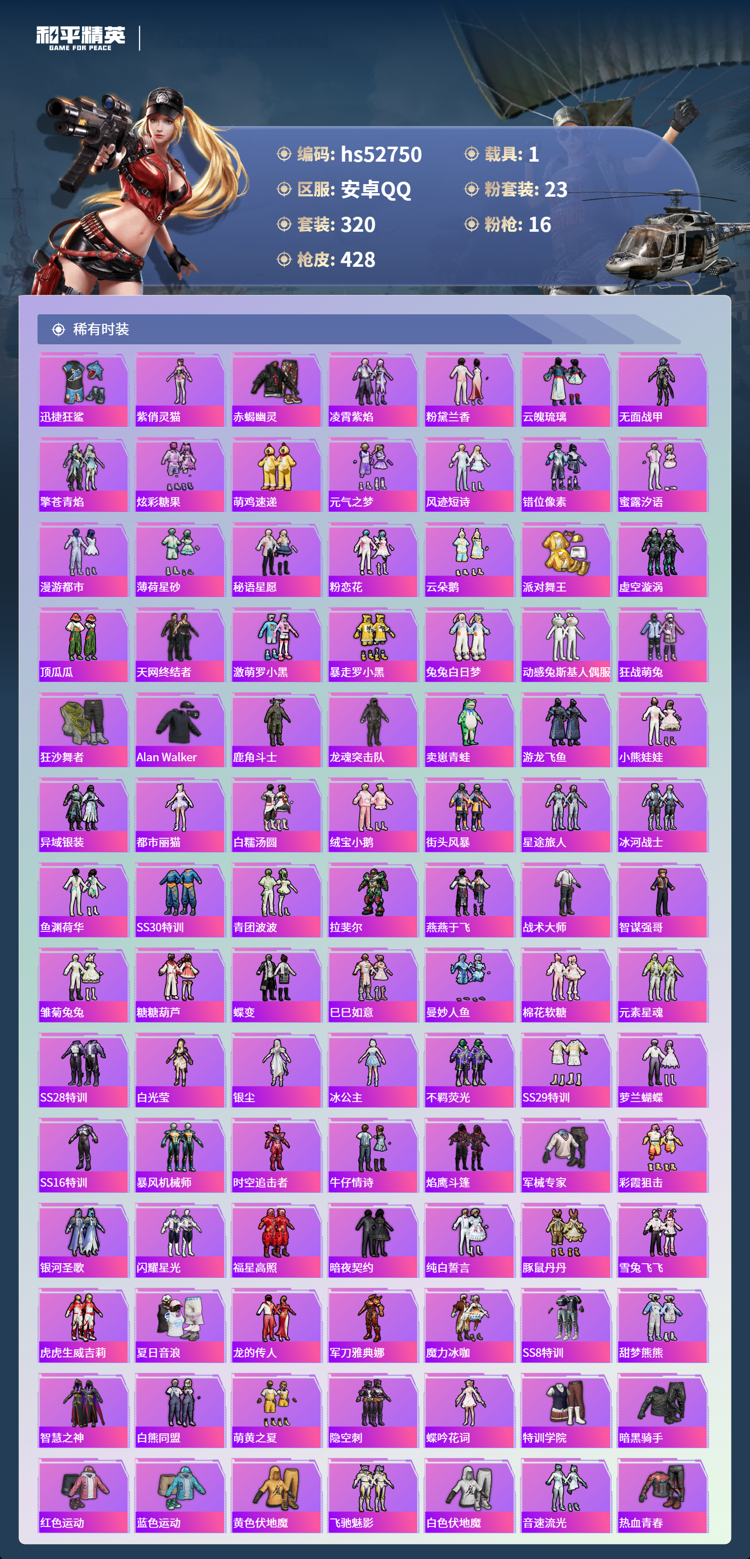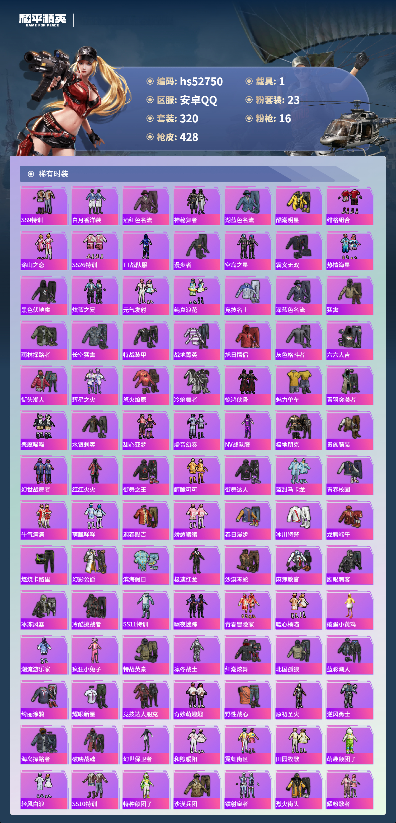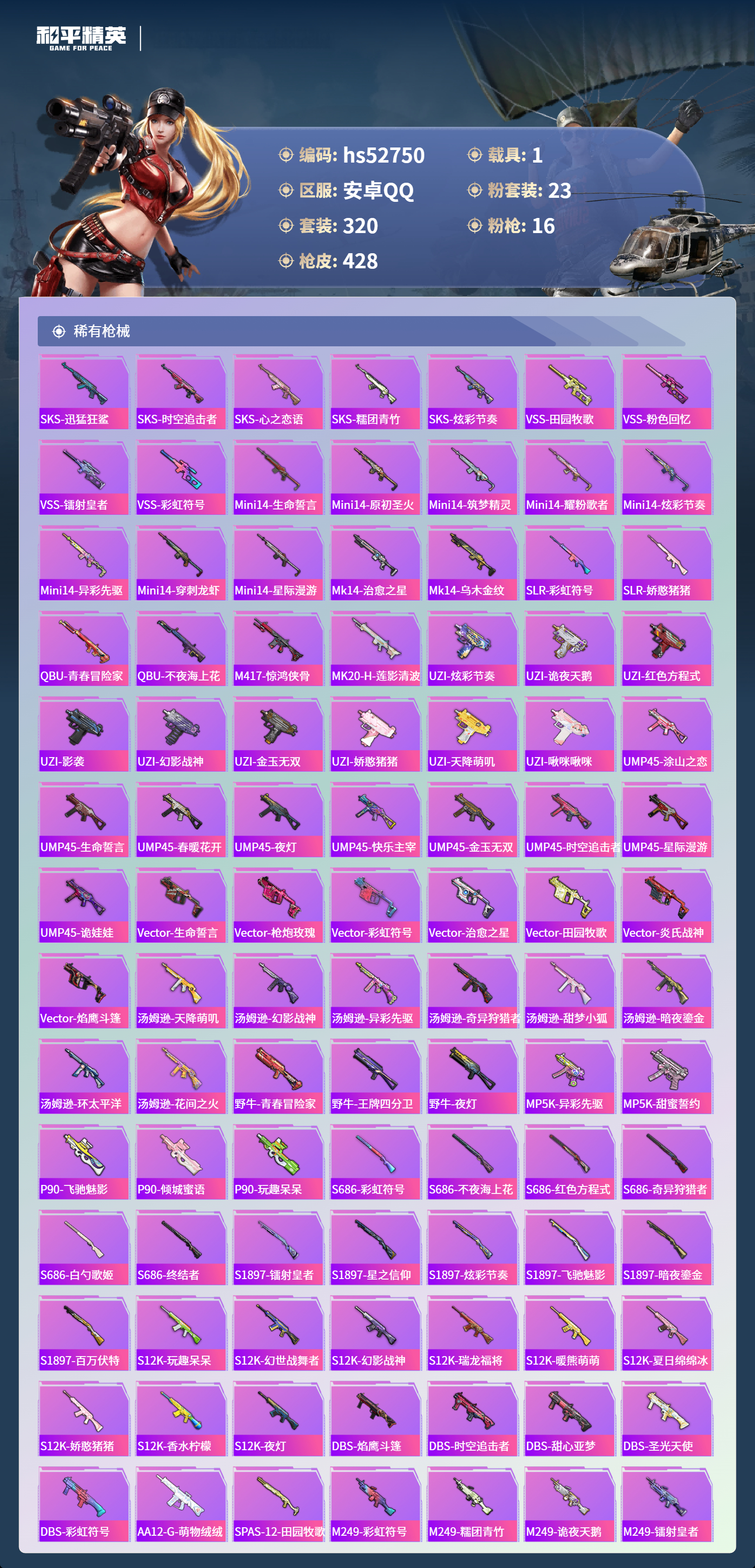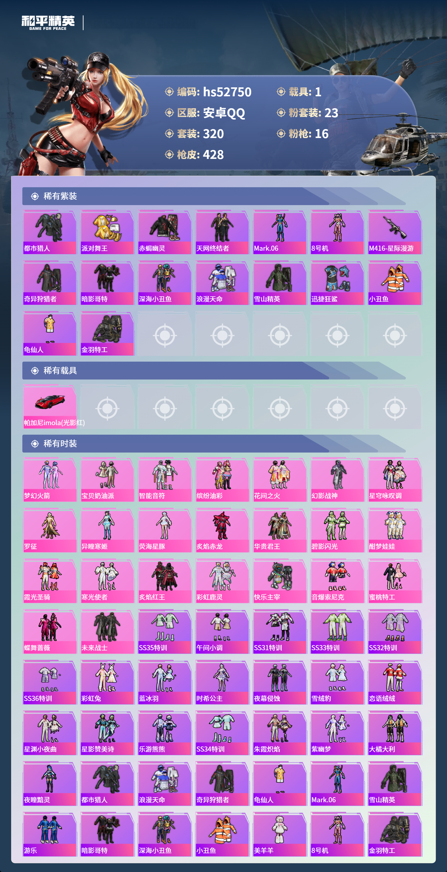 hs52750 安卓手q-22王牌印记-23粉装-16特效呛-1载具-热力值-320套装-428呛皮-3卓越印记【23粉装】角色-罗征套装-幻影战神套装-智能音符套装-星穹咏叹调套装-寒光使者套装-华贵君王套装-霞光圣骑套装-未来战士套装-缤纷油彩套装-碧影闪光套装-炙焰红王套装-蜜桃特工套装-快乐主宰套装-炙焰赤龙套装-酣梦娃娃套装-梦幻火箭套装-蝶