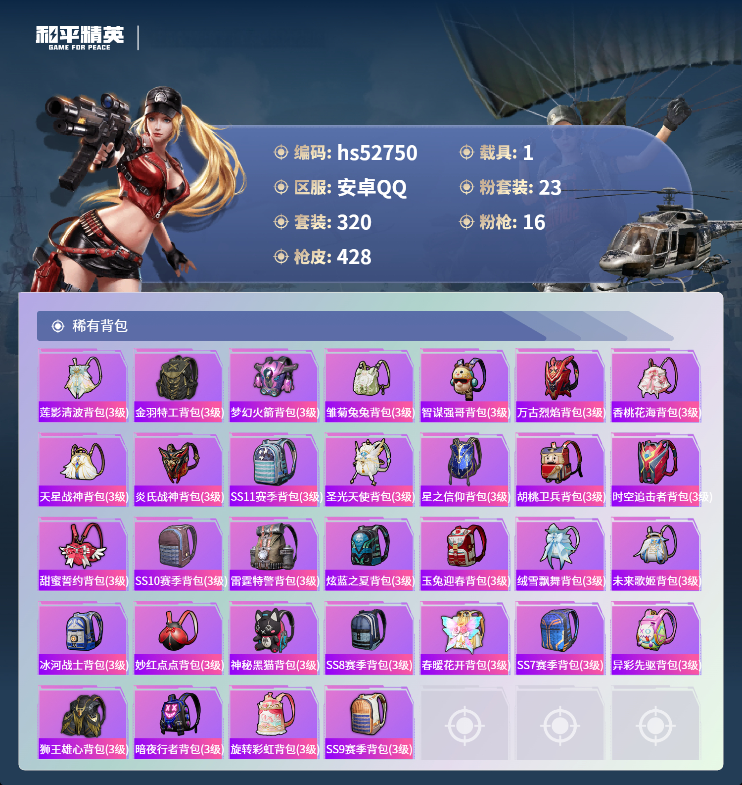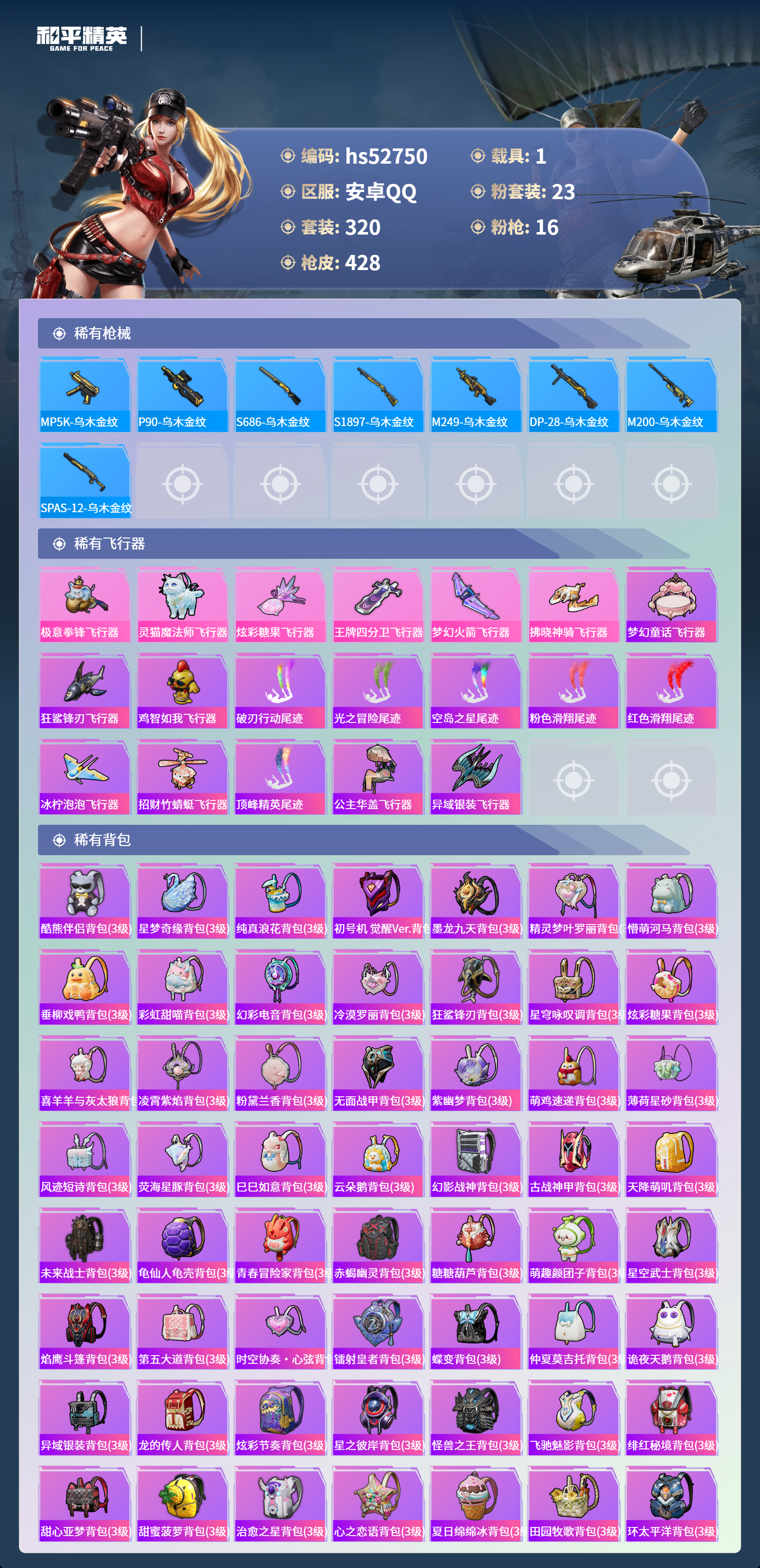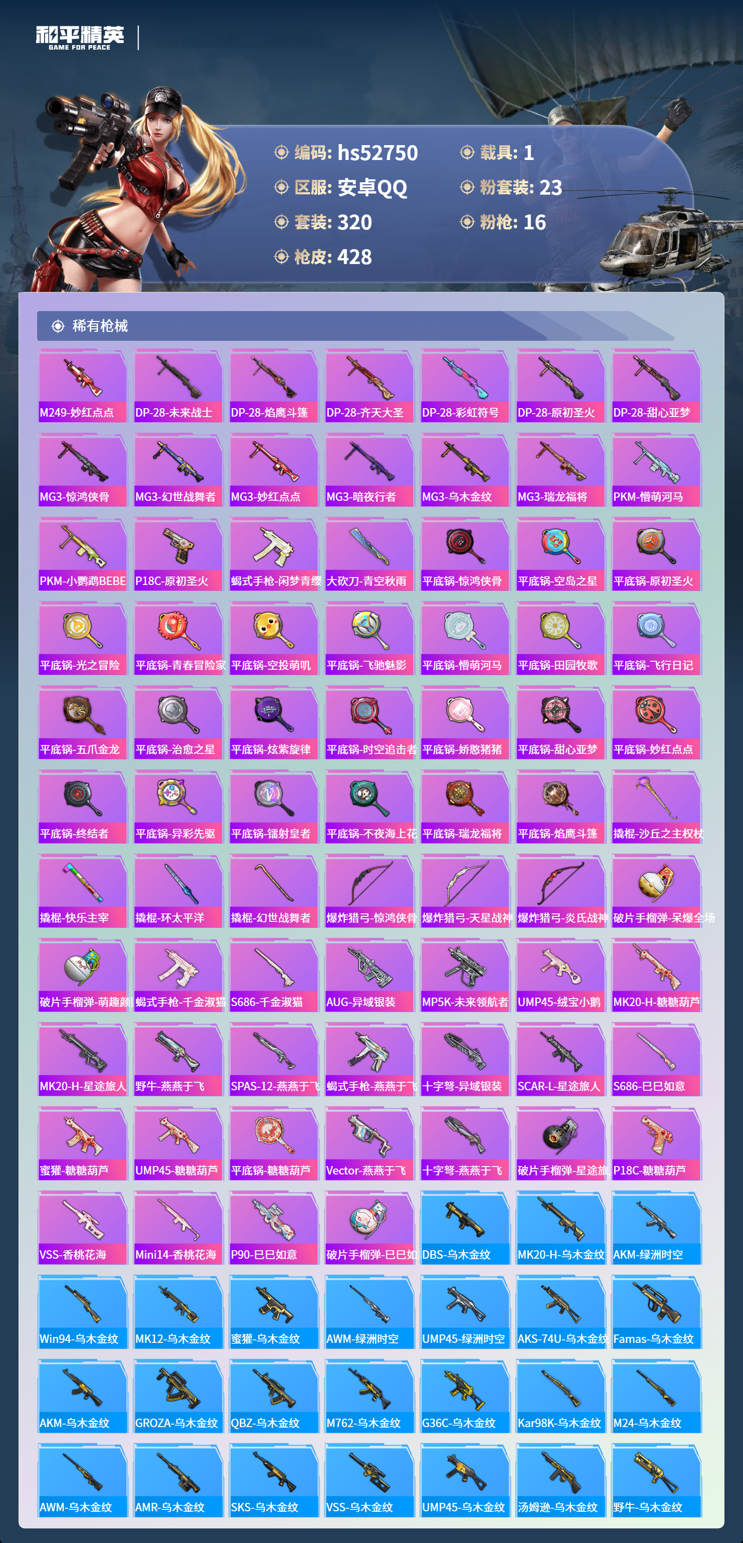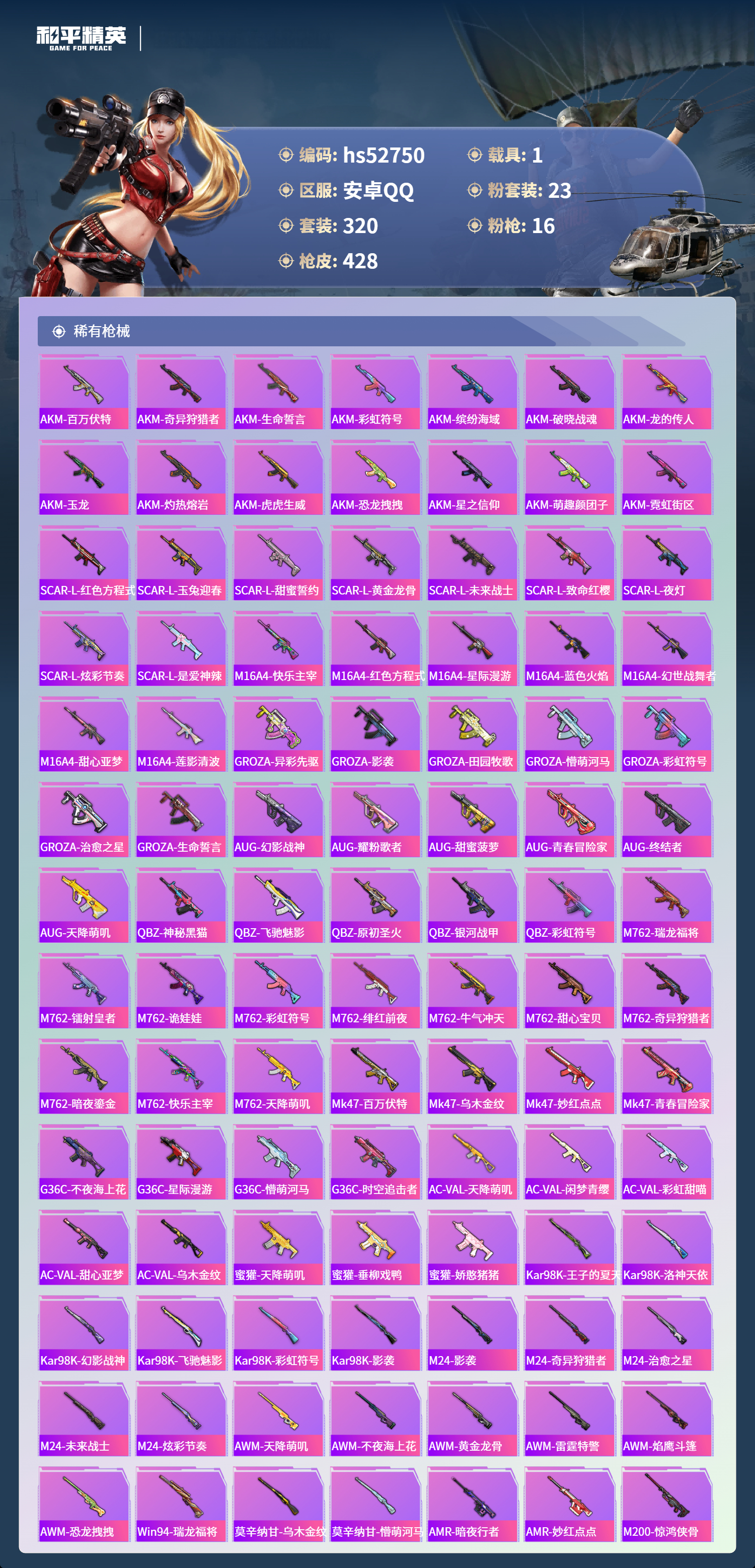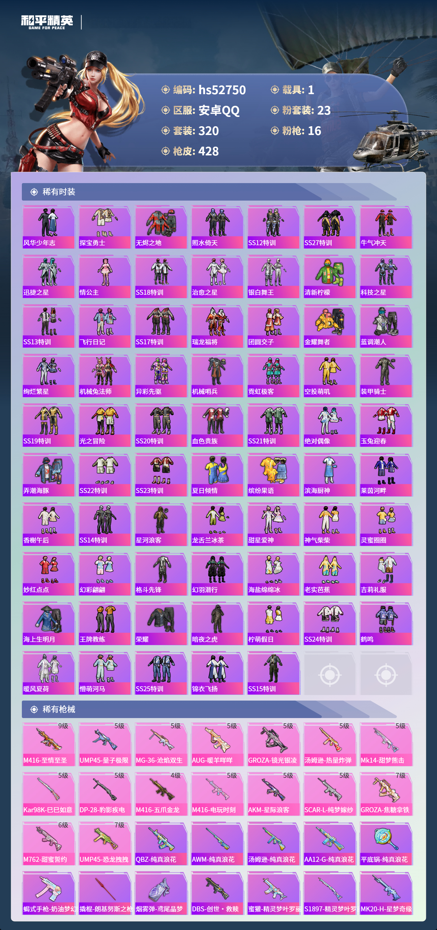 hs52750 安卓手q-22王牌印记-23粉装-16特效呛-1载具-热力值-320套装-428呛皮-3卓越印记【23粉装】角色-罗征套装-幻影战神套装-智能音符套装-星穹咏叹调套装-寒光使者套装-华贵君王套装-霞光圣骑套装-未来战士套装-缤纷油彩套装-碧影闪光套装-炙焰红王套装-蜜桃特工套装-快乐主宰套装-炙焰赤龙套装-酣梦娃娃套装-梦幻火箭套装-蝶