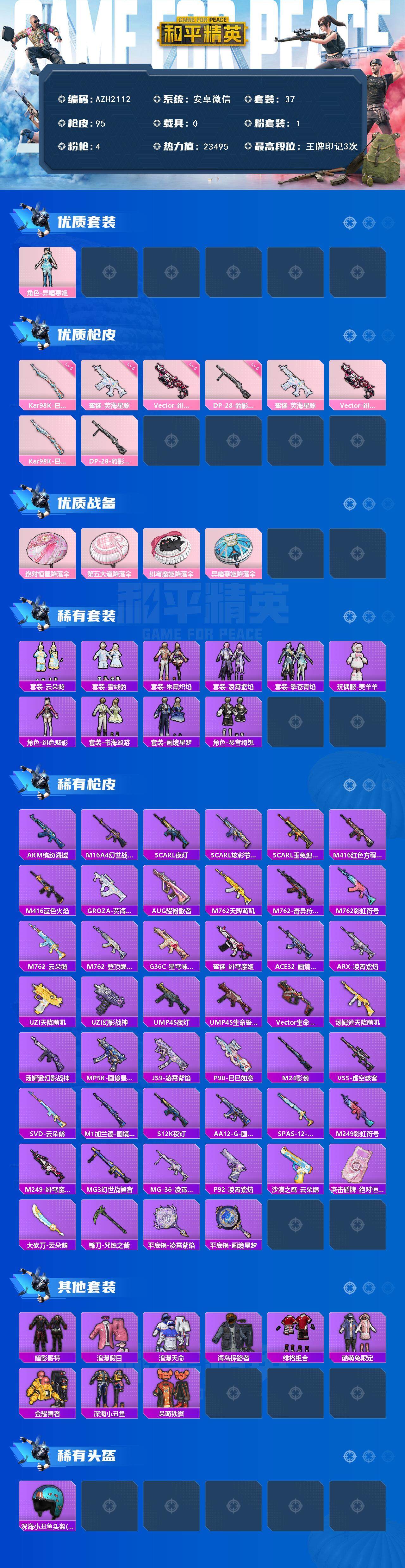0载具-37套装-95呛皮-安卓 微信【1粉角色-异瞳寒姬 美羊羊暗影哥特深海小丑鱼】1粉装-4特效呛-0载具-1粉色飞行器-23495热力值-3王牌印记-37套装-95呛皮 【热门品类】:套装-浪漫天命,套装-深海小丑鱼,套装-暗影哥特 【粉色套装】:角色-异瞳寒姬 【粉色呛皮等级】:蜜獾-荧海星豚五级,vect-绯穹魔姬五级,kar98k-巳巳如意五级,dp-28-豹影疾电五级 【粉色呛皮】:蜜獾