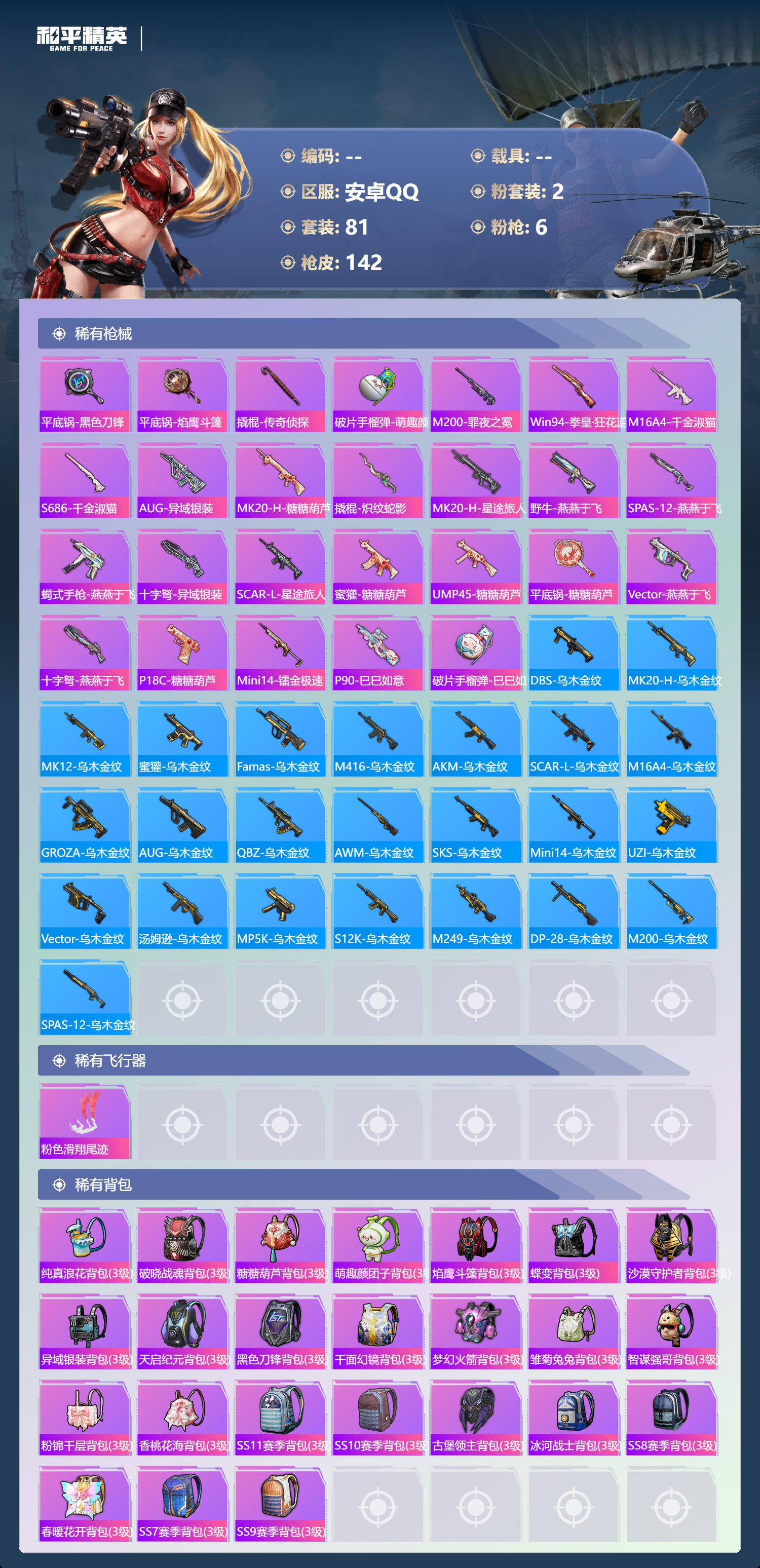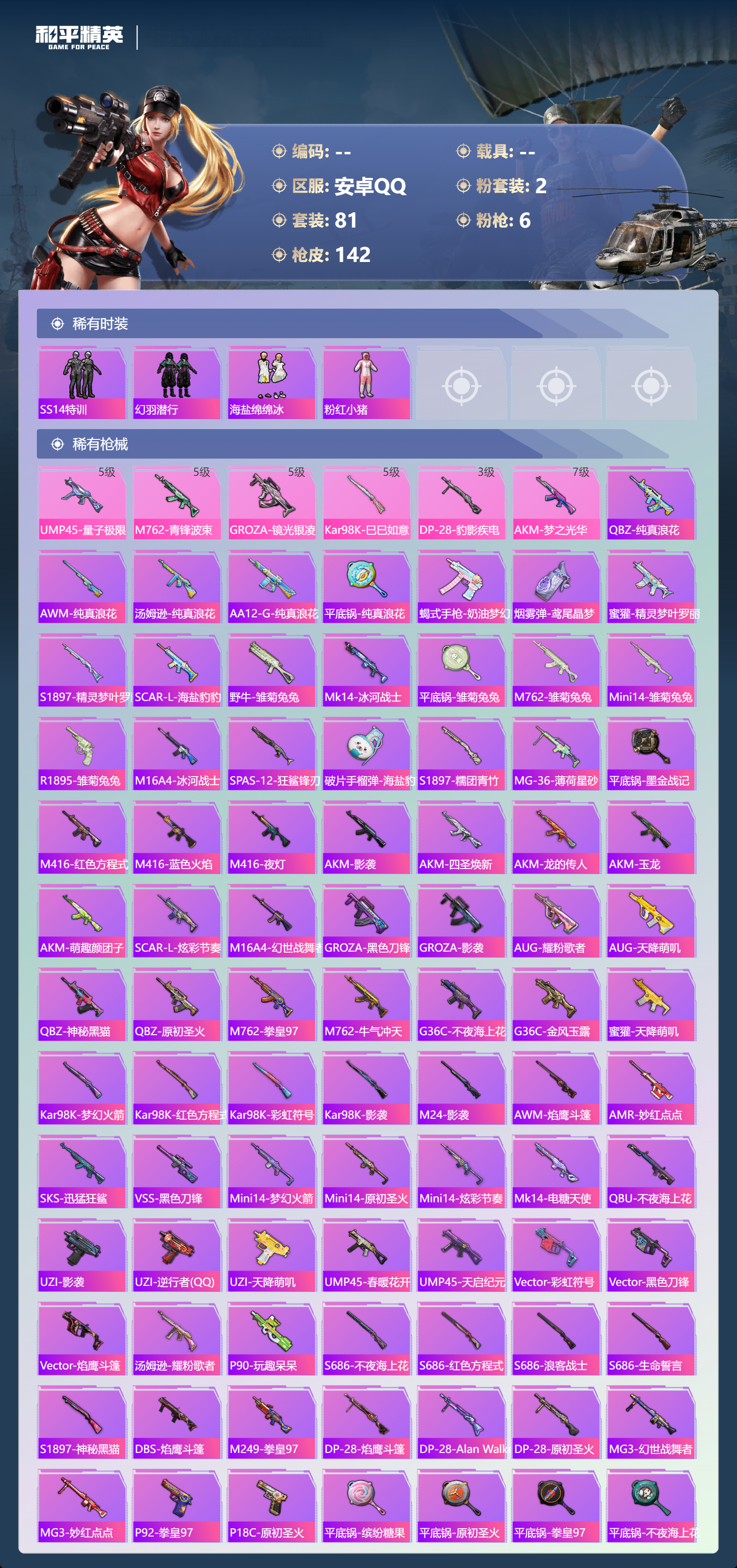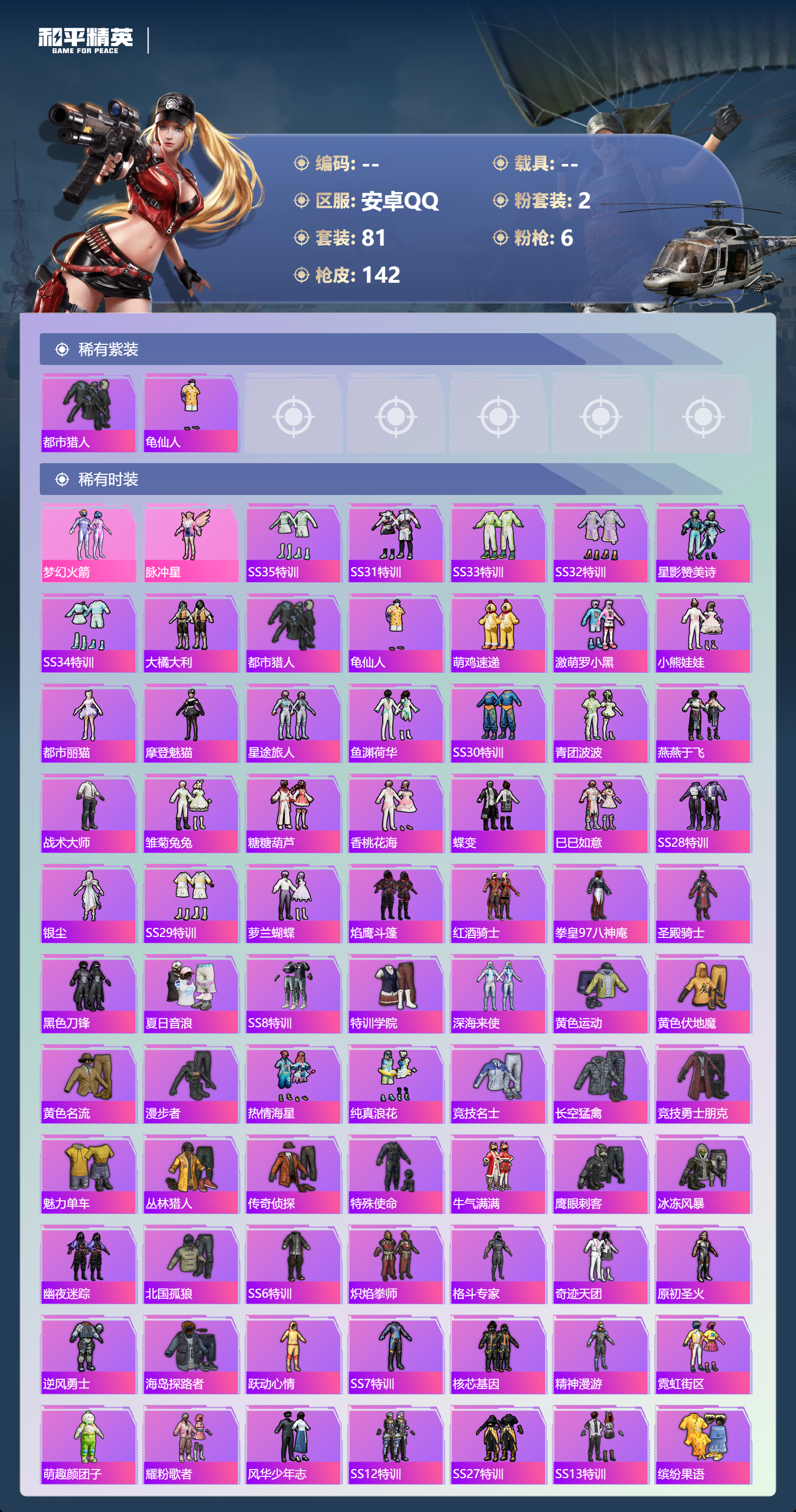 0载具-81套装-142呛皮-【火箭都市六特】安卓手q-8王牌印记-2粉装-6特效呛-40909热力值-81套装-142呛皮-1卓越印记【2粉装】角色-脉冲星套装-梦幻火箭【6特效呛】groza-镜光银凌/5级ump45-量子极限/5级akm-梦之光华/7级kar98k-巳巳如意/5级dp-28-豹影疾电/3级m762-青锋波束/5级【2稀有紫装】都市猎人龟仙人【81稀有时装】梦幻火箭ss35特训ss31特训