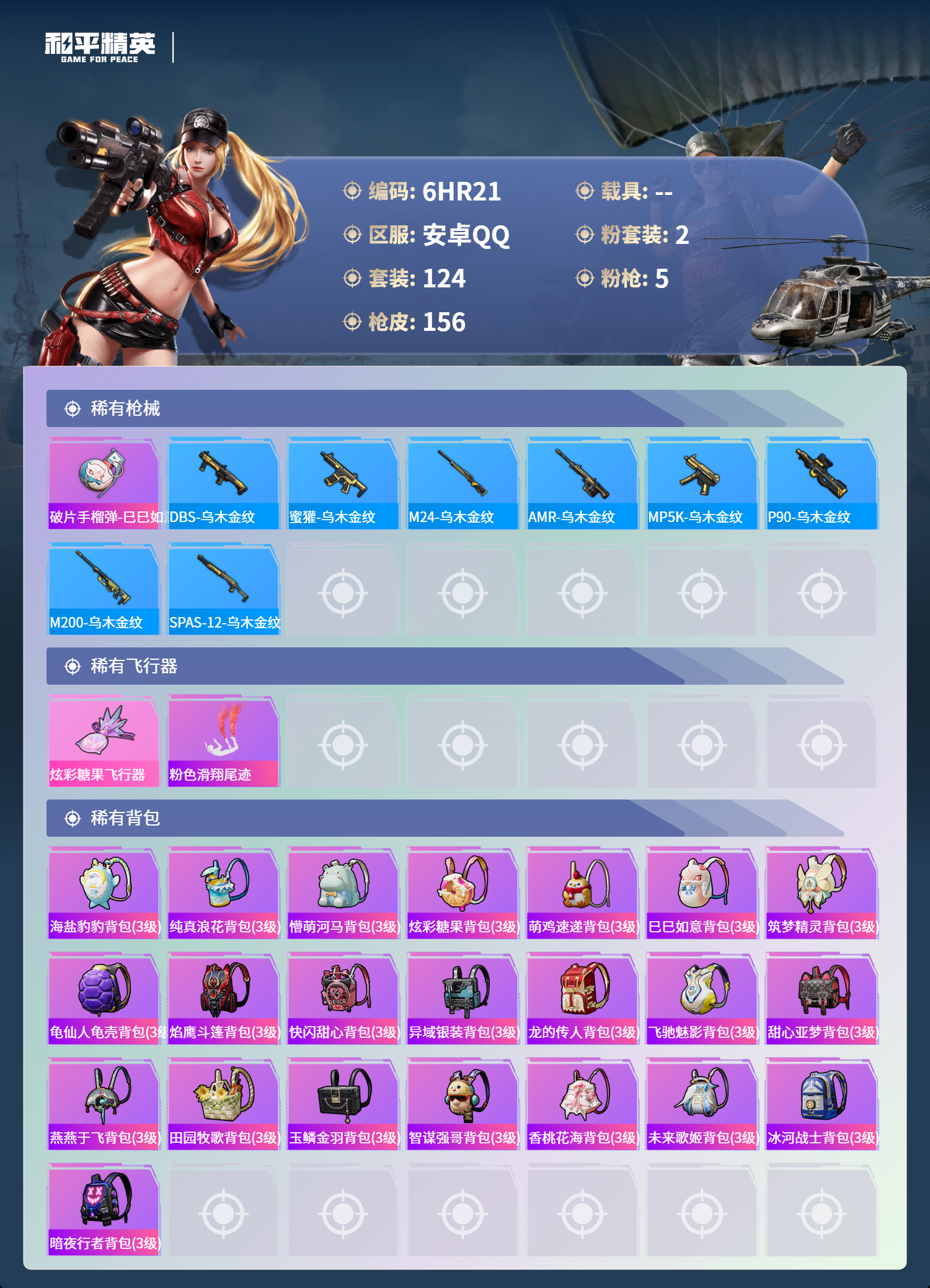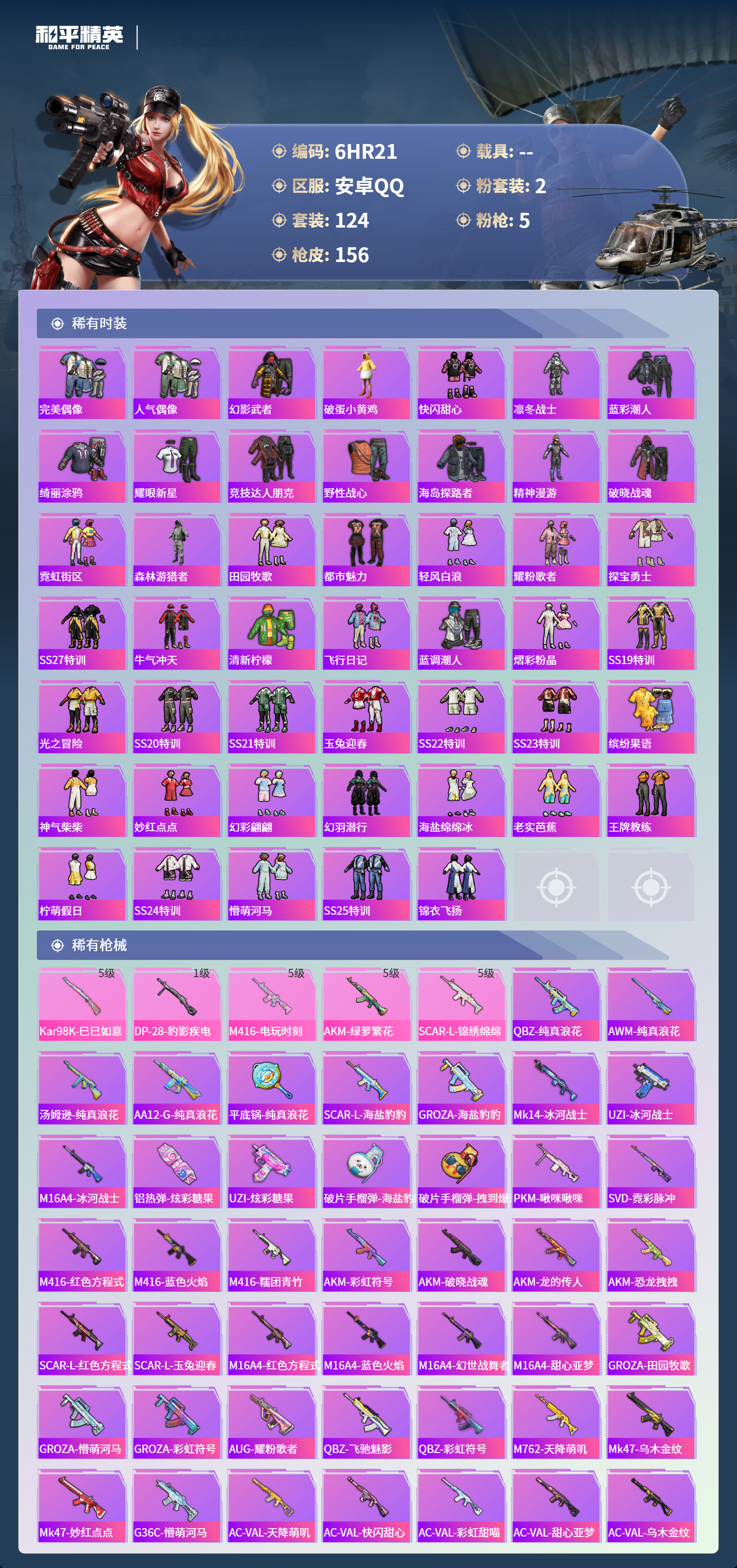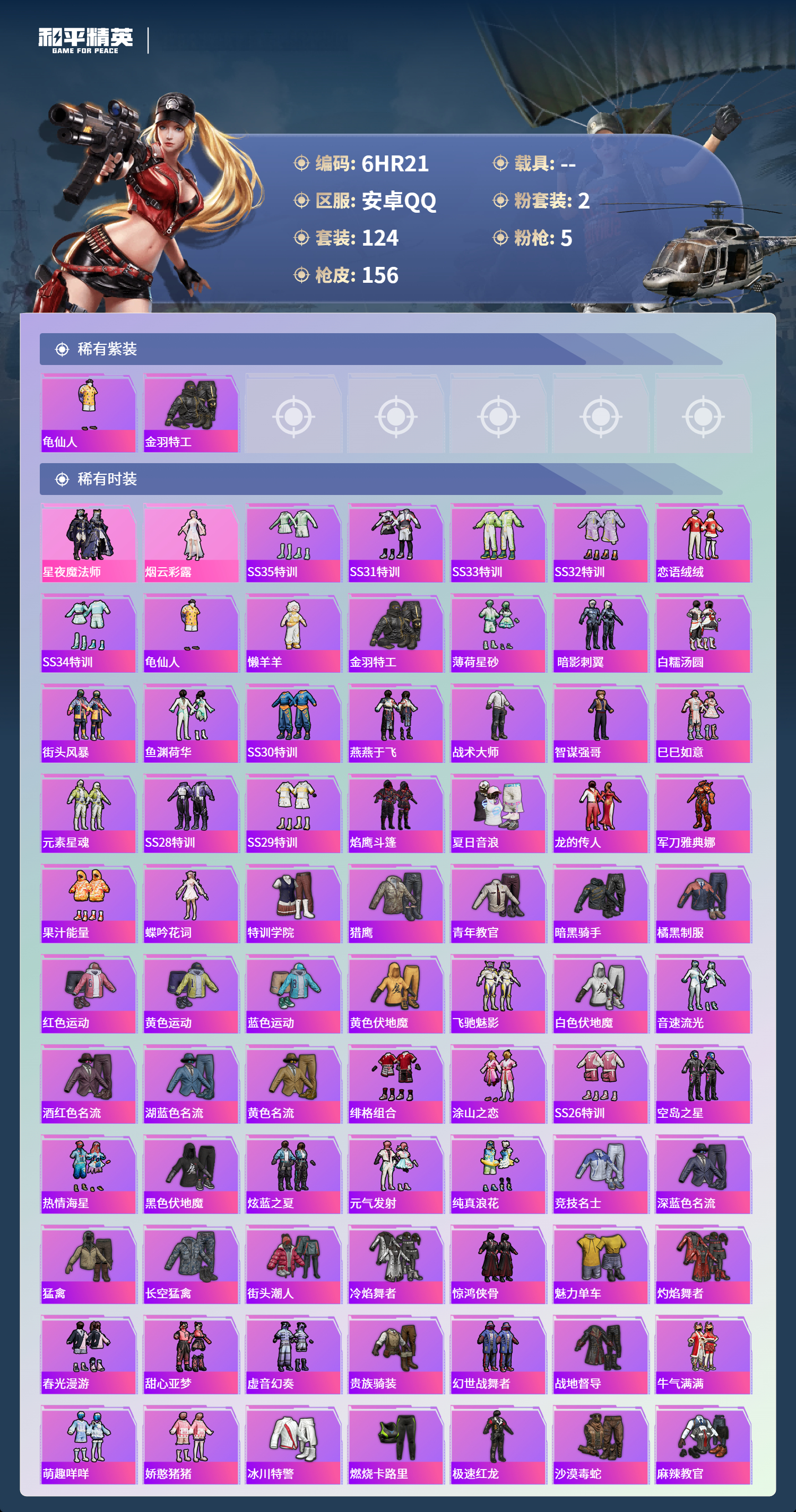 0载具-124套装-156呛皮-安卓手q-6王牌印记-2粉装-5特效呛-41238热力值-124套装-156呛皮-1卓越印记【2粉装】套装-星夜魔法师角色-烟云彩露【5特效呛】scar-l-锦绣绵绵/5级dp-28-豹影疾电/1级m416-电玩时刻/5级kar98k-巳巳如意/5级akm-绿萝繁花/5级【2稀有紫装】龟仙人金羽特工【124稀有时装】ss35特训ss31特训ss33特训ss32特训恋语绒绒ss