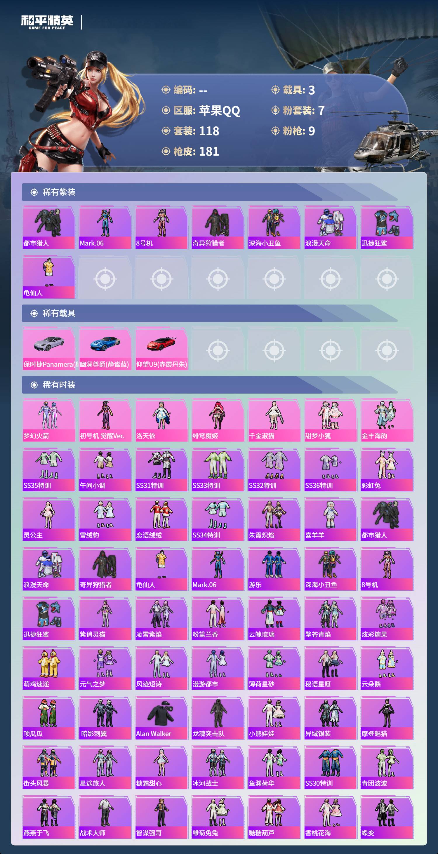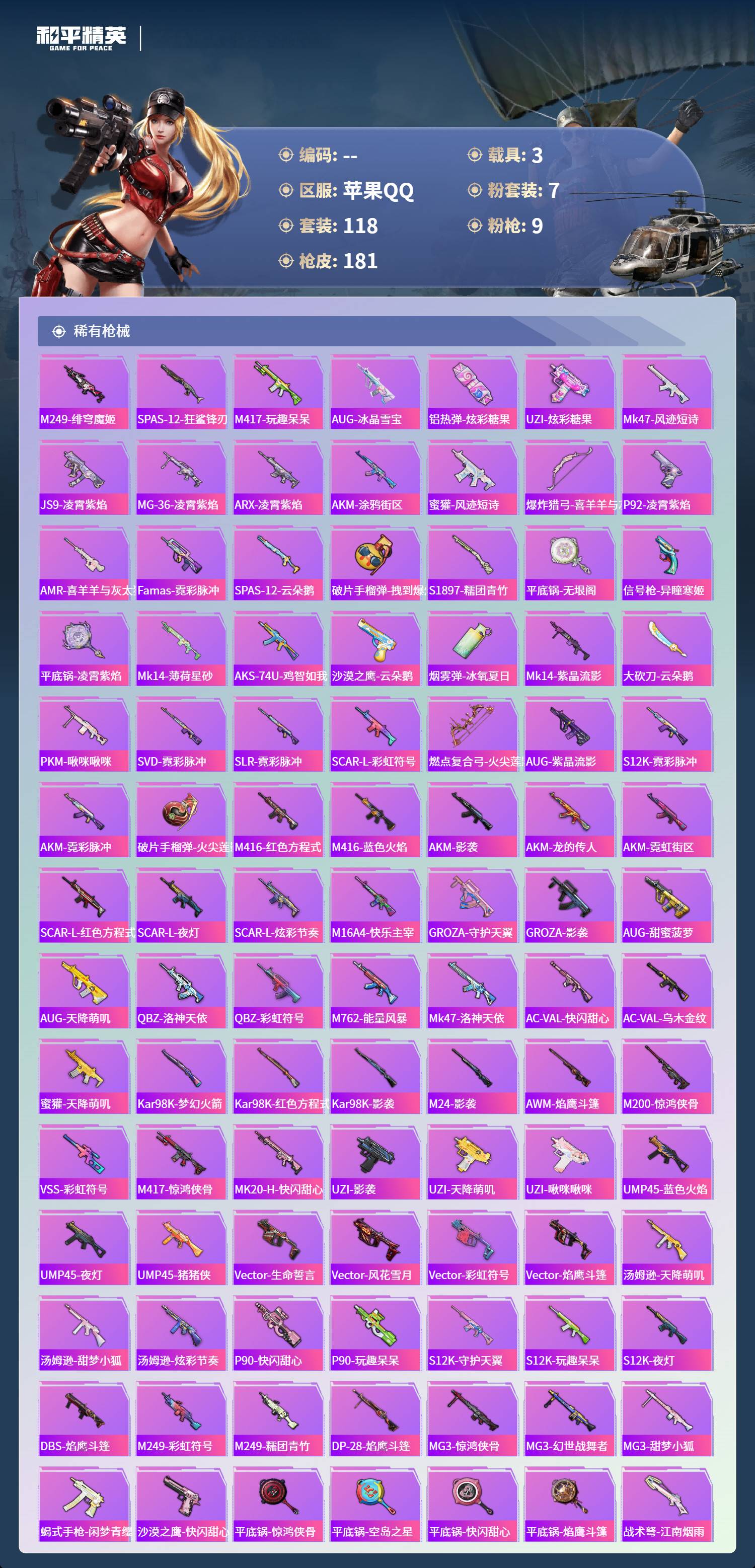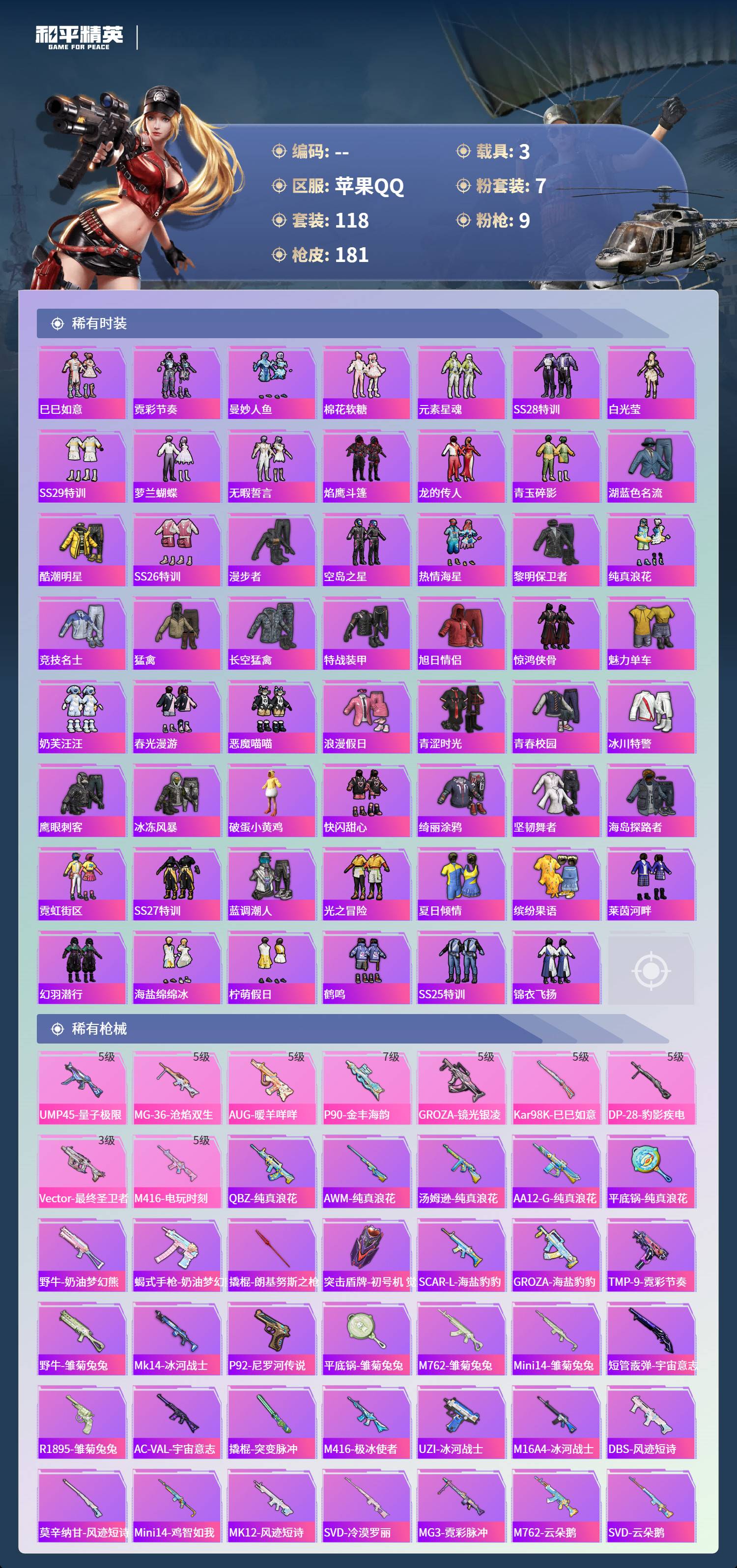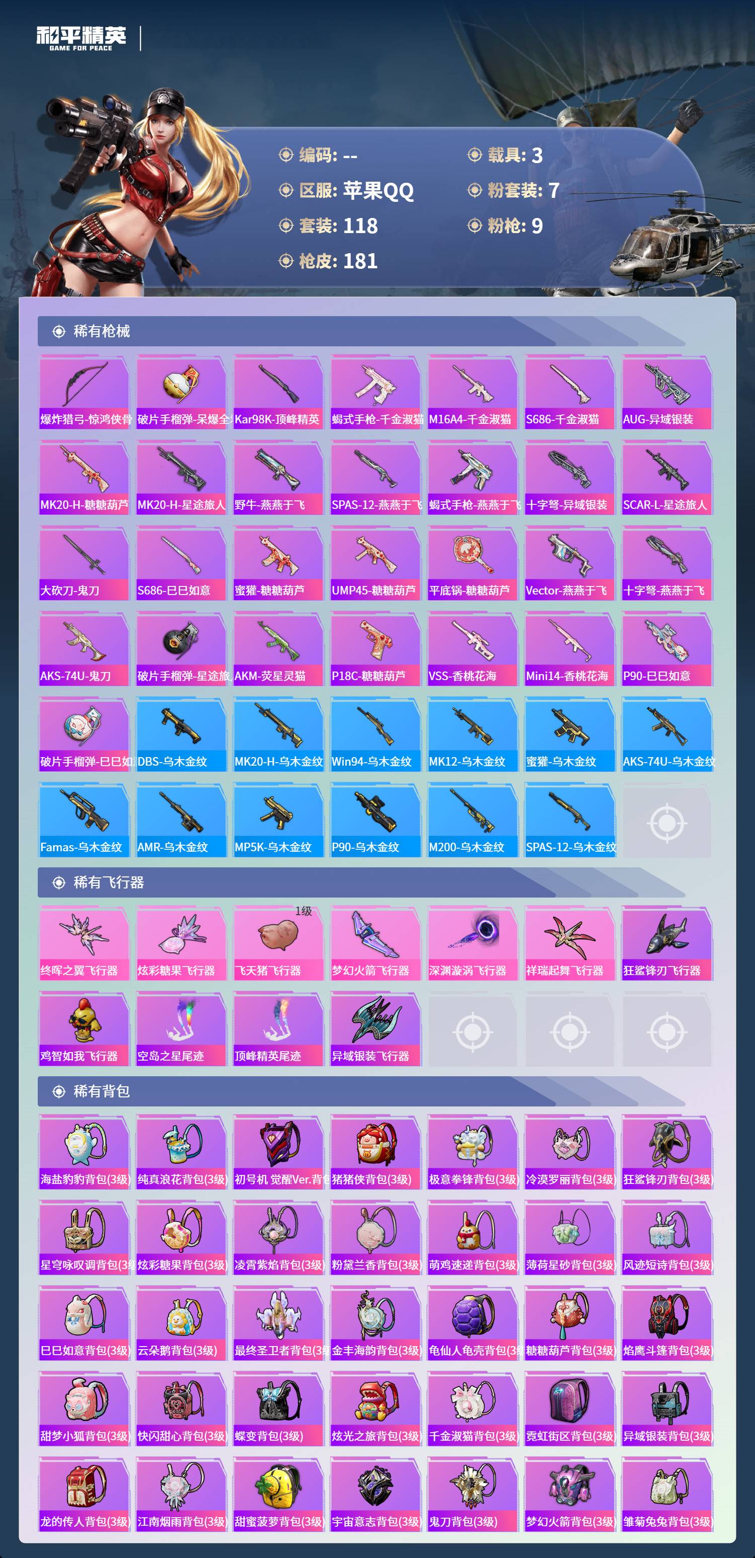 006fs:k3537苹果手q-11王牌印记-7粉装-9特效呛-3载具-59614热力值-118套装-181呛皮-5卓越印记-4传奇印记 【7粉装】套装-金丰海韵角色-初号机 觉醒ver.套装-梦幻火箭角色-绯穹魔姬角色-千金淑猫套装-甜梦小狐角色-洛天依 【9特效呛】ump45-量子极限/5级aug-暖羊咩咩/5级p90-金丰海韵/7级vect-最终圣卫者/3级dp-28-豹影疾电/5级m416-电玩时刻/5级mg-36-沧焰双生/5级groza-镜光银凌/5级kar98k-巳巳如意/5级 【8稀有紫装】都市猎人mark.068号机奇异狩猎者深海小丑鱼浪漫天命迅捷狂鲨龟仙人 【3稀有载具】保时捷panamera星辰紫幽澜尊爵静谧蓝仰望u9赤霞丹朱 【118稀有时装】梦幻火箭初号机 觉醒ver.洛天依绯穹魔姬ss35特训午间小调ss31特训ss33特训ss32特训ss36特训彩虹兔灵公主雪绒豹恋语绒绒ss34特训朱霞炽焰喜羊羊都市猎人浪漫天命奇异狩猎者龟仙人mark.06游乐深海小丑鱼8号机迅捷狂鲨紫俏灵猫凌霄紫焰粉黛兰香云魄琉璃擎苍青焰炫彩糖果萌鸡速递元气之梦风迹短诗漫游都市薄荷星砂秘语星愿云朵鹅顶瓜瓜千金淑猫 暗影刺翼甜梦小狐金丰海韵alan walker龙魂突击队小熊娃娃异域银装摩登魅猫街头风暴星途旅人糖霜甜心冰河战士鱼渊荷华ss30特训青团波波燕燕于飞战术大师智谋强哥雏菊兔兔糖糖葫芦香桃花海蝶变巳巳如意霓彩节奏曼妙人鱼棉花软糖元素星魂ss28特训白光莹ss29特训萝兰蝴蝶无暇誓言焰鹰斗篷龙的传人青玉碎影湖蓝色名流酷潮明星ss26特训漫步者空岛之星热情海星黎明保卫者纯真浪花竞技名士猛禽长空猛禽特战装甲旭日情侣惊鸿侠骨魅力单车奶芙汪汪春光漫游恶魔喵喵浪漫假日青涩时光青春校园冰川特警鹰眼刺客冰冻风暴破蛋小黄鸡快闪甜心绮丽涂鸦坚韧舞者海岛探路者霓虹街区ss27特训蓝调潮人光之冒险夏日倾情缤纷果语莱茵河畔幻羽潜行海盐绵绵冰柠萌假日鹤鸣ss25特训锦衣飞扬 【181稀有呛械】ump45-量子极限/5级q-纯真浪花awm-纯真浪花汤姆逊-纯真浪花dbs-乌木金纹aa12-g-纯真浪花平底锅-纯真浪花野牛-奶油梦幻熊蝎式手呛-奶油梦幻熊撬棍-朗基努斯之呛突击盾牌-初号机 觉醒ver.scar-l-海盐豹豹groza-海盐豹豹tmp-9-霓彩节奏mg-36-沧焰双生/5级aug-暖羊咩咩/5级p90-金丰海韵/7级groza-镜光银凌/5级kar98k-巳巳如意/5级dp-28-豹影疾电/5级vect-最终圣卫者/3级野牛-雏菊兔兔mk14-冰河战士p92-尼罗河传说平底锅-雏菊兔兔m762-雏菊兔兔mini14-雏菊兔兔短管霰弹-宇宙意志r1895-雏菊兔兔ac-val-宇宙意志撬棍-突变脉冲m416-极冰使者uzi-冰河战士m16a4-冰河战士mk20-h-乌木金纹m416-电玩时刻/5级dbs-风迹短诗莫辛纳甘-风迹短诗mini14-鸡智如我win94-乌木金纹mk12-风迹短诗mk12-乌木金纹svd-冷漠罗丽mg3-霓彩脉冲蜜獾-乌木金纹m762-云朵鹅svd-云朵鹅m249-绯穹魔姬spas-12-狂鲨锋刃m417-玩趣呆呆aug-冰晶雪宝铝热弹-炫彩糖果uzi-炫彩糖果mk47-风迹短诗js9-凌霄紫焰mg-36-凌霄紫焰arx-凌霄紫焰aks-74u-乌木金纹akm-涂鸦街区蜜獾-风迹短诗爆炸猎弓-喜羊羊与灰太狼p92-凌霄紫焰amr-喜羊羊与灰太狼famas-乌木金纹famas-霓彩脉冲spas-12-云朵鹅破片手留单-拽到爆炸s1897-糯团青竹平底锅-无垠阁信号呛-异瞳寒姬平底锅-凌霄紫焰mk14-薄荷星砂aks-74u-鸡智如我沙墨之鹦-云朵鹅盐雾蛋-冰氧夏日mk14-紫晶流影大砍刀-云朵鹅pkm-啾咪啾咪svd-霓彩脉冲slr-霓彩脉冲scar-l-彩虹符号燃点复合弓-火尖莲影aug-紫晶流影s12k-霓彩脉冲akm-霓彩脉冲破片手留单-火尖莲影m416-红色方程式m416-蓝色火焰akm-影袭akm-龙的传人akm-霓虹街区scar-l-红色方程式scar-l-夜灯scar-l-炫彩节奏m16a4-快乐主宰groza-守护天翼groza-影袭aug-甜蜜菠萝aug-天降萌叽q-洛神天依q-彩虹符号m762-能量风暴mk47-洛神天依ac-val-快闪甜心ac-val-乌木金纹蜜獾-天降萌叽kar98k-梦幻火箭kar98k-红色方程式kar98k-影袭m24-影袭awm-焰鹰斗篷amr-乌木金纹m200-惊鸿侠骨vss-彩虹符号m417-惊鸿侠骨mk20-h-快闪甜心uzi-影袭uzi-天降萌叽uzi-啾咪啾咪ump45-蓝色火焰ump45-夜灯ump45-猪猪侠vect-生命誓言vect-风花雪月vect-彩虹符号vect-焰鹰斗篷汤姆逊-天降萌叽汤姆逊-甜梦小狐汤姆逊-炫彩节奏mp5k-乌木金纹p90-乌木金纹p90-快闪甜心p90-玩趣呆呆s12k-守护天翼s12k-玩趣呆呆s12k-夜灯dbs-焰鹰斗篷m249-彩虹符号m249-糯团青竹dp-28-焰鹰斗篷mg3-惊鸿侠骨mg3-幻世战舞者mg3-甜梦小狐蝎式手呛-闲梦青缨沙墨之鹦-快闪甜心平底锅-惊鸿侠骨平底锅-空岛之星平底锅-快闪甜心平底锅-焰鹰斗篷战术弩-江南烟雨爆炸猎弓-惊鸿侠骨破片手留单-呆爆全场kar98k-顶峰精英蝎式手呛-千金淑猫m16a4-千金淑猫s686-千金淑猫aug-异域银装mk20-h-糖糖葫芦mk20-h-星途旅人野牛-燕燕于飞m200-乌木金纹spas-12-燕燕于飞蝎式手呛-燕燕于飞十子怒-异域银装scar-l-星途旅人大砍刀-鬼刀s686-巳巳如意蜜獾-糖糖葫芦ump45-糖糖葫芦spas-12-乌木金纹平底锅-糖糖葫芦vect-燕燕于飞十子怒-燕燕于飞aks-74u-鬼刀破片手留单-星途旅人akm-荧星灵猫p18c-糖糖葫芦vss-香桃花海mini14-香桃花海p90-巳巳如意破片手留单-巳巳如意 【11稀有飞行器】终晖之翼飞行器狂鲨锋刃飞行器鸡智如我飞行器炫彩糖果飞行器飞天猪飞行器/1级空岛之星尾迹梦幻火箭飞行器深渊漩涡飞行器顶峰精英尾迹异域银装飞行器祥瑞起舞飞行器 【39稀有背包】海盐豹豹背包3级纯真浪花背包3级初号机 觉醒ver.背包3级猪猪侠背包3级极意拳锋背包3级冷漠罗丽背包3级狂鲨锋刃背包3级星穹咏叹调背包3级炫彩糖果背包3级凌霄紫焰背