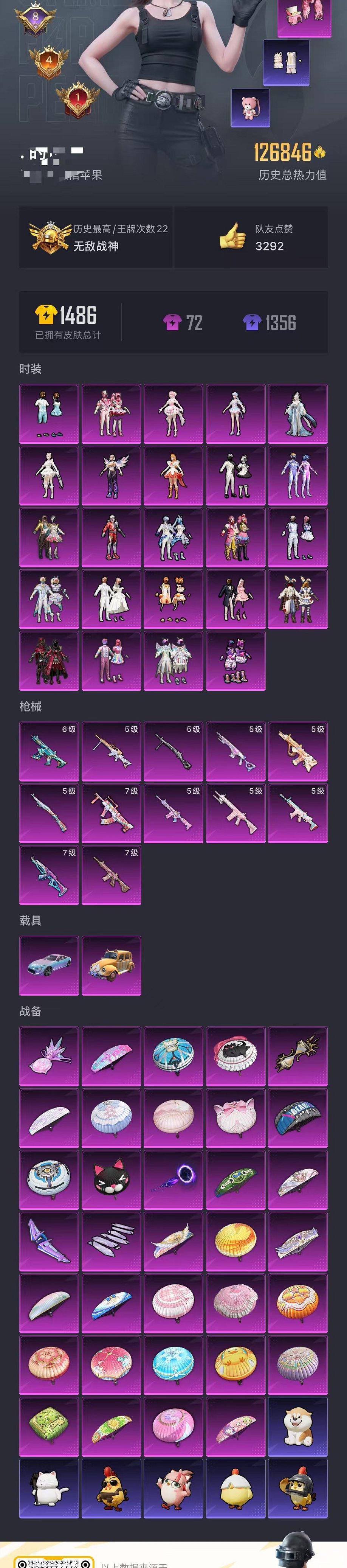 【女号战神框梦幻胖达 24粉装12特效呛2载具】 苹果v区-126846热力值-22印记-历史最高段位:无敌战神-270套装-345呛皮 【2载具】 萌喵橘座 灵翼风驰幻彩蓝【2稀有】 mark.06 胖达圆圆【24粉装】 缤纷油彩(猪脸妹) 梦幻火箭 童趣迷兔 馨动时刻 角色-小蓝 蜜桃特工 山涧鹿灵 天使彩虹糖 彩虹鹿灵 蝶舞迷情 蓝莓炮弹 橘柚倾心 炙焰红王 心之回忆 仲夏莫吉托 璀璨巨星 未来歌姬 冰川幽秘 角色-电波星 机械师花傲天 角色-宁雨蝶 角色-荧海星豚 角色-千金淑猫 角色-奇迹舞步 美雪【12特效呛】 scar-l-锦绣绵绵5级 m416-心之恋语7级 m417-第五大道5级 akm-梦之光华7级 groza-旋转彩虹7级 m416-电玩时刻5级 mk14-甜梦熊击5级 kar98k-巳巳如意5级 dp-28-豹影疾电5级 aug-暖羊咩咩5级 mg-36-沧焰双生5级 蜜獾-异瞳寒姬6级【68热门】 m416-神秘黑猫 m416-蓝色火焰 groza-异彩先驱 groza-春暖花开 groza-彩虹符号 长空猛禽 弄潮海豚 异彩先驱 虚音幻奏 馨动时刻 甜心亚梦 甜蜜熊情侣 山涧鹿灵 暖心熊熊 牛气冲天 霓虹街区 霓虹极客 妙红点点 梦幻奶油 懵萌河马 浪漫天命 潮萌小黄鸭 梦起落英 软萌银虎 破蛋小黄鸡 激萌罗小黑 迅捷狂鲨 胖达圆圆 暗夜契约 极速红龙 团圆交子 瑞龙福将 纯白誓言 m762-风花雪月 彩虹鹿灵 groza-林间仙鹿 缤纷焰火 白色伏地魔 ss27特训 ss26特训 ss25特训 ss24特训 ss23特训 ss22特训 mk14-山经魅狐 mini14-梦幻火箭 mark.06 m762-橘柚倾心 scar-l-玉兔迎春 groza-田园牧歌 groza-恐龙拽拽 m762-天降萌叽 m762-彩虹符号 mk47-乌木金纹 sks-糯团青竹 uzi-娇憨猪猪 m416-夜灯 s12k-垂柳戏鸭 dbs-彩虹符号 m249-彩虹符号 mg3-幻世战舞者 akm-虎虎生威 akm-霓虹街区 akm-春暖花开【8飞行器】 梦幻火箭飞行器 光之冒险尾迹 红色滑翔尾迹 镜域双华-灵镜之阶 空岛之星尾迹 炫彩糖果飞行器 深渊漩涡飞行器 时光之吻飞行器 营地id:752656637