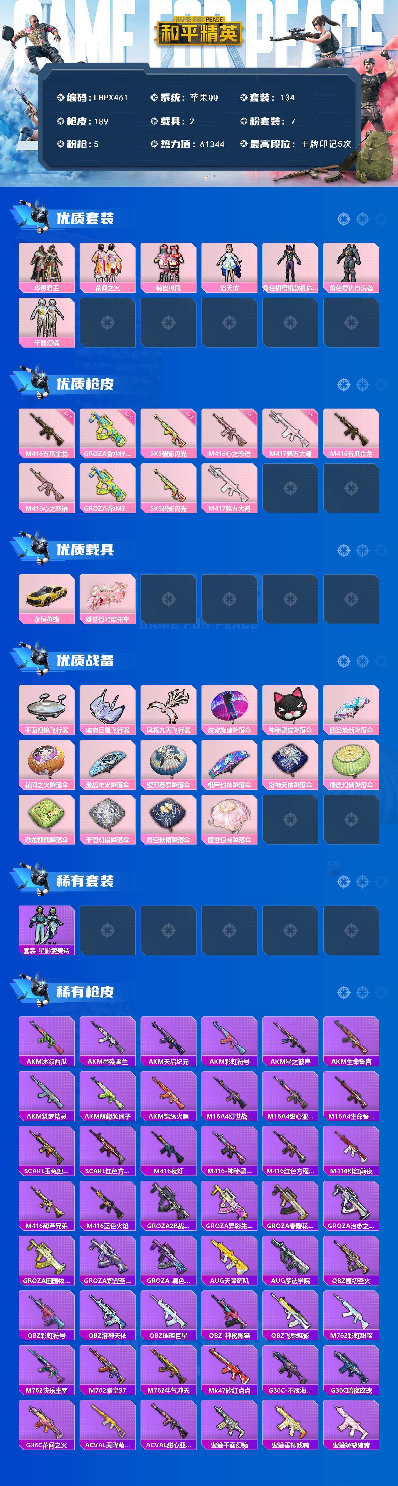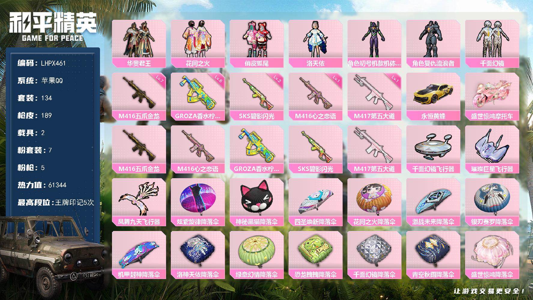 [15578111]【店主推荐捡漏号!可直接换绑】苹果 手q-7粉装-5特效呛-2载具-4粉色飞行器-61344热力值-5王牌印记-134套装-189呛皮 【粉色套装】:粉装-华贵君王,粉装-花间之火,粉装-俏皮狐尾,角色-洛天依,角色-初号机款机体服,角色-复仇流浪者,粉装-千面幻镜 【粉色呛皮等级】:m416-五爪金龙七级,m416-心之恋语一级,groza-香水柠檬六级,sks-碧影闪光二级,m417-第五大道一级 【粉色载具】:永恒黄蜂,盛世惊鸿摩托车 【粉色呛皮】:m416-五爪金龙,m416-心之恋语,groza-香水柠檬,sks-碧影闪光,m417-第五大道 【粉色飞行器】:千面幻镜飞行器,璀璨巨星飞行器,凤舞九天飞行器 【粉色降落伞】:炫紫旋律降落伞,神秘黑猫降落伞,四圣焕新降落伞,花间之火降落伞,激战未来降落伞,银刃赛罗降落伞,机甲封神降落伞,洛神天依降落伞,绿意幻情降落伞,恐龙拽拽降落伞,千面幻镜降落伞,青空秋雨降落伞,盛世惊鸿降落伞 【稀有套装】:套装-星影赞美诗 【稀有呛皮】:akm-冰凉西瓜,akm-墨染幽兰,akm-天启纪元,akm-彩虹符号,akm-星之彼岸,akm-生命誓言,akm-筑梦精灵,akm-萌趣颜团子,akm-锦绣火鲤,m16a4-幻世战舞者,m16a4-甜心亚梦,m16a4-生命誓言,scar-l-玉兔迎春,scar-l-红色方程式,m416-夜灯,m416-神秘黑猫,m416-红色方程式,m416-绯红前夜,m416-葫芦兄弟,m416-蓝色火焰,groza-2b战斗服款,groza-异彩先驱,groza-春暖花开,groza-治愈之星,groza-田园牧歌,groza-紫翼圣骑,groza-黑色刀锋,aug-天降萌叽,aug-魔法学院,q-原初圣火,q-彩虹符号,q-洛神天依,q-璀璨巨星,q-神秘黑猫,q-飞驰魅影,m762-彩虹甜喵,m762-快乐主宰,m762-拳皇97,m762-牛气冲天,mk47-妙红点点,g36c-不夜海上花,g36c-暗夜玫瑰,g36c-花间之火,ac-val-天降萌叽,ac-val-甜心亚梦,蜜獾-千面幻镜,蜜獾-垂柳戏鸭,蜜獾-娇憨猪猪,uzi-众神之王,uzi-娇憨猪猪,uzi-幻影战神,uzi-炫彩节奏,uzi-金风玉露,uzi-盛世惊鸿,ump45-天启