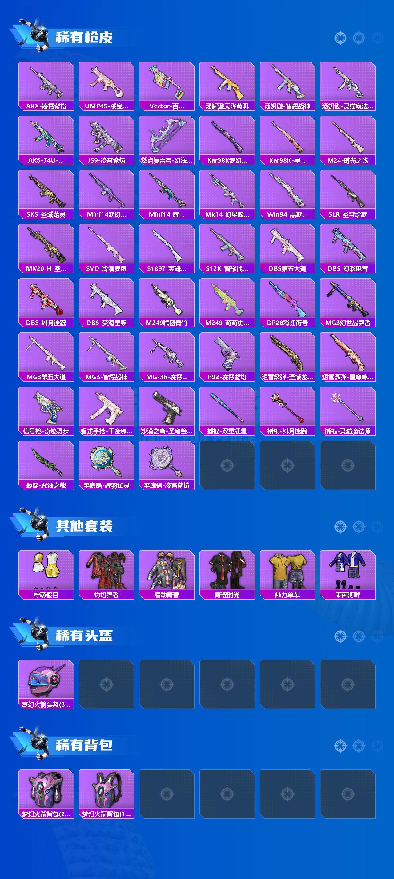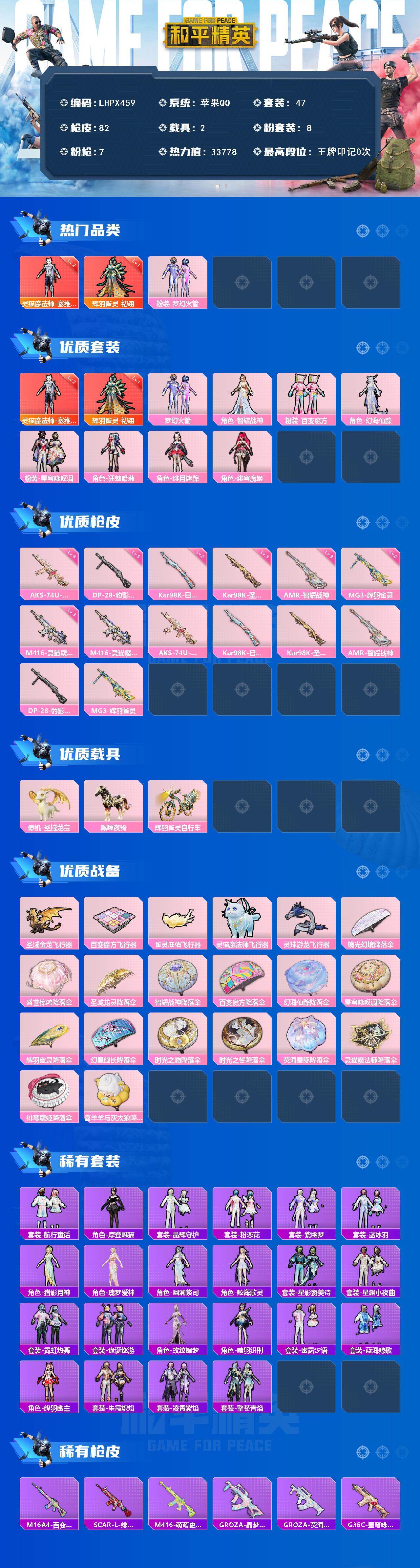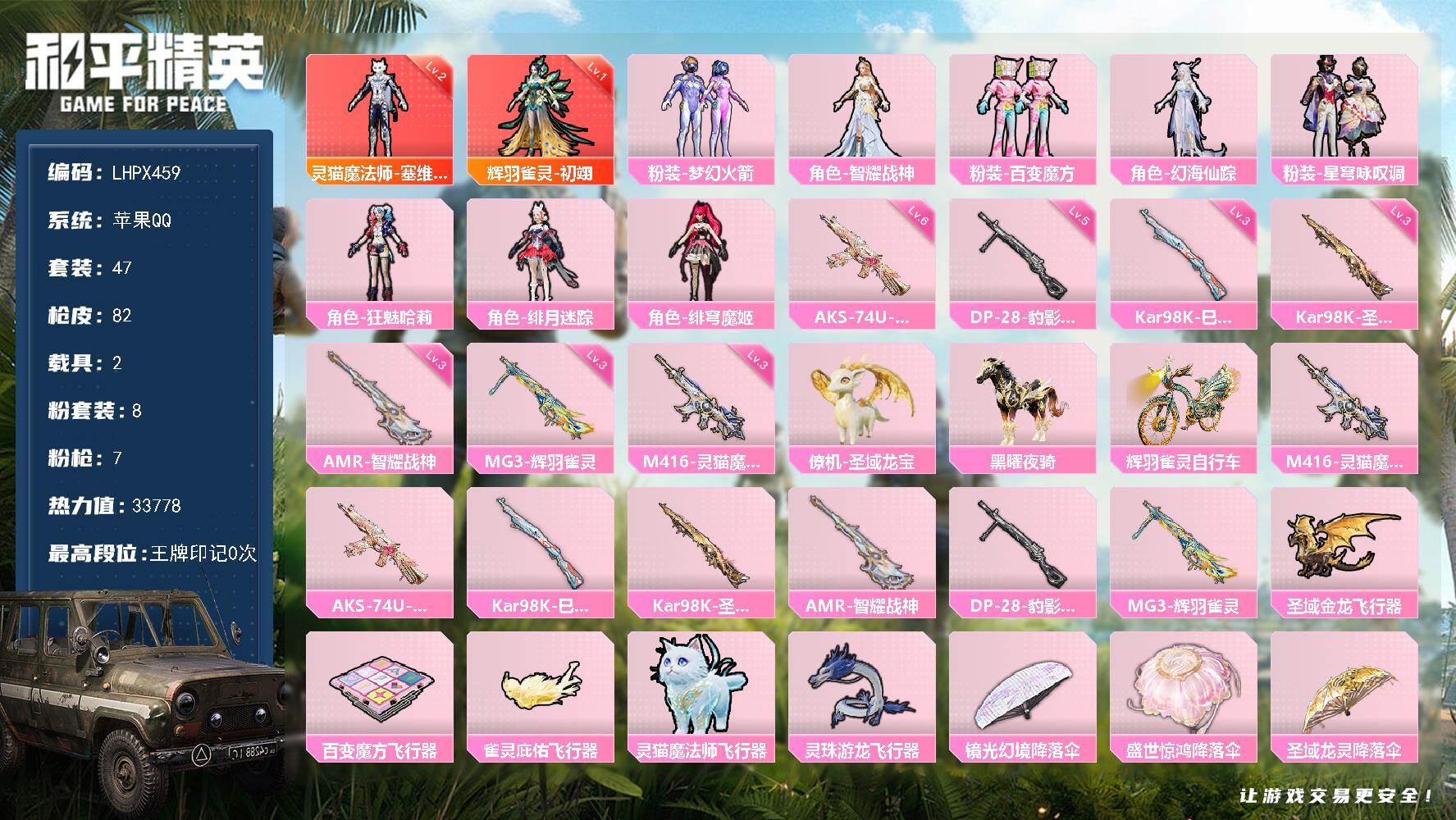 [15578135]【店主推荐捡漏号!可直接换绑】苹果 手q-2神装-8粉装-7特效呛-2载具-5粉色飞行器-33778热力值-1王牌印记-47套装-82呛皮 【红色神装等级】:灵猫魔法师-塞维尔二级,辉羽雀灵-初翊一级 【红色角色神装】:灵猫魔法师-塞维尔,辉羽雀灵-初翊 【热门品类】:粉装-梦幻火箭 【粉色套装】:粉装-梦幻火箭,角色-智耀战神,粉装-百变魔方,角色-幻海仙踪,粉装-星穹咏叹调,角色-狂魅哈莉,角色-绯月迷踪,角色-绯穹魔姬 【粉色呛皮等级】:m416-灵猫魔法师三级,aks-74u-星穹咏叹调六级,kar98k-巳巳如意三级,kar98k-圣域龙灵三级,amr-智耀战神三级,dp-28-豹影疾电五级,mg3-辉羽雀灵三级 【粉色载具】:僚机-圣域龙宝,黑曜夜骑,辉羽雀灵自行车 【粉色呛皮】:m416-灵猫魔法师,aks-74u-星穹咏叹调,kar98k-巳巳如意,kar98k-圣域龙灵,amr-智耀战神,dp-28-豹影疾电,mg3-辉羽雀灵 【粉色飞行器】:圣域金龙飞行器,百变魔方飞行器,雀灵庇佑飞行器,灵猫魔法师飞行器,灵珠游龙飞行器 【粉色降落伞】:镜光幻境降落伞,盛世惊鸿降落伞,圣域龙灵降落伞,智耀战神降落伞,百变魔方降落伞,幻海仙踪降落伞,星穹咏叹调降落伞,辉羽雀灵降落伞,幻星舰长降落伞,时光之吻降落伞,时光之誓降落伞,荧海星豚降落伞,灵猫魔法师降落伞,绯穹魔姬降落伞,喜羊羊与灰太狼降落伞 【稀有套装】:套装-航行童话,角色-摩登魅猫,套装-晶辉守护,套装-粉恋花,套装-紫幽梦,套装-蓝冰羽,角色-猎影月神,角色-瑰梦爱神,角色-幽澜祭司,角色-鲛海歌灵,套装-星影赞美诗,套装-星渊小夜曲,套装-霓虹热舞,套装-诡诞巡游,角色-玫纹锢梦,角色-黯羽织刑,套装-蜜露汐语,套装-蓝海鲸歌,角色-绛羽幽主,套装-朱霞炽焰,套装-凌霄紫焰,套装-擎苍青焰 【稀有呛皮】:m16a4-百变魔方,scar-l-绯月迷踪,m416-萌萌史莱姆,groza-荧海星豚,groza-晶梦幻蝶,g36c-星穹咏叹调,arx-凌霄紫焰,ump45-绒宝小鹅,vect-百变魔方,汤姆逊-天降萌叽,汤姆逊-灵猫魔法师,汤姆逊-智耀战神,aks-74u-辉羽雀灵,js9-凌霄紫焰,燃点复合弓-幻海仙踪,kar98k-梦幻火箭,kar98k-星穹