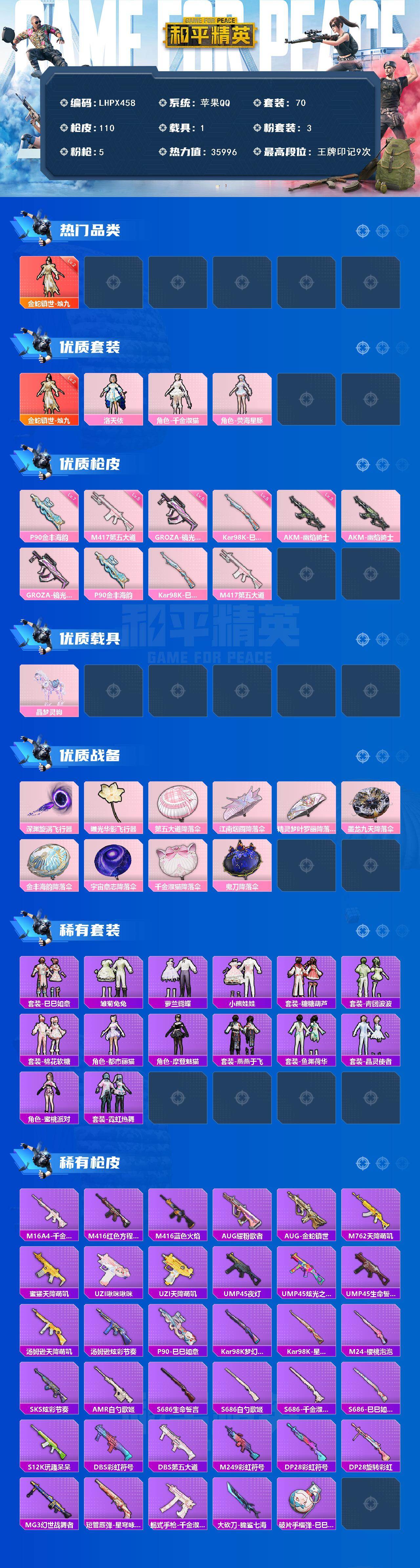 [15578151]【店主推荐捡漏号!可直接换绑】苹果 手q-1神装-3粉装-5特效呛-1载具-3粉色飞行器-35996热力值-9王牌印记-70套装-110呛皮 【红色神装等级】:金蛇镇世-烛九二级 【红色角色神装】:金蛇镇世-烛九 【粉色套装】:角色-洛天依,角色-千金淑猫,角色-荧海星豚 【粉色呛皮等级】:akm-幽焰骑士三级,groza-镜光银凌五级,p90-金丰海韵七级,kar98k-巳巳如意五级,m417-第五大道五级 【粉色载具】:晶梦灵驹 【粉色呛皮】:akm-幽焰骑士,groza-镜光银凌,p90-金丰海韵,kar98k-巳巳如意,m417-第五大道 【粉色飞行器】:深渊漩涡飞行器,曦光华影飞行器 【粉色降落伞】:第五大道降落伞,江南烟雨降落伞,精灵梦叶罗丽降落伞,墨龙九天降落伞,金丰海韵降落伞,宇宙意志降落伞,千金淑猫降落伞,鬼刀降落伞,炫彩糖果降落伞 【稀有套装】:套装-巳巳如意,套装-雏菊兔兔,套装-萝兰蝴蝶,套装-小熊娃娃,套装-糖糖葫芦,套装-青团波波,套装-棉花软糖,角色-都市丽猫,角色-摩登魅猫,套装-燕燕于飞,套装-鱼渊荷华,套装-晶灵使者,角色-蜜桃派对,套装-霓虹热舞,套装-炫彩糖果 【稀有呛皮】:m16a4-千金淑猫,m416-红色方程式,m416-蓝色火焰,aug-耀粉歌者,aug-金蛇镇世,m762-天降萌叽,蜜獾-天降萌叽,uzi-啾咪啾咪,uzi-天降萌叽,ump45-夜灯,ump45-炫光之旅,ump45-生命誓言,汤姆逊-天降萌叽,汤姆逊-炫彩节奏,p90-巳巳如意,kar98k-梦幻火箭,kar98k-星穹咏叹调,m24-樱桃泡泡,sks-炫彩节奏,amr-白勺歌姬,s686-生命誓言,s686-白勺歌姬,s686-巳巳如意,s686-千金淑猫,s12k-玩趣呆呆,dbs-彩虹符号,dbs-第五大道,m249-彩虹符号,dp-28-彩虹符号,dp-28-旋转彩虹,mg3-幻世战舞者,短管霰弹-星穹咏叹调,蝎式手呛-千金淑猫,大砍刀-脆鲨七海,破片手留单-巳巳如意 【其他套装】:套装-ss27特训,套装-ss28特训,套装-ss29特训,套装-光之冒险,套装-海岛探路者,套装-深蓝色名流,套装-湖蓝色名流,套装-特殊使命,套装-特训学院,套装-猎鹰,套装-猛禽,套装-王牌教练,套装-疯狂小兔子,套装-白色伏地魔