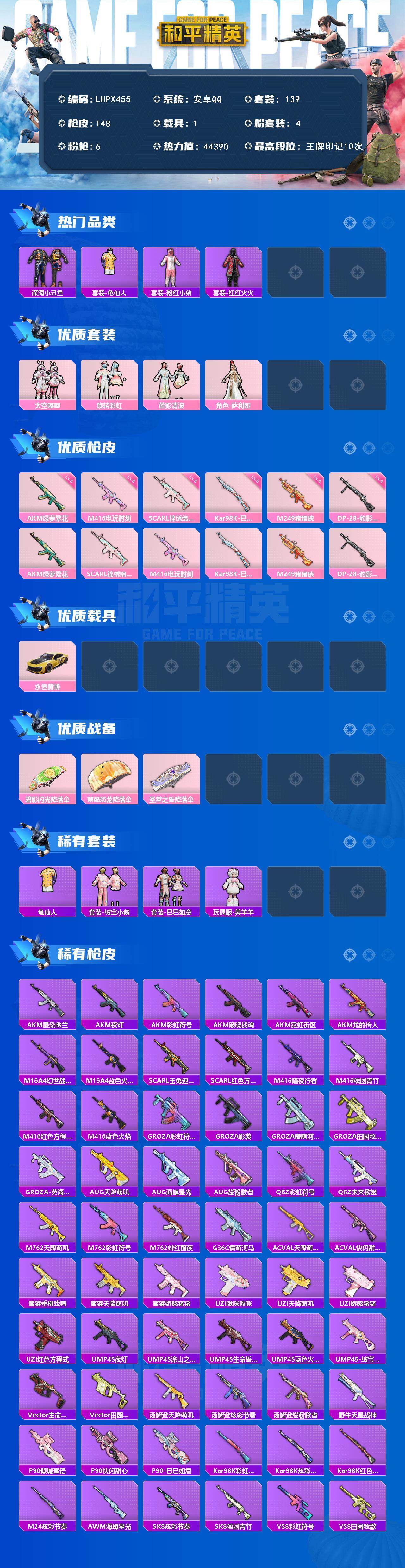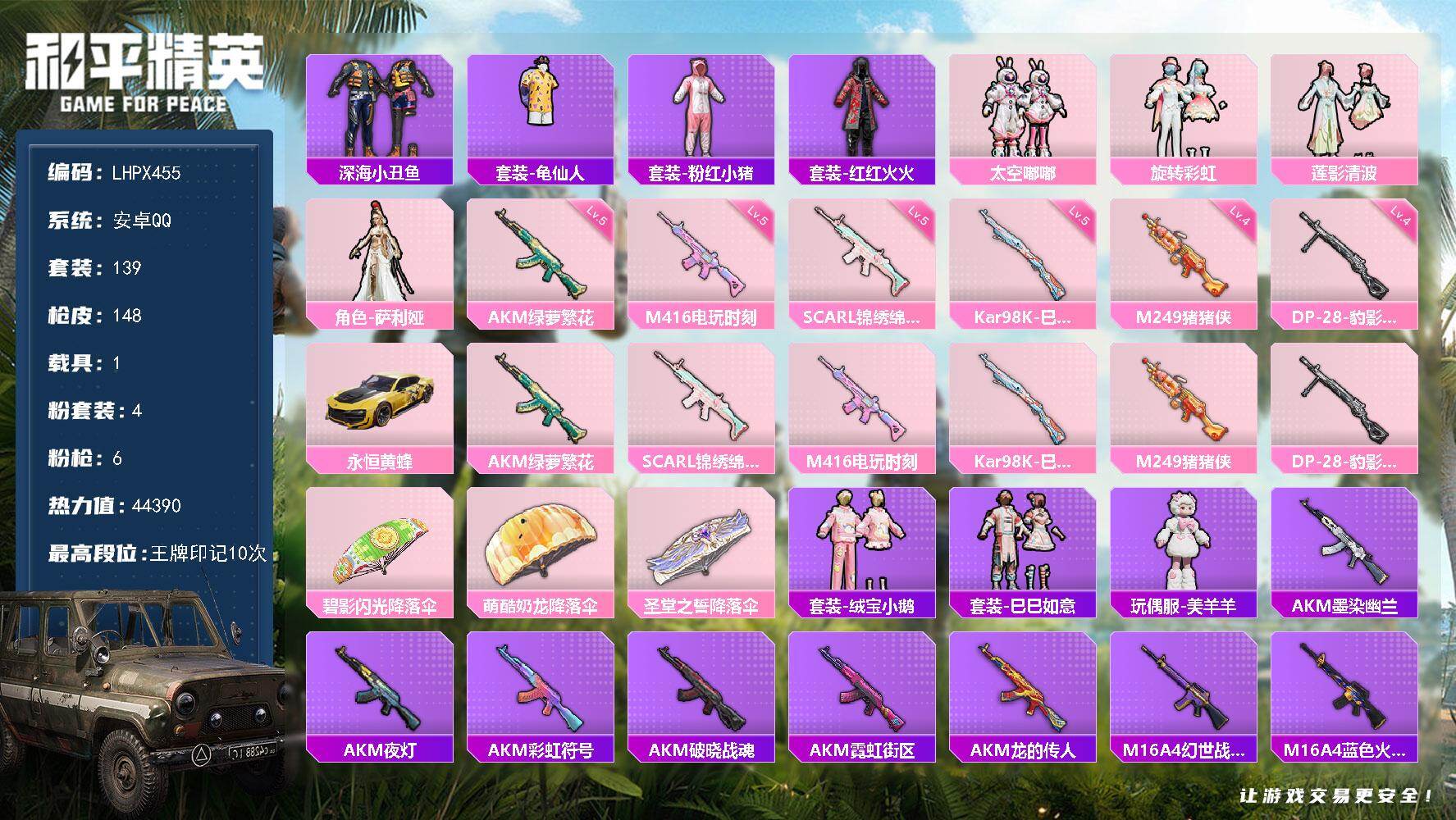 [15578169]【店主推荐捡漏号!可直接换绑】安卓 手q-4粉装-6特效呛-1载具-0粉色飞行器-44390热力值-10王牌印记-139套装-148呛皮 【热门品类】:套装-深海小丑鱼,套装-龟仙人,套装-粉红小猪,套装-红红火火 【粉色套装】:粉装-太空嘟嘟,粉装-旋转彩虹,粉装-莲影清波,角色-萨利娅 【粉色呛皮等级】:akm-绿萝繁花五级,scar-l-锦绣绵绵五级,m416-电玩时刻五级,kar98k-巳巳如意五级,m249-猪猪侠四级,dp-28-豹影疾电四级 【粉色载具】:永恒黄蜂 【粉色呛皮】:akm-绿萝繁花,scar-l-锦绣绵绵,m416-电玩时刻,kar98k-巳巳如意,m249-猪猪侠,dp-28-豹影疾电 【粉色降落伞】:碧影闪光降落伞,萌酷奶龙降落伞,圣堂之誓降落伞,炫彩糖果降落伞 【稀有套装】:套装-龟仙人,套装-绒宝小鹅,套装-巳巳如意,玩偶服-美羊羊 【稀有呛皮】:akm-墨染幽兰,akm-夜灯,akm-彩虹符号,akm-破晓战魂,akm-霓虹街区,akm-龙的传人,m16a4-幻世战舞者,m16a4-蓝色火焰,scar-l-玉兔迎春,scar-l-红色方程式,m416-暗夜行者,m416-糯团青竹,m416-红色方程式,m416-蓝色火焰,groza-彩虹符号,groza-影袭,groza-懵萌河马,groza-田园牧歌,groza-荧海星豚,aug-天降萌叽,aug-海螺星光,aug-耀粉歌者,q-彩虹符号,q-未来歌姬,m762-天降萌叽,m762-彩虹符号,m762-绯红前夜,g36c-懵萌河马,ac-val-天降萌叽,ac-val-快闪甜心,蜜獾-垂柳戏鸭,蜜獾-天降萌叽,蜜獾-娇憨猪猪,uzi-啾咪啾咪,uzi-天降萌叽,uzi-娇憨猪猪,uzi-红色方程式,ump45-夜灯,ump45-涂山之恋,ump45-生命誓言,ump45-蓝色火焰,ump45-绒宝小鹅,vect-生命誓言,vect-田园牧歌,汤姆逊-天降萌叽,汤姆逊-炫彩节奏,汤姆逊-耀粉歌者,野牛-天星战神,p90-倾城蜜语,p90-快闪甜心,p90-巳巳如意,kar98k-彩虹符号,kar98k-炫彩节奏,kar98k-红色方程式,m24-炫彩节奏,awm-海螺星光,sks-炫彩节奏,sks-糯团青竹,vss-彩虹符号,vss-田