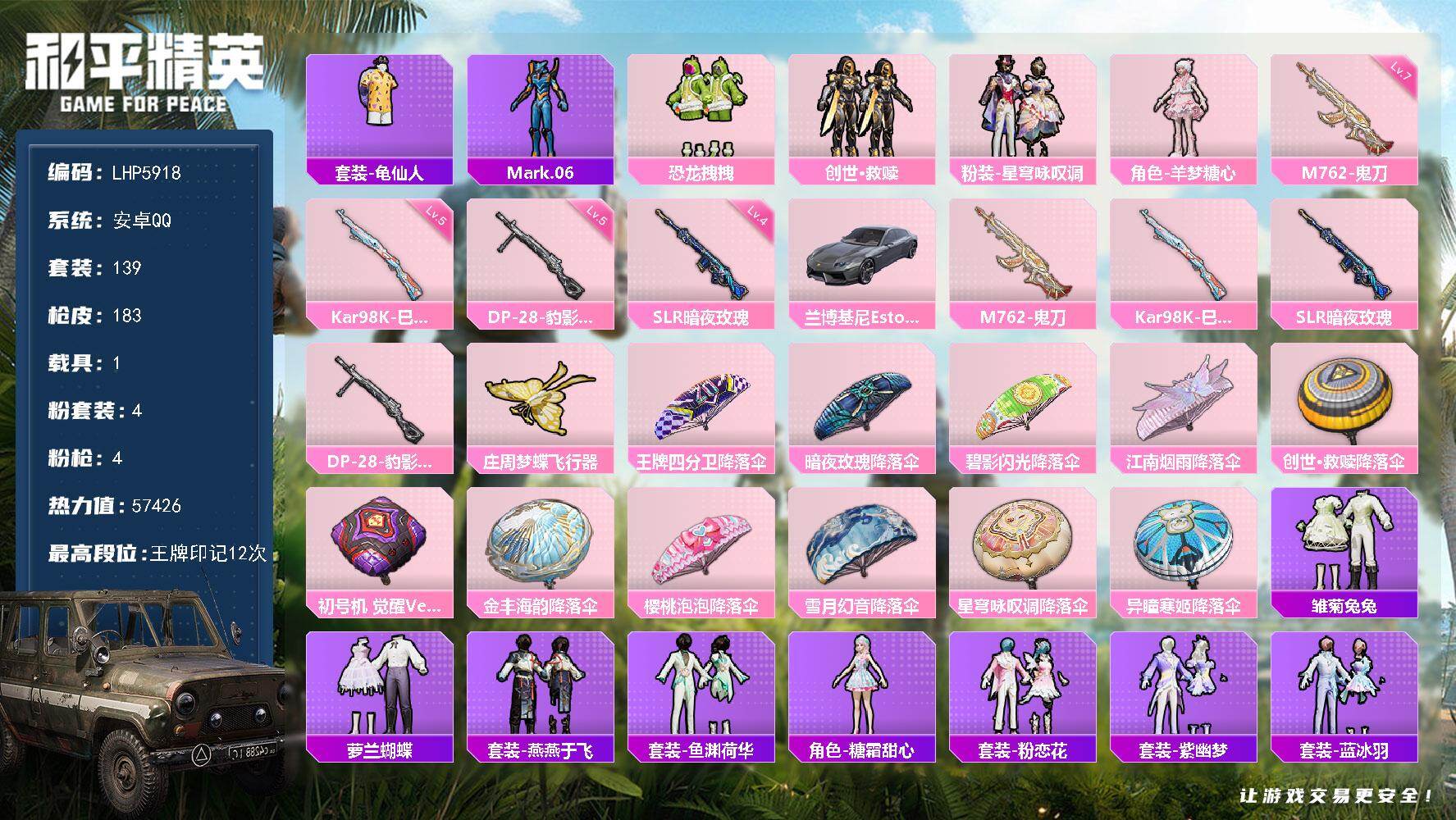 [15579411]【特价出售/店主推荐】 安卓 手q-4粉装-4特效呛-1载具-1粉色飞行器-5.7w热力值-12王牌印记-139套装-183呛皮【热门品类】:套装-龟仙人,角色-mark.0【粉色套装 【稀有背包】:梦幻火箭背包2级,深海小丑鱼背包2级,深海小丑鱼背包1级