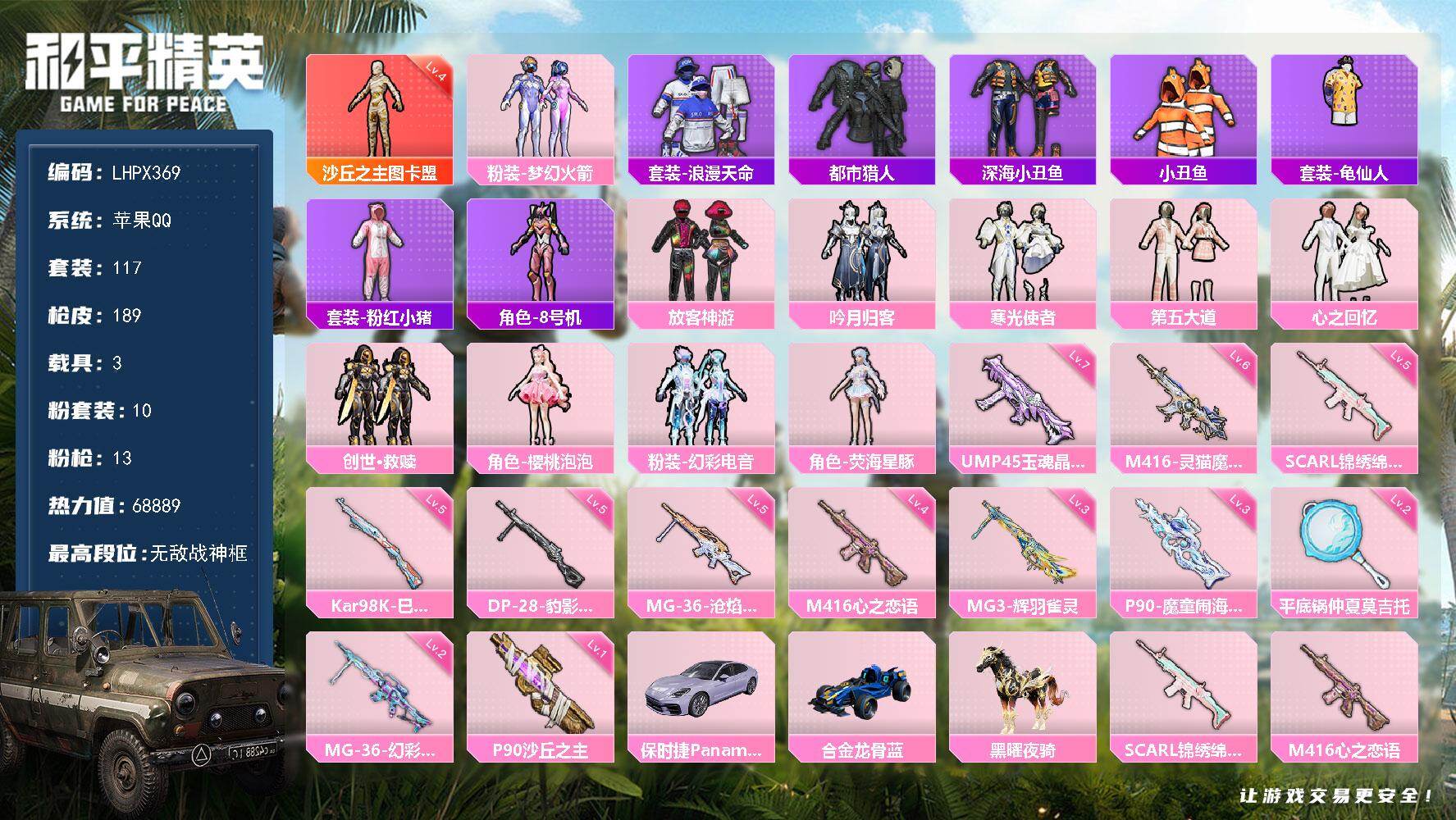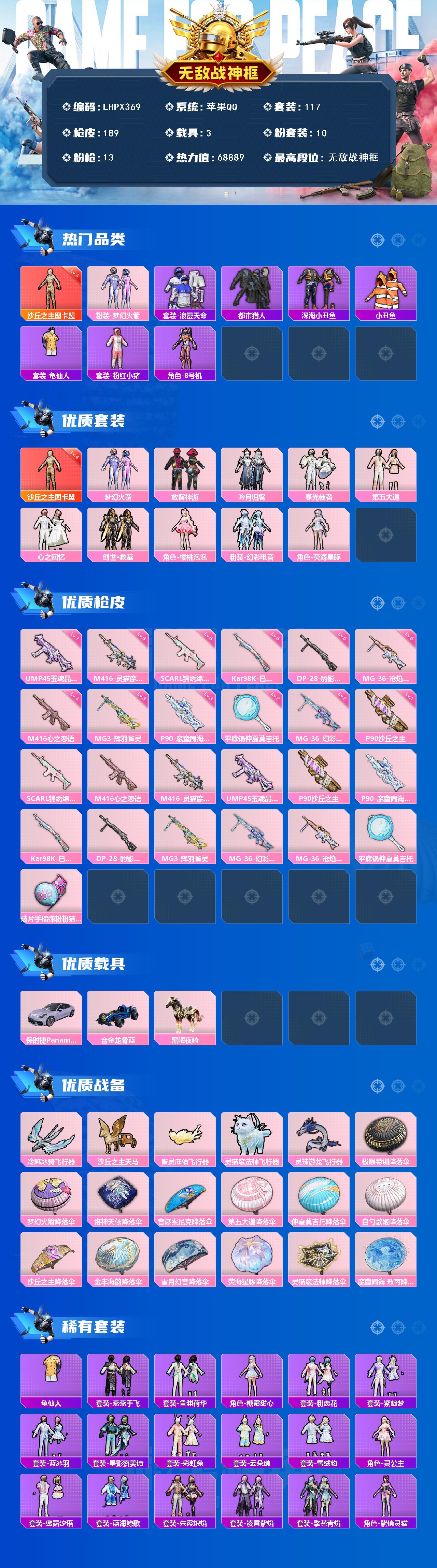 [15580000]苹果 手q-无敌战神框-1神装-10粉装-13特效呛-3载具-6粉色飞行器-68889热力值-8王牌印记-117套装-189呛皮 【红色神装等级】:沙丘之主-图卡盟四级 【红色角色神装】:沙丘之主-图卡盟 【热门品类】:粉装-梦幻火箭,套装-浪漫天命,套装-都市猎人,套装-深海小丑鱼,套装-小丑鱼,套装-龟仙人,套装-粉红小猪,角色-8号机 【粉色套装】:粉装-梦幻火箭,粉装-放客神游,粉装-吟月归客,粉装-寒光使者,粉装-第五大道,粉装-心之回忆,套装-创世·救赎,角色-樱桃泡泡,粉装-幻彩电音,角色-荧海星豚 【粉色呛皮等级】:scar-l-锦绣绵绵五级,m416-心之恋语四级,m416-灵猫魔法师六级,ump45-玉魂晶魄七级,p90-沙丘之主一级,p90-魔童闹海 敖丙三级,kar98k-巳巳如意五级,dp-28-豹影疾电五级,mg3-辉羽雀灵三级,mg-36-幻彩电音二级,mg-36-沧焰双生五级,平底锅-仲夏莫吉托二级 【粉色载具】:保时捷panamera(星辰紫),合金龙骨(蓝),黑曜夜骑 【粉色呛皮】:scar-l-锦绣绵绵,m416-心之恋语,m416-灵猫魔法师,ump45-玉魂晶魄,p90-沙丘之主,p90-魔童闹海 敖丙,kar98k-巳巳如意,dp-28-豹影疾电,mg3-辉羽雀灵,mg-36-幻彩电音,mg-36-沧焰双生,平底锅-仲夏莫吉托,破片手留单-粉粉猫爪 【粉色飞行器】:冷魅冰骑飞行器,沙丘之主天马,雀灵庇佑飞行器,灵猫魔法师飞行器,灵珠游龙飞行器 【粉色降落伞】:极限特训降落伞,梦幻火箭降落伞,洛神天依降落伞,音爆索尼克降落伞,第五大道降落伞,仲夏莫吉托降落伞,白勺歌姬降落伞,沙丘之主降落伞,金丰海韵降落伞,雪月幻音降落伞,荧海星豚降落伞,灵猫魔法师降落伞,魔童闹海 敖丙降落伞 【稀有套装】:套装-龟仙人,套装-雪国风尚,套装-燕燕于飞,套装-鱼渊荷华,角色-糖霜甜心,套装-粉恋花,套装-紫幽梦,套装-蓝冰羽,套装-星影赞美诗,套装-彩虹兔,套装-云朵鹅,套装-雪绒豹,角色-灵公主,套装-蜜露汐语,套装-蓝海鲸歌,套装-朱霞炽焰,套装-凌霄紫焰,套装-擎苍青焰,角色-紫俏灵猫 【稀有呛皮】:akm-影袭,akm-缤纷海域,akm-灵猫魔法师,m16a4-幻世战舞者,scar