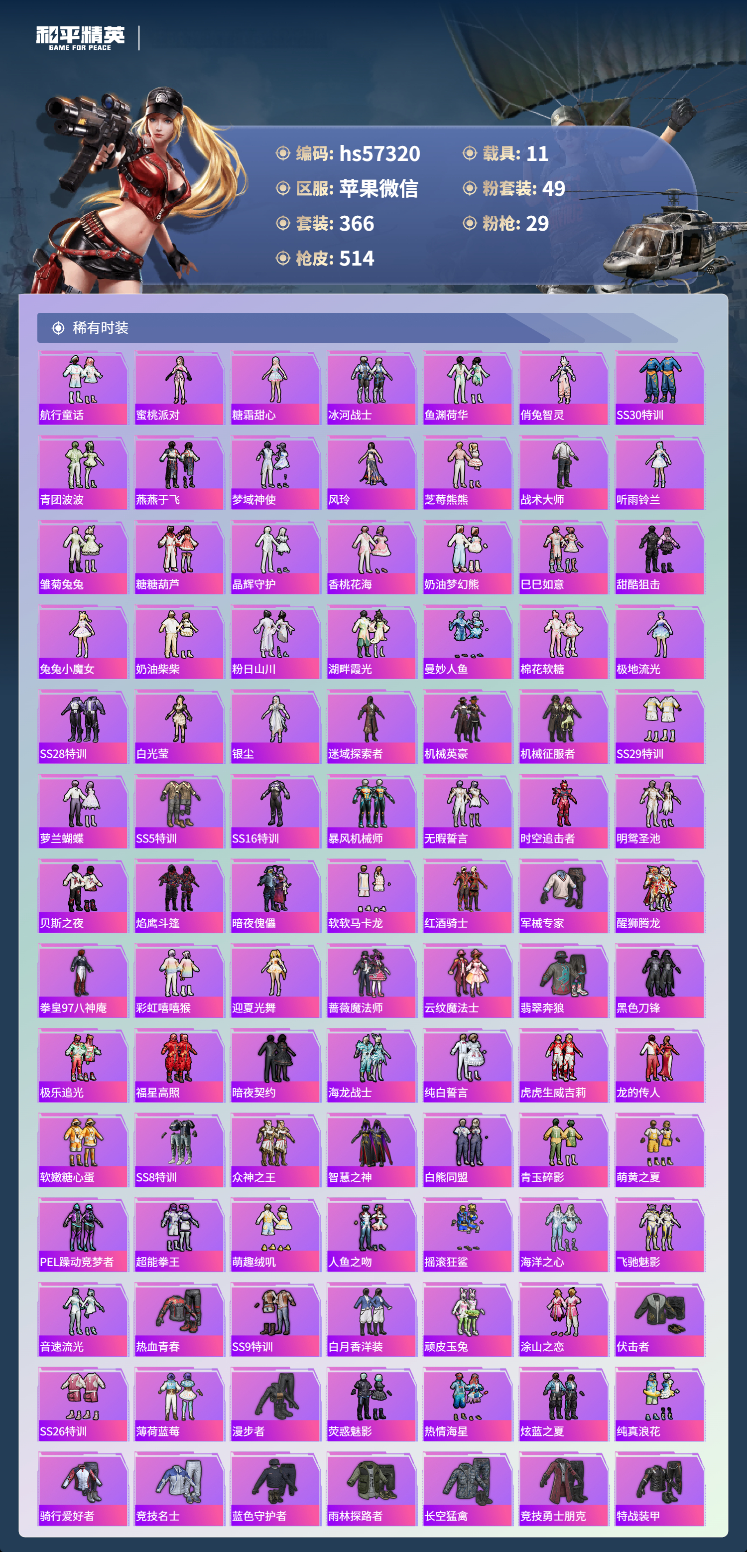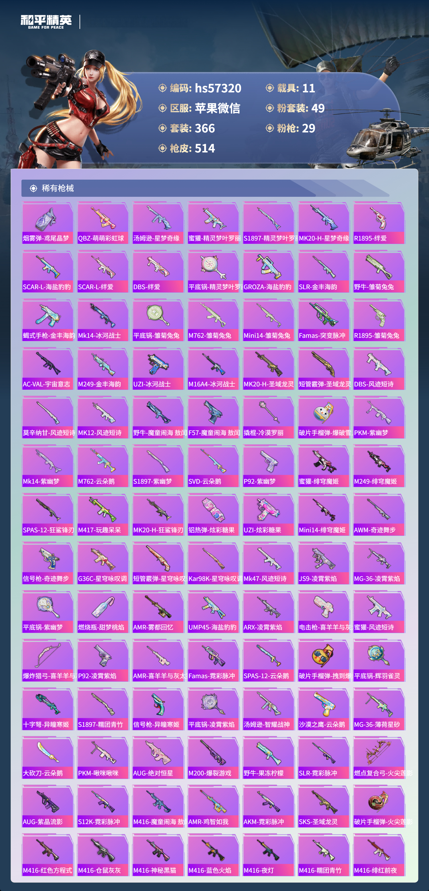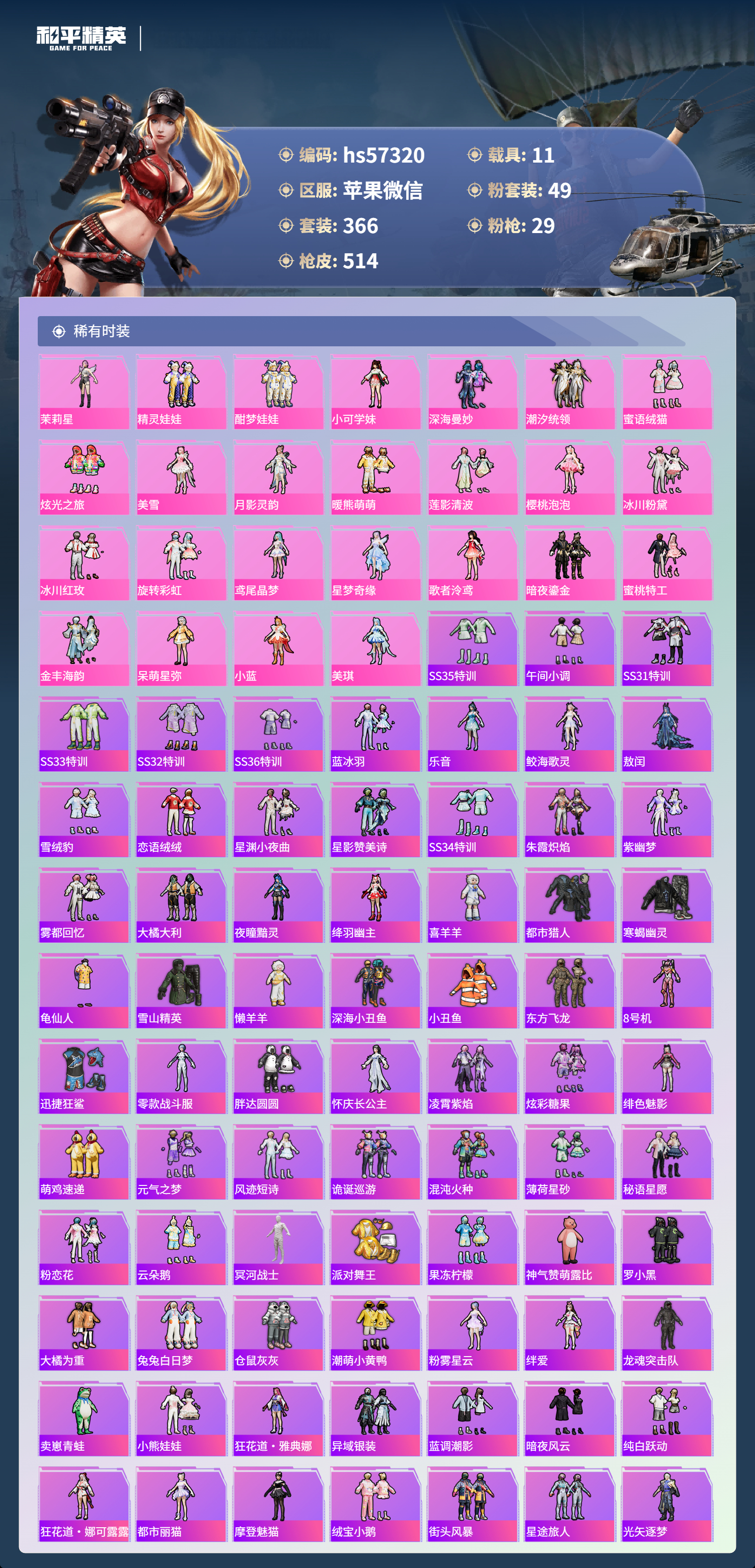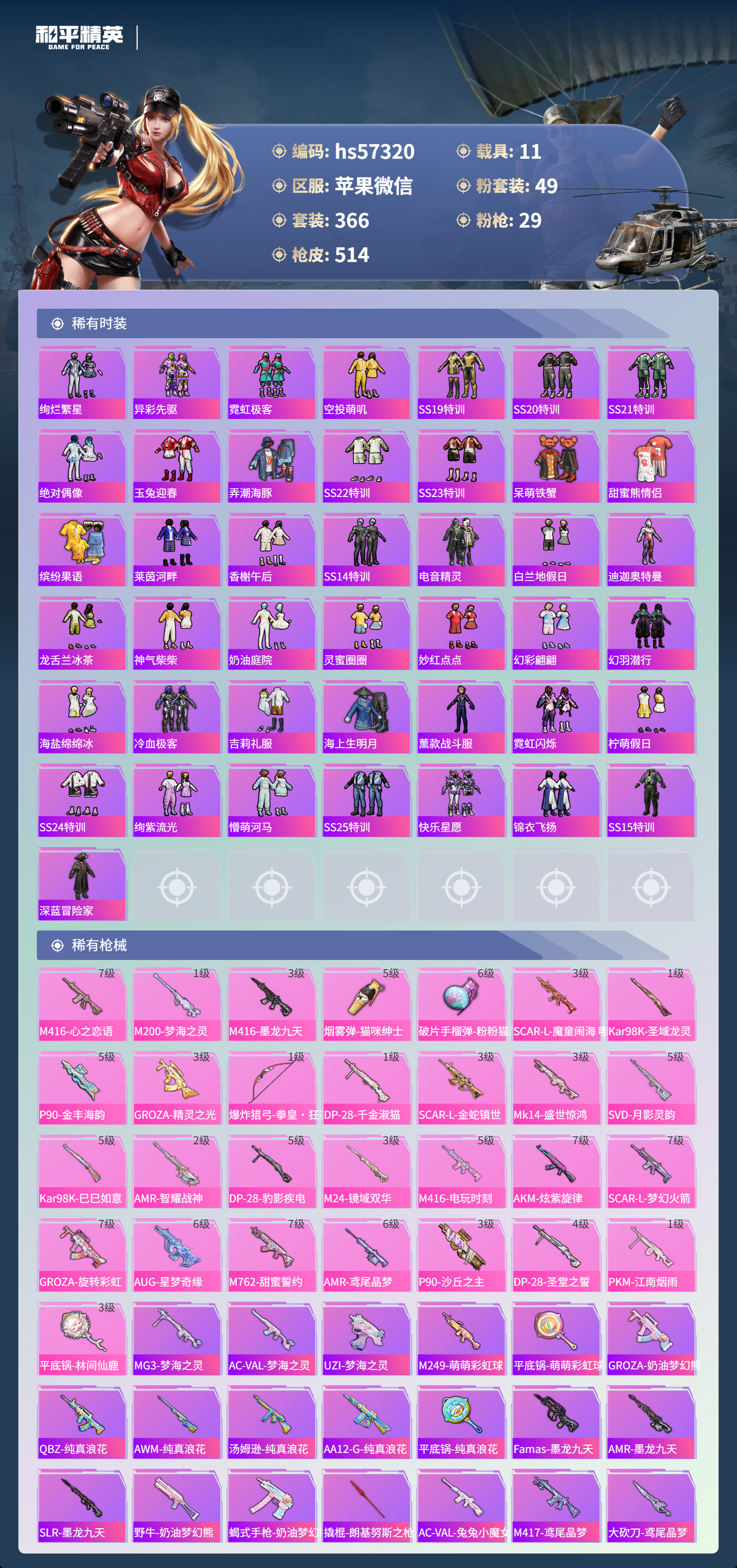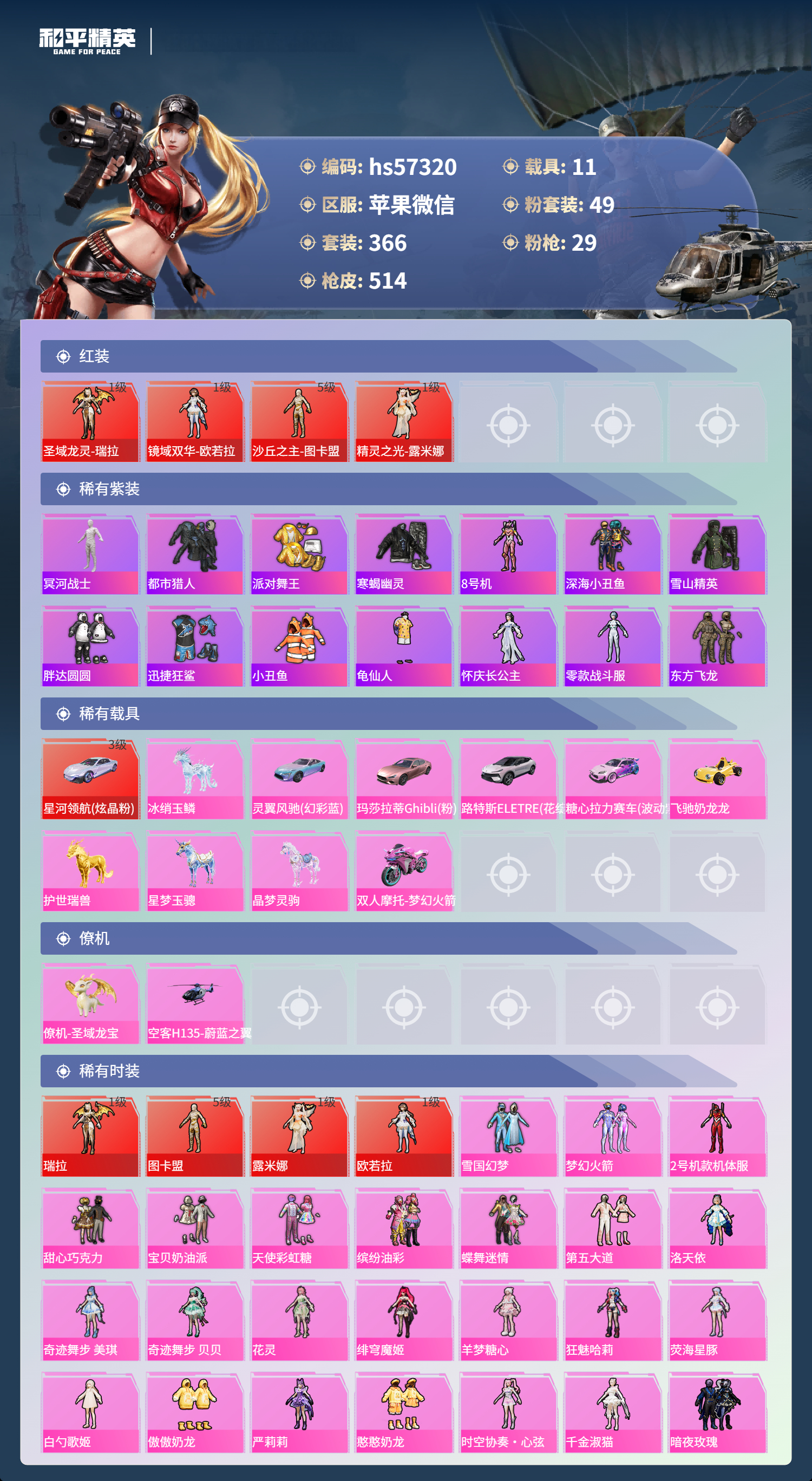 hs57320 苹果微信-34王牌印记-有战神框-4红装-49粉装-29特效呛-11载具-热力值-366套装-514呛皮-13卓越印记-13传奇印记【4红装】圣域龙灵-瑞拉/1级镜域双华-欧若拉/1级精灵之光-露米娜/1级沙丘之主-图卡盟/5级【49粉装】角色-歌者泠鸢角色-小蓝角色-星梦奇缘套装-莲影清波套装-天使彩虹糖套装-傲傲奶龙套装-旋转彩虹套装-深海曼