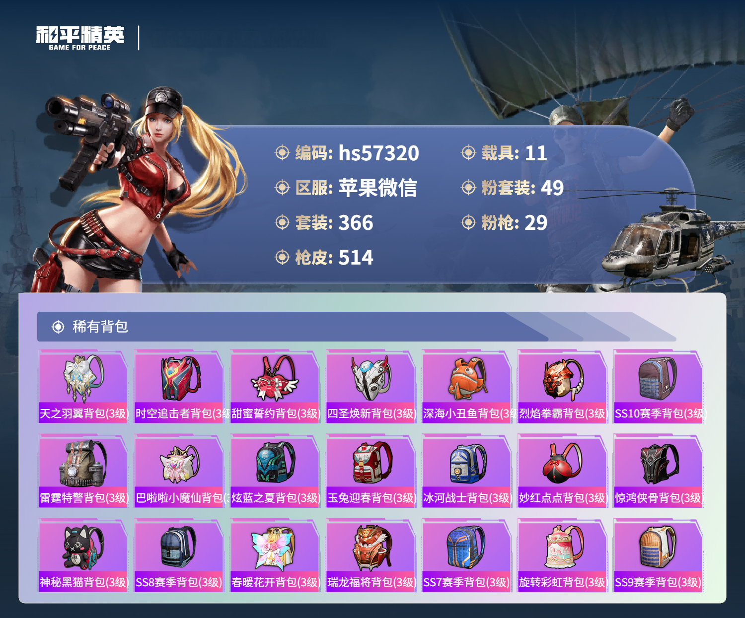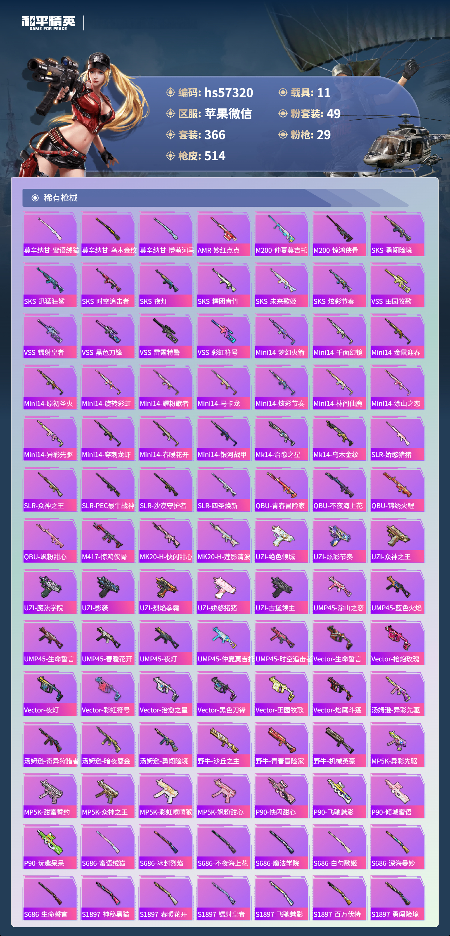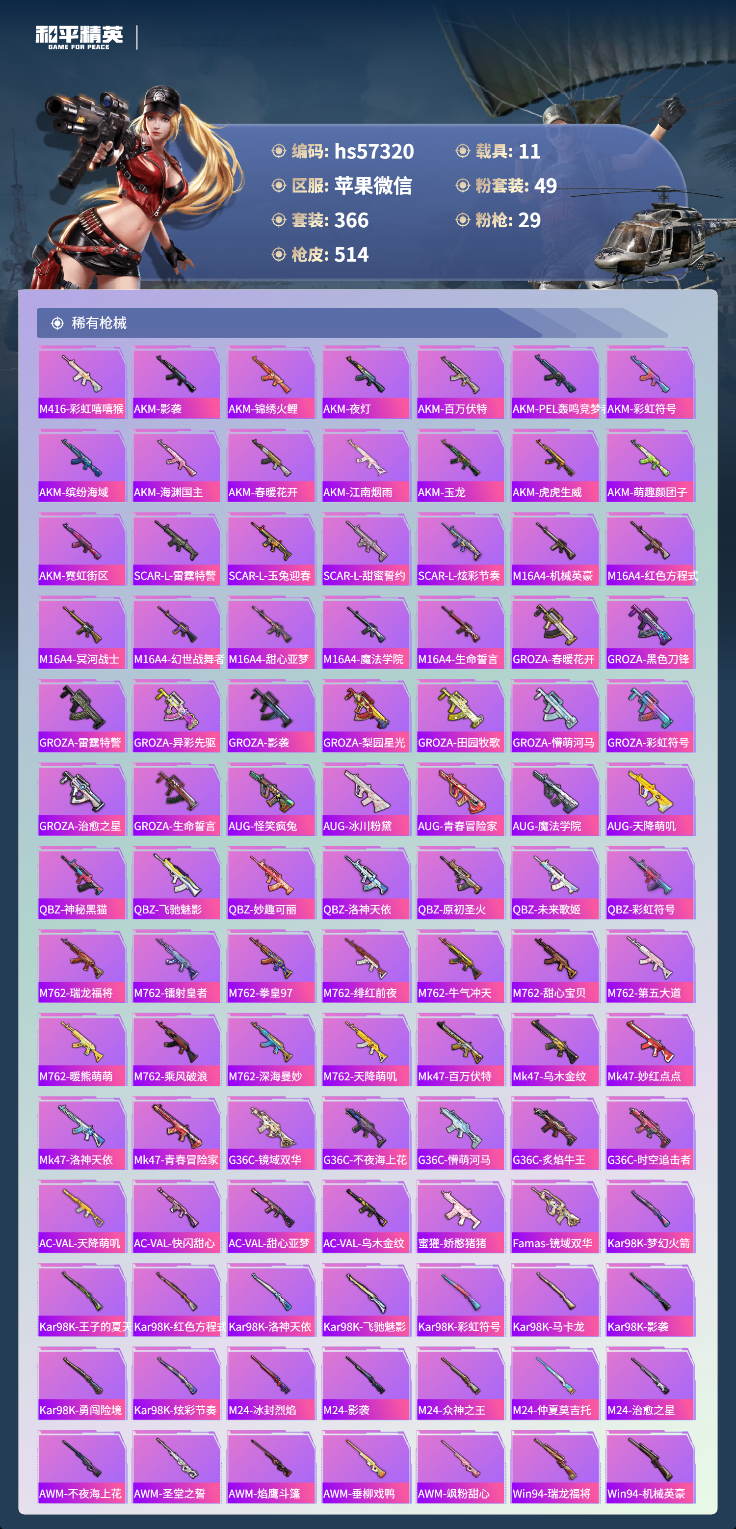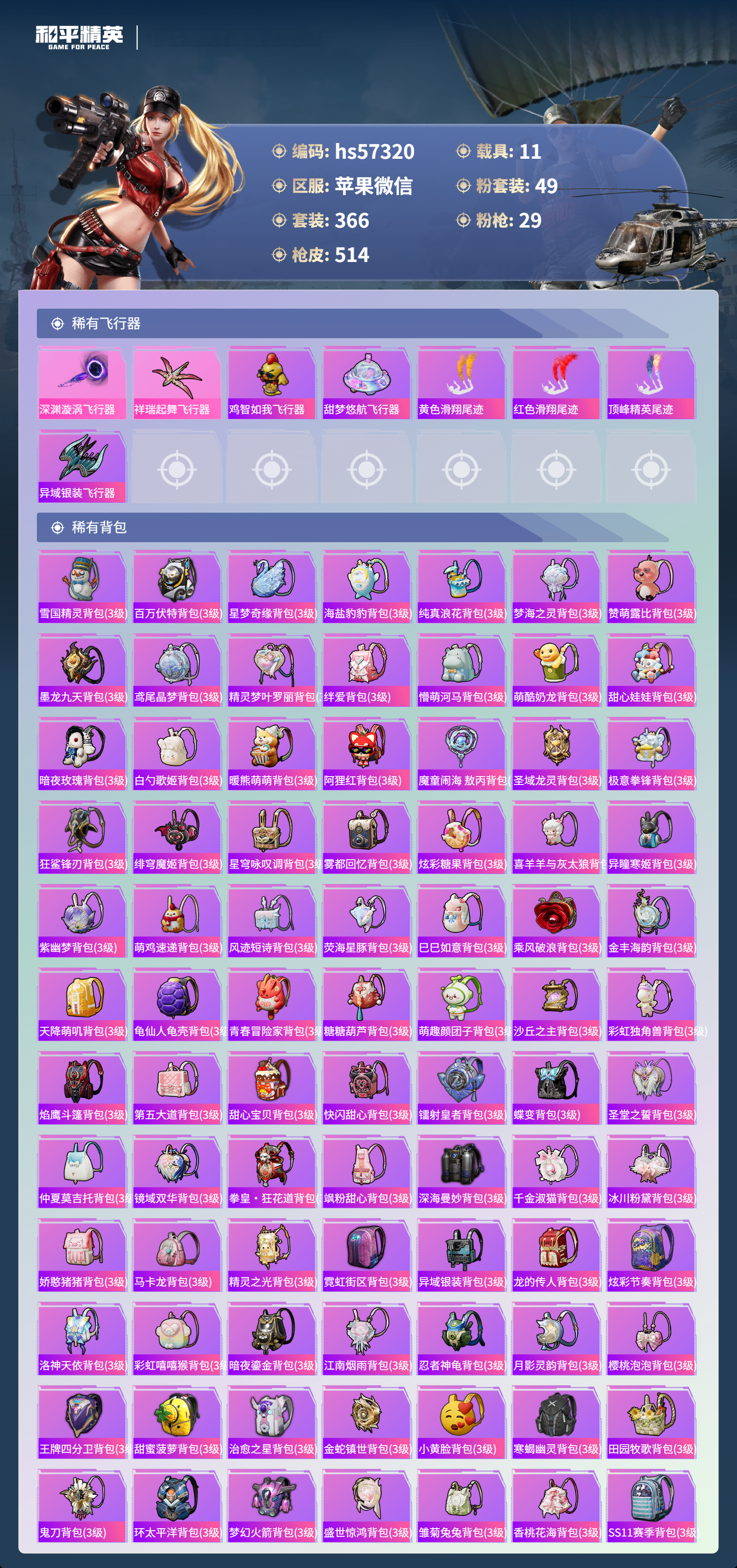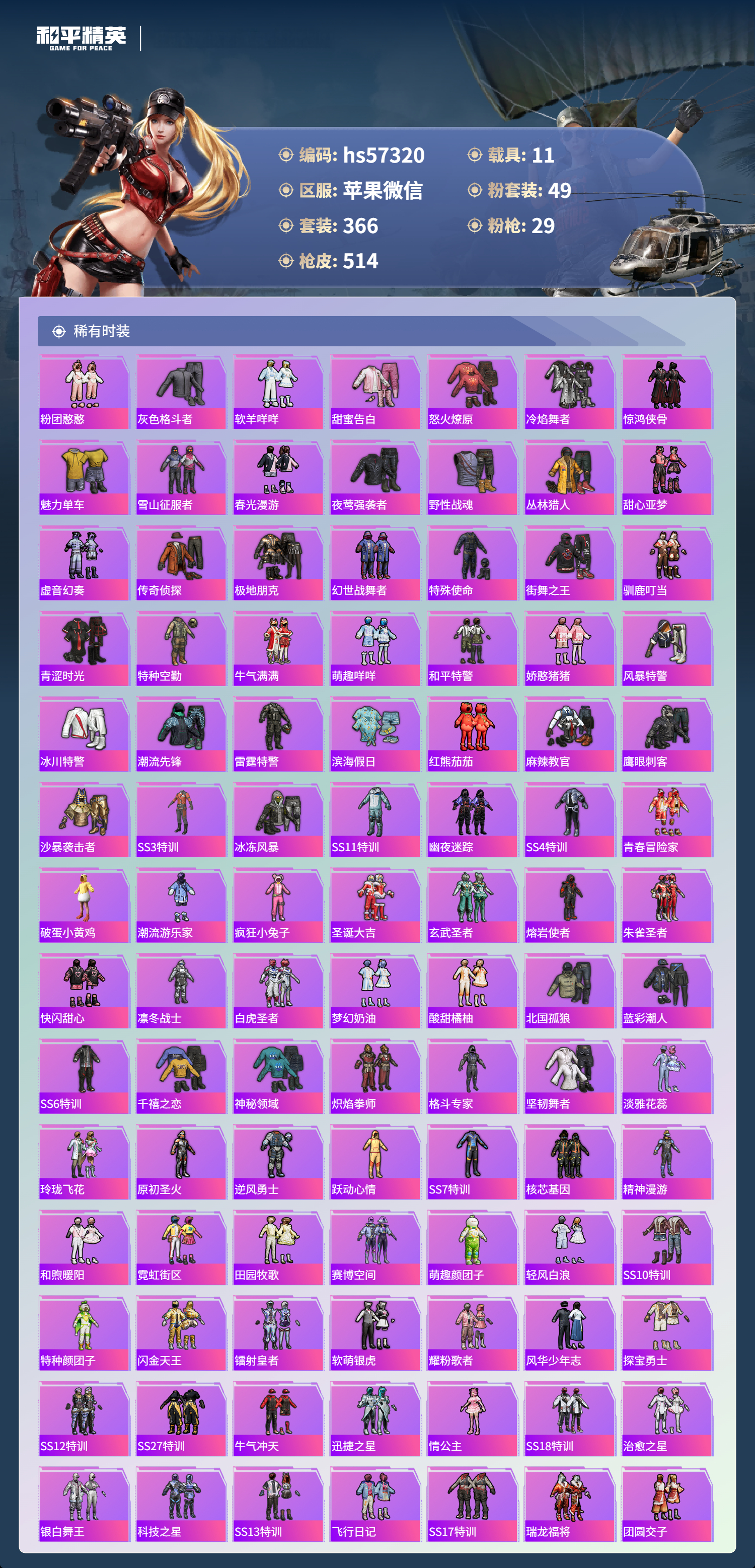 hs57320 苹果微信-34王牌印记-有战神框-4红装-49粉装-29特效呛-11载具-热力值-366套装-514呛皮-13卓越印记-13传奇印记【4红装】圣域龙灵-瑞拉/1级镜域双华-欧若拉/1级精灵之光-露米娜/1级沙丘之主-图卡盟/5级【49粉装】角色-歌者泠鸢角色-小蓝角色-星梦奇缘套装-莲影清波套装-天使彩虹糖套装-傲傲奶龙套装-旋转彩虹套装-深海曼