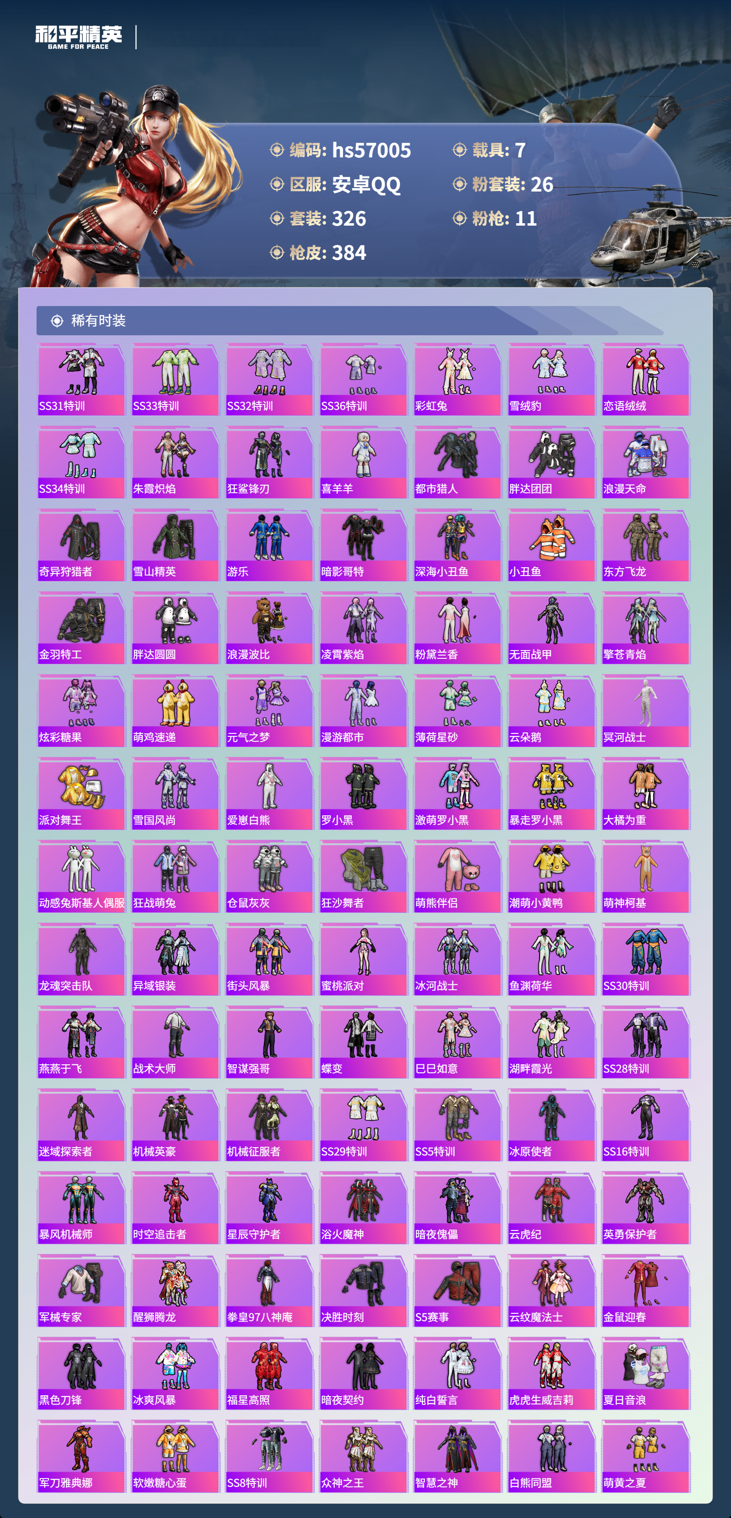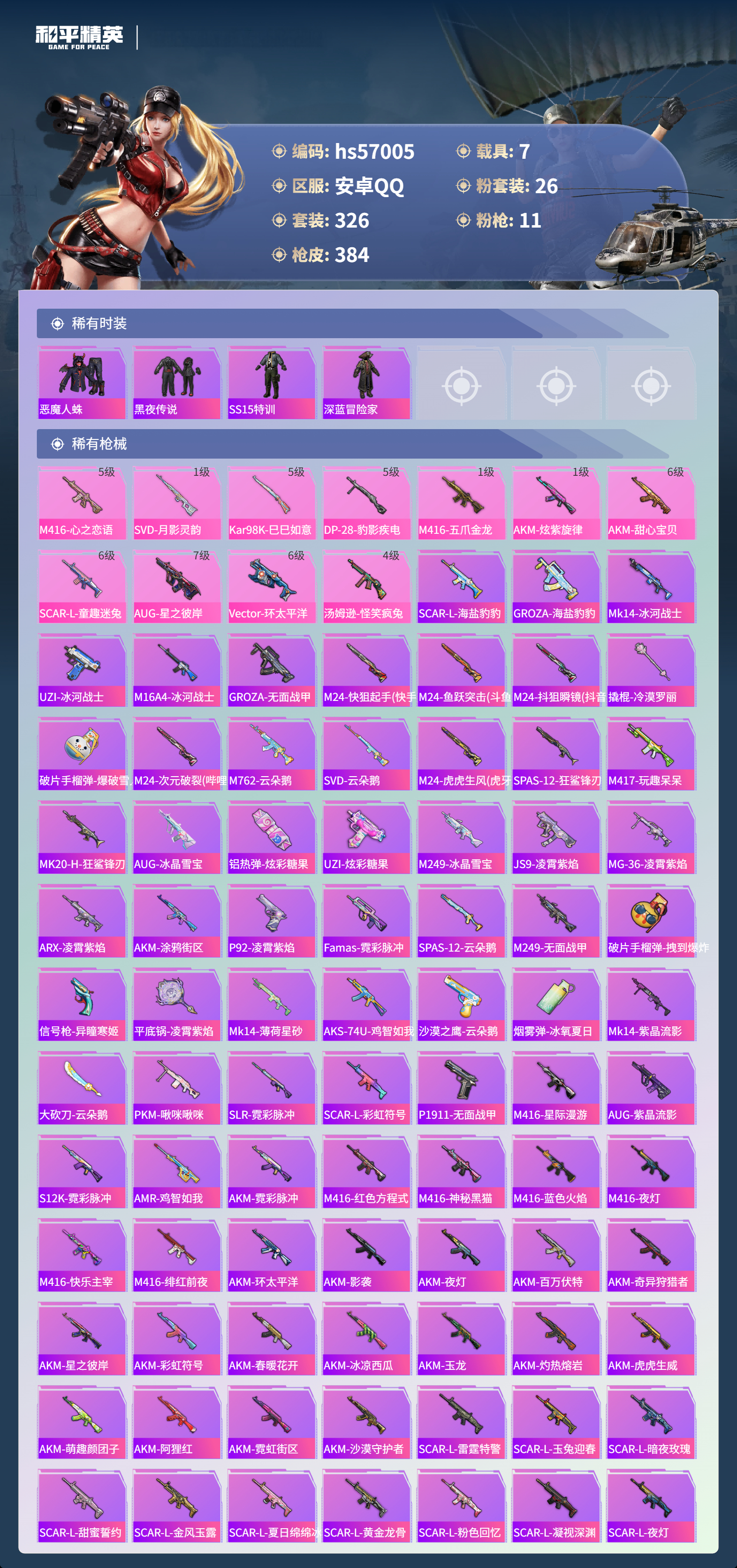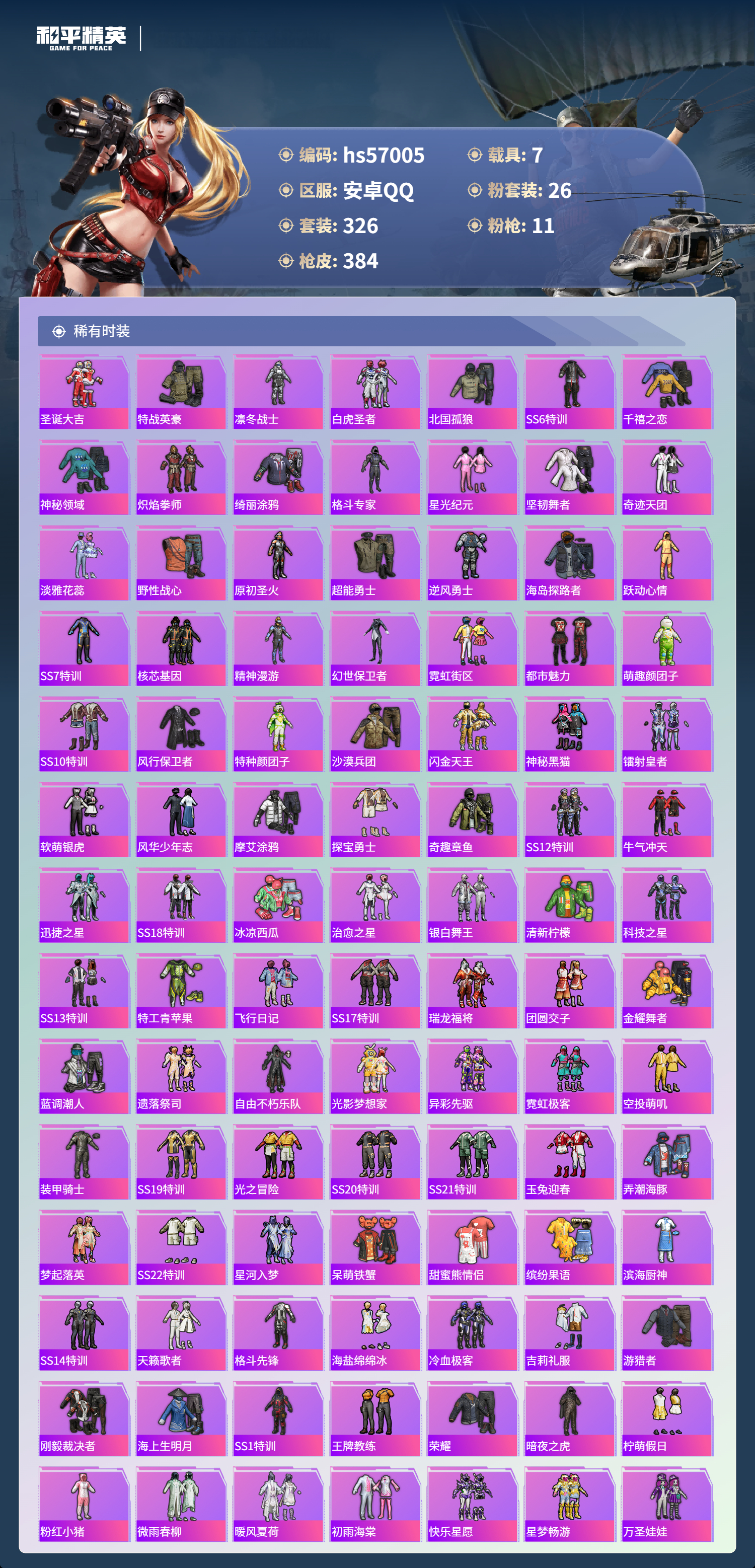 hs57005 安卓手q-27王牌印记-有战神框-1红装-26粉装-11特效呛-7载具-热力值-326套装-384呛皮【1红装】金蛇镇世-烛九/1级【26粉装】套装-怪诞乔克套装-冰霜白皇套装-极致幻想套装-骨龙祭渊套装-馨动时刻套装-数码大师套装-粉色回忆角色-复仇流浪者套装-彩虹鹿灵套装-深海曼妙套装-深渊皇后套装-梦幻火箭套装-甜蜜誓约套装-天使彩虹