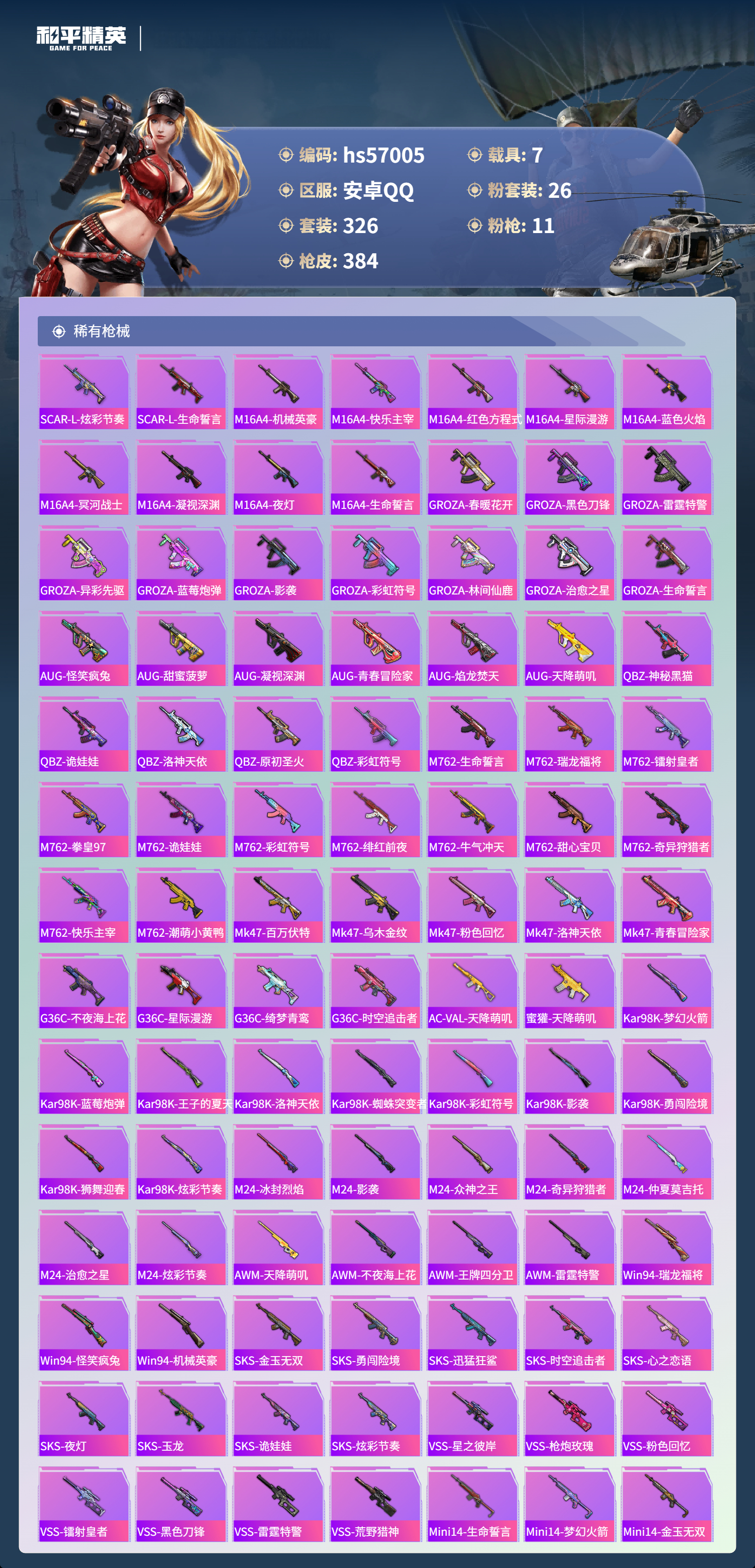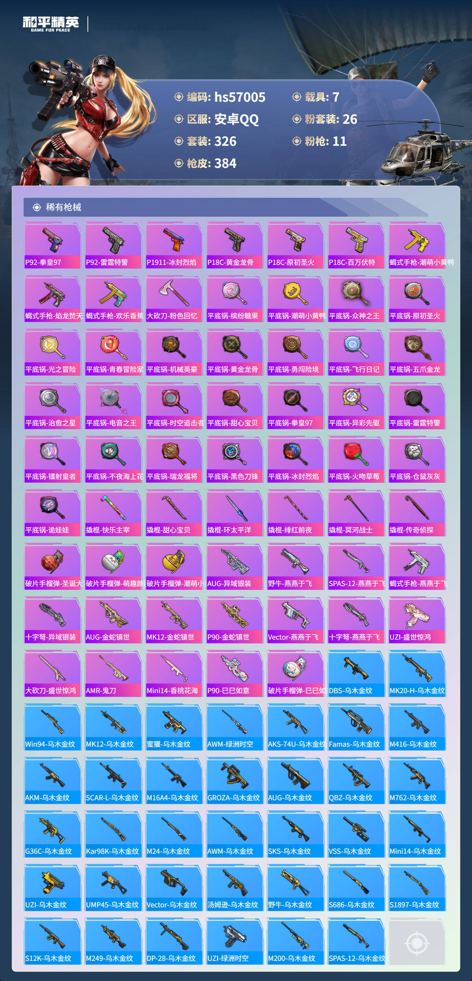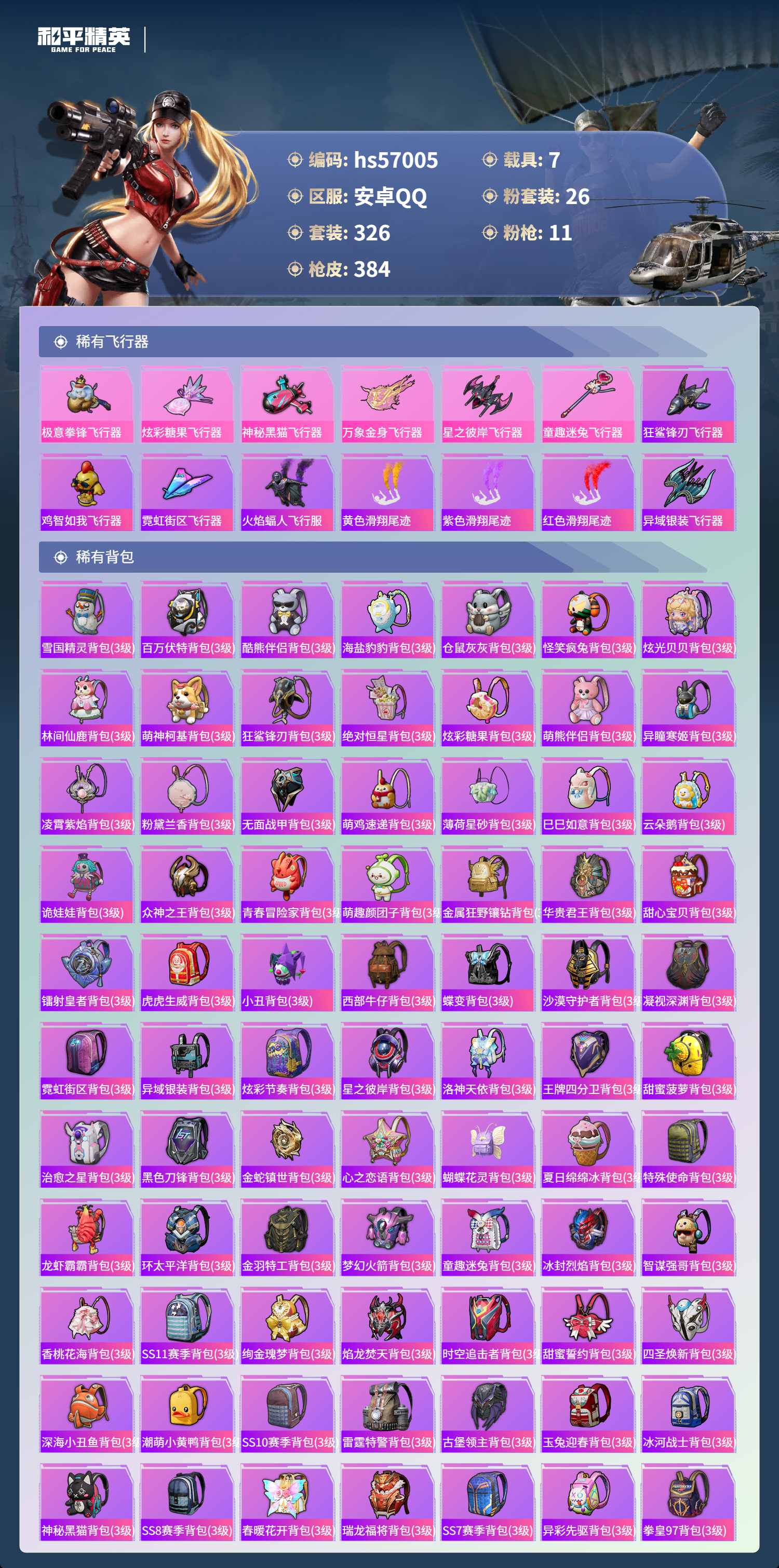 hs57005 安卓手q-27王牌印记-有战神框-1红装-26粉装-11特效呛-7载具-热力值-326套装-384呛皮【1红装】金蛇镇世-烛九/1级【26粉装】套装-怪诞乔克套装-冰霜白皇套装-极致幻想套装-骨龙祭渊套装-馨动时刻套装-数码大师套装-粉色回忆角色-复仇流浪者套装-彩虹鹿灵套装-深海曼妙套装-深渊皇后套装-梦幻火箭套装-甜蜜誓约套装-天使彩虹