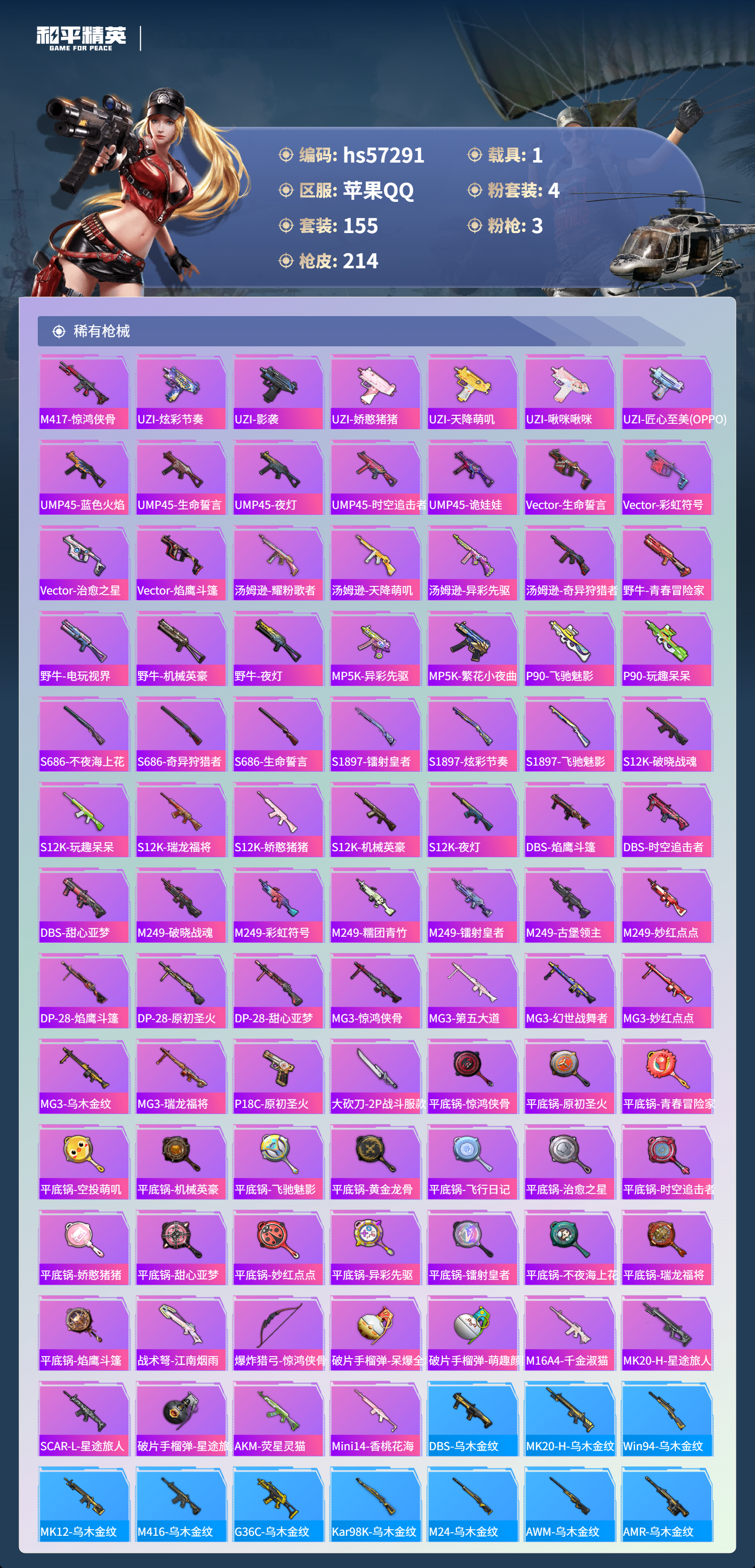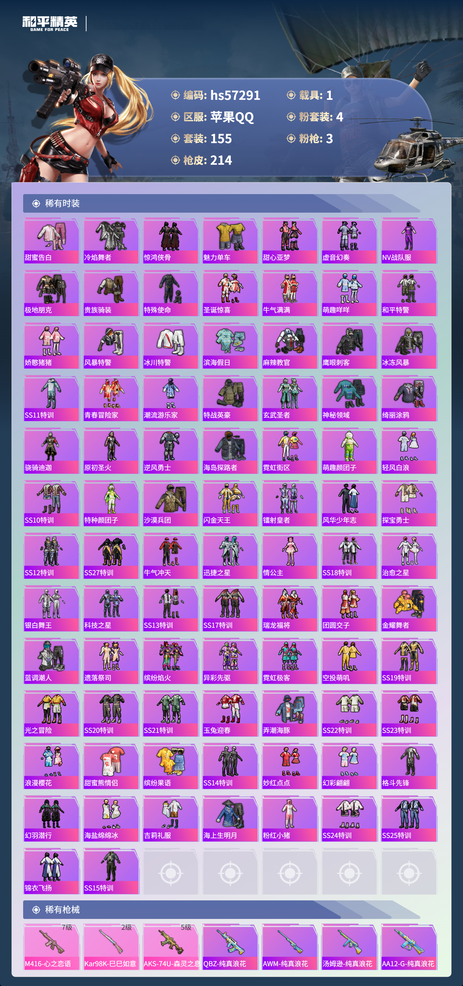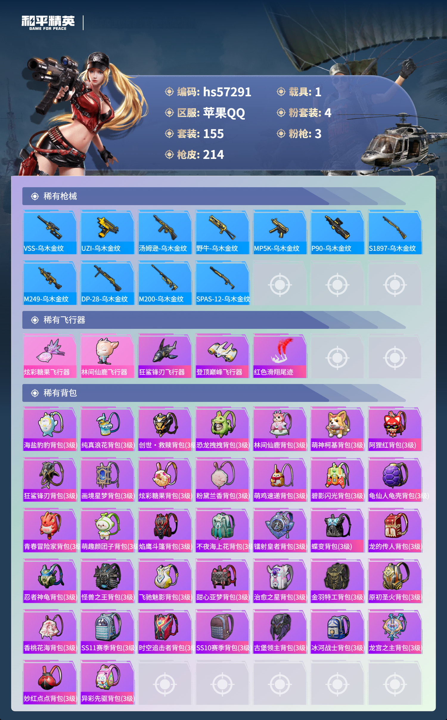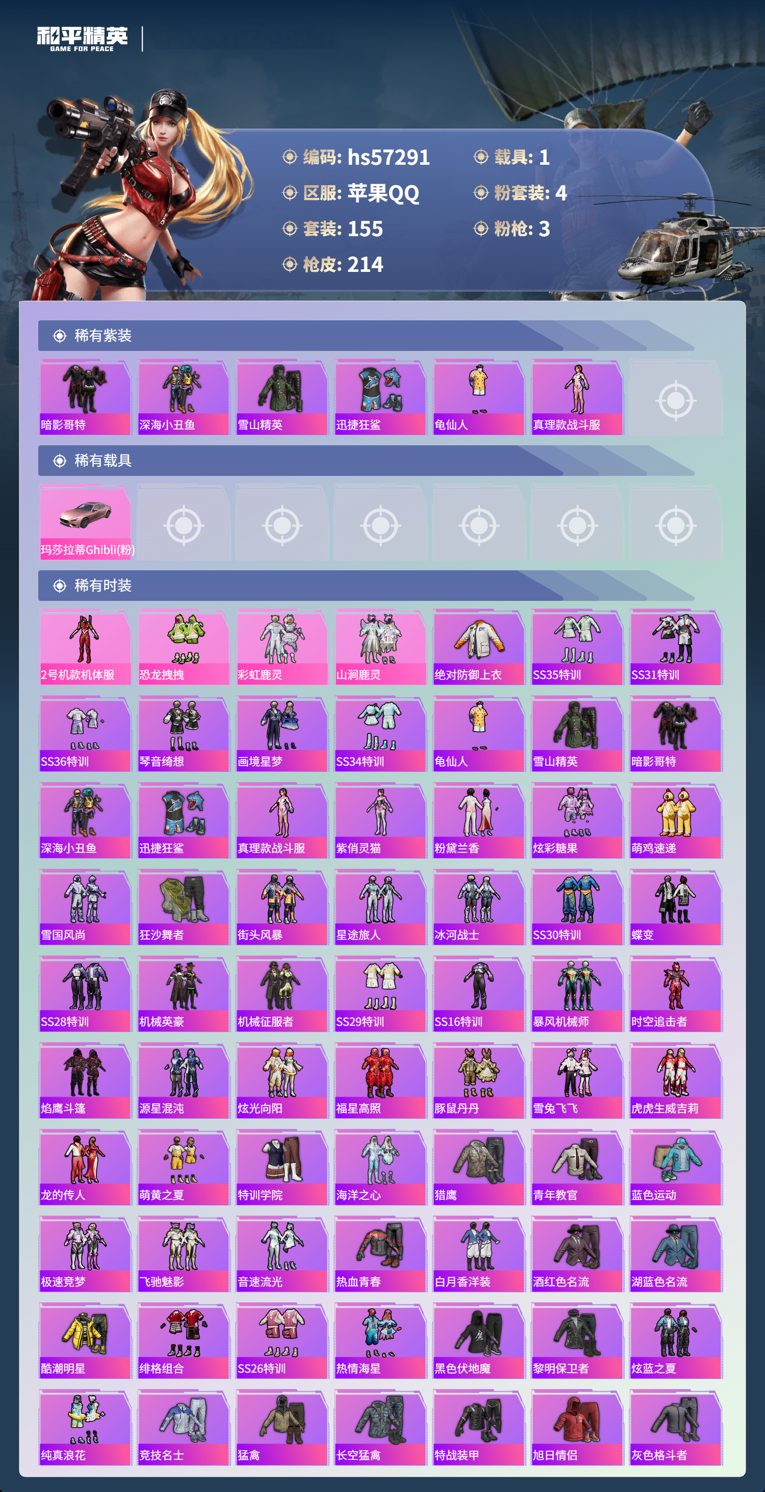 1载具-155套装-214呛皮-hs57291 苹果手q-21王牌印记-有战神框-4粉装-3特效呛-1载具-67717热力值-155套装-214呛皮-4卓越印记-2传奇印记【4粉装】套装-彩虹鹿灵角色-2号机款机体服套装-山涧鹿灵套装-恐龙拽拽【3特效呛】kar98k-巳巳如意/2级m416-心之恋语/7级aks-74u-森灵之息/5级【7稀有紫装】巡查衣暗影哥特深海小丑鱼雪山精英迅捷狂鲨龟仙人真理款
