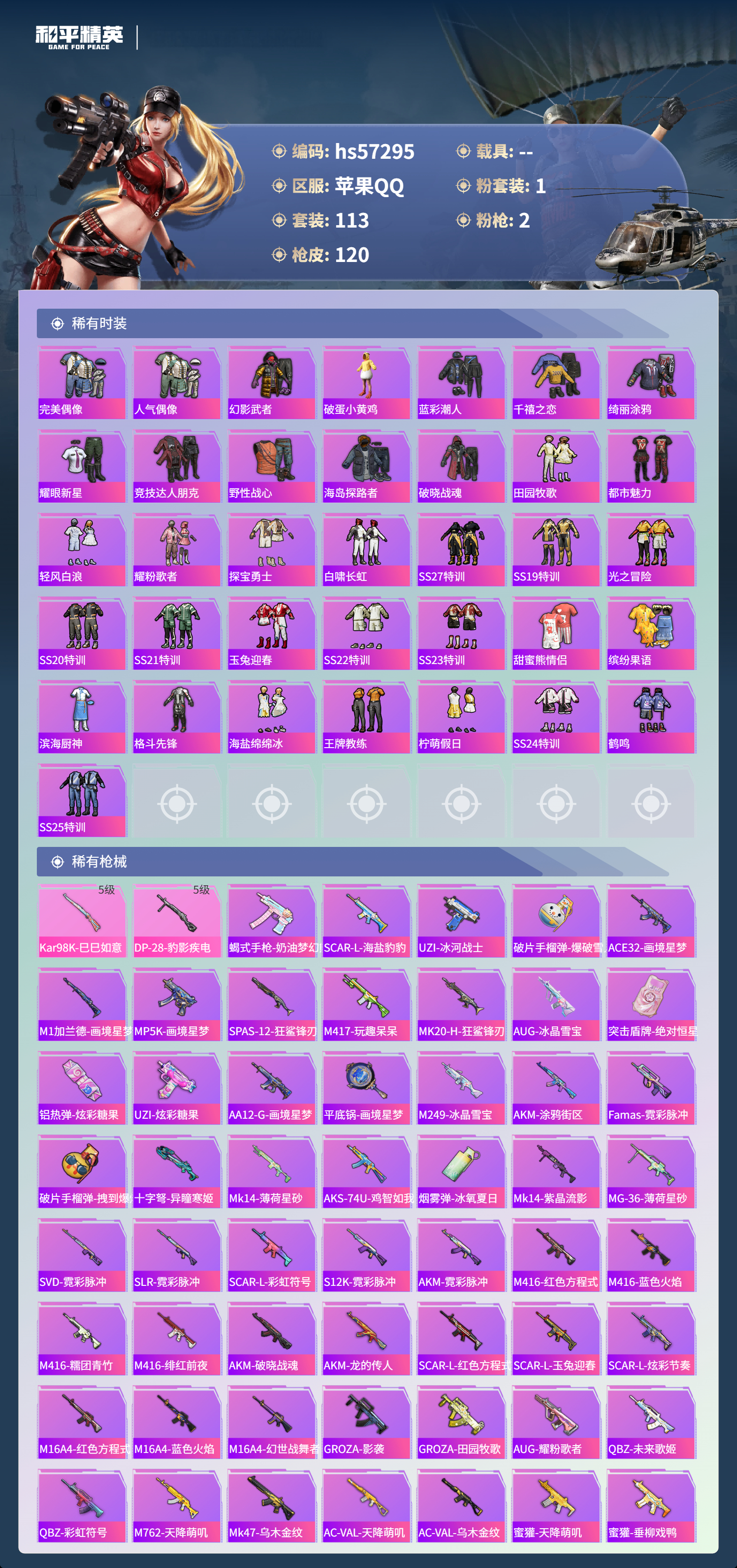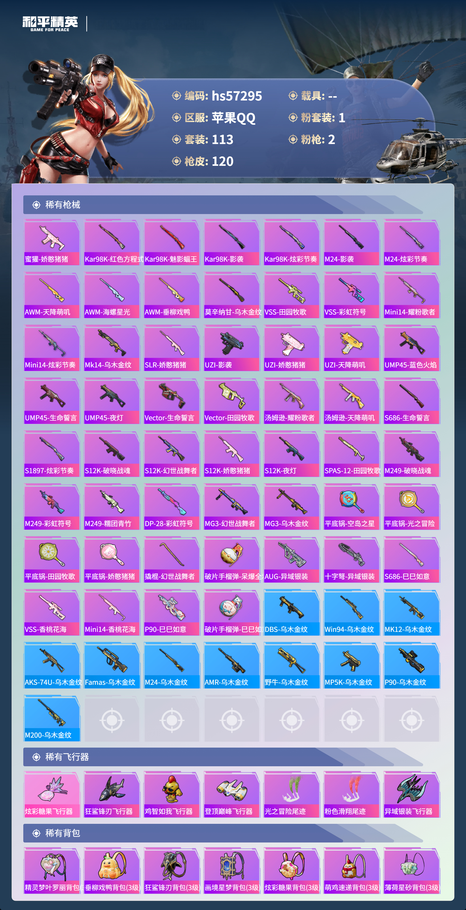 0载具-113套装-120呛皮-hs57295 苹果手q-5王牌印记-1粉装-2特效呛-34779热力值-113套装-120呛皮【1粉装】角色-异瞳寒姬【2特效呛】dp-28-豹影疾电/5级kar98k-巳巳如意/5级【2稀有紫装】暗影哥特龟仙人【113稀有时装】异瞳寒姬ss35特训ss31特训ss33特训ss36特训琴音绮想画境星梦ss34特训狂鲨锋刃龟仙人暗影哥特美羊羊炫彩糖果绯色魅影