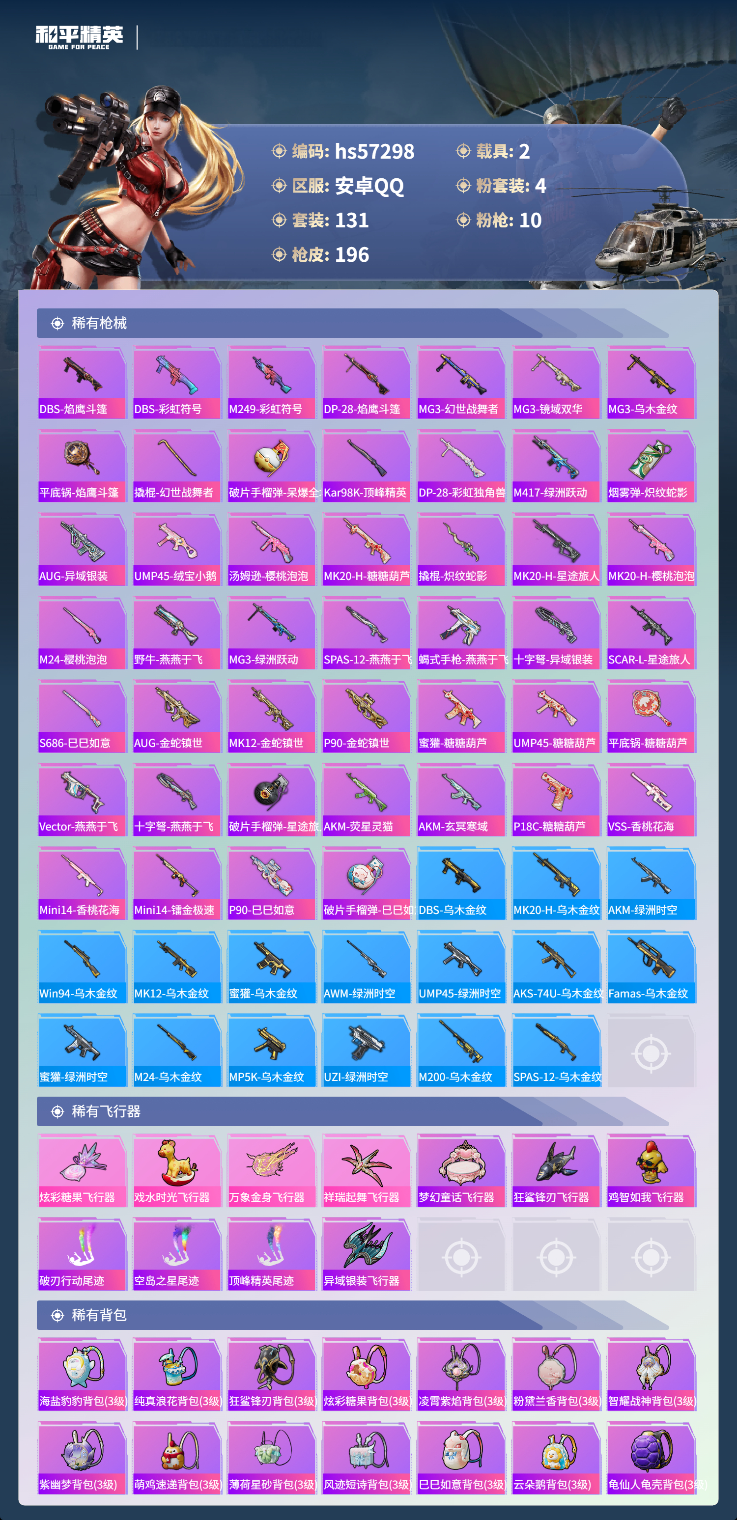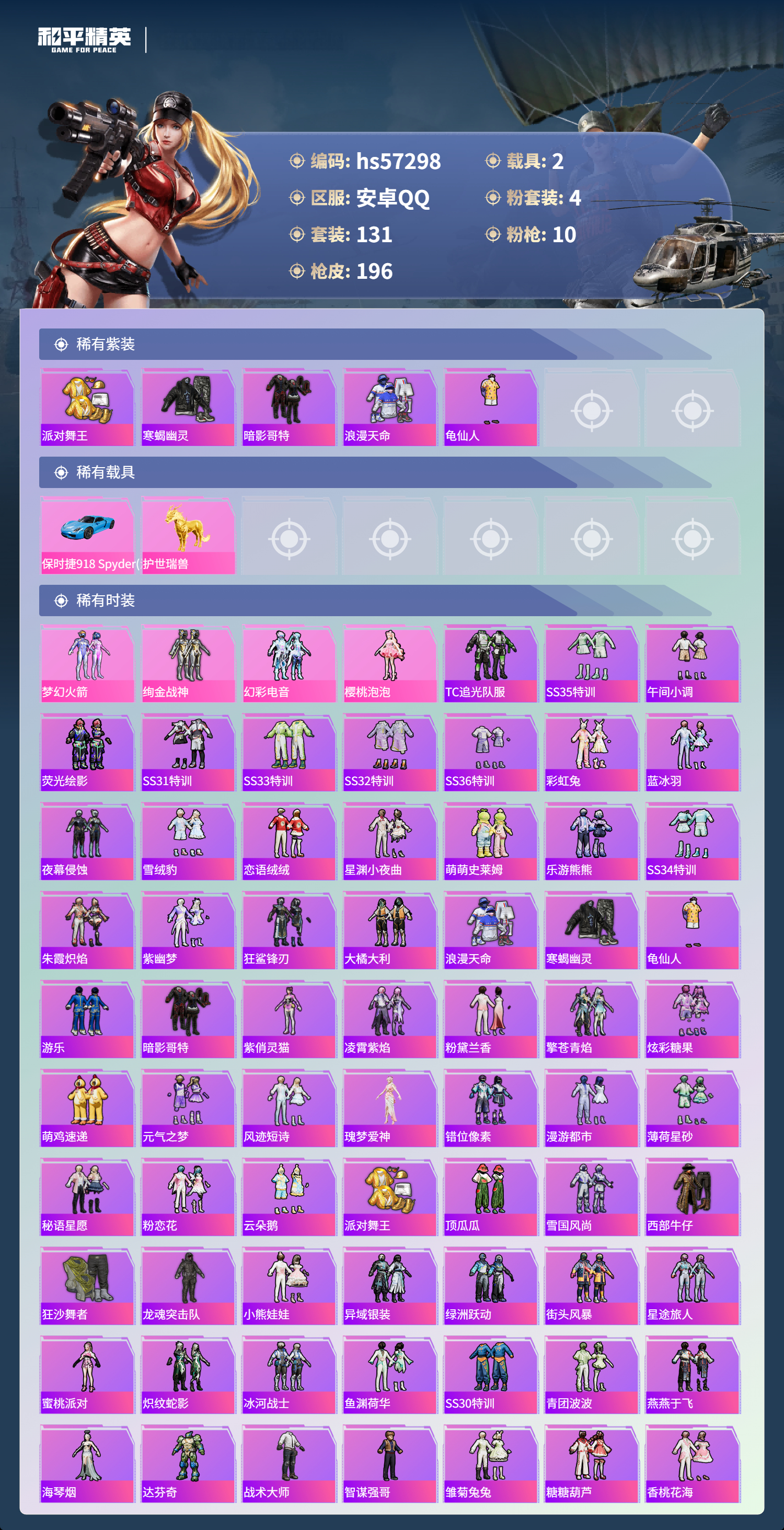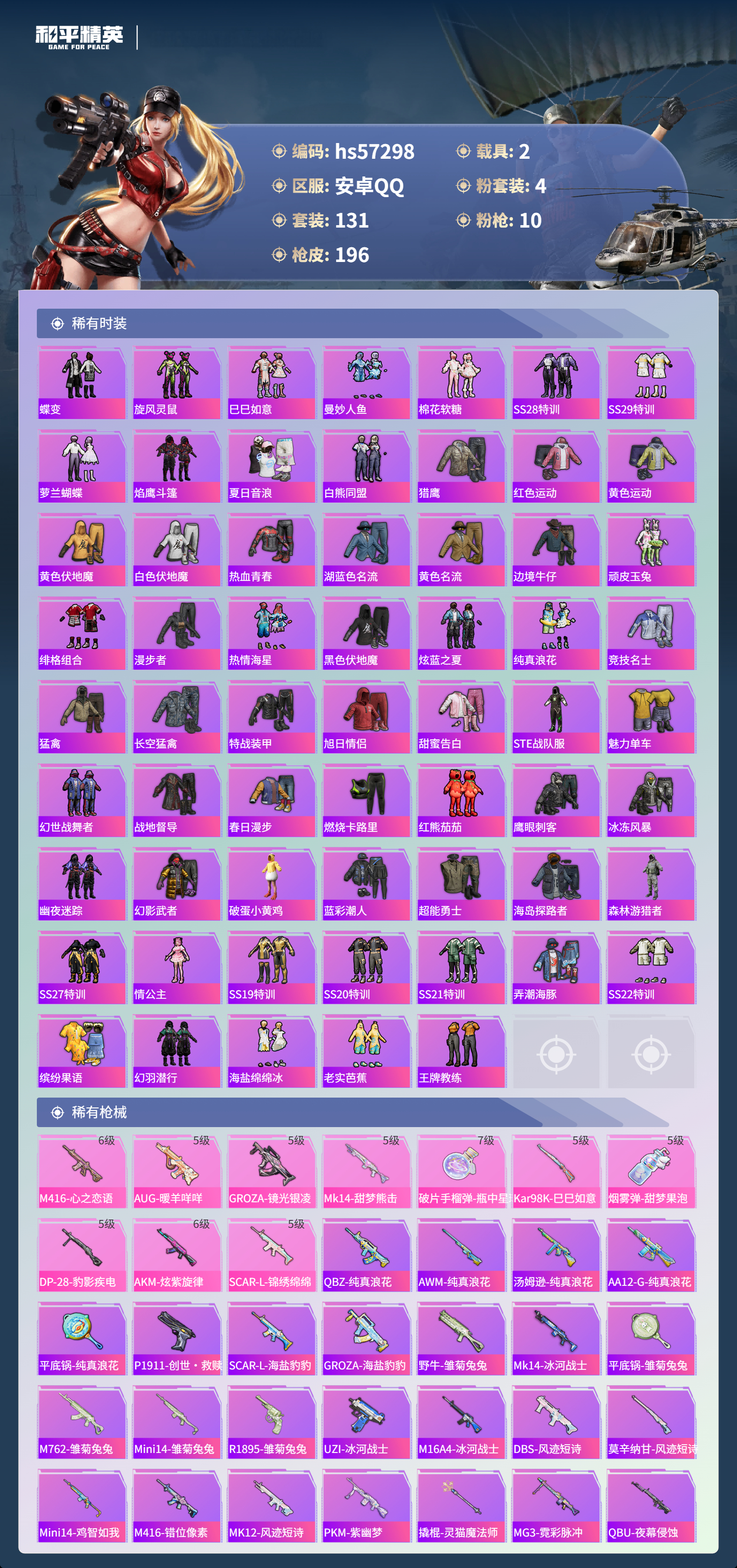 2载具-131套装-196呛皮-hs57298 安卓手q-10王牌印记-有战神框-4粉装-10特效呛-2载具-64151热力值-131套装-196呛皮-3卓越印记-3传奇印记【4粉装】角色-樱桃泡泡套装-梦幻火箭套装-绚金战神套装-幻彩电音【10特效呛】aug-暖羊咩咩/5级groza-镜光银凌/5级m416-心之恋语/6级dp-28-豹影疾电/5级akm-炫紫旋律/6级盐雾蛋-甜梦果泡/5级mk14-甜梦