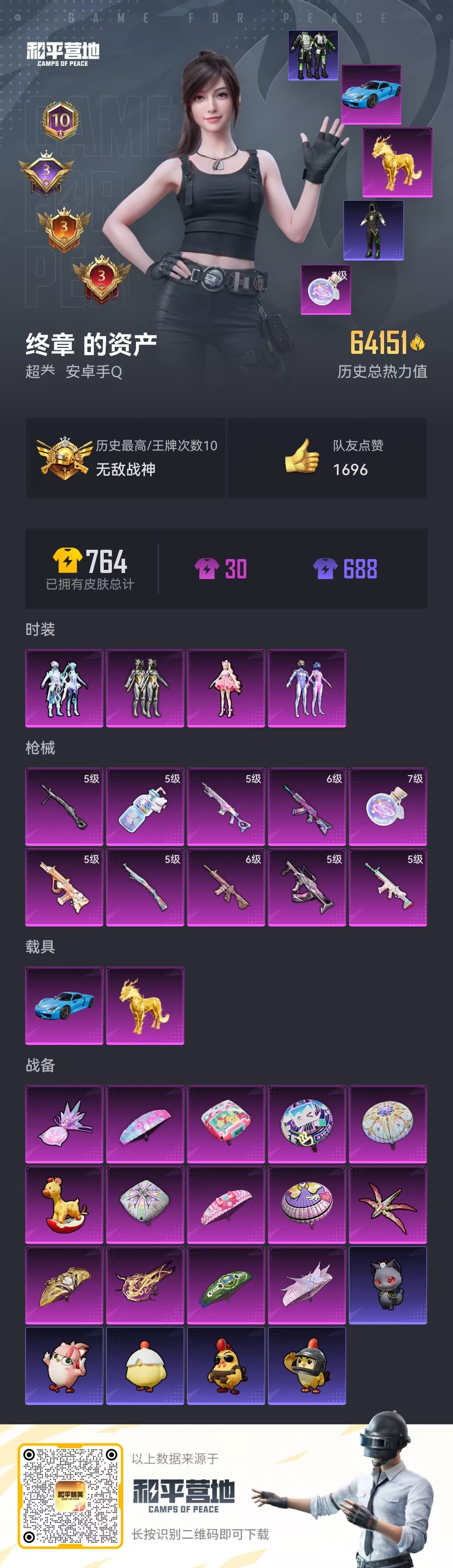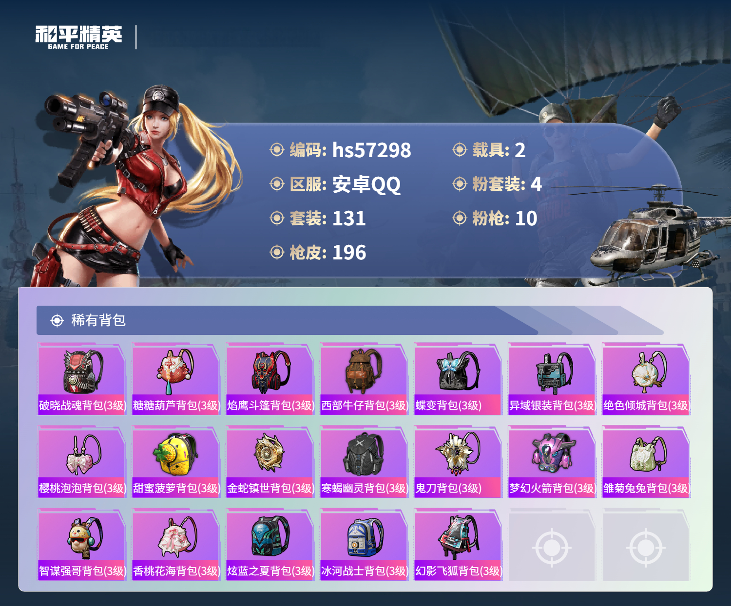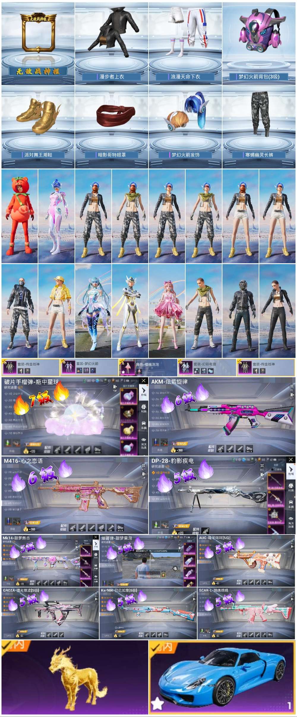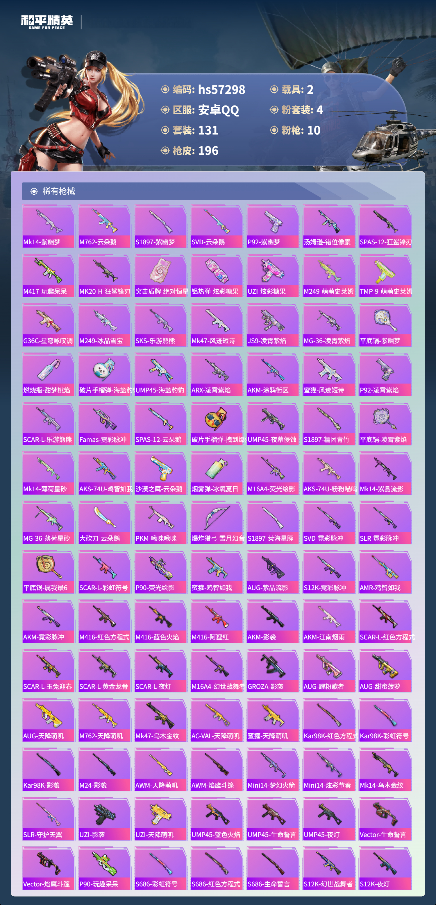 2载具-131套装-196呛皮-hs57298 安卓手q-10王牌印记-有战神框-4粉装-10特效呛-2载具-64151热力值-131套装-196呛皮-3卓越印记-3传奇印记【4粉装】角色-樱桃泡泡套装-梦幻火箭套装-绚金战神套装-幻彩电音【10特效呛】aug-暖羊咩咩/5级groza-镜光银凌/5级m416-心之恋语/6级dp-28-豹影疾电/5级akm-炫紫旋律/6级盐雾蛋-甜梦果泡/5级mk14-甜梦