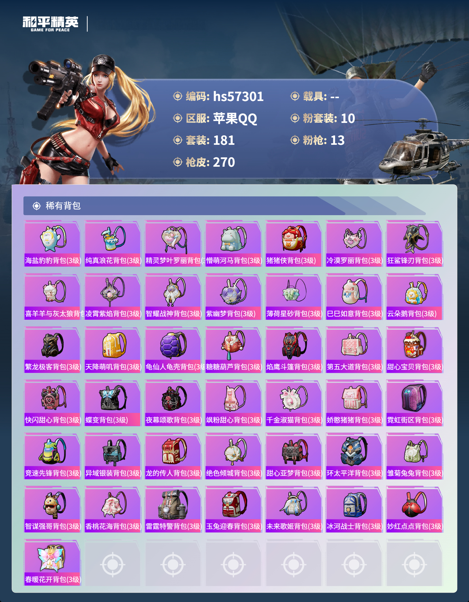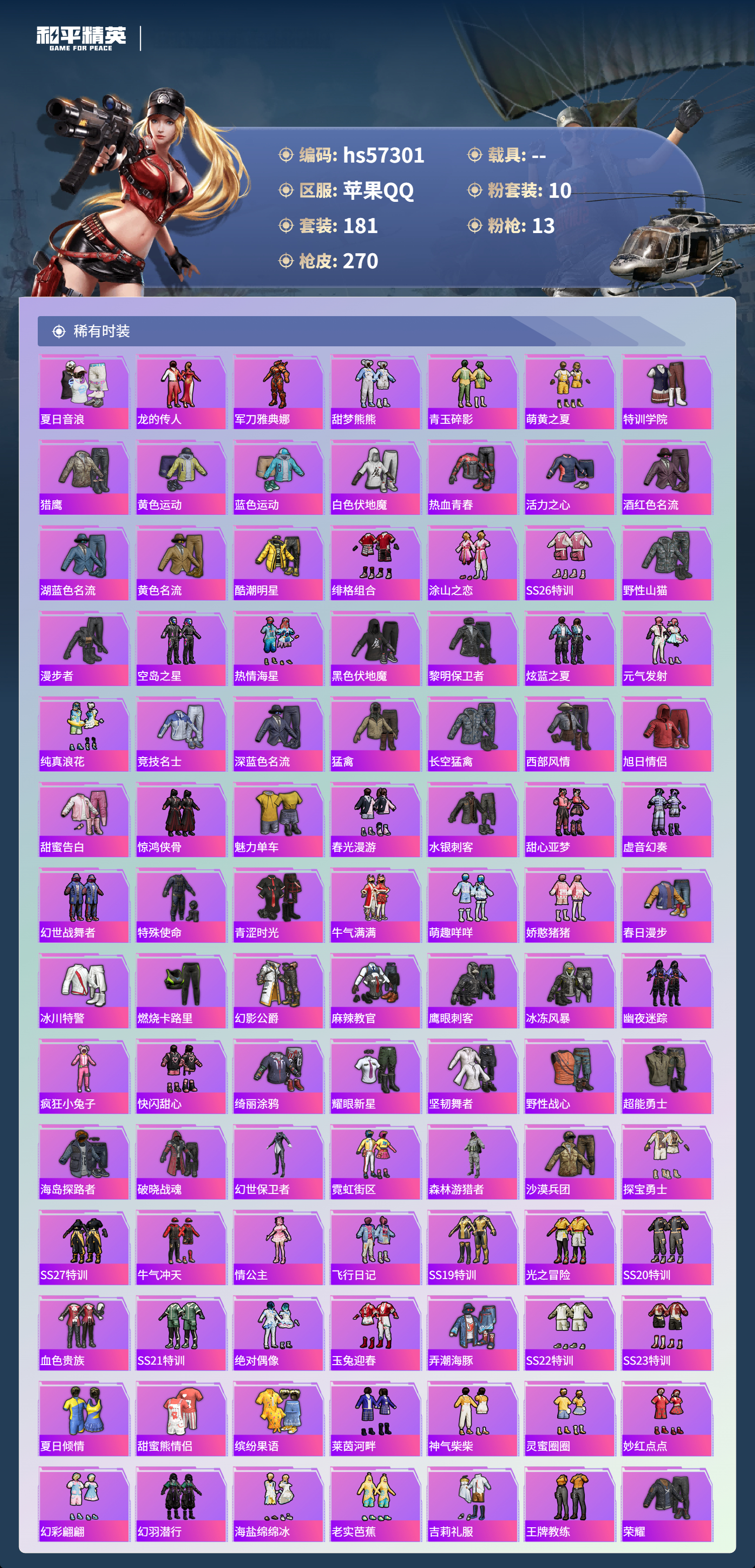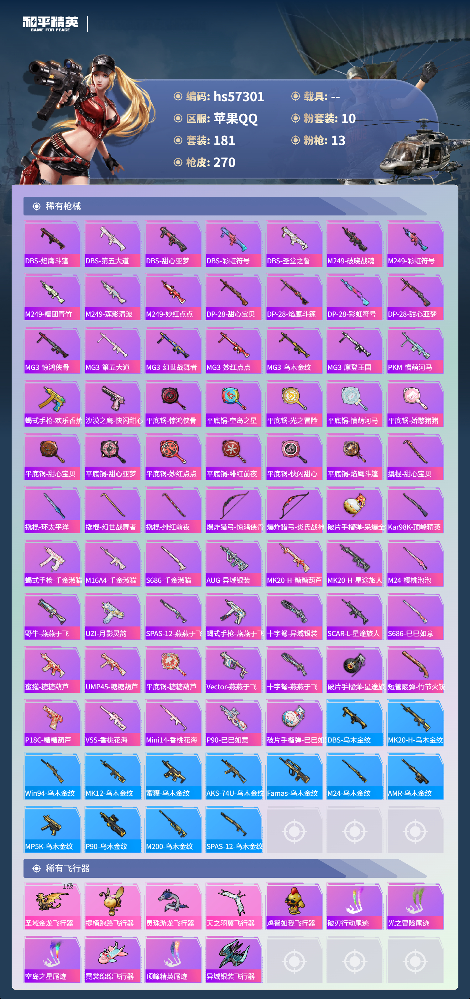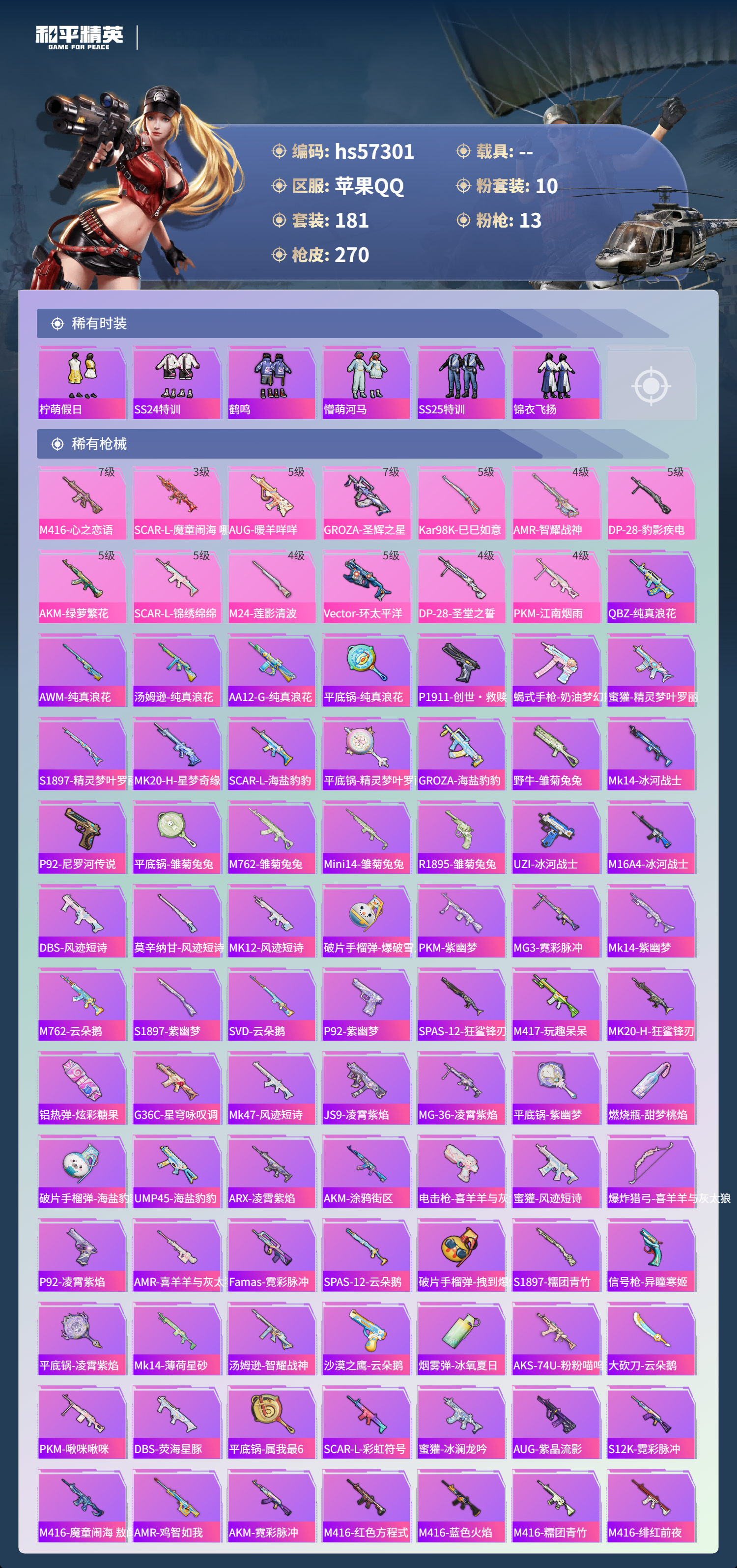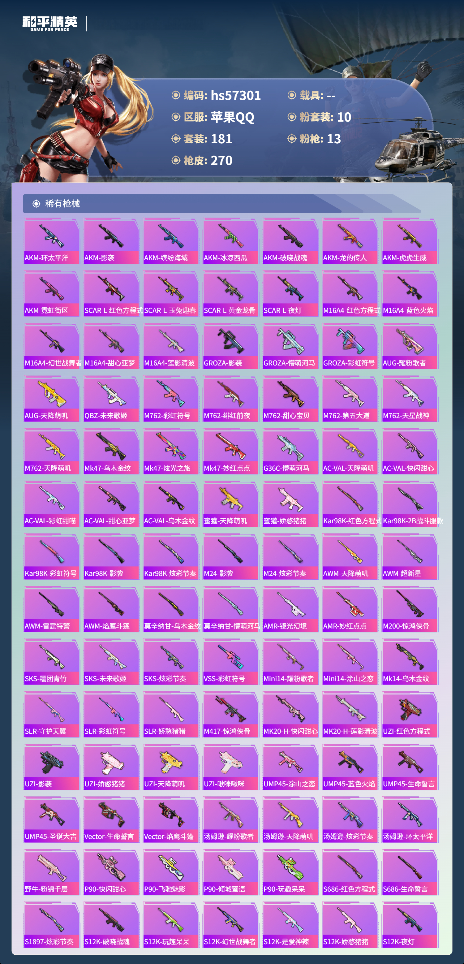 0载具-181套装-270呛皮-hs57301 苹果手q-15王牌印记-有战神框-10粉装-13特效呛-83818热力值-181套装-270呛皮-8卓越印记-8传奇印记【10粉装】套装-幻影战神套装-天使彩虹糖套装-甜心巧克力套装-宝贝奶油派角色-绯穹魔姬套装-放客神游角色-千金淑猫套装-炫光之旅角色-羊梦糖心角色-圣堂之誓【13特效呛】akm-绿萝繁花/5级m24-莲影清波/4级kar98k-巳巳如意