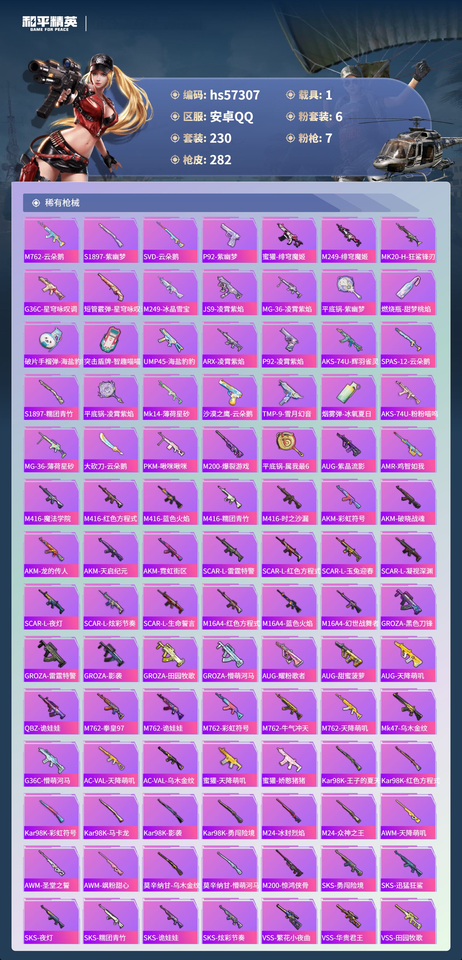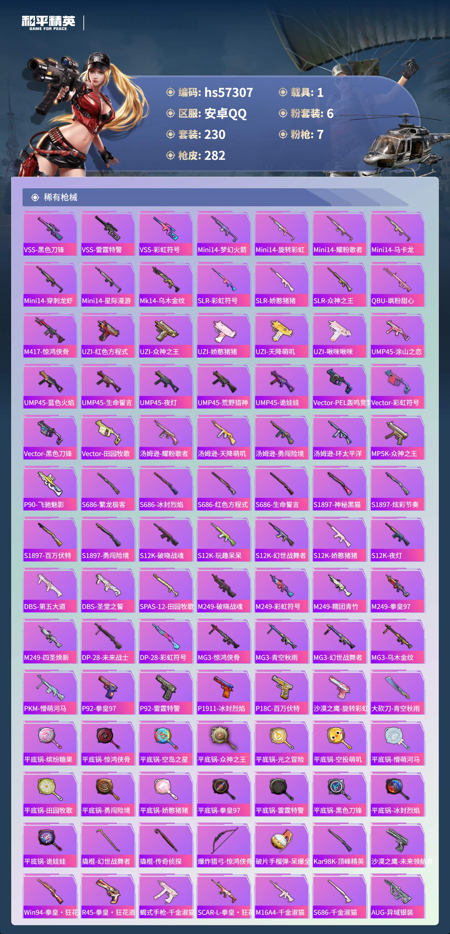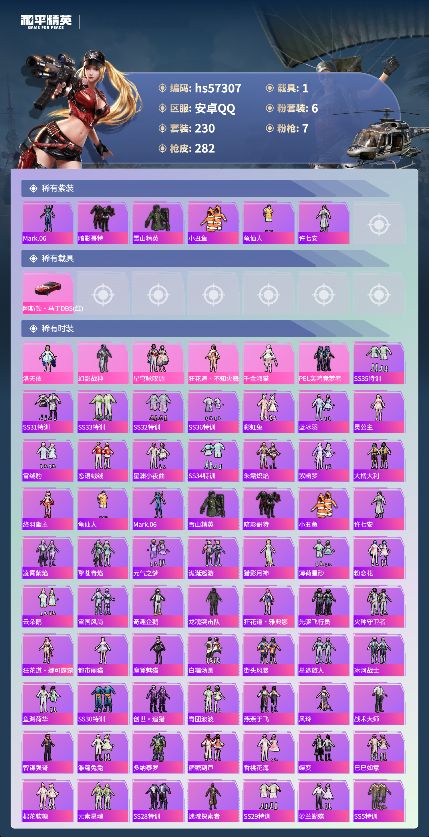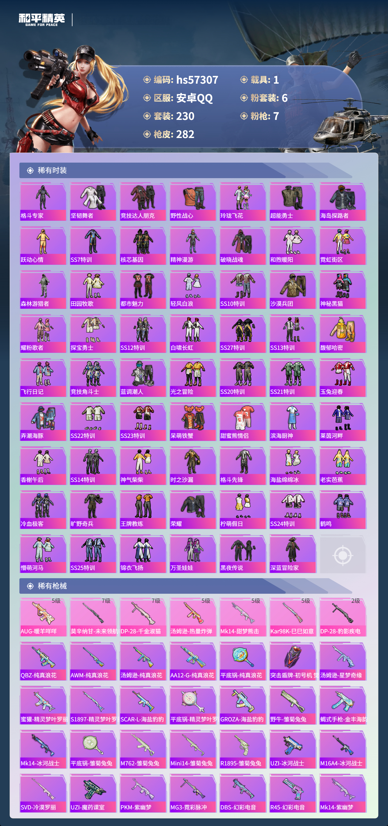 1载具-230套装-282呛皮-安卓手q-14王牌印记-有战神框-6粉装-7特效呛-1载具-86718热力值-230套装-282呛皮-2卓越印记【6粉装】套装-pel轰鸣竞梦者套装-星穹咏叹调角色-洛天依角色-千金淑猫角色-狂花道·不知火舞套装-幻影战神【7特效呛】dp-28-千金淑猫/7级dp-28-豹影疾电/2级mk14-甜梦熊击/5级kar98k-巳巳如意/5级莫辛纳甘-未来领航者/7级aug-暖羊咩咩