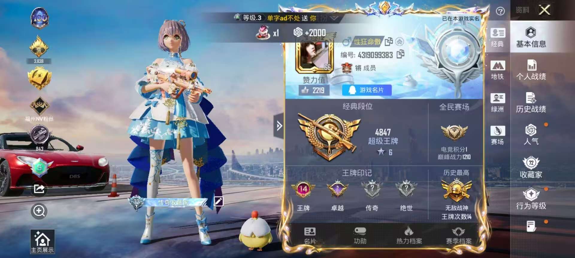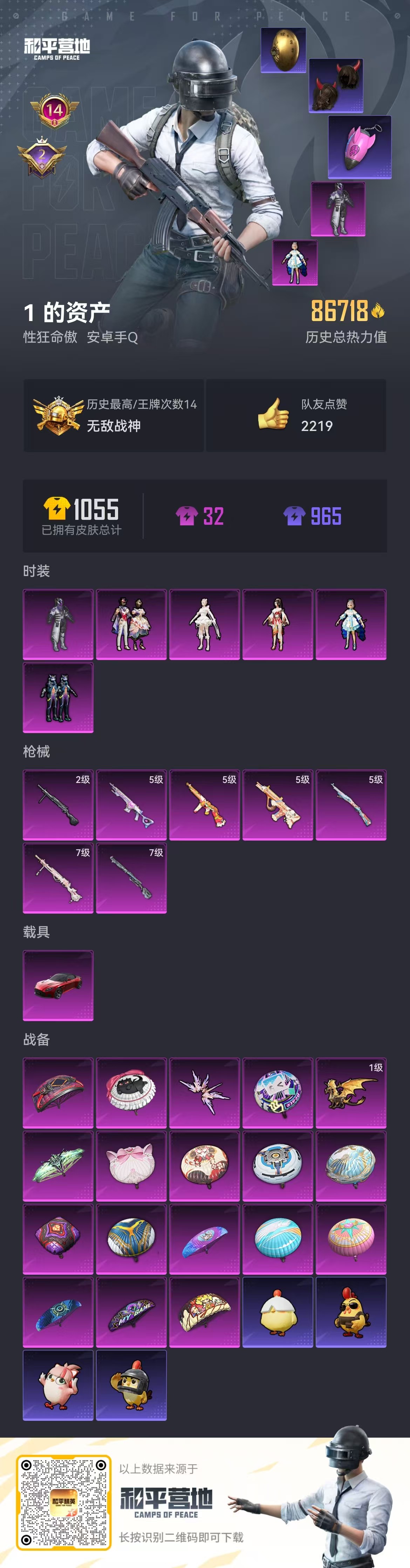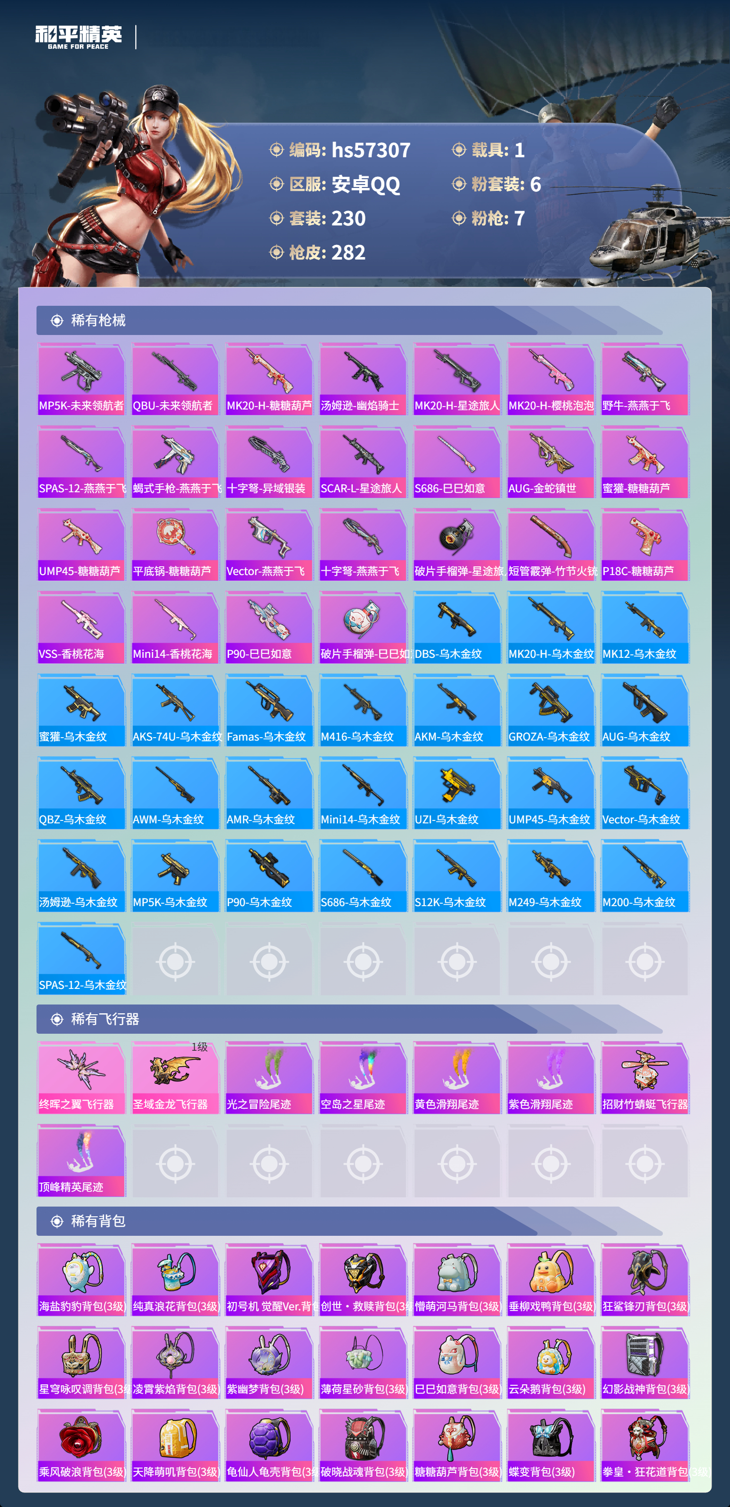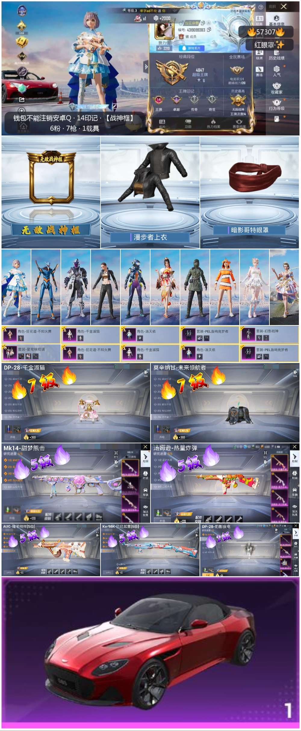 1载具-230套装-282呛皮-安卓手q-14王牌印记-有战神框-6粉装-7特效呛-1载具-86718热力值-230套装-282呛皮-2卓越印记【6粉装】套装-pel轰鸣竞梦者套装-星穹咏叹调角色-洛天依角色-千金淑猫角色-狂花道·不知火舞套装-幻影战神【7特效呛】dp-28-千金淑猫/7级dp-28-豹影疾电/2级mk14-甜梦熊击/5级kar98k-巳巳如意/5级莫辛纳甘-未来领航者/7级aug-暖羊咩咩