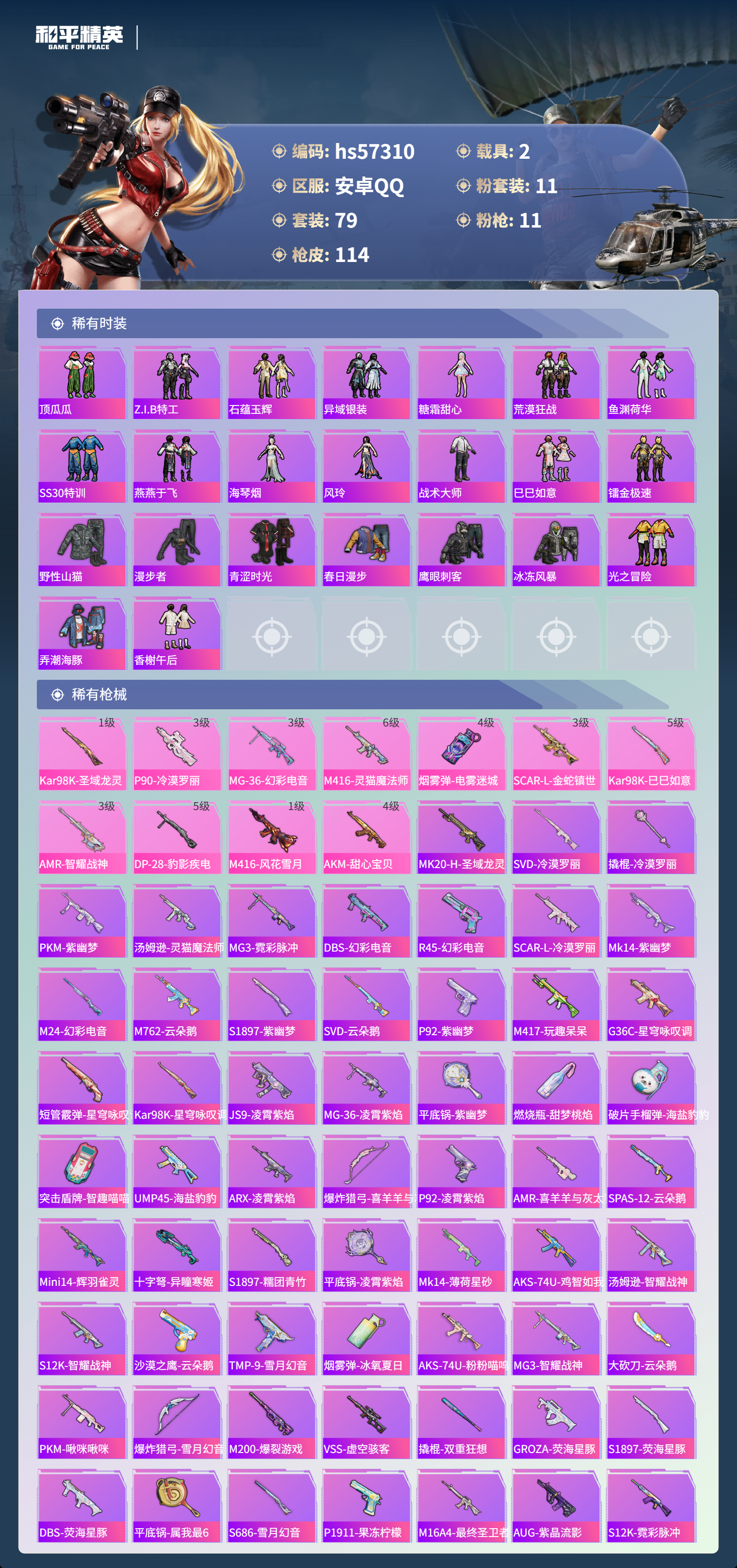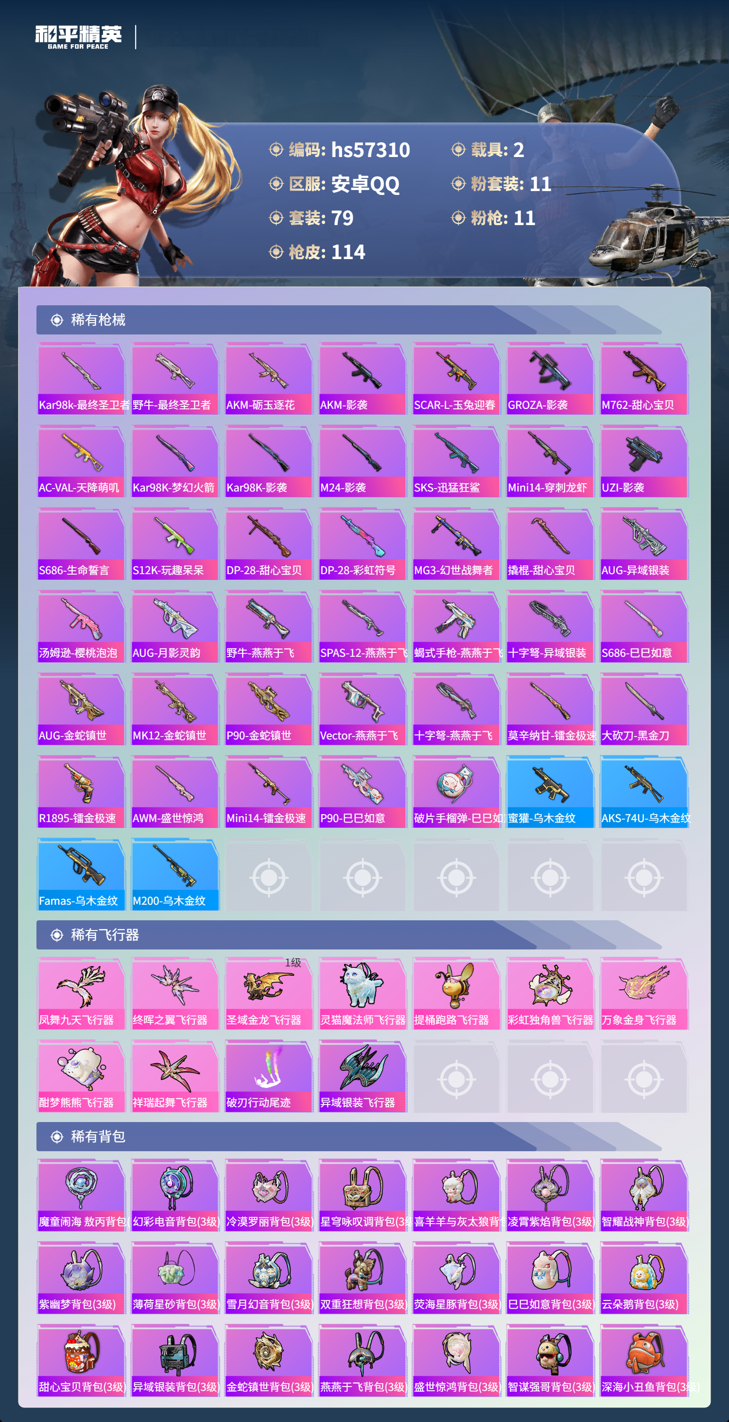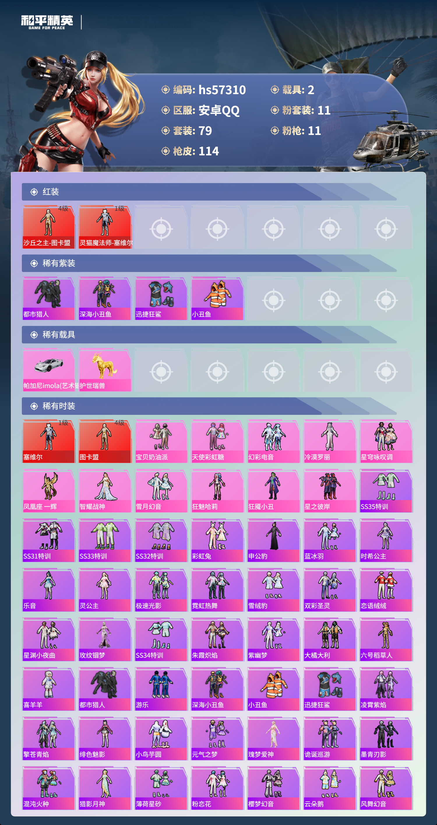 2载具-79套装-114呛皮-hs57310 安卓手q-3王牌印记-2红装-11粉装-11特效呛-2载具-49466热力值-79套装-114呛皮【2红装】灵猫魔法师-塞维尔/1级沙丘之主-图卡盟/4级【11粉装】角色-智耀战神套装-星穹咏叹调套装-星之彼岸角色-冷漠罗丽套装-宝贝奶油派套装-雪月幻音角色-狂魅哈莉角色-凤凰座 一辉套装-天使彩虹糖套装-幻彩电音角色-狂魇小丑【11特效呛】akm-甜心