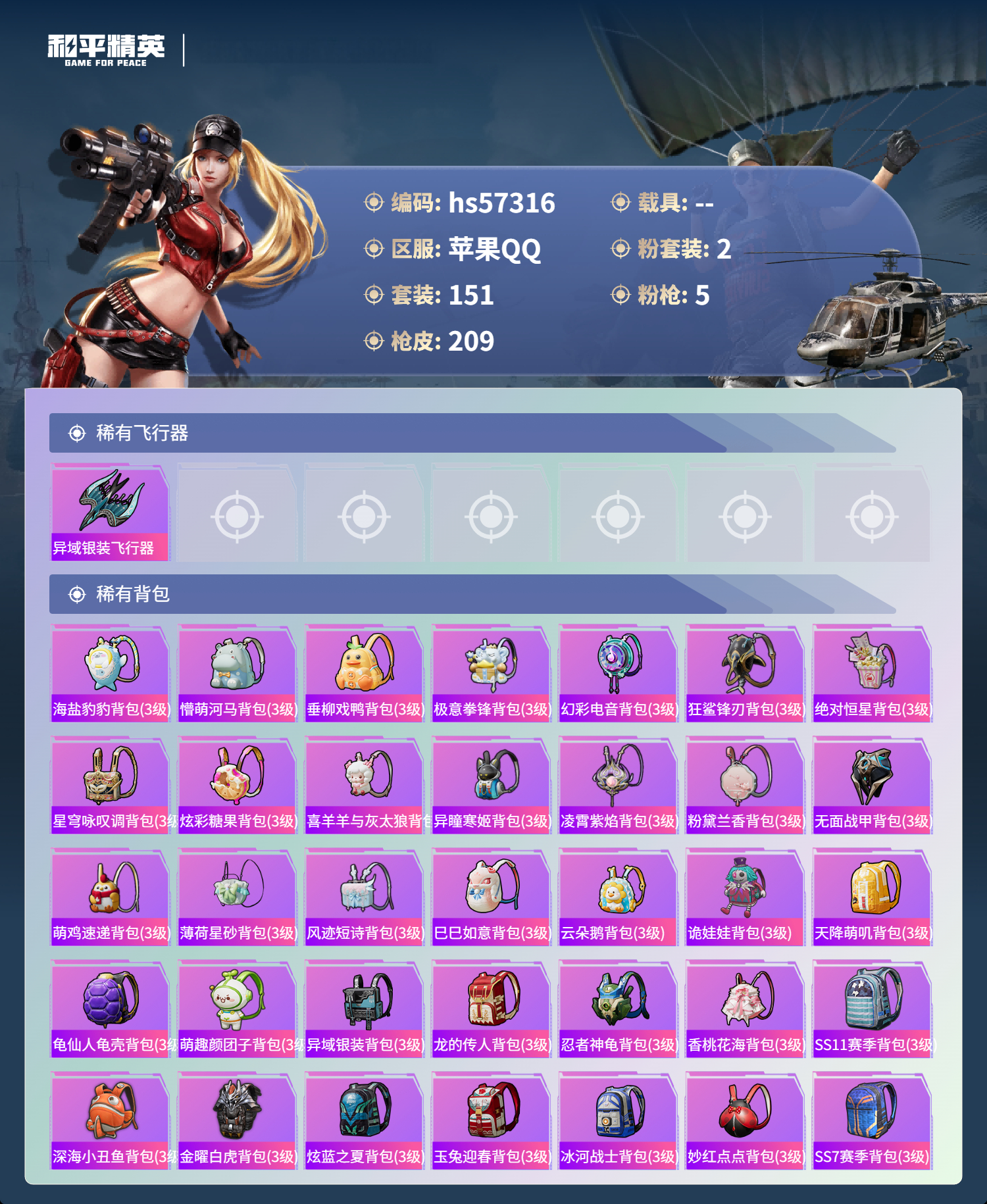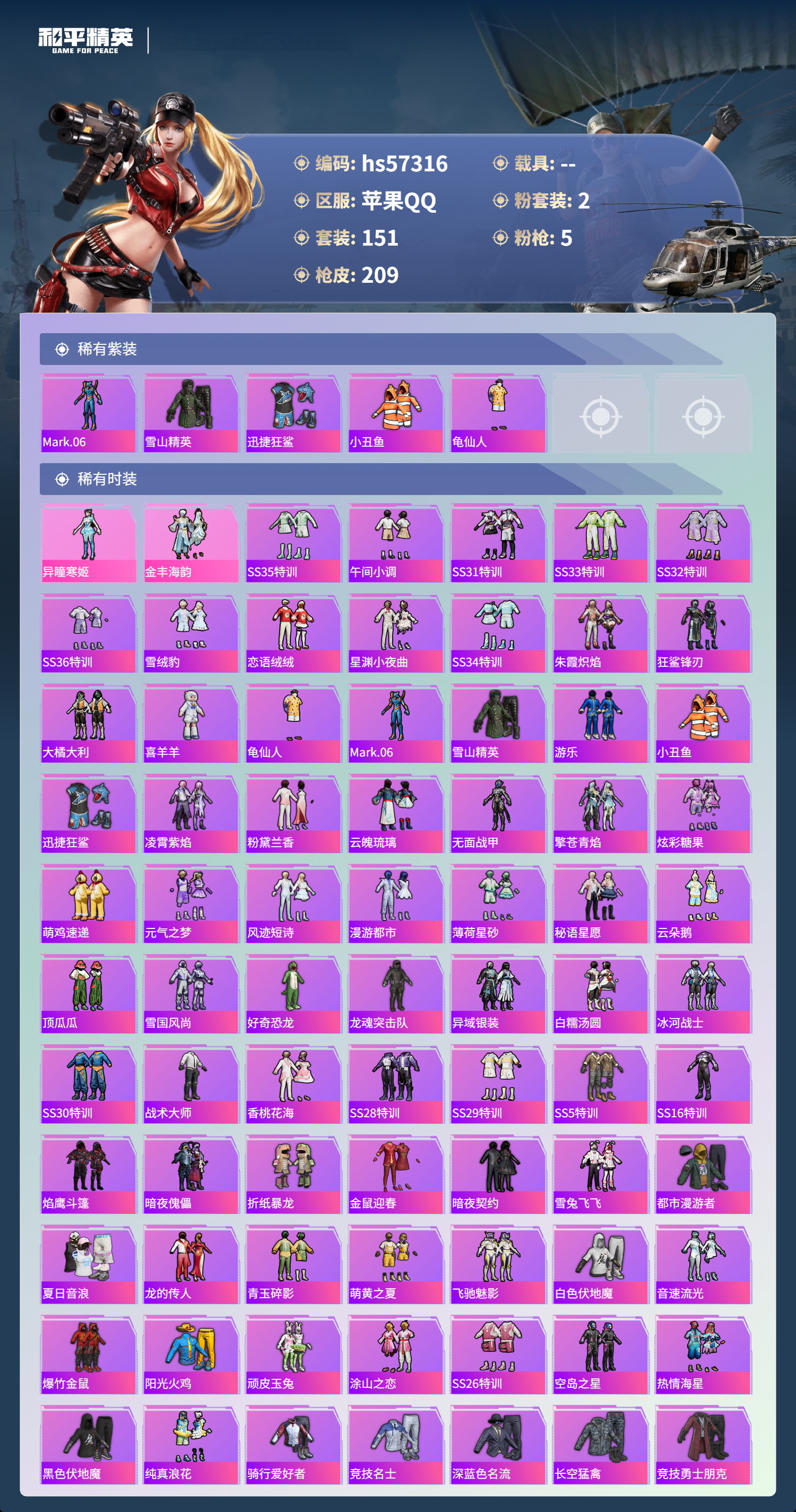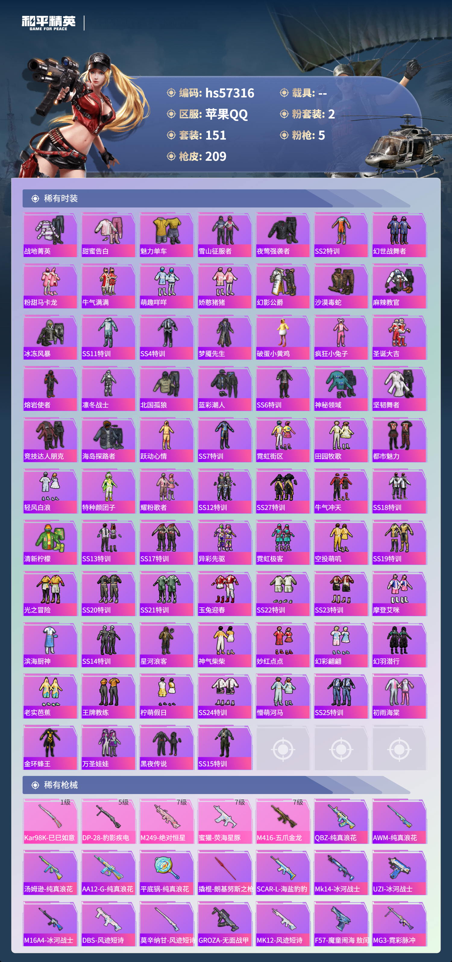 0载具-151套装-209呛皮-hs57316 苹果手q-18王牌印记-2粉装-5特效呛-59681热力值-151套装-209呛皮-2卓越印记-1传奇印记【2粉装】套装-金丰海韵角色-异瞳寒姬【5特效呛】蜜獾-荧海星豚/7级m249-绝对恒星/7级m416-五爪金龙/7级kar98k-巳巳如意/1级dp-28-豹影疾电/5级【5稀有紫装】mark.06雪山精英迅捷狂鲨小丑鱼龟仙人【151稀有时装】异瞳寒