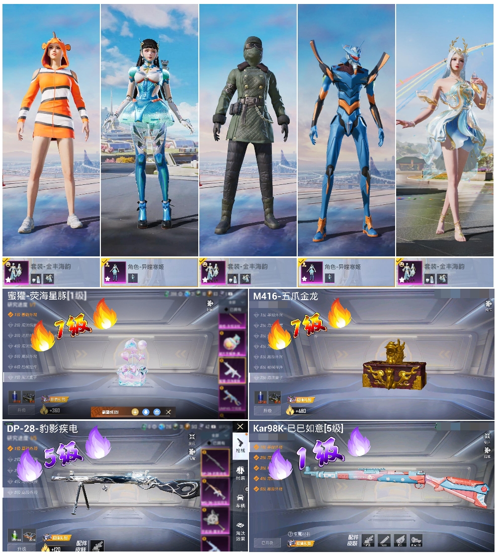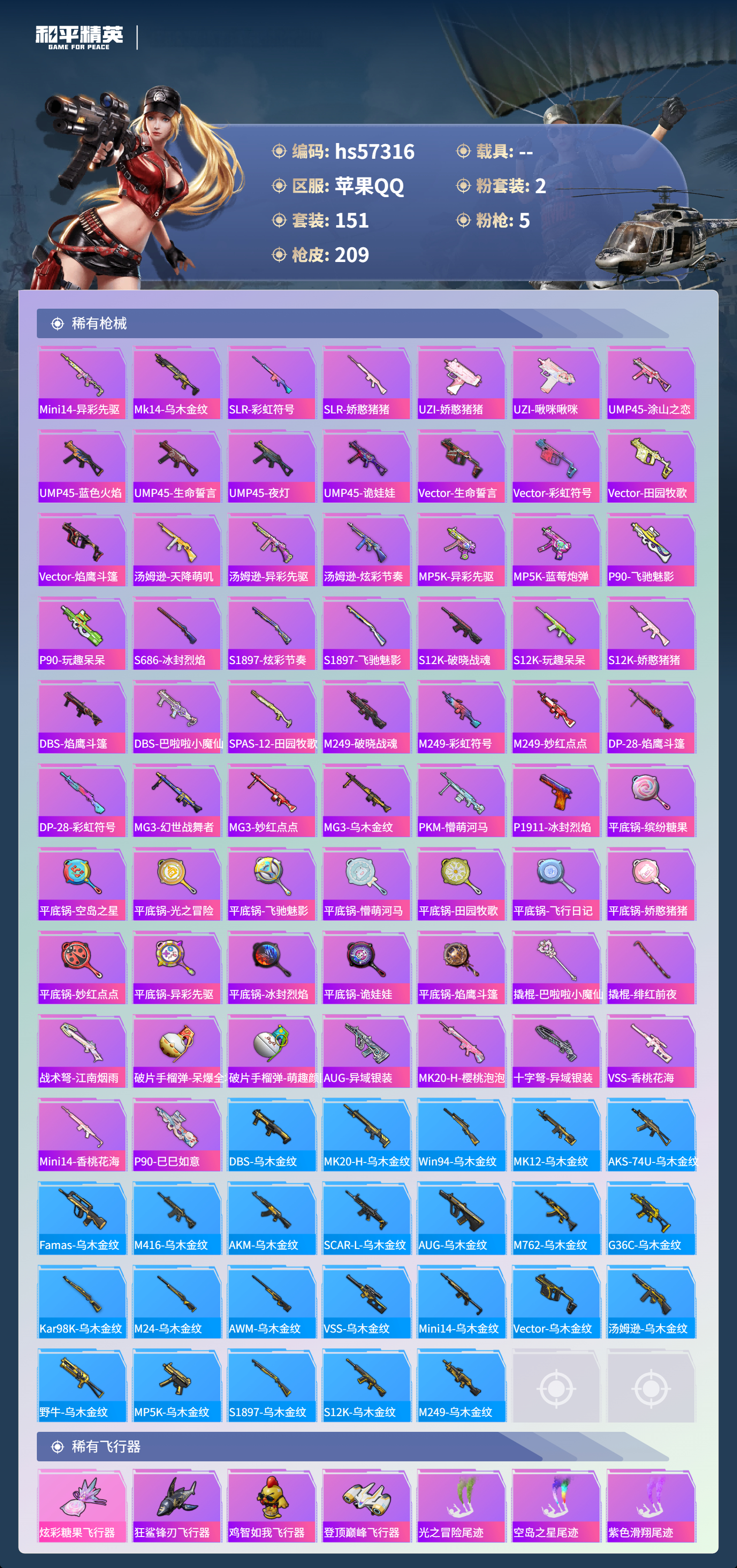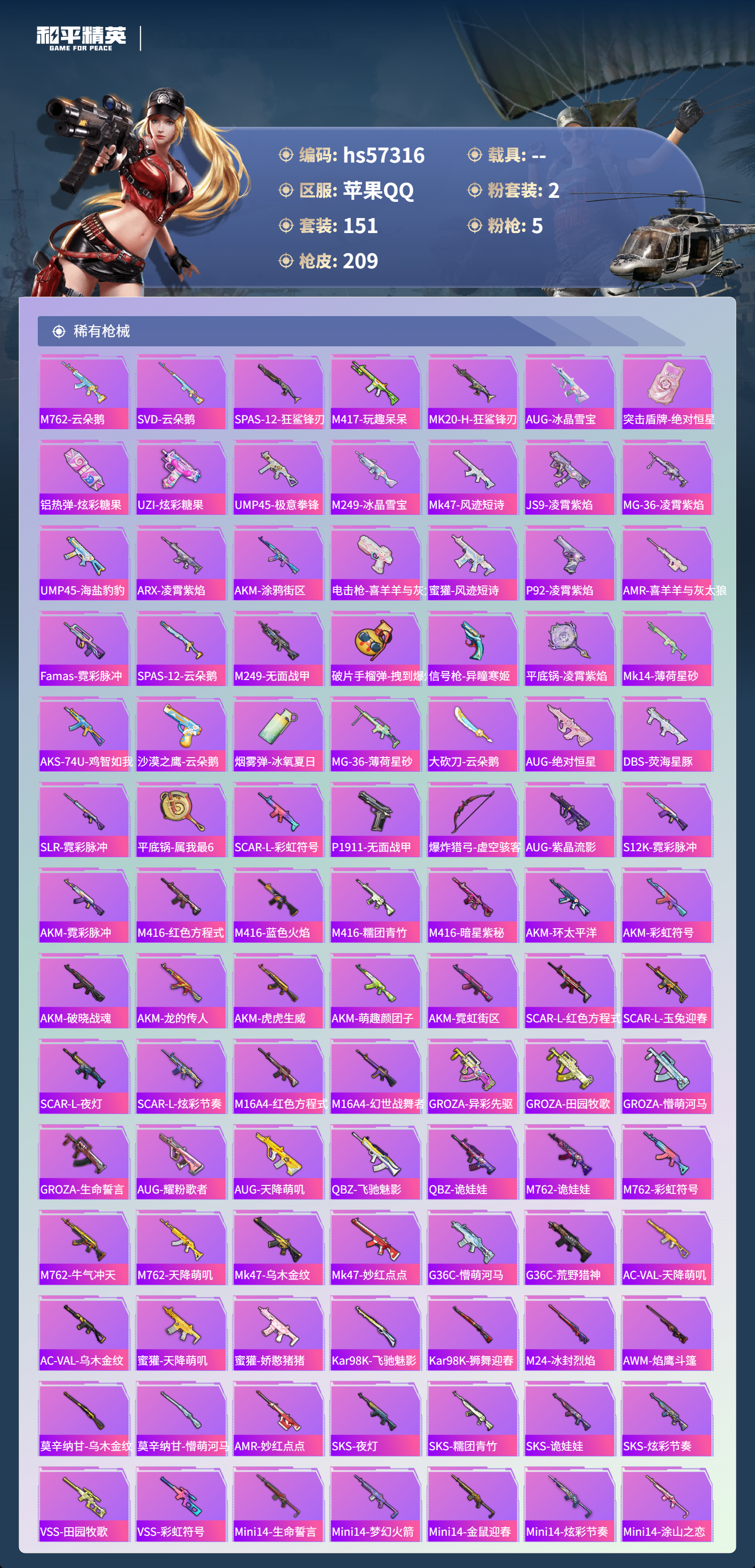 0载具-151套装-209呛皮-hs57316 苹果手q-18王牌印记-2粉装-5特效呛-59681热力值-151套装-209呛皮-2卓越印记-1传奇印记【2粉装】套装-金丰海韵角色-异瞳寒姬【5特效呛】蜜獾-荧海星豚/7级m249-绝对恒星/7级m416-五爪金龙/7级kar98k-巳巳如意/1级dp-28-豹影疾电/5级【5稀有紫装】mark.06雪山精英迅捷狂鲨小丑鱼龟仙人【151稀有时装】异瞳寒