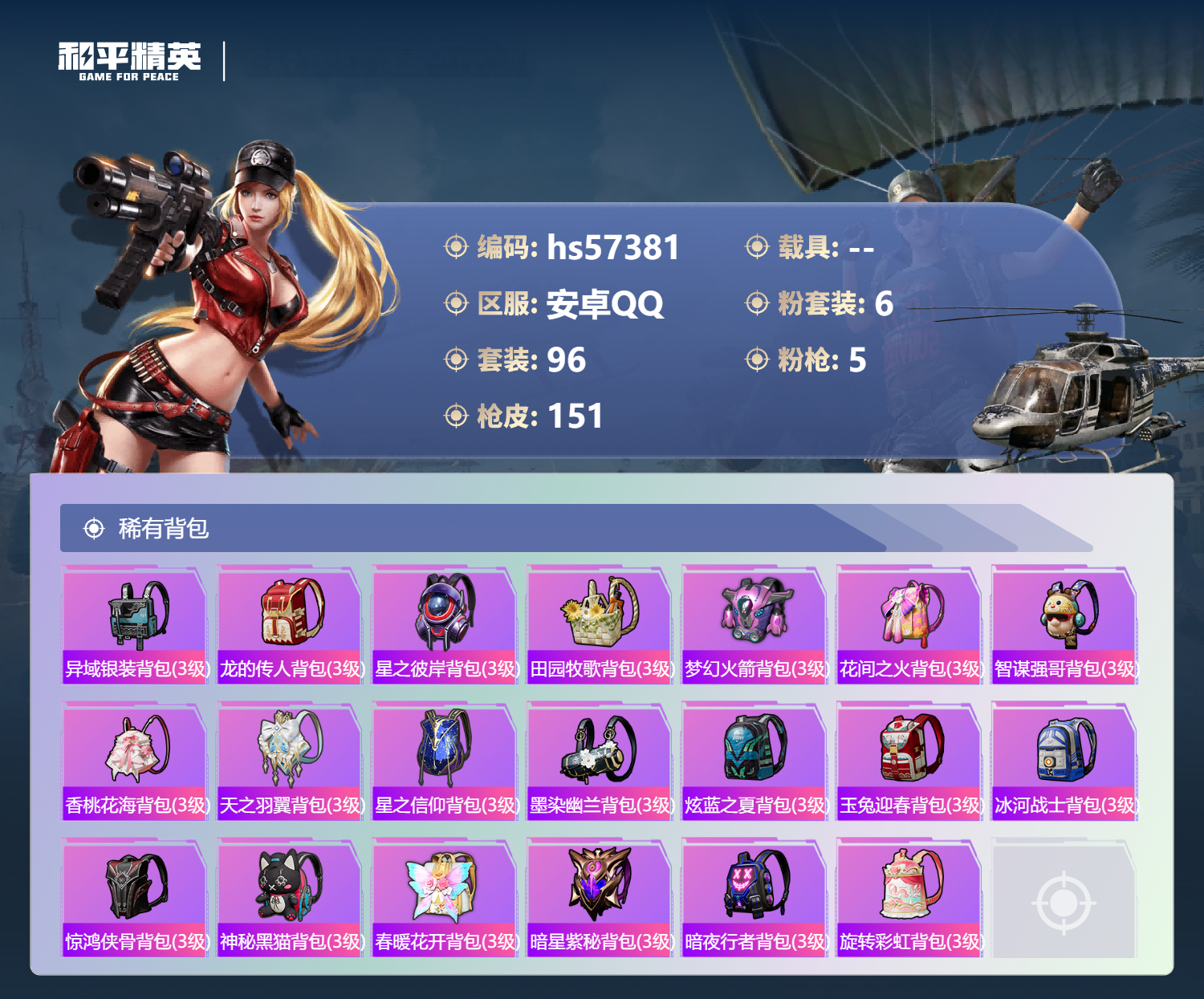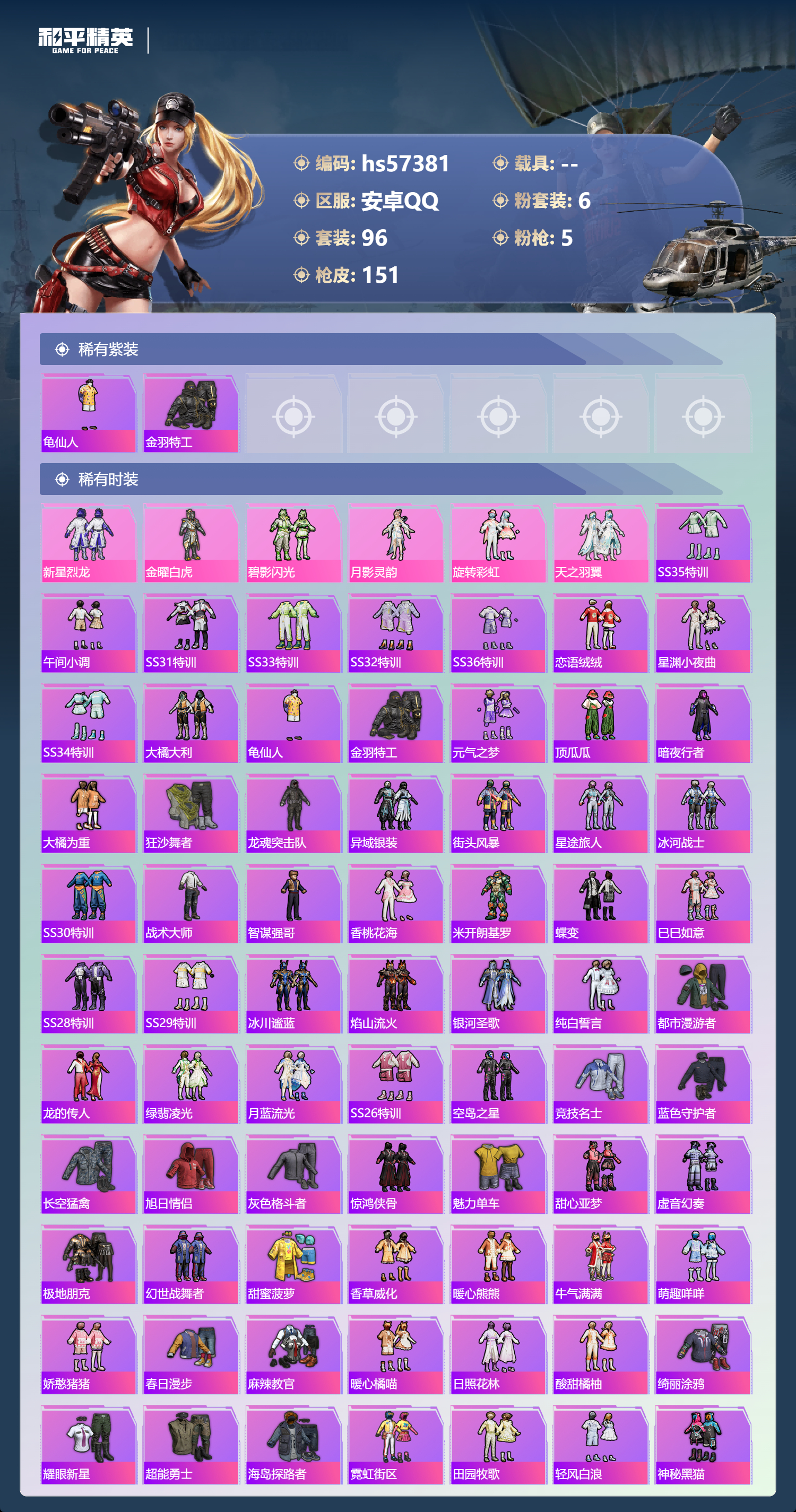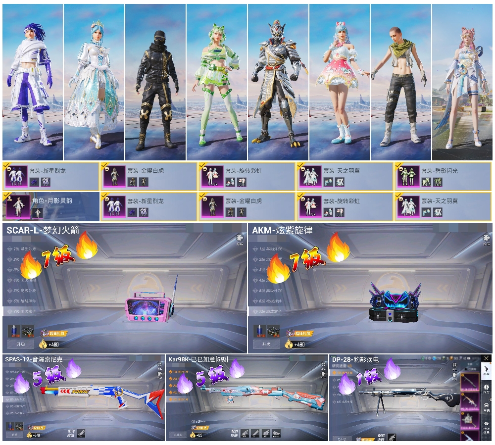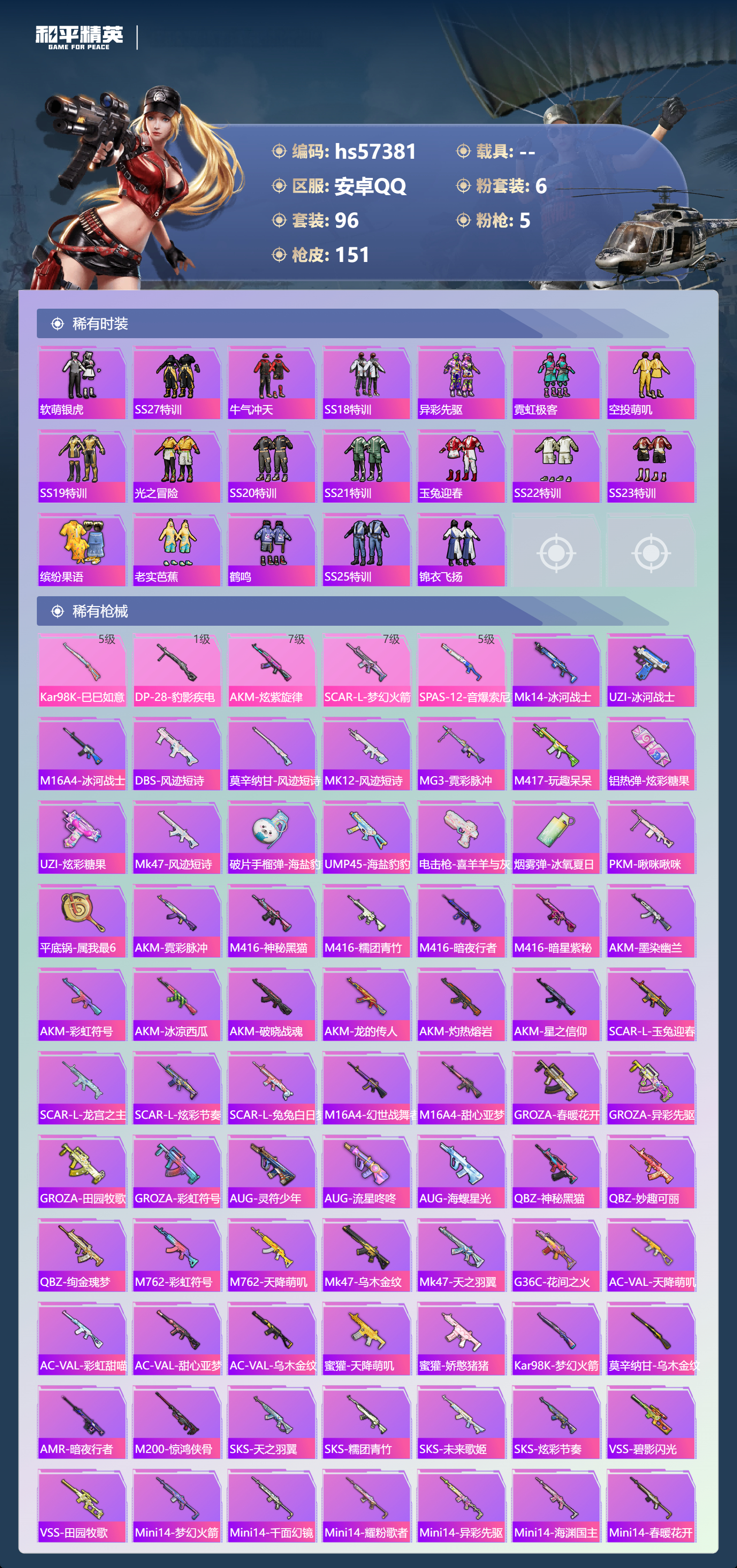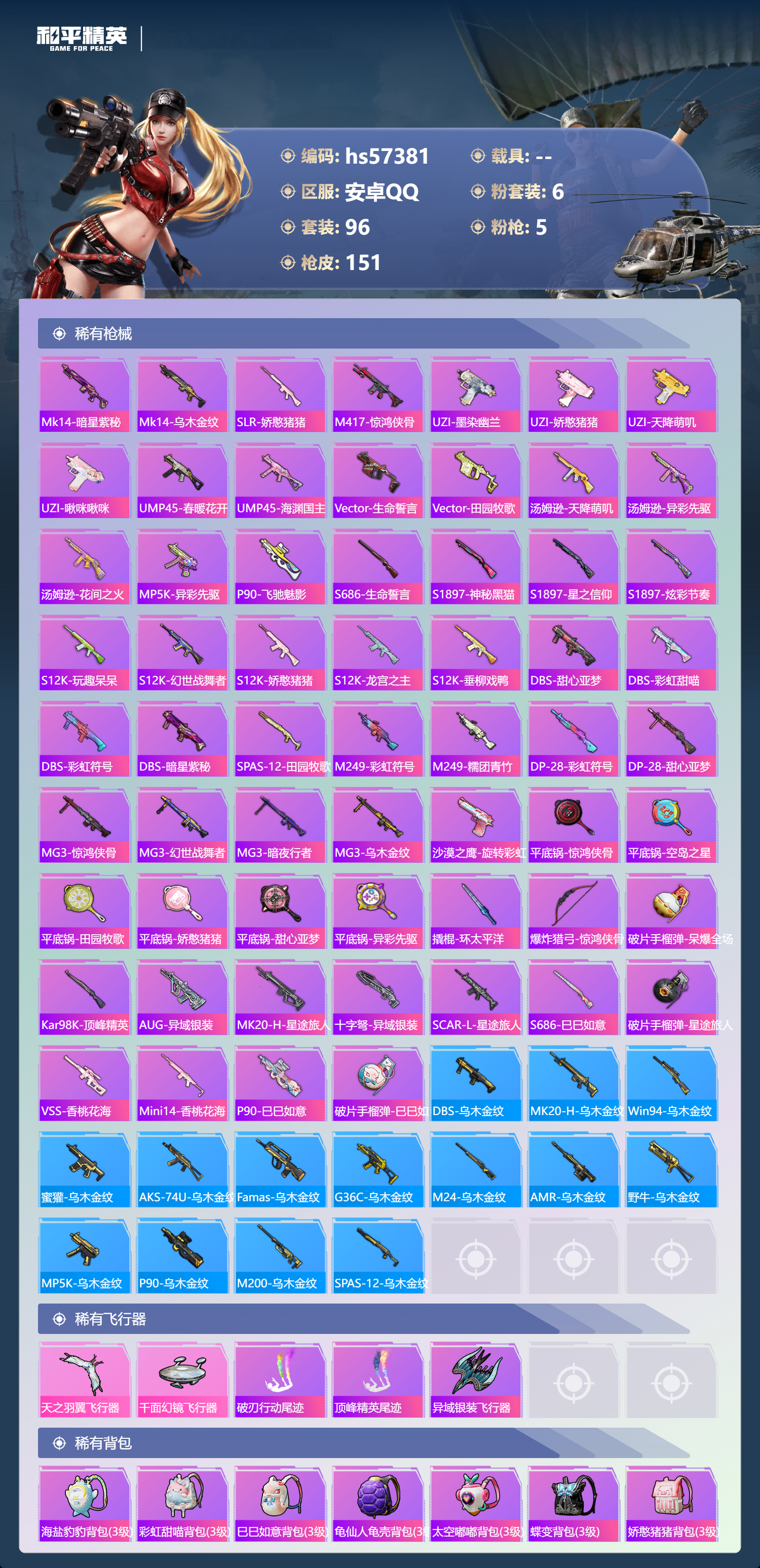 0载具-96套装-151呛皮-hs57381 安卓手q-13王牌印记-6粉装-5特效呛-46180热力值-96套装-151呛皮-2卓越印记-1传奇印记【6粉装】套装-金曜白虎角色-月影灵韵套装-碧影闪光套装-旋转彩虹套装-天之羽翼套装-新星烈龙【5特效呛】dp-28-豹影疾电/1级spas-12-音爆索尼克/5级scar-l-梦幻火箭/7级kar98k-巳巳如意/5级akm-炫紫旋律/7级【2稀有紫装】