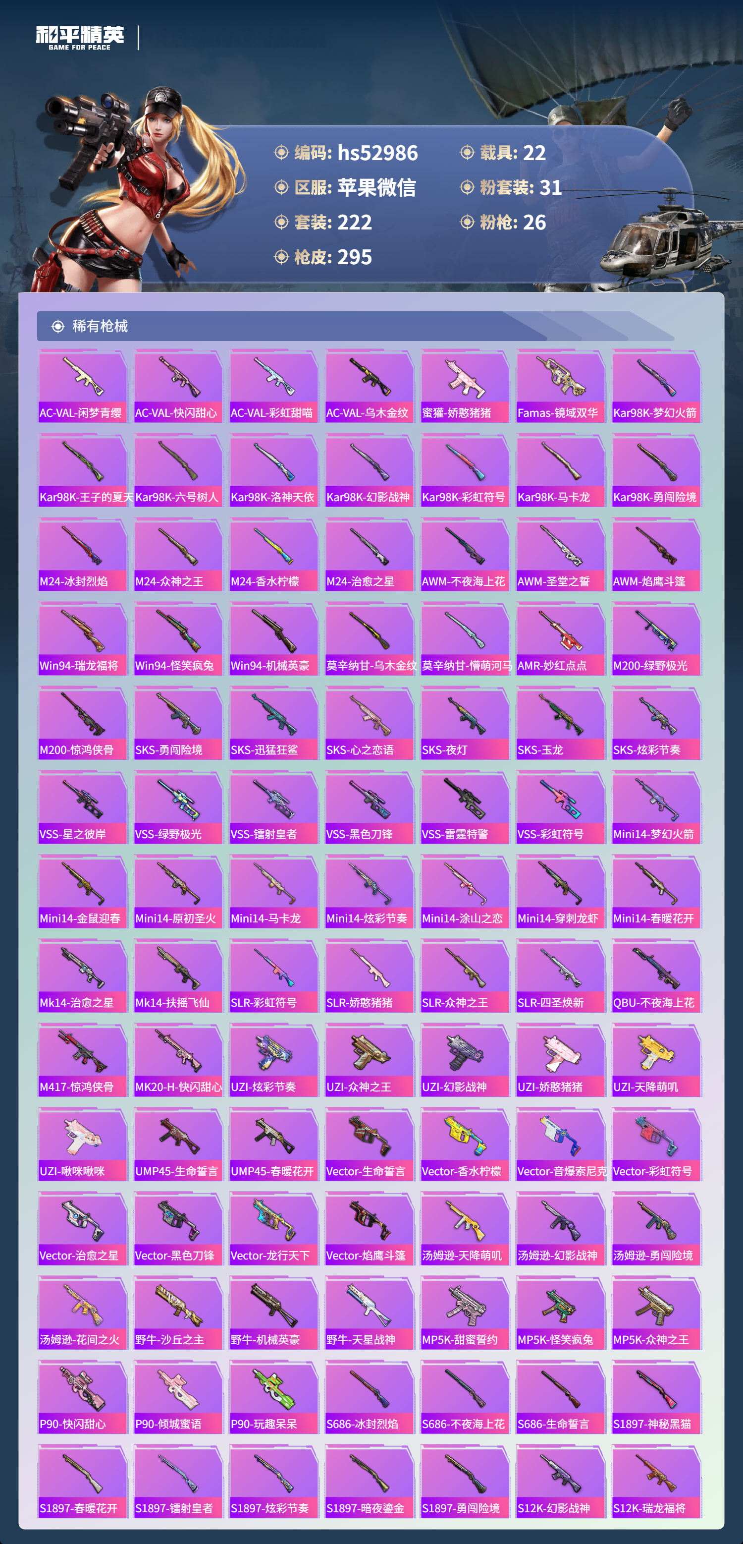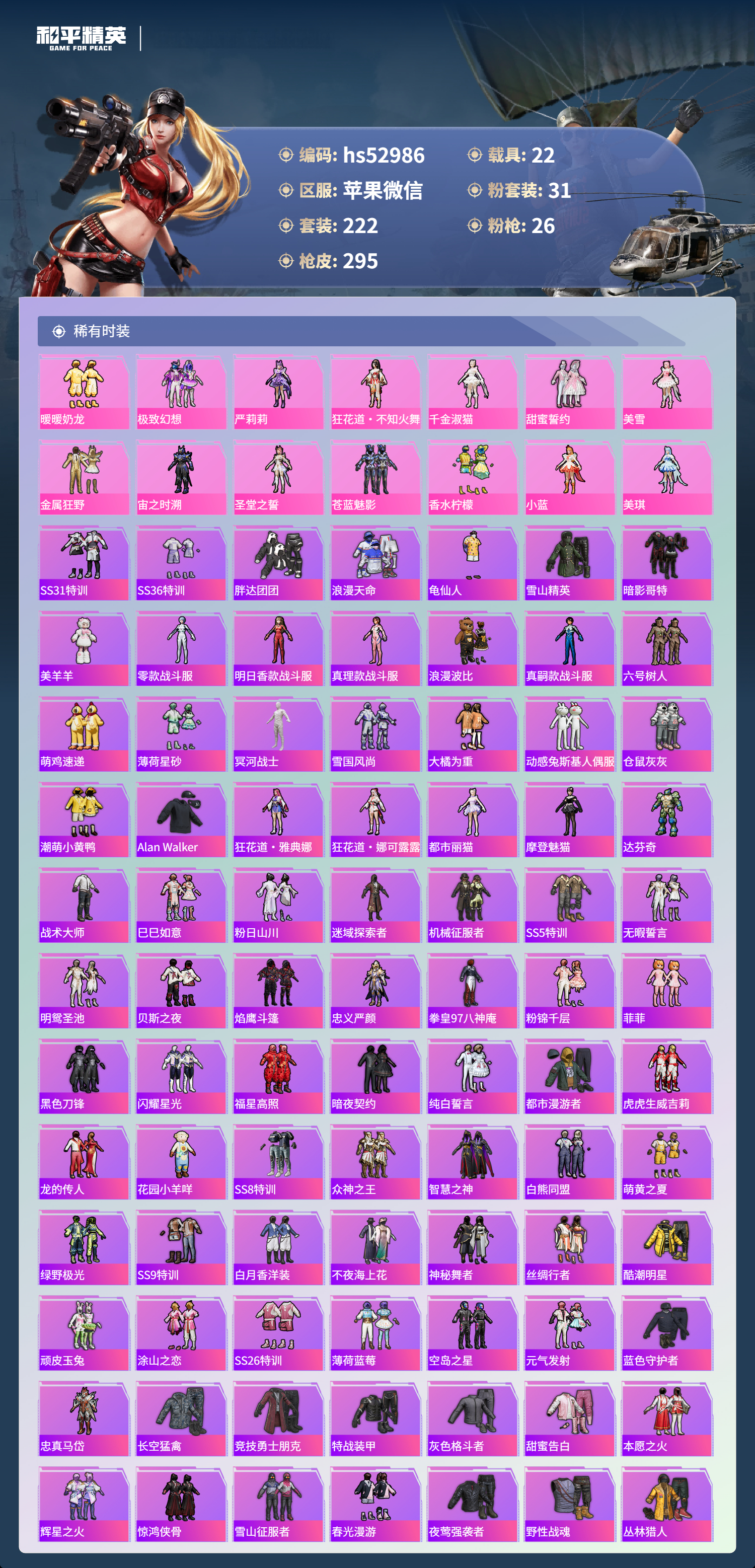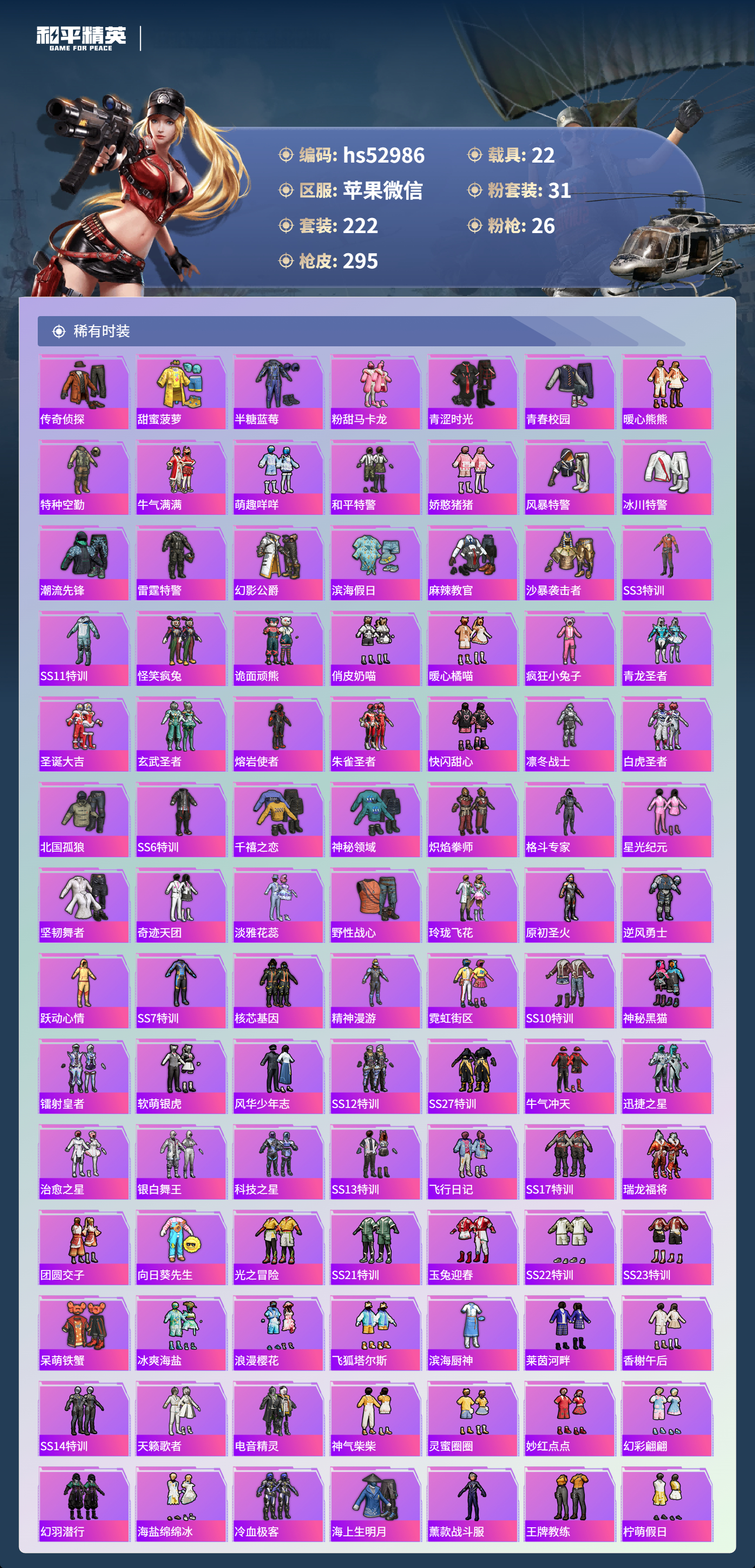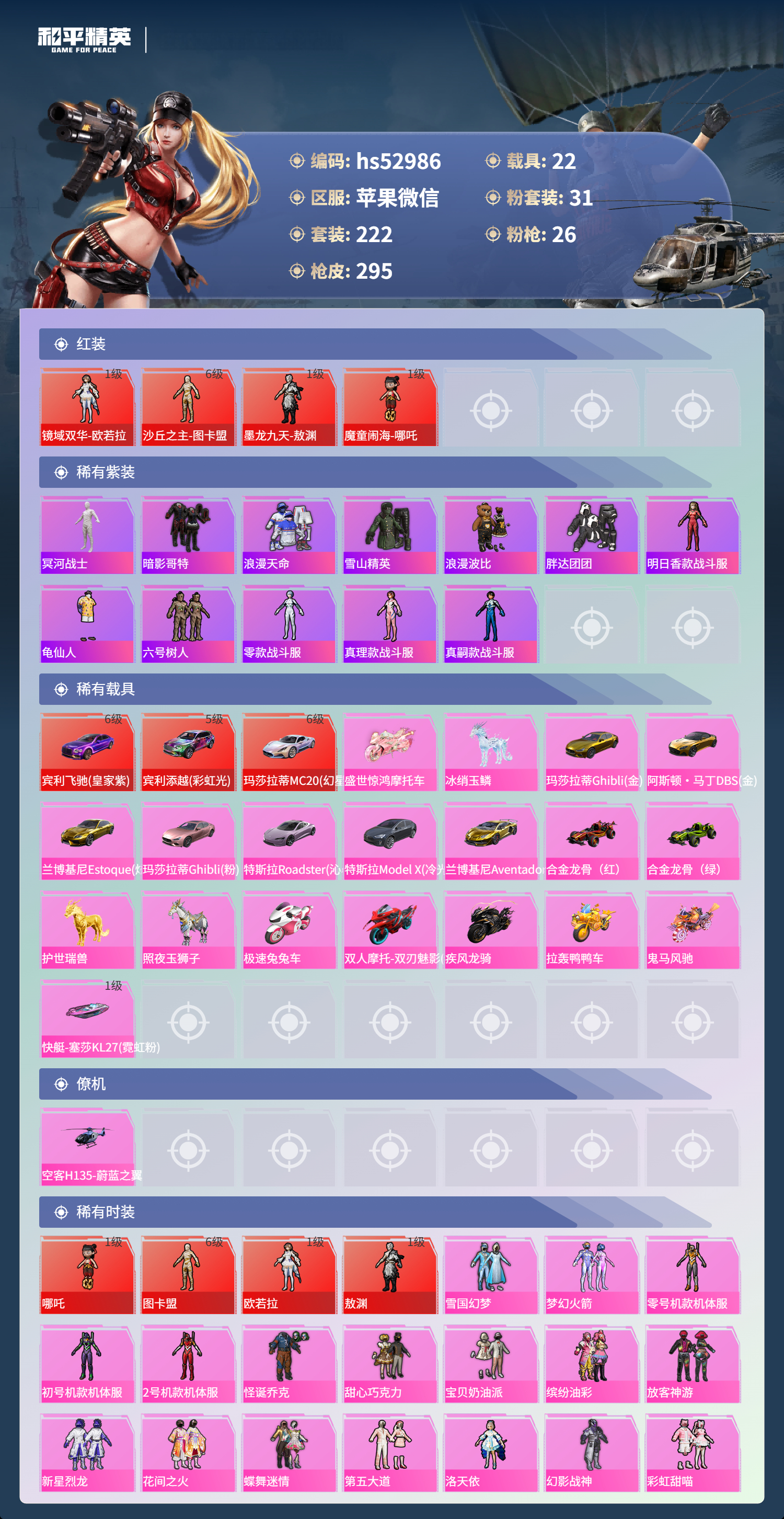 hs52986 苹果微信-10王牌印记-4红装-31粉装-26特效呛-22载具-热力值-222套装-295呛皮-3卓越印记-2传奇印记【4红装】魔童闹海-哪吒/1级镜域双华-欧若拉/1级墨龙九天-敖渊/1级沙丘之主-图卡盟/6级【31粉装】套装-极致幻想角色-零号机款机体服套装-新星烈龙套装-缤纷油彩角色-美雪套装-宝贝奶油派角色-圣堂之誓套装-梦幻火箭角色-