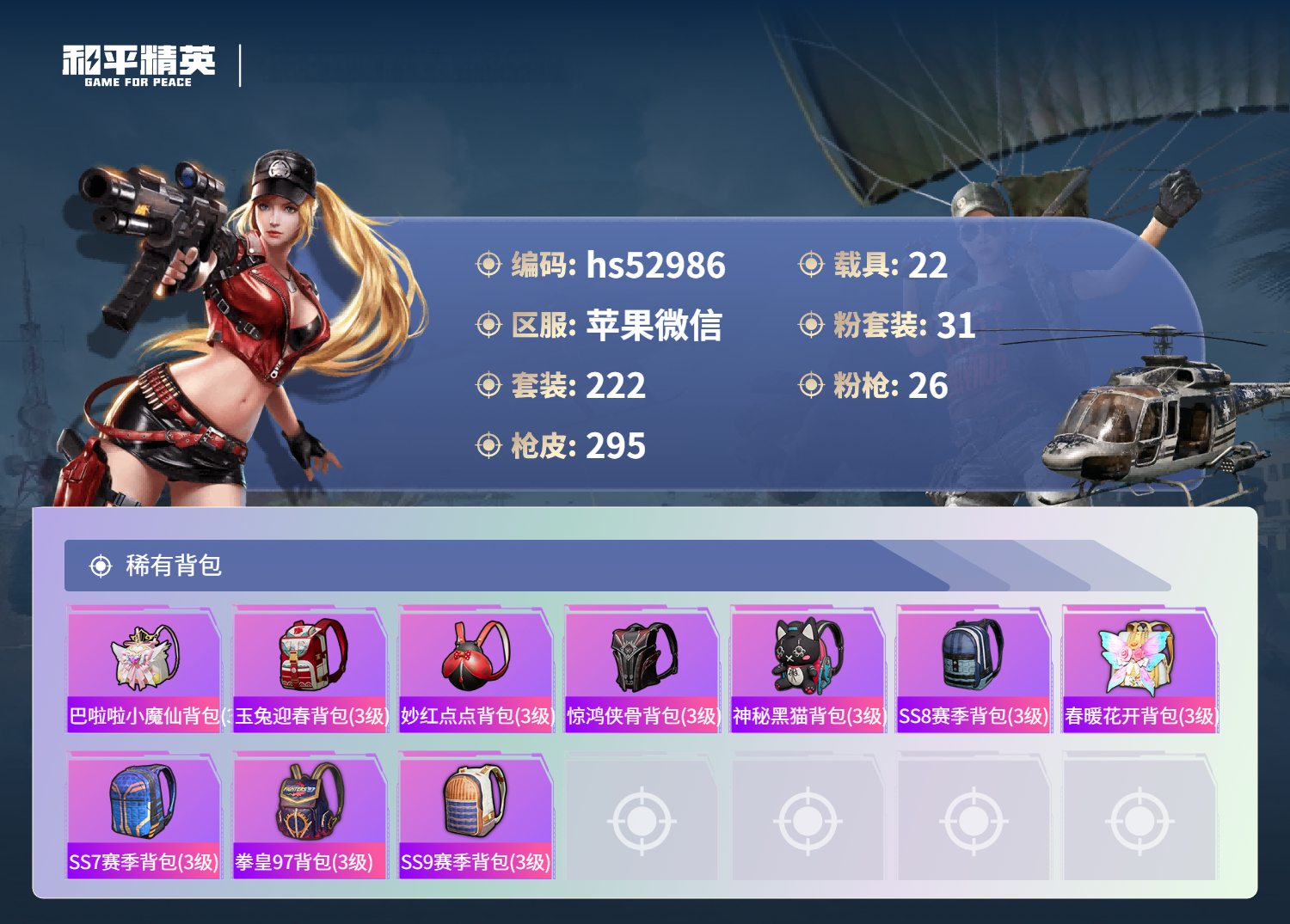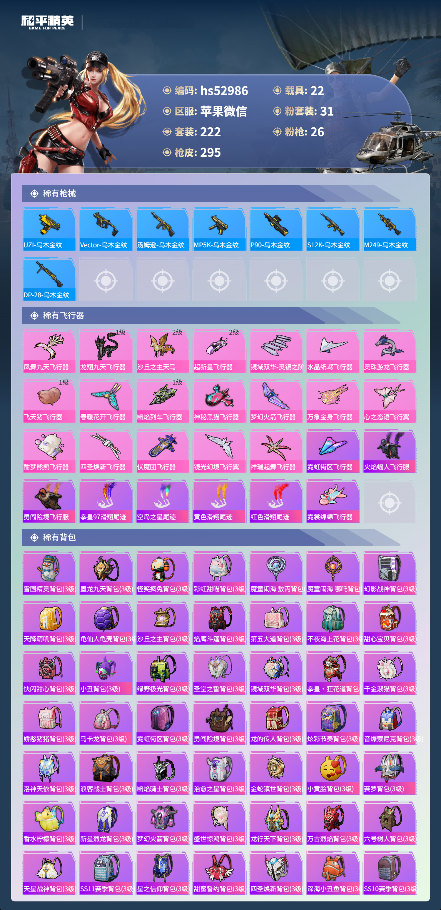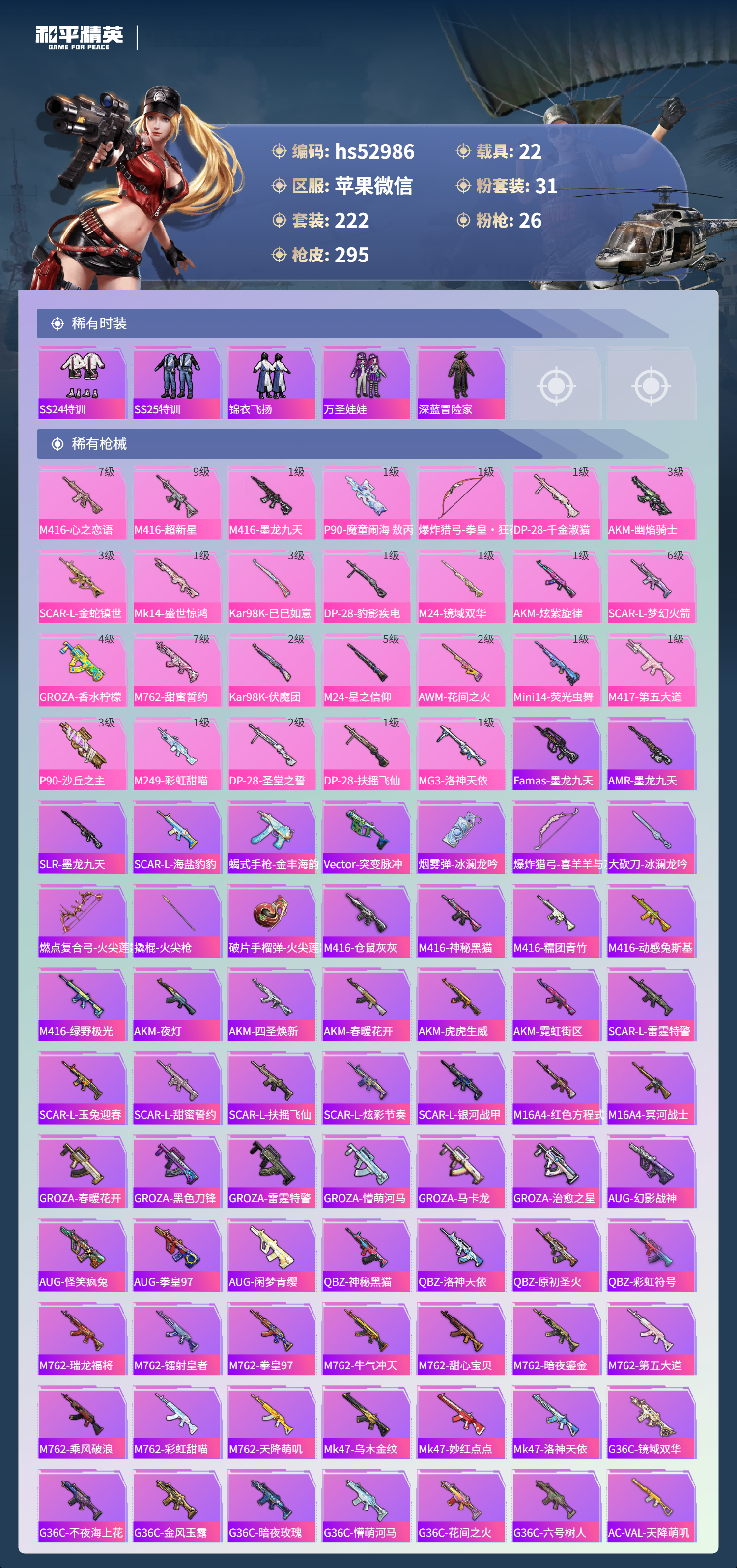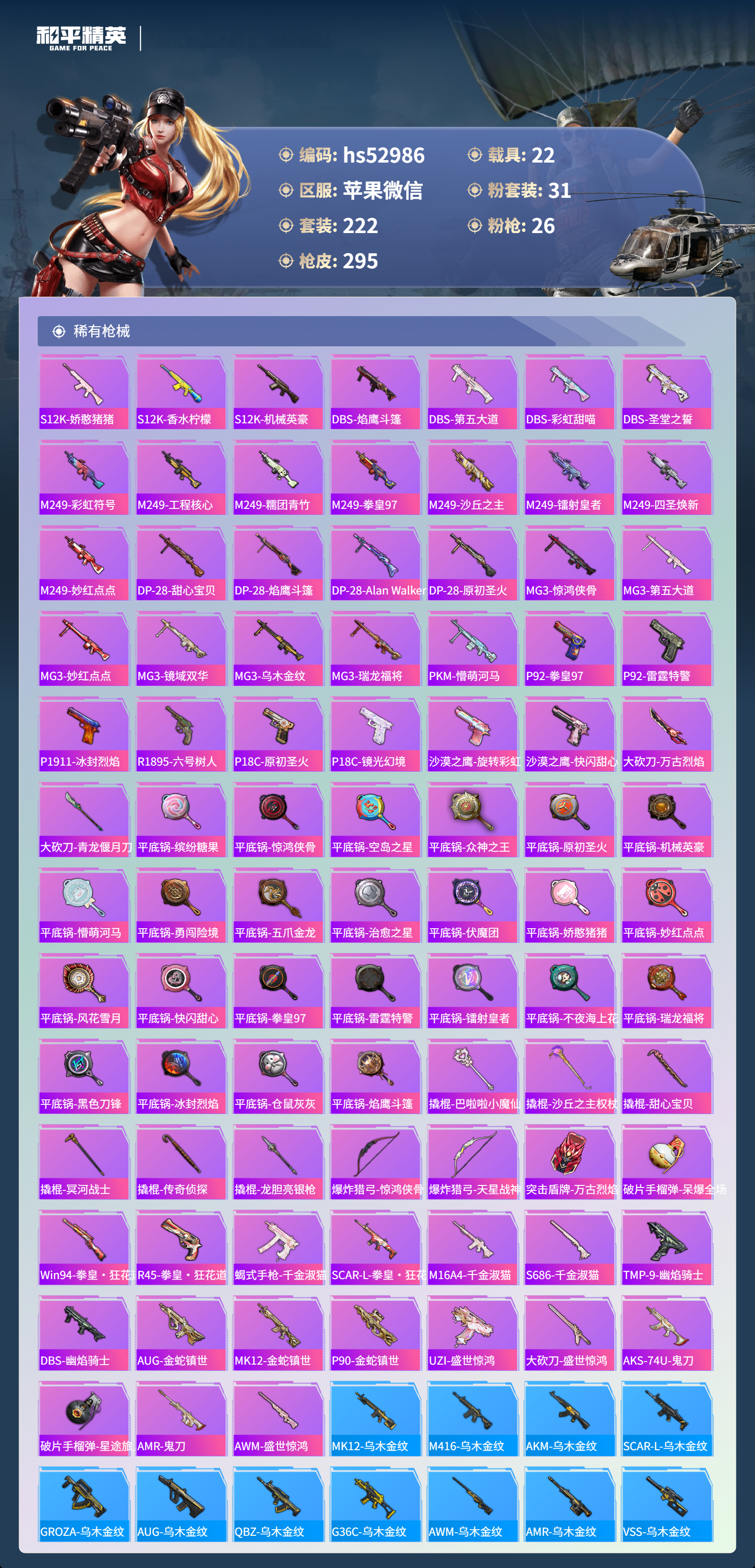 hs52986 苹果微信-10王牌印记-4红装-31粉装-26特效呛-22载具-热力值-222套装-295呛皮-3卓越印记-2传奇印记【4红装】魔童闹海-哪吒/1级镜域双华-欧若拉/1级墨龙九天-敖渊/1级沙丘之主-图卡盟/6级【31粉装】套装-极致幻想角色-零号机款机体服套装-新星烈龙套装-缤纷油彩角色-美雪套装-宝贝奶油派角色-圣堂之誓套装-梦幻火箭角色-