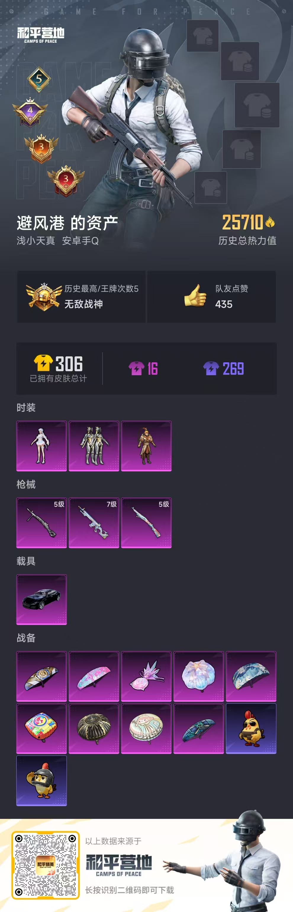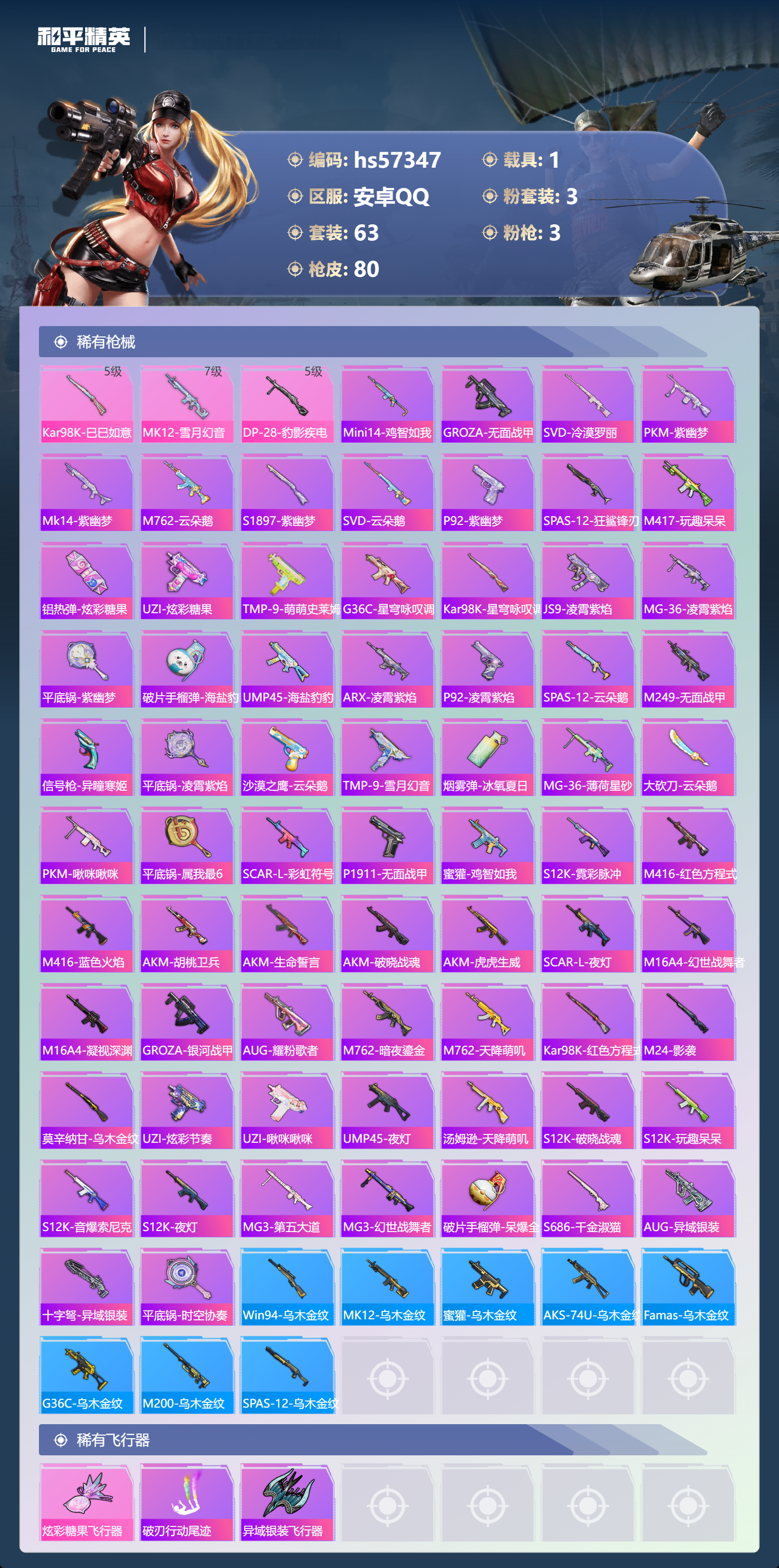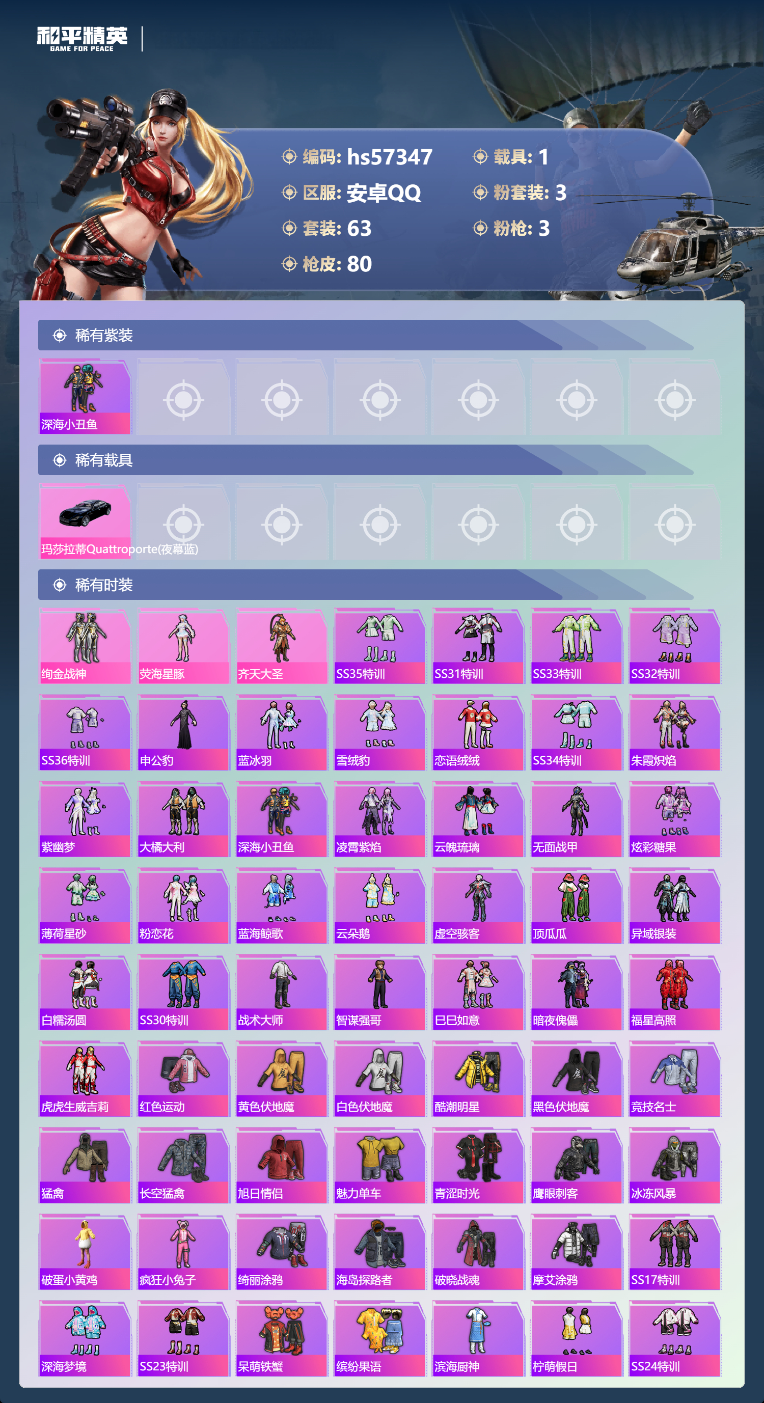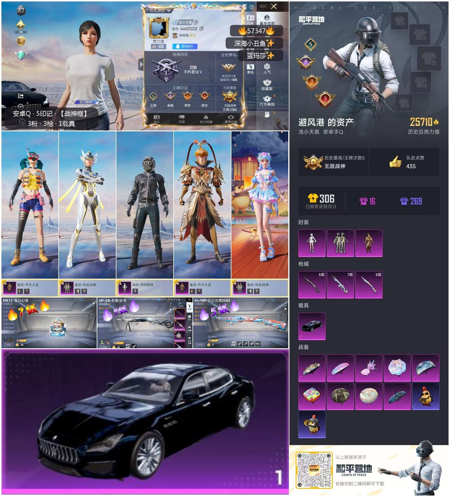 hs57347 安卓手q-5王牌印记-有战神框-3粉装-3特效呛-1载具-25710热力值-63套装-80呛皮-4卓越印记-3传奇印记【3粉装】角色-荧海星豚套装-绚金战神套装-齐天大圣【3特效呛】kar98k-巳巳如意/5级mk12-雪月幻音/7级dp-28-豹影疾电/5级【1稀有紫装】深海小丑鱼【1稀有载具】玛莎拉蒂quattropte夜幕蓝【63稀有时装】绚金战神