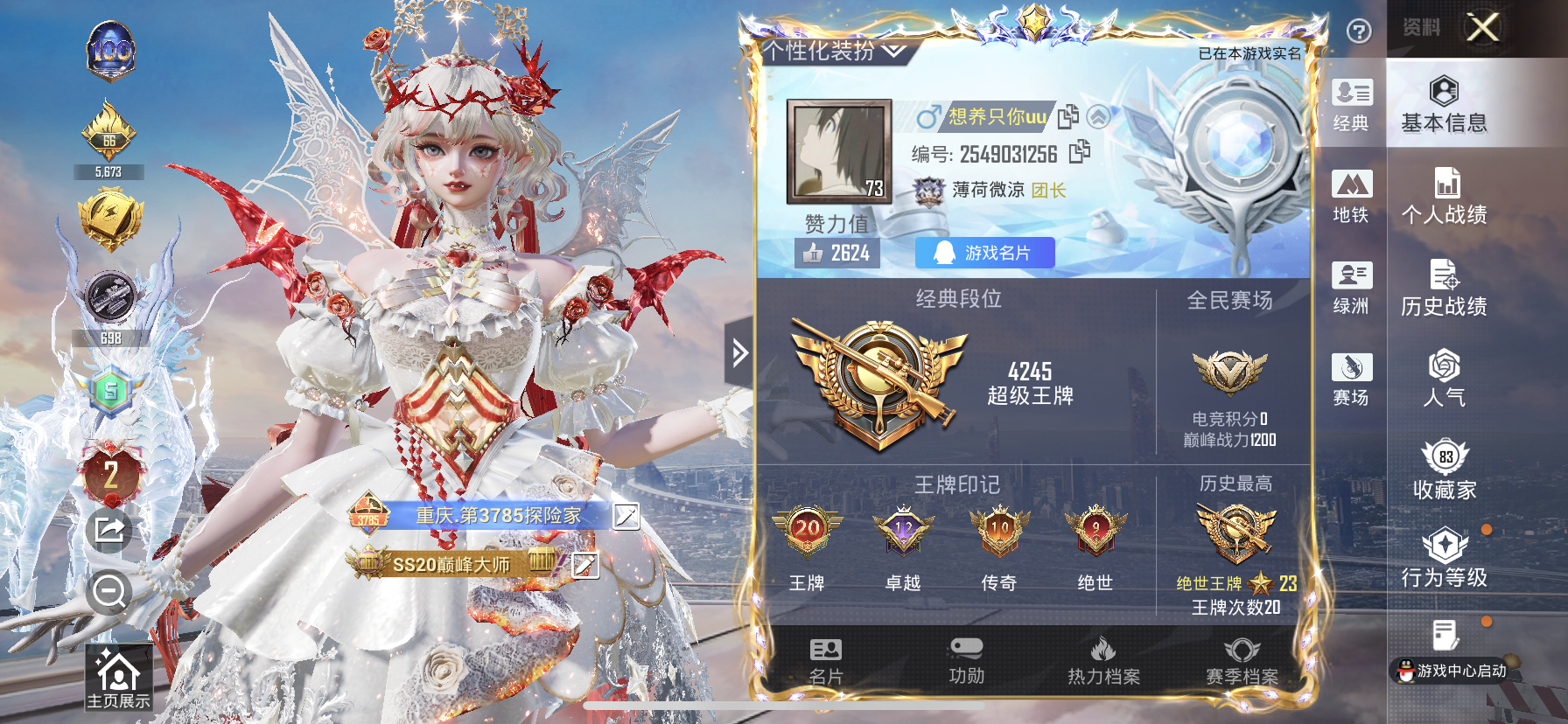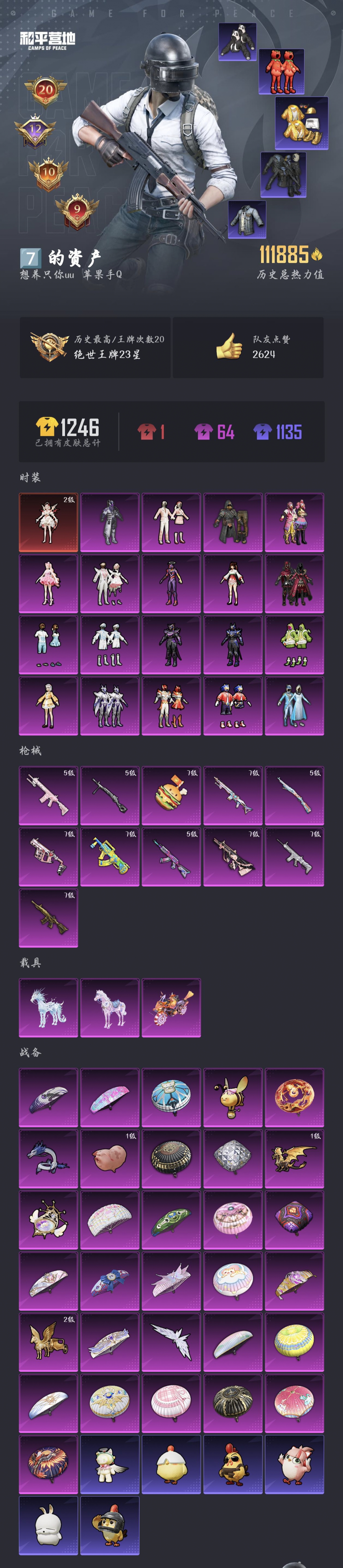【和平精英】【txhp6086】19粉装,11特效呛,3载具,历史最高段位:绝世王牌23星 王牌印记20次 热力值:111885,217套装,326呛械,469装备,202战备;套装:暮色玫影-艾丽娅,套装-极限特训,套装-幻影战神,套装-雪国幻梦,套装-缤纷油彩,套装-炙焰红王,套装-恐龙拽拽,套装-海盐物语,套装-紫电风暴,套装-霞光圣骑,套装-冰川粉黛,套装-音爆索尼克,角色-小可学妹,角色-呆萌星弥,套装-第五大道,套装-仲夏莫吉托,角色-宙之时溯,角色-星云暗核,角色-初号机 觉醒ver.,角色-樱桃泡泡,套装-竞技名士,套装-猛禽,套装-长空猛禽,套装-海岛探路者,套装-旭日情侣,套装-都市猎人,套装-水银刺客,套装-浪漫天命,套装-特战装甲,套装-贵族骑装,套装-特殊使命,套装-活力之心,套装-春日漫步,套装-龙腾端午,套装-暗黑骑手,套装-鹰眼刺客,套装-冰冻风暴,套装-冷酷挑战者,套装-摇滚战魂,套装-摇滚舞王,套装-暗金炫舞,套装-神秘领域,套装-魅力单车,套装-绮丽涂鸦,套装-耀眼新星,套装-野性战心,套装-金羽特工,套装-狂沙舞者,套装-森林游猎者,套装-荣耀,套装-沙漠兵团,套装-派对舞王,套装-酷潮明星,套装-幻世战舞者,套装-奇异狩猎者,套装-金耀舞者,套装-蓝调潮人,套装-暗影哥特,套装-弄潮海豚,套装-迅捷狂鲨,套装-呆萌铁蟹,套装-深海小丑鱼,套装-青涩时光,套装-缤纷果语,套装-滨海厨神,套装-龙魂突击队,套装-青涩年华,套装-胖达团团,套装-幻影公爵,套装-麻辣教官,套装-小丑鱼,套装-东方飞龙,套装-粉红小猪,套装-破蛋小黄鸡,套装-疯狂小兔子,套装-金鼠迎春,套装-鹤鸣,套装-霓虹街区,套装-白熊同盟,套装-萌黄之夏,套装-夏日音浪,套装-顽皮玉兔,套装-白糯汤圆,套装-战术大师,套装-ss18特训,套装-飞行日记,套装-竞技角斗士,套装-曼妙人鱼,套装-热情海星,套装-纯真浪花,套装-冰爽海盐,套装-浪漫樱花,套装-吉莉礼服,套装-暗夜傀儡,套装-ss17特训,套装-瑞龙福将,套装-团圆交子,套装-福星高照,套装-虎虎生威吉莉,套装-缤纷焰火,套装-异彩先驱,套装-霓虹极客,套装-空投萌叽,套装-ss19特训,套装-飞驰魅影,套装-音速流光,套装-炫蓝之夏,套装-ss20特训,套装-粉团憨憨,套装-ss21特训,套装-萌趣咩咩,套装-娇憨猪猪,套装-红熊茄茄,套装-梦幻奶油,套装-酸甜橘柚,套装-暗夜行者,套装-玉兔迎春,套装-ss22特训,套装-和煦暖阳,套装-田园牧歌,套装-轻风白浪,套装-绚烂繁星,套装-光之冒险,套装-绯格组合,套装-ss23特训,套装-莱茵河畔,套装-香榭午后,套装-甜梦熊熊,套装-神气柴柴,套装-懵萌河马,套装-灵蜜圈圈,套装-妙红点点,套装-幻彩翩翩,套装-王牌教练,套装-柠萌假日,套装-青玉碎影,套装-ss24特训,套装-日照花林,套装-龟仙人,套装-涂山之恋,套装-ss25特训,套装-金戈铁马,套装-惊鸿侠骨,套装-锦衣飞扬,套装-香桃花海,套装-龙的传人,套装-冰河战士,套装-ss26特训,套装-快闪甜心,套装-春光漫游,套装-漫游都市,套装-空岛之星,套装-无暇誓言,套装-明鸳圣池,套装-童真绒兔,套装-贝斯之夜,套装-焰鹰斗篷,套装-幽夜迷踪,套装-幻羽潜行,套装-ss27特训,套装-恋语绒绒,套装-ss28特训,角色-蝶吟花词,角色-白光莹,角色-情公主,角色-冰公主,角色-银尘,套装-街头风暴,套装-海盐绵绵冰,套装-蝶变,套装-湖畔霞光,套装-雪夜云雾,套装-ss29特训,套装-异域银装,套装-星途旅人,套装-ss30特训,套装-绒绒粉兔,套装-小鸟芋圆,套装-ss31特训,套装-鱼渊荷华,套装-燕燕于飞,套装-智谋强哥,套装-晶灵使者,角色-海琴烟,套装-荒漠狂战,套装-紫幽梦,套装-粉恋花,套装-晶辉守护,套装-ss33特训,套装-云朵鹅,套装-巳巳如意,套装-ss32特训,套装-彩虹兔,套装-风舞幻音,套装-蓝冰羽,套装-顶瓜瓜,套装-雪绒豹,套装-大橘大利,套装-圣穹绘梦,玩偶服-美羊羊,套装-元气之梦,套装-ss34特训,套装-擎苍青焰,套装-朱霞炽焰,角色-申公豹,套装-游乐,套装-凌霄紫焰,套装-薄荷星砂,套装-ss35特训,套装-午间小调,套装-秘语星愿,套装-风迹短诗,套装-琴音绮想,套装-粉黛兰香,套装-画境星梦,套装-ss36特训,套装-萌鸡速递;呛皮:7级scar-l-纯梦嫁纱,scar-l-夜灯,scar-l-炫彩节奏,scar-l-彩虹符号,scar-l-玉兔迎春,scar-l-甜蜜旋律,scar-l-星途旅人,scar-l-海盐豹豹,5级akm-炫紫旋律,akm-影袭,akm-奇异狩猎者,akm-缤纷海域,akm-破晓战魂,akm-霓虹街区,akm-夜灯,akm-涂鸦街区,akm-星之彼岸,akm-彩虹符号,akm-虎虎生威,akm-星兔领航员,akm-2p战斗服款,akm-龙的传人,akm-星月云朵,akm-霓彩脉冲,akm-绿洲时空,mk47-百万伏特,mk47-林间仙鹿,mk47-乌木金纹,mk47-妙红点点,mk47-摩登王国,mk47-虚空骇客,mk47-风迹短诗,蜜獾-娇憨猪猪,蜜獾-千面幻镜,蜜獾-天降萌叽,蜜獾-精灵梦叶罗丽,蜜獾-鸡智如我,蜜獾-风迹短诗,蜜獾-乌木金纹,q-彩虹符号,q-洛神天依,q-飞驰魅影,q-银碳小老虎,q-纯真浪花,m16a4-蓝色火焰,m16a4-红色方程式,m16a4-幻世战舞者,m16a4-冰河战士,m16a4-最终圣卫者,7级m416-五爪金龙,m416-糯团青竹,m416-摩登王国,m762-奇异狩猎者,m762-瑞龙福将,m762-彩虹符号,m762-第五大道,m762-天降萌叽,m762-萌物绒绒,m762-云朵鹅,7级groza-香水柠檬,groza-影袭,groza-彩虹符号,groza-异彩先驱,groza-田园牧歌,groza-懵萌河马,groza-海盐豹豹,groza-晶梦幻蝶,7级aug-南国舞曲,aug-甜蜜菠萝,aug-幻影战神,aug-耀粉歌者,aug-天降萌叽,aug-异域银装,aug-紫晶流影,ace32-画境星梦,ace32-冰晶雪宝,ac-val-乌木金纹,ac-val-彩虹甜喵,ac-val-快闪甜心,famas-霓彩脉冲,famas-乌木金纹,g36c-懵萌河马,g36c-六号树人,g36c-