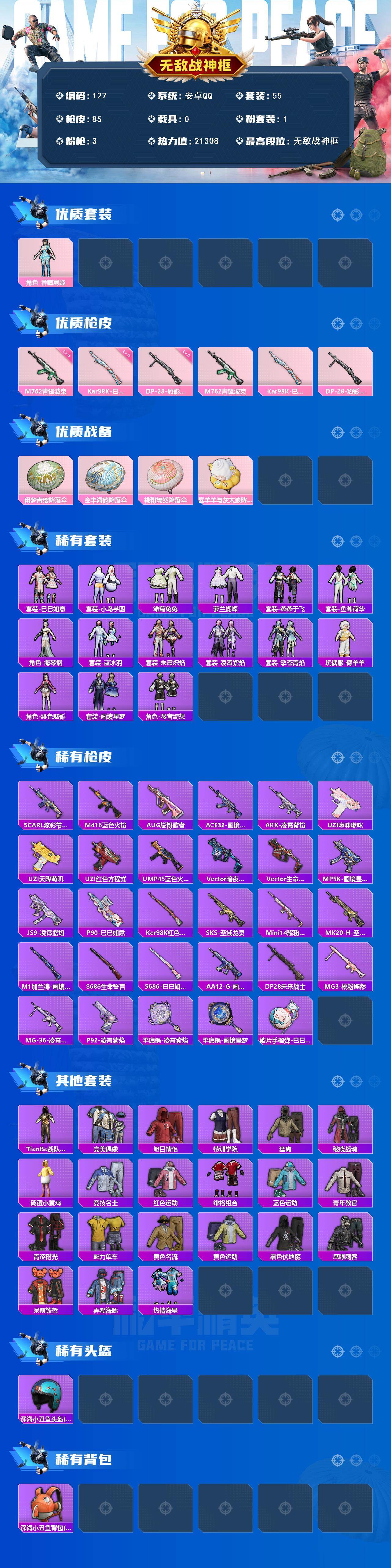 【 1粉装 3特效 ss35战神框 地铁满天赋】2王牌印记-1粉装-3特效呛-85呛皮-55套装 【1粉装】 异瞳寒姬 【3特效呛】 m762-青锋波束 dp-28-豹影疾电 kar98k-巳巳如意 【3飞行器】 鸡智如我飞行器 顶峰精英尾迹 异域银装飞行器 【14头盔】 异瞳寒姬头盔3级 雏菊兔兔头盔3级 萌鸡速递头盔3级 炫彩糖果头盔3级 凌霄紫焰头盔