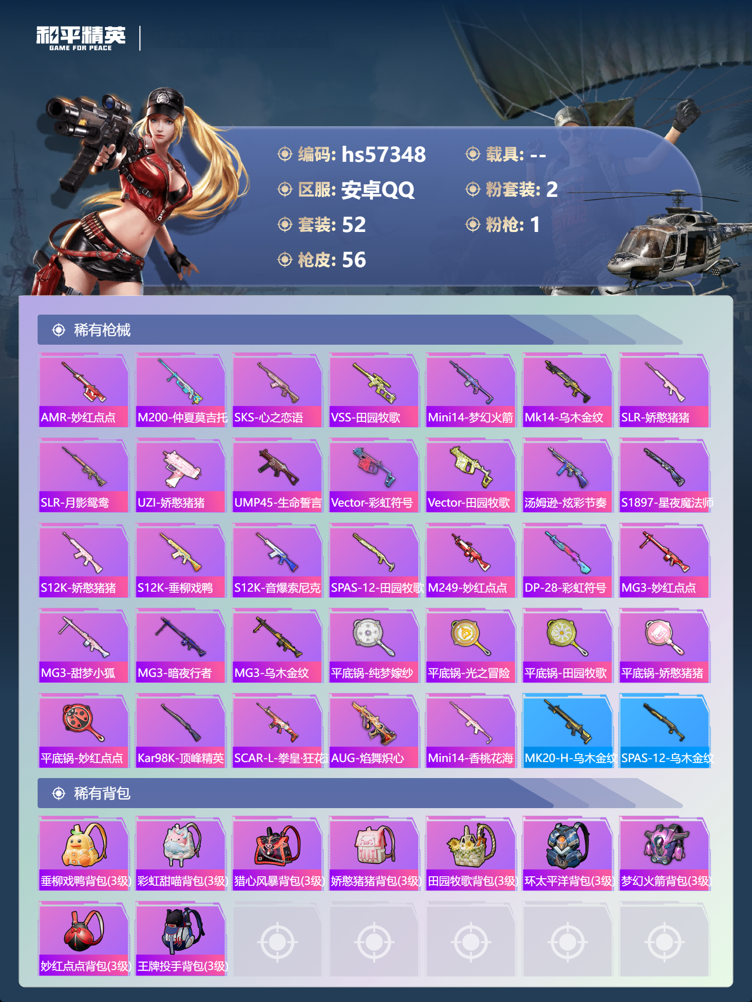 0载具-52套装-56呛皮-hs57348 安卓手q-2王牌印记-2粉装-1特效呛-18302热力值-52套装-56呛皮【2粉装】套装-暗夜鎏金套装-星夜魔法师【1特效呛】mg3-洛神天依/7级【1稀有紫装】浪漫天命【52稀有时装】浪漫天命暗夜鎏金星夜魔法师狂沙舞者战术大师英勇保护者智慧之神果汁能量萌黄之夏蓝色运动白色伏地魔湖蓝色名流霸义无双竞技名士猛禽长空猛禽冷焰舞者魅力单车4