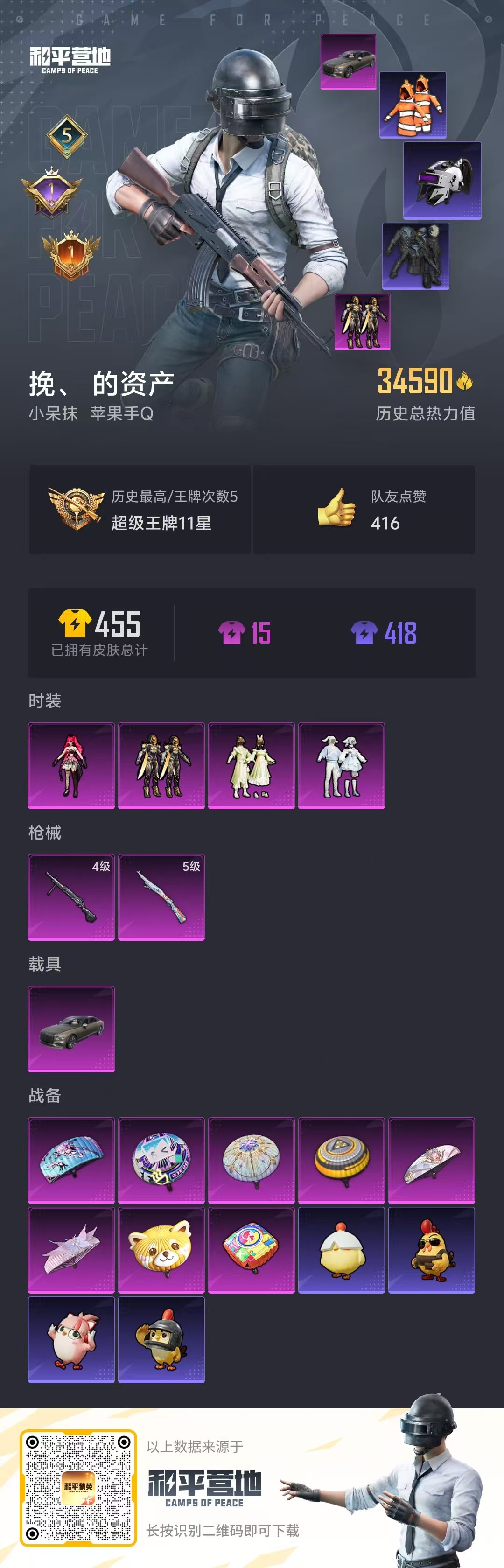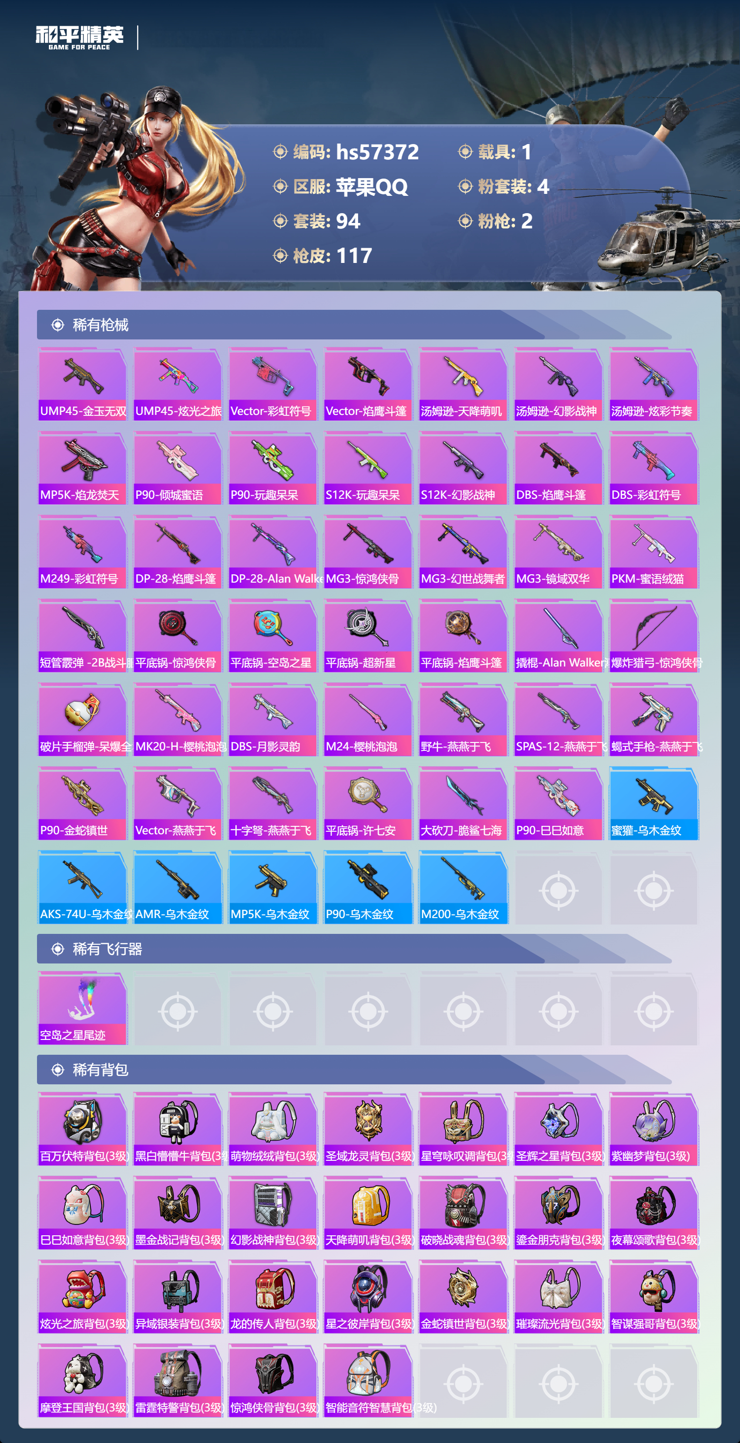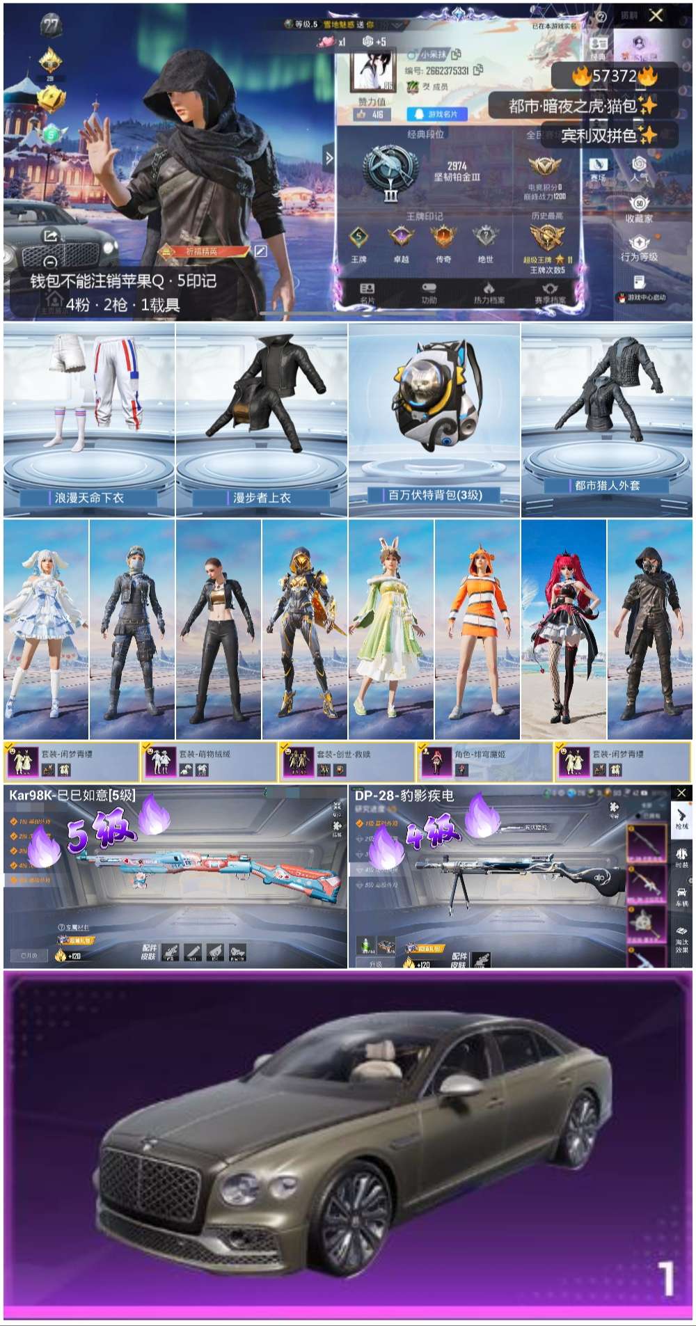 1载具-94套装-117呛皮-hs57372 苹果手q-5王牌印记-4粉装-2特效呛-1载具-34590热力值-94套装-117呛皮-1卓越印记-1传奇印记【4粉装】角色-绯穹魔姬套装-闲梦青缨套装-萌物绒绒套装-创世·救赎【2特效呛】kar98k-巳巳如意/5级dp-28-豹影疾电/4级【4稀有紫装】都市猎人浪漫天命小丑鱼龟仙人【1稀有载具】宾利飞驰布罗德盖棕双色【94稀有时装】绯穹魔姬ss31