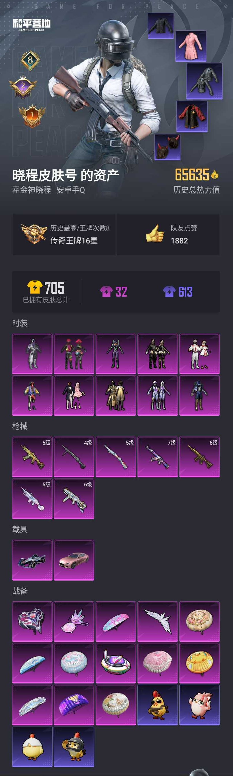【和平精英】【lyhp20019】10粉装,7特效呛,2载具,历史最高段位:传奇王牌16星 王牌印记8次 热力值:65635,166套装,182呛械,223装备,102战备;套装:套装-幻影战神,套装-金风玉露,套装-星之信仰,套装-天启纪元,套装-放客神游,套装-天禅智恒,套装-蜜桃特工,角色-初号机款机体服,套装-冰川红玫,套装-暗夜鎏金,套装-特训学院,套装-黄色运动,套装-蓝色运动,套装-白色伏地魔,套装-黑色伏地魔,套装-骑行爱好者,套装-竞技名士,套装-深蓝色名流,套装-酒红色名流,套装-湖蓝色名流,套装-黄色名流,套装-猛禽,套装-长空猛禽,套装-漫步者,套装-竞技勇士朋克,套装-蓝色守护者,套装-海岛探路者,套装-旭日情侣,套装-冷焰舞者,套装-都市猎人,套装-刚毅裁决者,套装-特战装甲,套装-战地菁英,套装-青春校园,套装-灰色格斗者,套装-活力之心,套装-燃烧卡路里,套装-滨海假日,套装-沙漠毒蛇,套装-鹰眼刺客,套装-冰冻风暴,套装-人气偶像,套装-暗金炫舞,套装-蓝彩潮人,套装-魅力单车,套装-绮丽涂鸦,套装-坚韧舞者,套装-竞技达人朋克,套装-都市漫游者,套装-沙漠兵团,套装-火箭少女101,套装-丛林猎人,套装-雪山精英,套装-酷潮明星,套装-传奇侦探,套装-极地朋克,套装-幻世战舞者,套装-翡翠奔狼,套装-暗影哥特,套装-缤纷果语,套装-滨海厨神,套装-风暴特警,套装-冰川特警,套装-元素星魂,套装-极速红龙,套装-格斗先锋,套装-wifi精灵,套装-麻辣教官,套装-破蛋小黄鸡,套装-疯狂小兔子,套装-深蓝冒险家,套装-迷域探索者,套装-ss5特训,套装-北国孤狼,套装-ss6特训,套装-拳皇97草薙京,套装-炽焰拳师,套装-格斗专家,套装-奇迹天团,套装-圣殿骑士,套装-跃动心情,套装-ss7特训,套装-黑色刀锋,套装-核芯基因,套装-精神漫游,套装-云丝凤蟒,套装-闪耀星光,套装-霓虹街区,套装-暗夜契约,套装-赛博空间,套装-清香五月粽,套装-软嫩糖心蛋,套装-ss10特训,套装-ss8特训,套装-萌黄之夏,套装-夏日音浪,套装-ss9特训,套装-牛气满满,套装-白糯汤圆,套装-ss11特训,套装-萌趣颜团子,套装-战术大师,套装-ss18特训,套装-耀粉歌者,套装-飞行日记,套装-ss14特训,套装-吉莉礼服,角色-零款战斗服,角色-明日香款战斗服,套装-暖风夏荷,套装-ss17特训,套装-福星高照,套装-豚鼠丹丹,套装-ss20特训,套装-ss21特训,套装-萌趣咩咩,套装-娇憨猪猪,套装-红熊茄茄,套装-酸甜橘柚,套装-玉兔迎春,套装-ss22特训,套装-和煦暖阳,套装-田园牧歌,套装-轻风白浪,套装-碧波幻想,套装-光之冒险,套装-绯格组合,套装-王牌教练,套装-柠萌假日,套装-ss24特训,套装-华灯初上,套装-龟仙人,套装-ss25特训,套装-香桃花海,套装-龙的传人,套装-ss26特训,套装-空岛之星,套装-ss27特训,套装-ss28特训,套装-ss29特训,套装-异域银装,套装-ss30特训,套装-ss31特训,套装-ss33特训,套装-巳巳如意,套装-ss32特训,套装-青翼流星,套装-顶瓜瓜,套装-狂鲨锋刃,套装-大橘大利,套装-炫彩糖果,套装-蓝海鲸歌,套装-ss34特训,套装-朱霞炽焰,角色-申公豹,套装-凌霄紫焰,套装-ss35特训,套装-午间小调,套装-秘语星愿,套装-风迹短诗,套装-琴音绮想,套装-画境星梦,套装-书海巡游,套装-ss36特训,套装-雪国风尚,套装-萌鸡速递;呛皮:7级akm-星际浪客,akm-影袭,akm-破晓战魂,akm-天启纪元,akm-霓虹街区,akm-夜灯,akm-彩虹符号,akm-萌趣颜团子,akm-虎虎生威,akm-龙的传人,akm-乌木金纹,m762-拳皇97,m762-天降萌叽,m762-乌木金纹,蜜獾-娇憨猪猪,蜜獾-天降萌叽,蜜獾-风迹短诗,蜜獾-乌木金纹,famas-乌木金纹,arx-凌霄紫焰,scar-l-红色方程式,scar-l-夜灯,scar-l-玉兔迎春,scar-l-海盐豹豹,scar-l-乌木金纹,6级m416-五爪金龙,m416-蓝色火焰,m416-绯红前夜,m416-红色方程式,m416-糯团青竹,m416-魔童闹海 敖闰,m416-乌木金纹,ac-val-乌木金纹,ac-val-天降萌叽,aug-耀粉歌者,aug-异域银装,aug-乌木金纹,groza-影袭,groza-黑色刀锋,groza-彩虹符号,groza-田园牧歌,groza-乌木金纹,g36c-金风玉露,g36c-乌木金纹,q-彩虹符号,q-相思残雪,q-乌木金纹,m16a4-红色方程式,m16a4-魔法学院,m16a4-冰河战士,m16a4-乌木金纹,ace32-画境星梦,ace32-冰晶雪宝,mk47-乌木金纹,mk47-风迹短诗,5级kar98k-巳巳如意,kar98k-红色方程式,kar98k-王子的夏天,kar98k-影袭,kar98k-勇闯险境,kar98k-彩虹符号,kar98k-欢乐麻酱,kar98k-乌木金纹,m200-乌木金纹,win94-乌木金纹,awm-暮色玫影,m24-影袭,m24-天降萌叽,amr-乌木金纹,莫辛纳甘-风迹短诗,vss-黑色刀锋,vss-田园牧歌,vss-香桃花海,vss-乌木金纹,sks-金玉无双,sks-夜灯,sks-勇闯险境,sks-未来歌姬,mk12-风迹短诗,mk12-乌木金纹,mk20-h-狂鲨锋刃,mk20-h-乌木金纹,mini14-耀粉歌者,mini14-香桃花海,mini14-乌木金纹,mk14-相思残雪,mk14-乌木金纹,slr-娇憨猪猪,m1加兰德-画境星梦,m417-玩趣呆呆,uzi-生命誓言,uzi-红色方程式,uzi-影袭,uzi-金玉无双,uzi-魔法学院,uzi-娇憨猪猪,uzi-墨染幽兰,uzi-冰河战士,uzi-啾咪啾咪,uzi-炫彩糖果,汤姆逊-勇闯险境,汤姆逊-耀粉歌者,汤姆逊-天降萌叽,6级ump45-相思残雪,ump45-夜灯,ump45-生命誓言,ump45-春暖花开,ump45-天启纪元,ump45-炫光之旅,vect-黑色刀锋,vect-田园牧歌,vect-乌木金纹,p90-玩趣呆呆,p90-乌木金纹,5级aks-74u-森灵之息,aks-74u-乌木金纹,mp5k-甜蜜誓约,mp5k-画境星梦,mp5k-乌木金纹,js9-凌霄紫焰,野牛-乌木金纹,s1897-春暖花开,s1897-天启纪元,s1897-勇闯险境,s1897-炫彩节奏,s1897-糯团青竹,s1897-乌木金纹,spas-12-田园牧歌,spas-12-狂鲨锋刃,spas-12-乌木金纹,s12k-夜灯,s12k-九霄,s12k-龙虾霸霸,s12k-娇憨猪猪,s12k-冰川