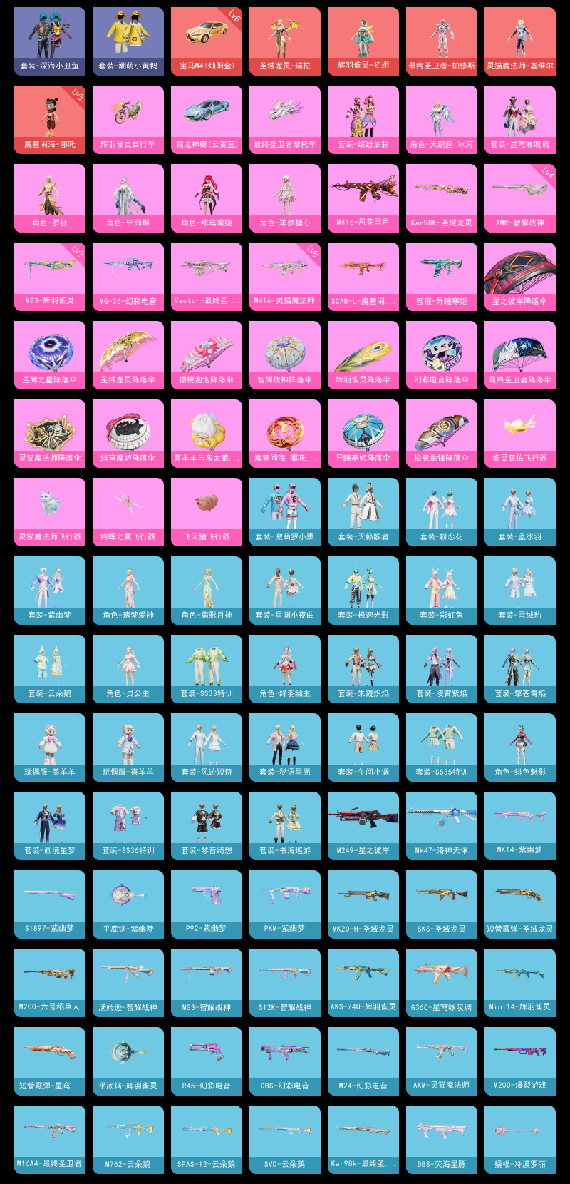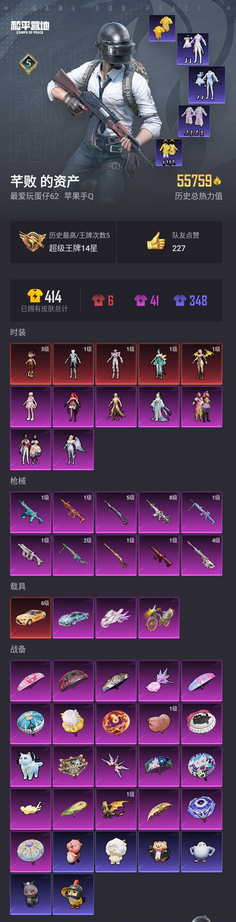 【和平精英】【lyhp20013】7粉装,10特效呛,4载具,历史最高段位:超级王牌14星 王牌印记5次 热力值:55759,64套装,103呛械,167装备,63战备;套装:辉羽雀灵-初翊,圣域龙灵-瑞拉,最终圣卫者-帕修斯,魔童闹海-哪吒,灵猫魔法师-塞维尔,套装-缤纷油彩,角色-绯穹魔姬,角色-天鹅座 冰河,角色-罗征,角色-宁雨蝶,套装-星穹咏叹调,角色-羊梦糖心,套装-白色伏地魔,套装-竞技名士,套装-长空猛禽,套装-旭日情侣,套装-深海小丑鱼,套装-缤纷果语,套装-破蛋小黄鸡,套装-激萌罗小黑,套装-潮萌小黄鸭,套装-天籁歌者,玩偶服-卖崽青蛙,套装-街头风暴,角色-绯色魅影,角色-无面战甲,套装-异域银装,角色-绛羽幽主,角色-瑰梦爱神,套装-紫幽梦,套装-粉恋花,套装-ss33特训,角色-猎影月神,套装-云朵鹅,套装-ss32特训,套装-彩虹兔,套装-蓝冰羽,套装-顶瓜瓜,套装-雪绒豹,套装-狂鲨锋刃,套装-大橘大利,套装-极速光影,角色-灵公主,套装-星渊小夜曲,套装-炫彩糖果,玩偶服-喜羊羊,玩偶服-美羊羊,套装-元气之梦,套装-ss34特训,套装-擎苍青焰,套装-朱霞炽焰,套装-凌霄紫焰,套装-薄荷星砂,套装-ss35特训,套装-午间小调,套装-秘语星愿,套装-风迹短诗,套装-琴音绮想,套装-画境星梦,套装-书海巡游,套装-阳光菠萝,套装-ss36特训,套装-雪国风尚,套装-萌鸡速递;呛皮:arx-凌霄紫焰,m762-云朵鹅,1级scar-l-魔童闹海 哪吒,scar-l-炫彩节奏,g36c-星穹咏叹调,aug-异域银装,aug-冰晶雪宝,1级m416-风花雪月,8级m416-灵猫魔法师,mk47-洛神天依,mk47-风迹短诗,akm-涂鸦街区,akm-玄冥寒域,akm-灵猫魔法师,akm-霓彩脉冲,groza-无面战甲,groza-荧海星豚,1级蜜獾-异瞳寒姬,蜜獾-绯穹魔姬,蜜獾-风迹短诗,蜜獾-乌木金纹,famas-乌木金纹,ace32-画境星梦,m16a4-最终圣卫者,4级amr-智耀战神,amr-喜羊羊与灰太狼,m200-六号稻草人,m200-爆裂游戏,m24-幻彩电音,1级kar98k-圣域龙灵,kar98k-最终圣卫者,win94-乌木金纹,svd-云朵鹅,莫辛纳甘-风迹短诗,mk12-风迹短诗,mk12-乌木金纹,m1加兰德-画境星梦,mini14-绯穹魔姬,mini14-辉羽雀灵,mk14-紫幽梦,m417-玩趣呆呆,mk20-h-圣域龙灵,mk20-h-狂鲨锋刃,sks-圣域龙灵,mp5k-画境星梦,ump45-海盐豹豹,ump45-极意拳锋,ump45-绿洲时空,野牛-最终圣卫者,汤姆逊-智耀战神,汤姆逊-灵猫魔法师,aks-74u-辉羽雀灵,aks-74u-乌木金纹,js9-凌霄紫焰,1级vect-最终圣卫者,uzi-炫彩糖果,s12k-智耀战神,s12k-霓彩脉冲,spas-12-狂鲨锋刃,spas-12-云朵鹅,aa12-g-画境星梦,dbs-幻彩电音,dbs-荧海星豚,dbs-风迹短诗,s1897-紫幽梦,m249-星之彼岸,m249-无面战甲,m249-绯穹魔姬,pkm-紫幽梦,1级mg-36-幻彩电音,mg-36-凌霄紫焰,mg-36-薄荷星砂,5级dp-28-豹影疾电,2级mg3-辉羽雀灵,mg3-幻世战舞者,mg3-智耀战神,mg3-霓彩脉冲,短管霰弹-圣域龙灵,短管霰弹-星穹咏叹调,信号呛-异瞳寒姬,沙墨之鹦-云朵鹅,p1911-无面战甲,电击呛-喜羊羊与灰太狼,p92-紫幽梦,p92-凌霄紫焰,r45-幻彩电音,平底锅-紫幽梦,平底锅-辉羽雀灵,平底锅-凌霄紫焰,平底锅-画境星梦,撬棍-冷漠罗丽,撬棍-灵猫魔法师,撬棍-火尖呛,大砍刀-云朵鹅,破片手留单-海盐豹豹,破片手留单-拽到爆炸,破片手留单-火尖莲影,爆炸猎弓-喜羊羊与灰太狼,燃点复合弓-火尖莲影,燃烧瓶-甜梦桃焰,十子怒-异瞳寒姬,十子怒-异域银装,铝热弹-炫彩糖果;载具:最终圣卫者摩托车,辉羽雀灵自行车,6级宝马m4灿阳金,霜龙神御云雾蓝;降落伞:雀灵庇佑飞行器,终晖之翼飞行器,灵猫魔法师飞行器,炫彩糖果飞行器,圣域金龙飞行器,飞天猪飞行器,异域银装飞行器,狂鲨锋刃飞行器,鸡智如我飞行器,登顶巅峰飞行器; 详情看图5红装7粉装10特效呛4载具 3级哪吒 1级孔雀 1级帕修斯 1级瑞拉 缤纷油彩 羊梦糖心 罗征 宁雨蝶 8级m4灵猫魔法师 1级死噶魔童闹海 2级孔雀mg3 满级宝马m4