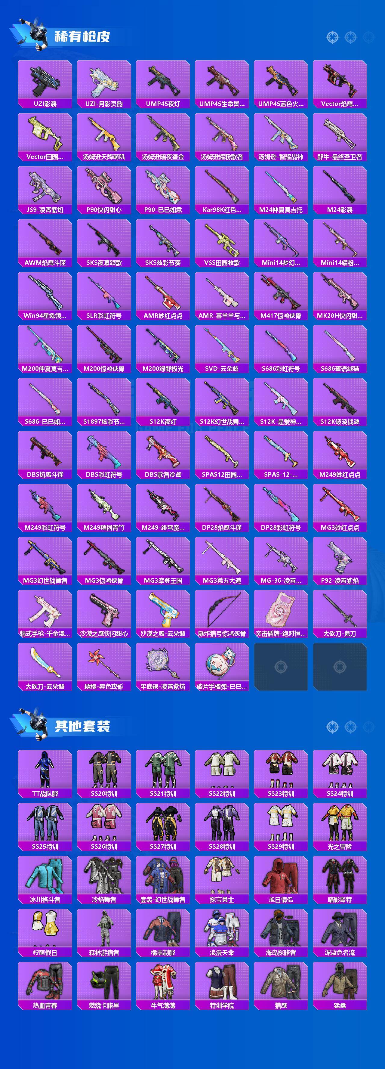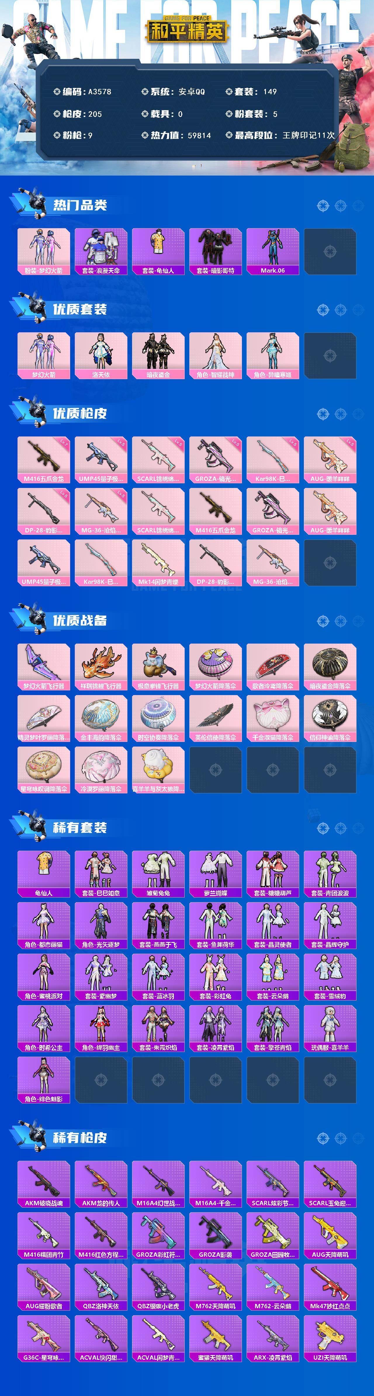 [15611297]安卓 【公主号 梦幻火箭/浪漫天命/暗影哥特/mark.06/洛天依/scar-l-锦绣绵绵五级】手q-5粉装-9特效呛-0载具-4粉色飞行器-59814热力值-11王牌印记-149套装-205呛皮 【热门品类】:粉装-梦幻火箭,套装-浪漫天命,套装-龟仙人,套装-暗影哥特,角色-mark.06 【粉色套装】:粉装-梦幻火箭,角色-洛天依,粉装-暗夜鎏金,角色-智耀战神,角色-异瞳寒姬 【粉色呛皮等级】:scar-l-锦绣绵绵五级,m416-五爪金龙七级,groza-镜光银凌五级,aug-暖羊咩咩五级,ump45-量子极限五级,kar98k-巳巳如意五级,dp-28-豹影疾电五级,mg-36-沧焰双生五级 【粉色呛皮】:scar-l-锦绣绵绵,m416-五爪金龙,groza-镜光银凌,aug-暖羊咩咩,ump45-量子极限,kar98k-巳巳如意,mk14-闲梦青缨,dp-28-豹影疾电,mg-36-沧焰双生 【粉色飞行器】:梦幻火箭飞行器,祥瑞锦鲤飞行器,极意拳锋飞行器 【粉色降落伞】:梦幻火箭降落伞,歌者泠鸢降落伞,暗夜鎏金降落伞,精灵梦叶罗丽降落伞,金丰海韵降落伞,时空协奏降落伞,英伦信使降落伞,千金淑猫降落伞,信仰神谕降落伞,星穹咏叹调降落伞,冷漠罗丽降落伞,喜羊羊与灰太狼降落伞,炫彩糖果降落伞 【稀有套装】:套装-龟仙人,套装-巳巳如意,套装-雪国风尚,套装-雏菊兔兔,套装-萝兰蝴蝶,套装-糖糖葫芦,套装-青团波波,角色-都市丽猫,角色-光矢逐梦,套装-燕燕于飞,套装-鱼渊荷华,套装-晶灵使者,套装-晶辉守护,角色-蜜桃派对,套装-紫幽梦,套装-蓝冰羽,套装-彩虹兔,套装-云朵鹅,套装-雪绒豹,角色-时希公主,角色-绛羽幽主,套装-朱霞炽焰,套装-凌霄紫焰,套装-擎苍青焰,玩偶服-喜羊羊,角色-绯色魅影,套装-炫彩糖果 【稀有呛皮】:akm-破晓战魂,akm-龙的传人,m16a4-幻世战舞者,m16a4-千金淑猫,scar-l-炫彩节奏,scar-l-玉兔迎春,m416-糯团青竹,m416-红色方程式,groza-彩虹符号,groza-影袭,groza-田园牧歌,aug-天降萌叽,aug-耀粉歌者,q-洛神天依,q-银碳小老虎,m762-天降萌叽,m762-云朵鹅,mk47-妙红点点,g36c-星穹咏叹调,ac