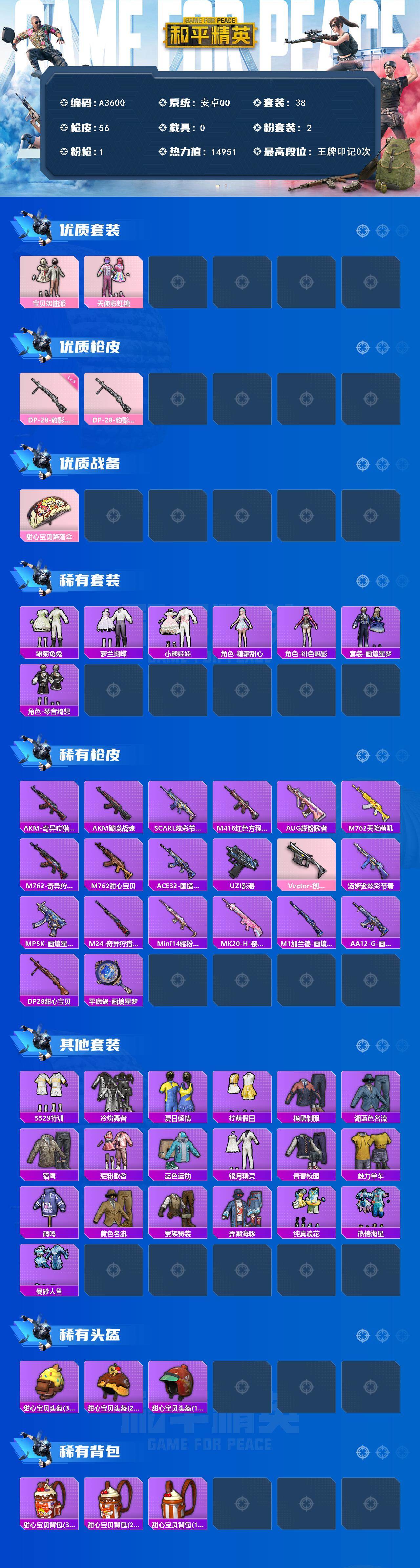 [15611695]安卓 【小号 宝贝奶油派/天使彩虹糖/dp-28-豹影疾电五级】手q-2粉装-1特效呛-0载具-1粉色飞行器-14951热力值-1王牌印记-38套装-56呛皮 【粉色套装】:粉装-宝贝奶油派,粉装-天使彩虹糖 【粉色呛皮等级】:dp-28-豹影疾电五级 【粉色呛皮】:dp-28-豹影疾电 【粉色降落伞】:甜心宝贝降落伞,炫彩糖果降落伞 【稀有套装】:套装-雏菊兔兔,套装-萝兰蝴蝶,套装-小熊娃娃,角色-糖霜甜心,角色-绯色魅影,套装-画境星梦,套装-琴音绮想,套装-炫彩糖果 【稀有呛皮】:akm-奇异狩猎者,akm-破晓战魂,scar-l-炫彩节奏,m416-红色方程式,aug-耀粉歌者,m762-天降萌叽,m762-奇异狩猎者,m762-甜心宝贝,ace32-画境星梦,uzi-影袭,vect-创世·救赎,汤姆逊-炫彩节奏,mp5k-画境星梦,m24-奇异狩猎者,mini14-耀粉歌者,mk20-h-樱桃泡泡,m1加兰德-画境星梦,aa12-g-画境星梦,dp-28-甜心宝贝,平底锅-画境星梦 【其他套装】:套装-ss29特训,套装-冷焰舞者,套装-夏日倾情,套装-柠萌假日,套装-橘黑制服,套装-湖蓝色名流,套装-猎鹰,套装-耀粉歌者,套装-蓝色运动,套装-银月精灵,套装-青春校园,套装-魅力单车,套装-鹤鸣,套装-黄色名流,套装-贵族骑装,套装-弄潮海豚,套装-纯真浪花,套装-热情海星,套装-曼妙人鱼 【稀有头盔】:甜心宝贝头盔3级,甜心宝贝头盔2级,甜心宝贝头盔1级 【稀有背包】:甜心宝贝背包3级,甜心宝贝背包2级,甜心宝贝背包1级 【营地id】:973631564