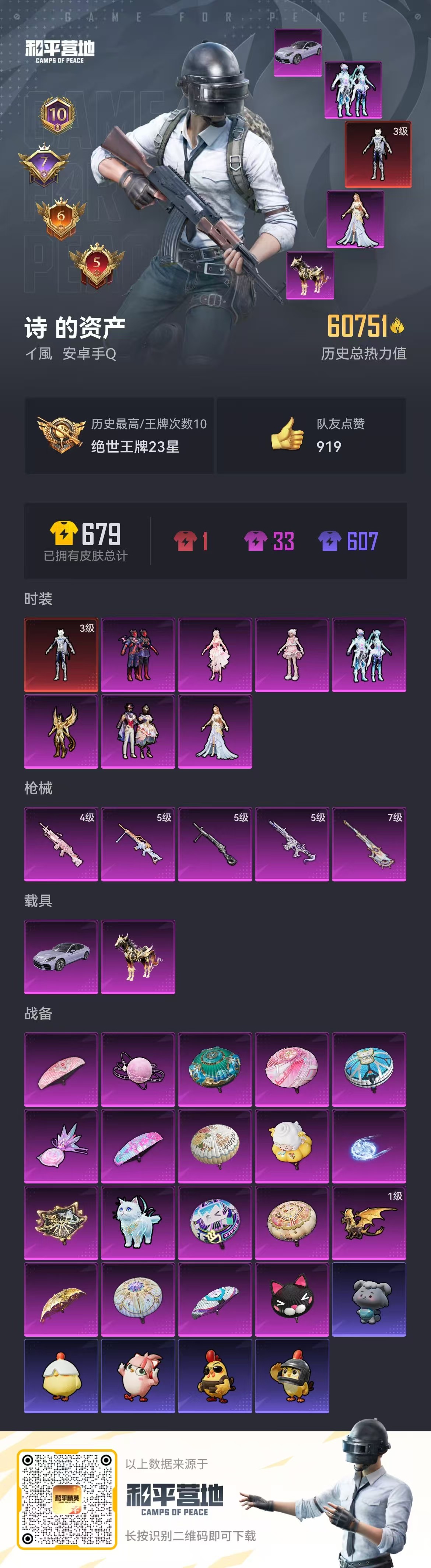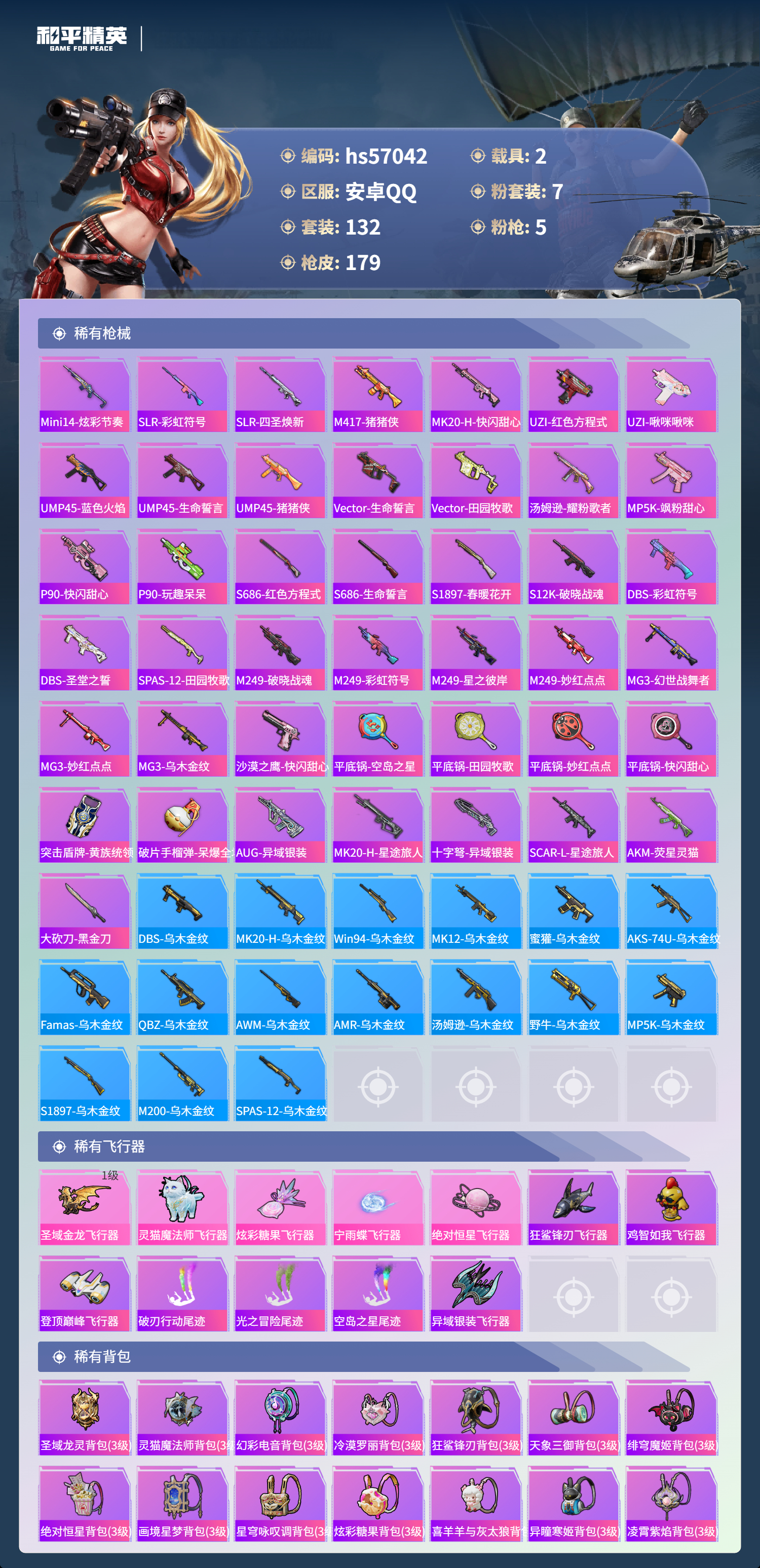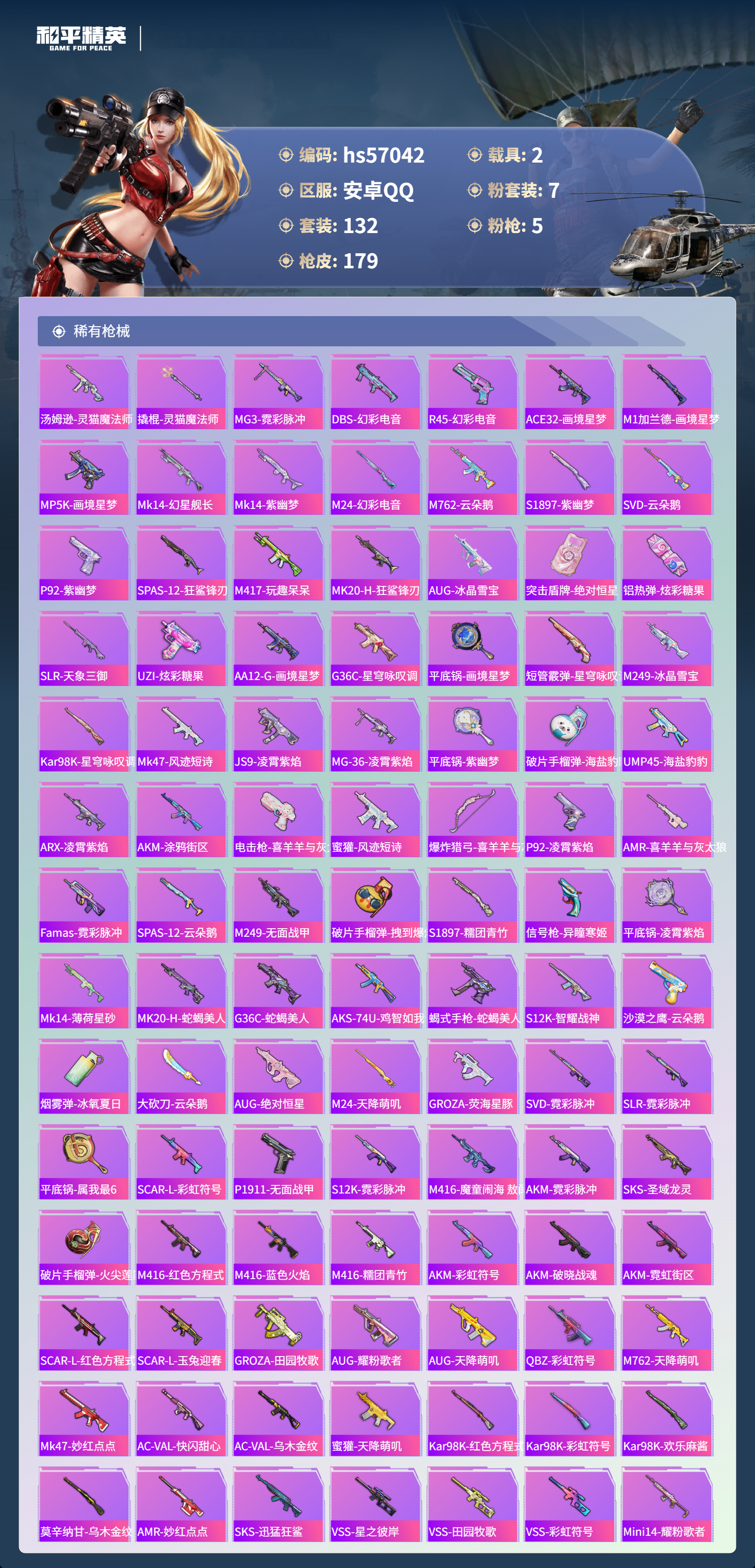 hs57042 安卓手q-10王牌印记-1红装-7粉装-5特效呛-2载具-60799热力值-132套装-179呛皮-7卓越印记-6传奇印记【1红装】灵猫魔法师-塞维尔/3级【7粉装】套装-星之彼岸角色-羊梦糖心套装-星穹咏叹调角色-绝对恒星角色-智耀战神角色-凤凰座 一辉套装-幻彩电音【5特效呛】m249-绝对恒星/4级mg-36-沧焰双生/5级dp-28-豹影疾电/5级a