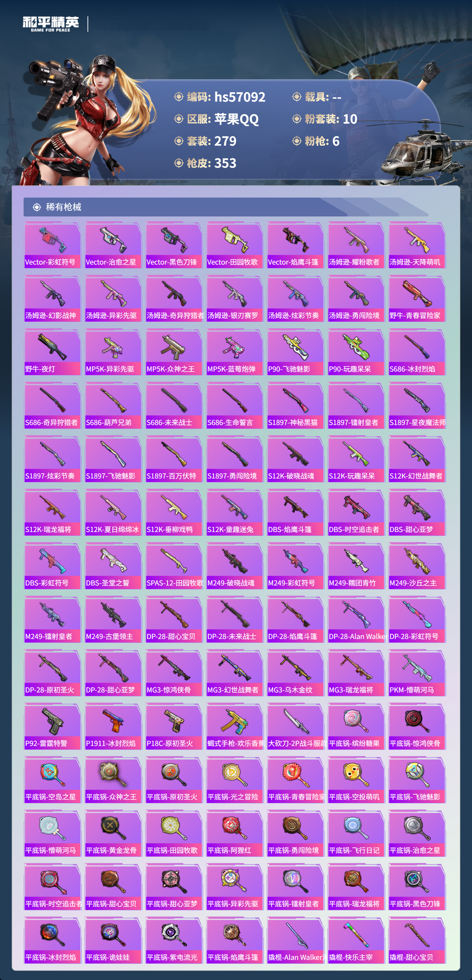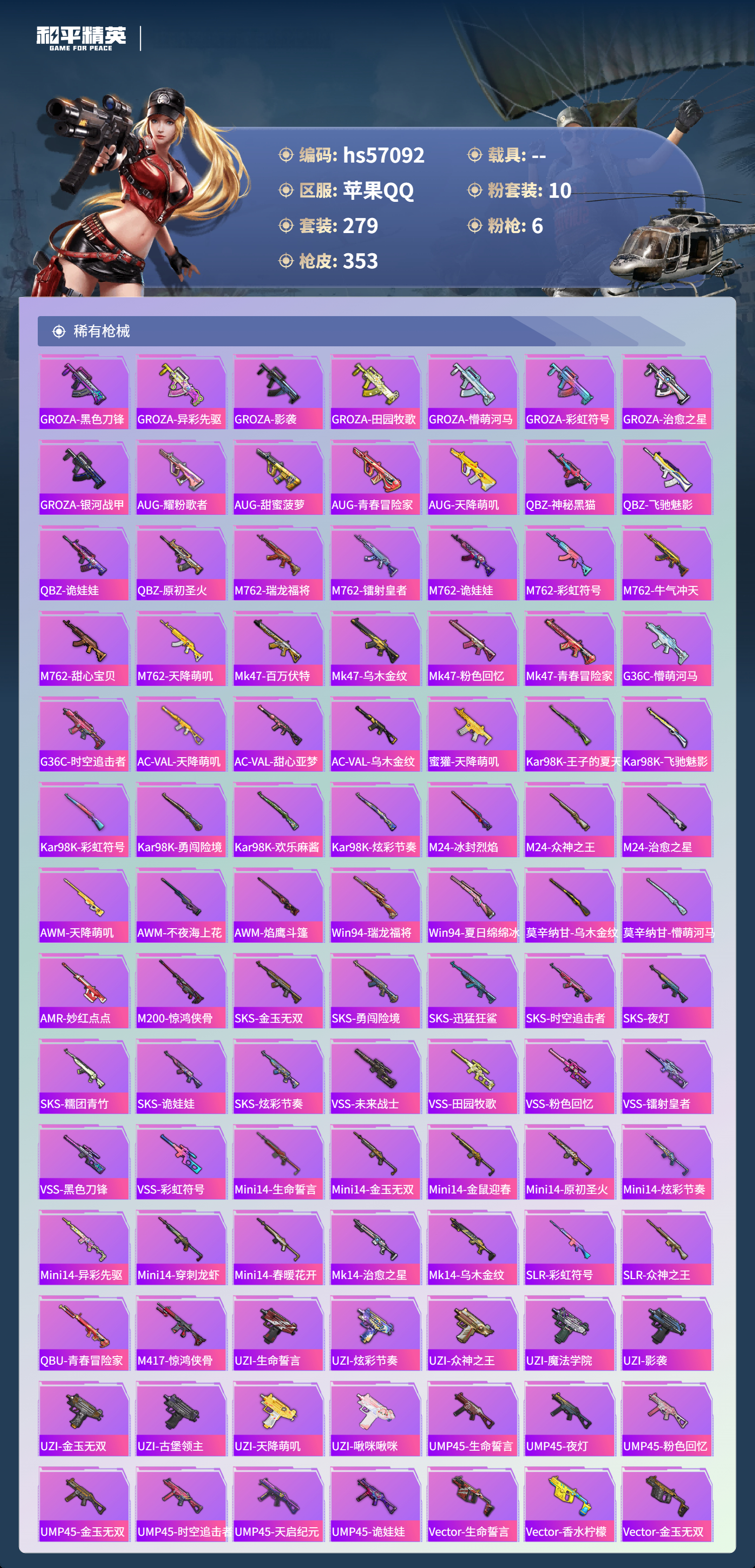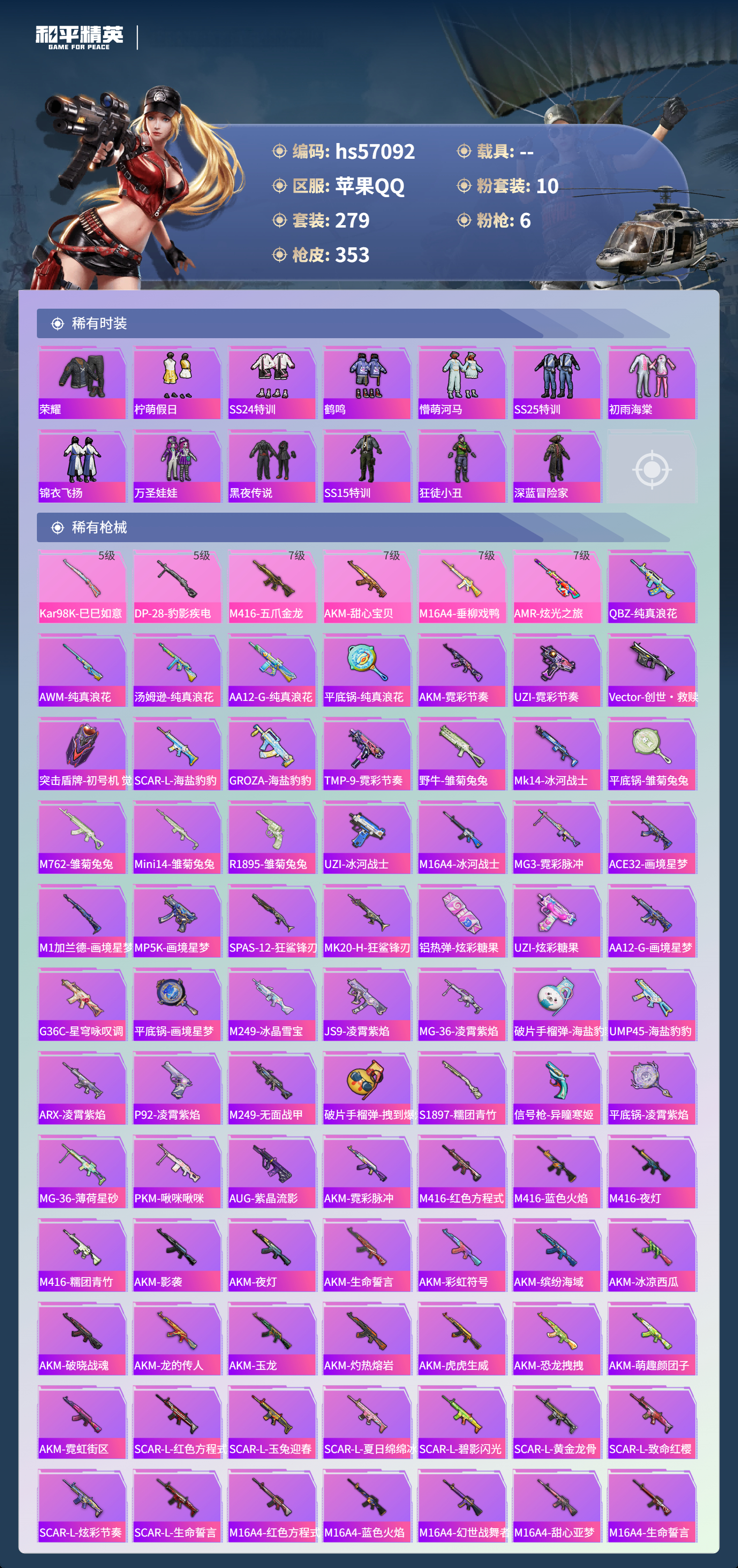 hs57092 苹果手q-19王牌印记-10粉装-6特效呛-热力值-279套装-353呛皮-2卓越印记-1传奇印记【10粉装】套装-未来战士套装-彩虹鹿灵套装-草莓生巧套装-海渊国主套装-幻影战神角色-荧海星豚套装-梦幻火箭套装-天使彩虹糖套装-甜心巧克力套装-宝贝奶油派【6特效呛】akm-甜心宝贝/7级m416-五爪金龙/7级dp-28-豹影疾电/5级m1