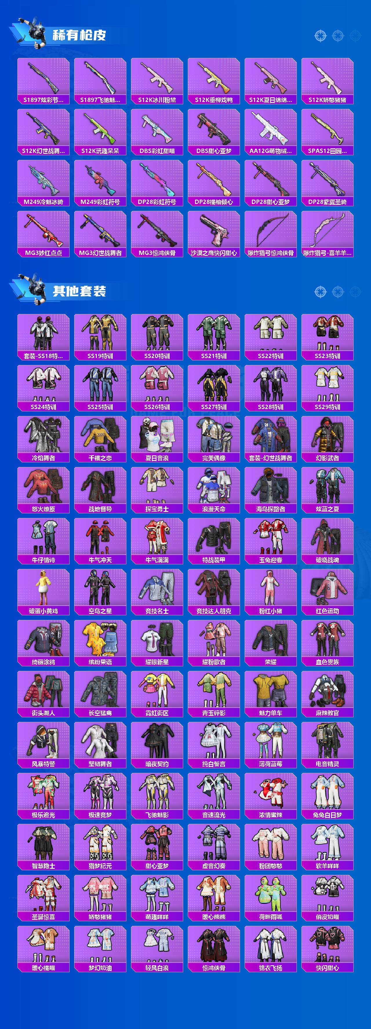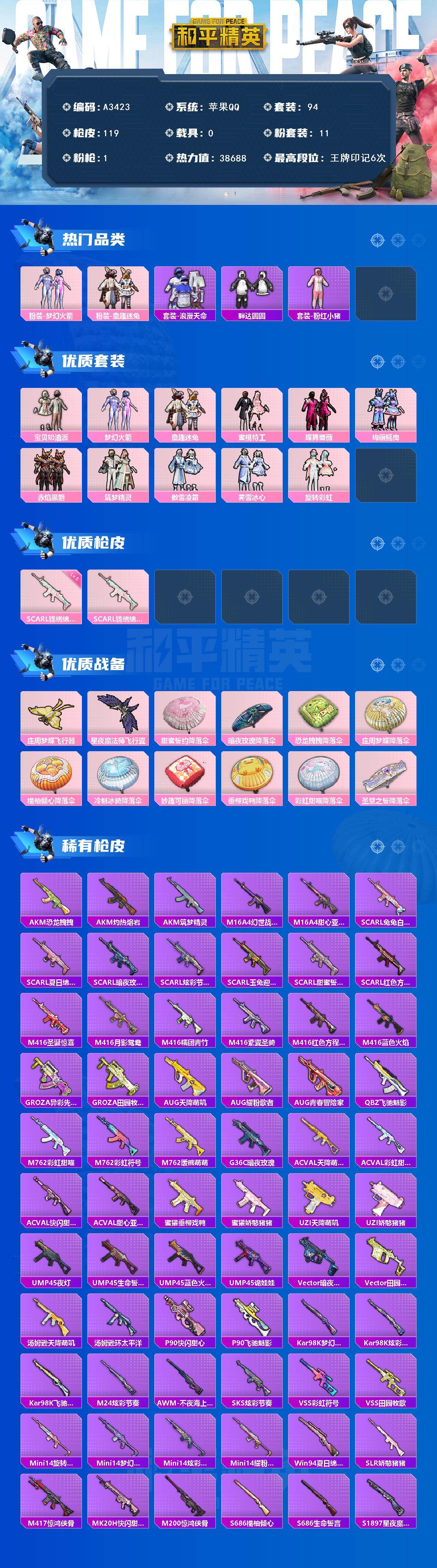 [15620985]苹果【小号/梦幻火箭】 手q-11粉装-1特效呛-0载具-2粉色飞行器-38688热力值-6王牌印记-94套装-119呛皮 【热门品类】:粉装-梦幻火箭,粉装-童趣迷兔,套装-浪漫天命,套装-胖达圆圆,套装-粉红小猪 【粉色套装】:粉装-宝贝奶油派,粉装-梦幻火箭,粉装-童趣迷兔,粉装-蜜桃特工,粉装-蝶舞蔷薇,粉装-绚丽摇曳,粉装-赤焰黑爵,粉装-筑梦精灵,粉装-傲雪凌霜,粉装-霁雪冰心,粉装-旋转彩虹 【粉色呛皮等级】:scar-l-锦绣绵绵五级 【粉色呛皮】:scar-l-锦绣绵绵 【粉色飞行器】:庄周梦蝶飞行器,星夜魔法师飞行翼 【粉色降落伞】:甜蜜誓约降落伞,暗夜玫瑰降落伞,恐龙拽拽降落伞,庄周梦蝶降落伞,橘柚倾心降落伞,冷魅冰骑降落伞,妙趣可丽降落伞,垂柳戏鸭降落伞,彩虹甜喵降落伞,圣堂之誓降落伞 【稀有呛皮】:akm-恐龙拽拽,akm-灼热熔岩,akm-筑梦精灵,m16a4-幻世战舞者,m16a4-甜心亚梦,scar-l-兔兔白日梦,scar-l-夏日绵绵冰,scar-l-暗夜玫瑰,scar-l-炫彩节奏,scar-l-玉兔迎春,scar-l-甜蜜誓约,scar-l-红色方程式,m416-圣诞惊喜,m416-月影鸳鸯,m416-糯团青竹,m416-紫翼圣骑,m416-红色方程式,m416-蓝色火焰,groza-异彩先驱,groza-田园牧歌,aug-天降萌叽,aug-耀粉歌者,aug-青春冒险家,q-飞驰魅影,m762-彩虹甜喵,m762-彩虹符号,m762-暖熊萌萌,g36c-暗夜玫瑰,ac-val-天降萌叽,ac-val-彩虹甜喵,ac-val-快闪甜心,ac-val-甜心亚梦,蜜獾-垂柳戏鸭,蜜獾-娇憨猪猪,uzi-天降萌叽,uzi-娇憨猪猪,ump45-夜灯,ump45-生命誓言,ump45-蓝色火焰,ump45-诡娃娃,vect-暗夜玫瑰,vect-田园牧歌,汤姆逊-天降萌叽,汤姆逊-环太平洋,p90-快闪甜心,p90-飞驰魅影,kar98k-梦幻火箭,kar98k-炫彩节奏,kar98k-飞驰魅影,m24-炫彩节奏,awm-不夜海上花,sks-炫彩节奏,vss-彩虹符号,vss-田园牧歌,mini14-旋转彩虹,mini14-梦幻火箭,mini14-炫彩节奏,mini14-耀粉歌者,win94-夏日绵绵冰,slr-娇憨猪猪