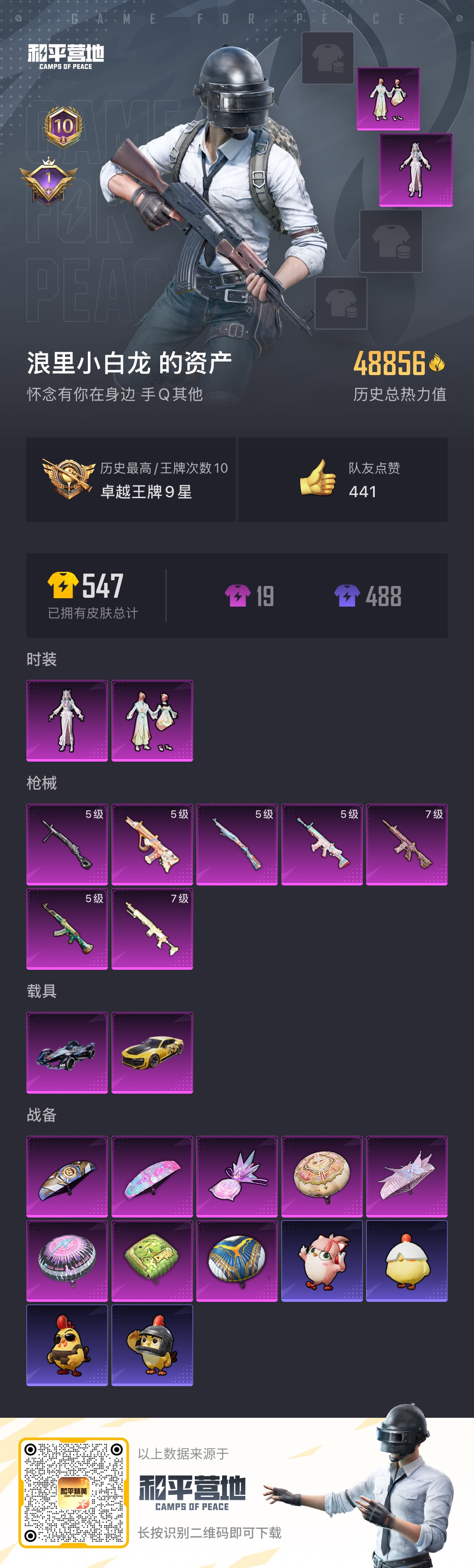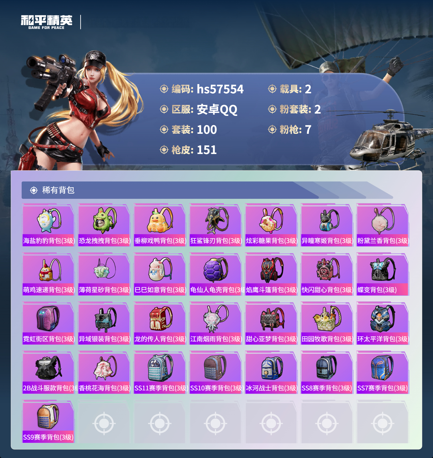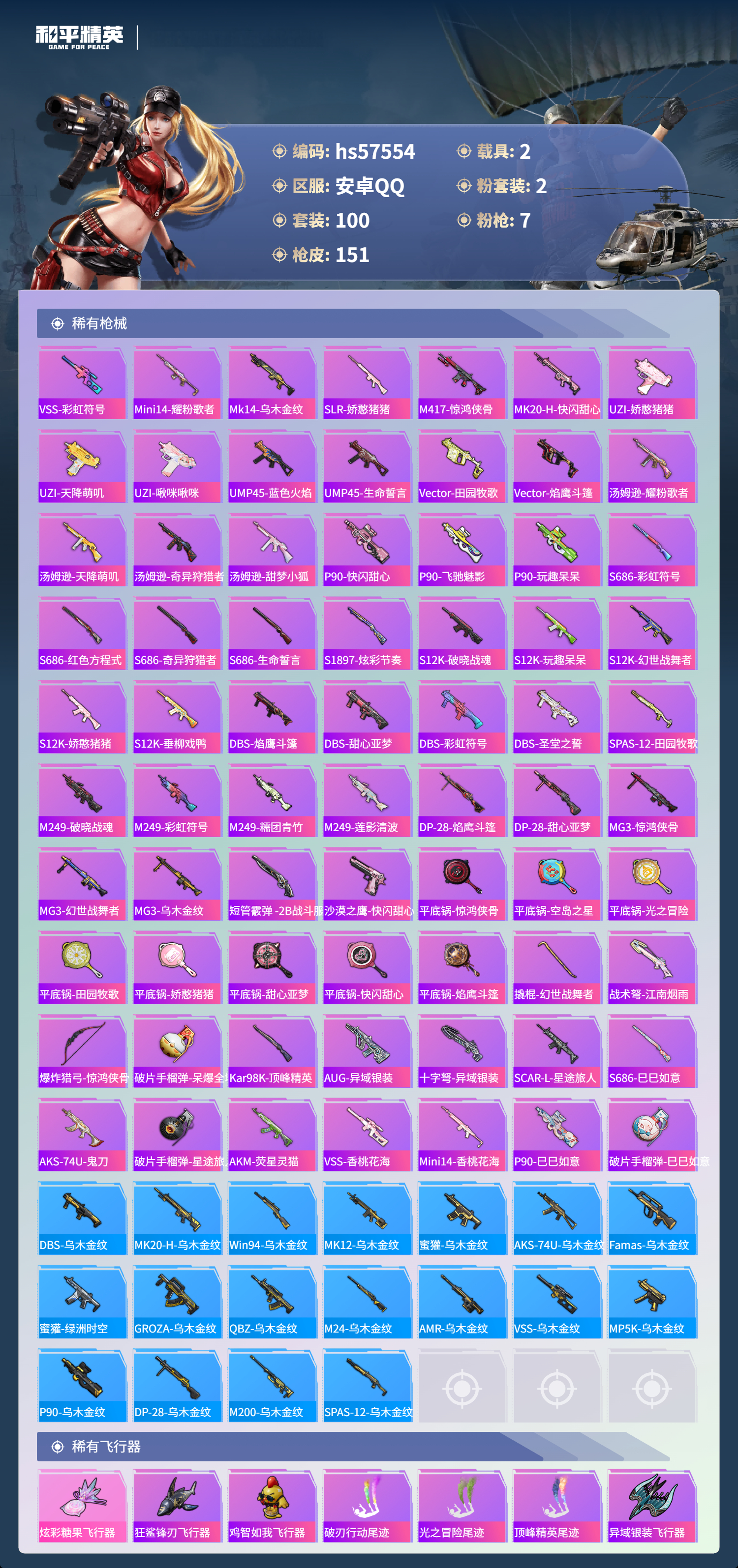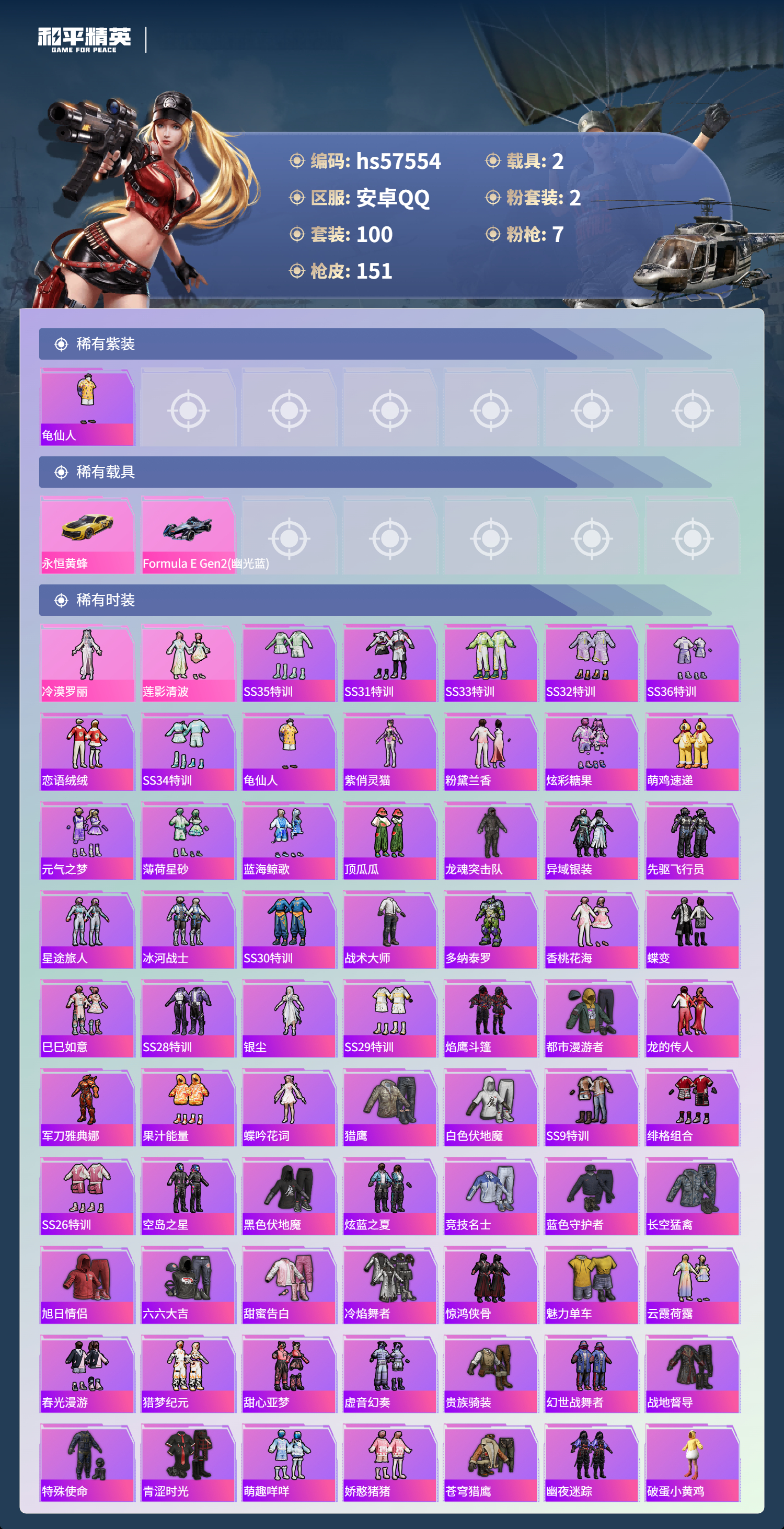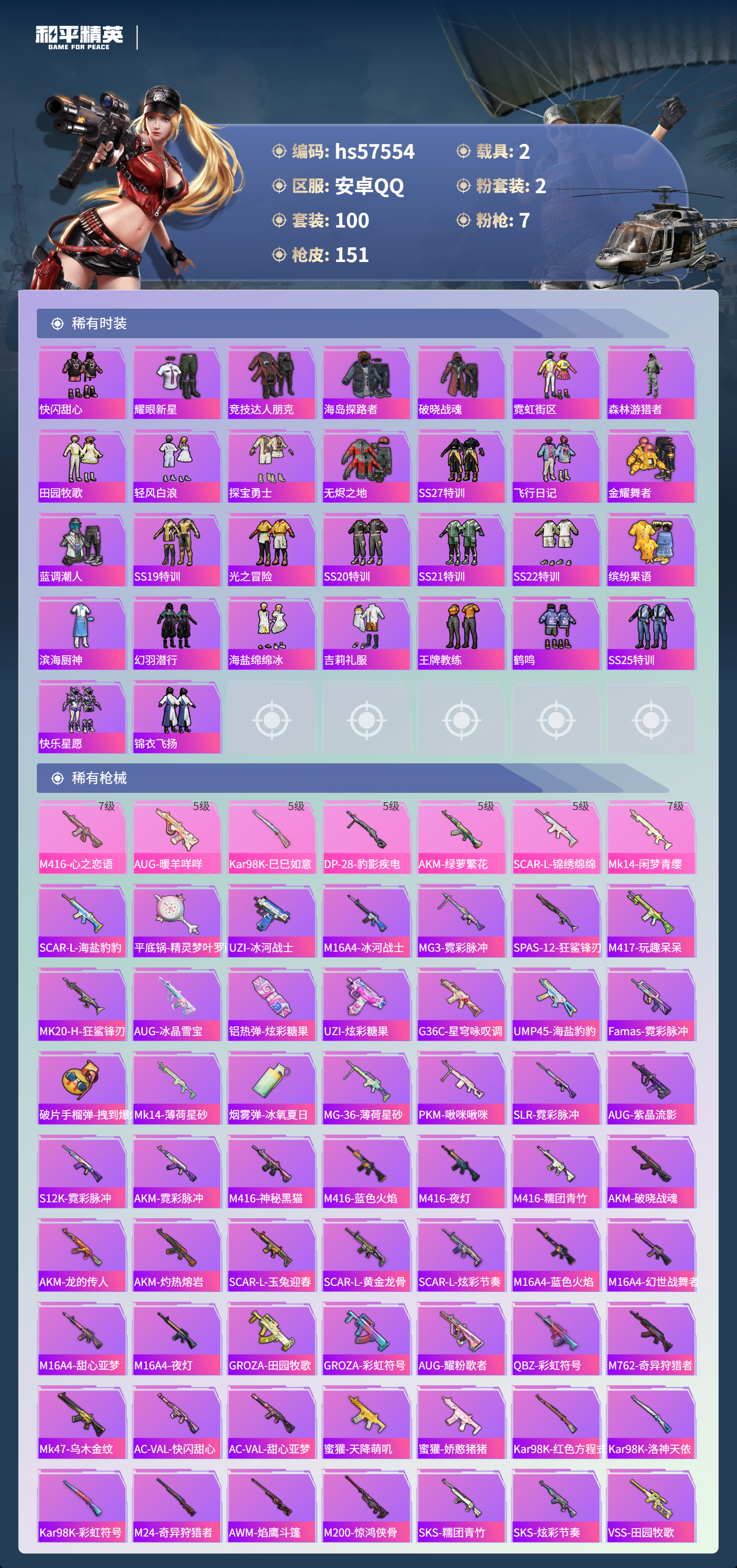 hs57554 安卓手q-10王牌印记-2粉装-7特效呛-2载具-48856热力值-100套装-151呛皮-1卓越印记【2粉装】套装-莲影清波角色-冷漠罗丽【7特效呛】scar-l-锦绣绵绵/5级akm-绿萝繁花/5级kar98k-巳巳如意/5级dp-28-豹影疾电/5级m416-心之恋语/7级mk14-闲梦青缨/7级aug-暖羊咩咩/5级【1稀有紫装】龟仙人【2稀有载具】