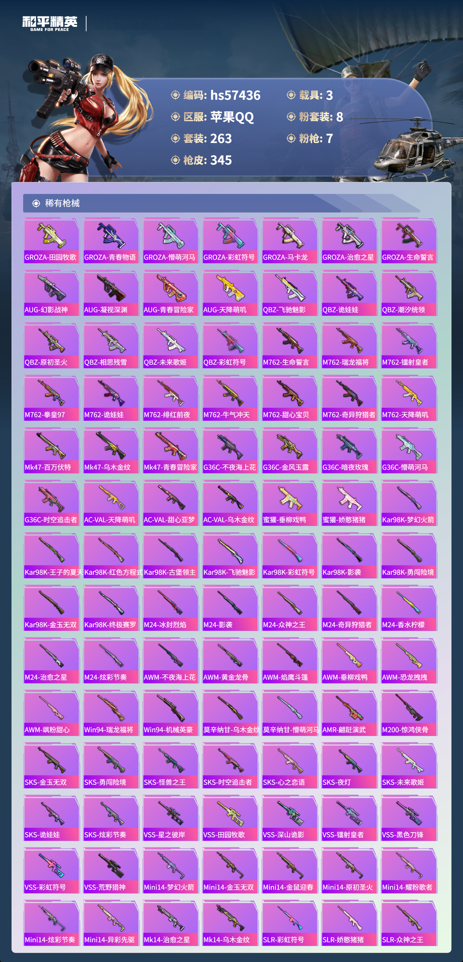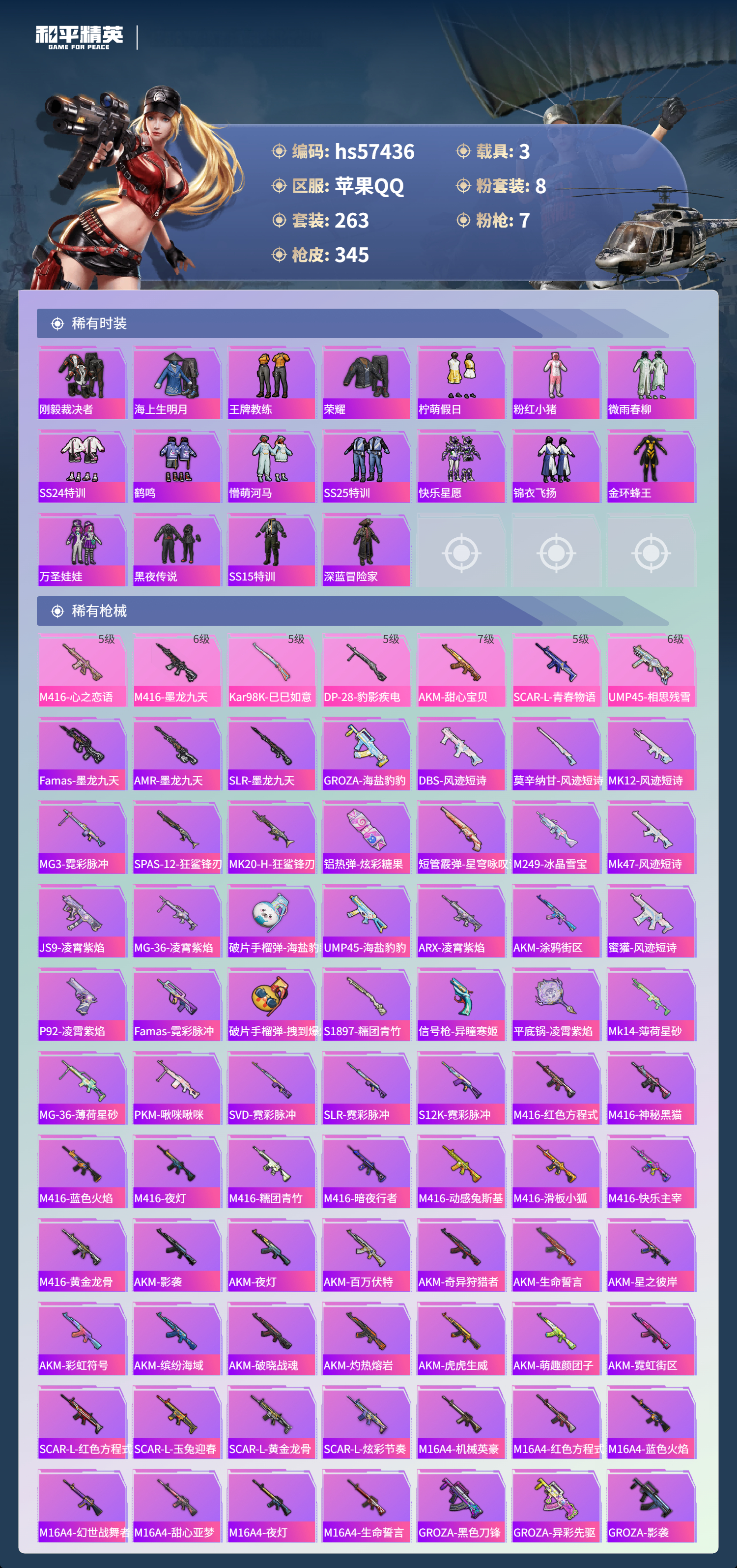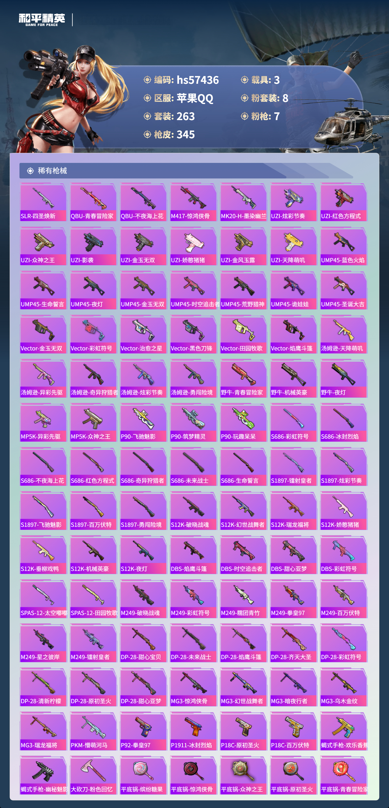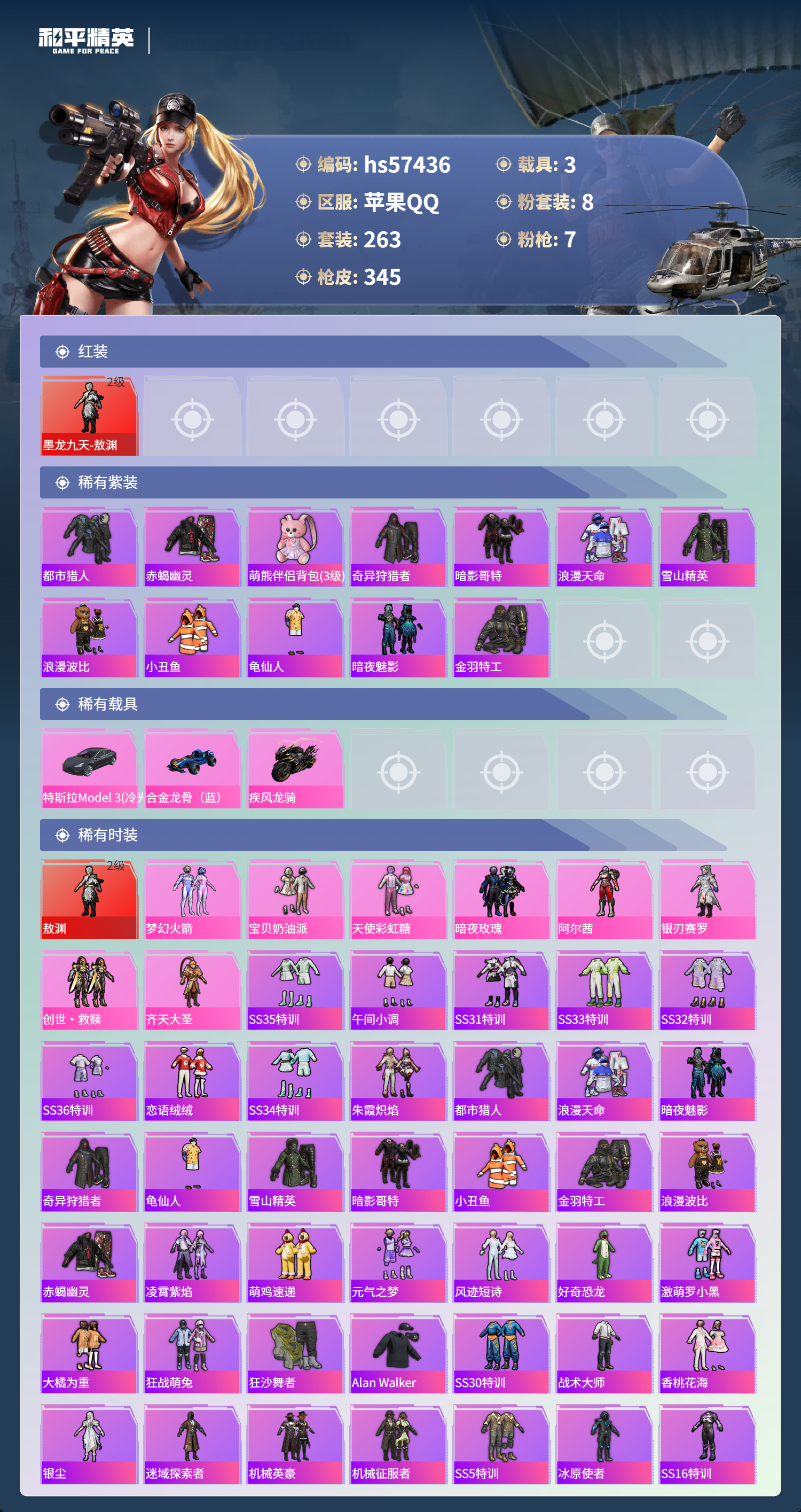 hs57436 苹果手q-15王牌印记-1红装-8粉装-7特效呛-3载具-热力值-263套装-345呛皮-2卓越印记【1红装】墨龙九天-敖渊/2级【8粉装】套装-创世·救赎套装-天使彩虹糖套装-梦幻火箭角色-阿尔茜套装-暗夜玫瑰套装-银刃赛罗套装-宝贝奶油派套装-齐天大圣【7特效呛】m416-墨龙九天/6级m416-心之恋语/5级dp-28-豹影疾电/5级a