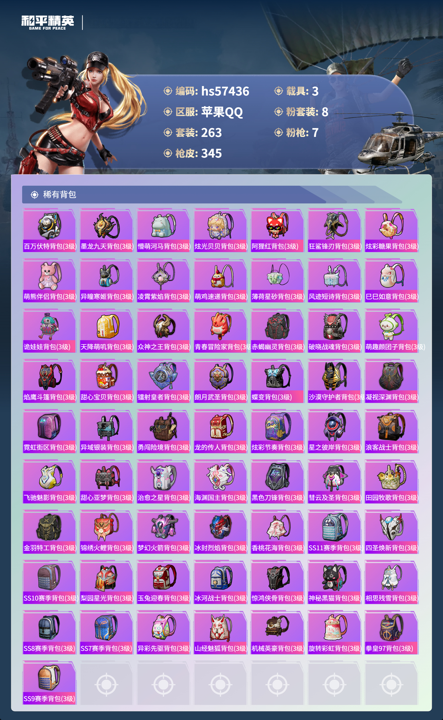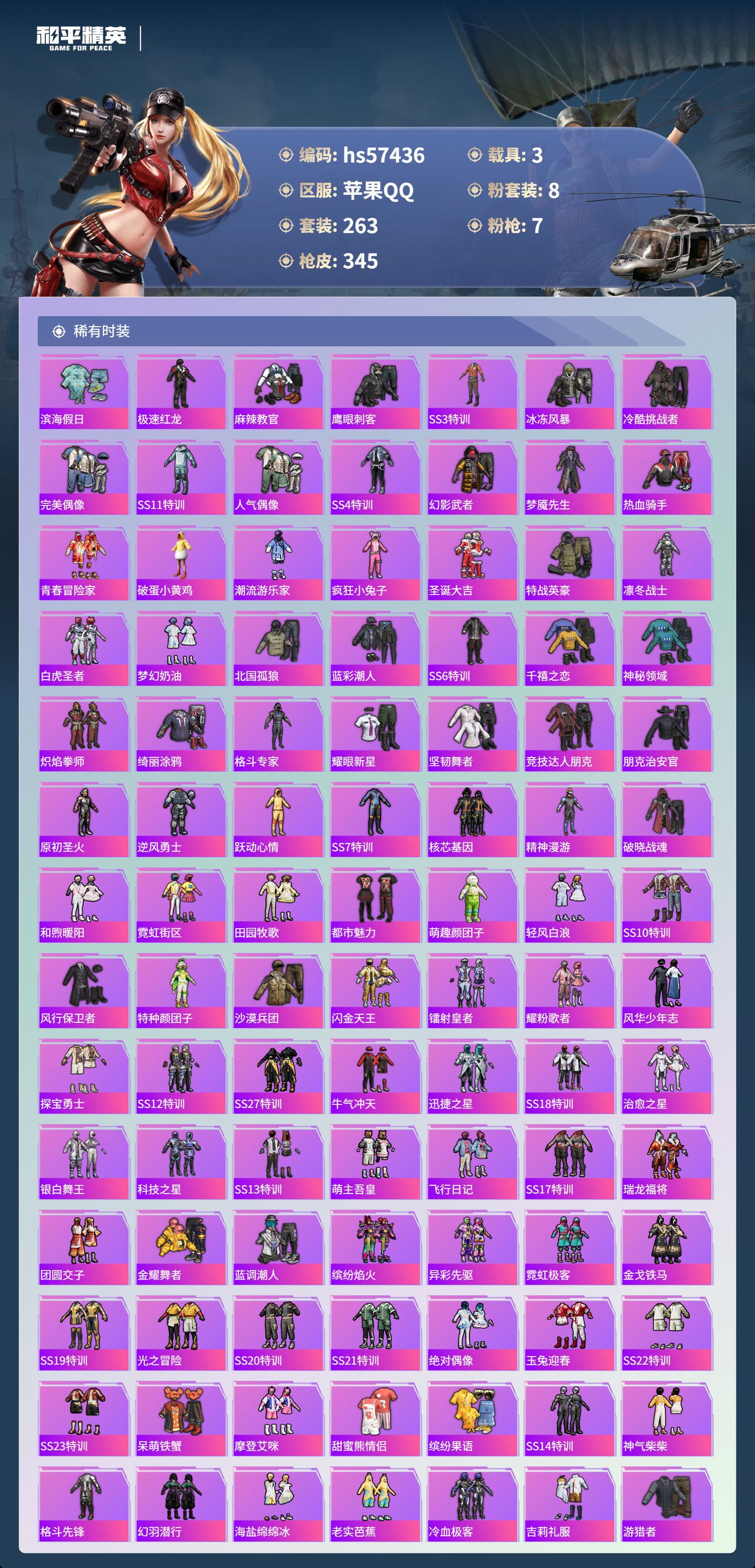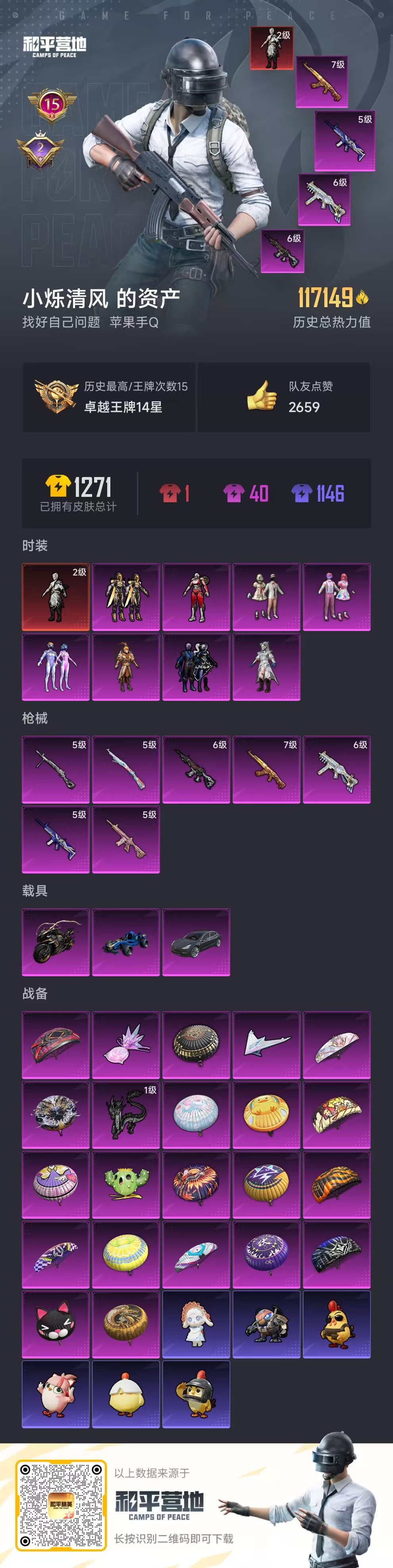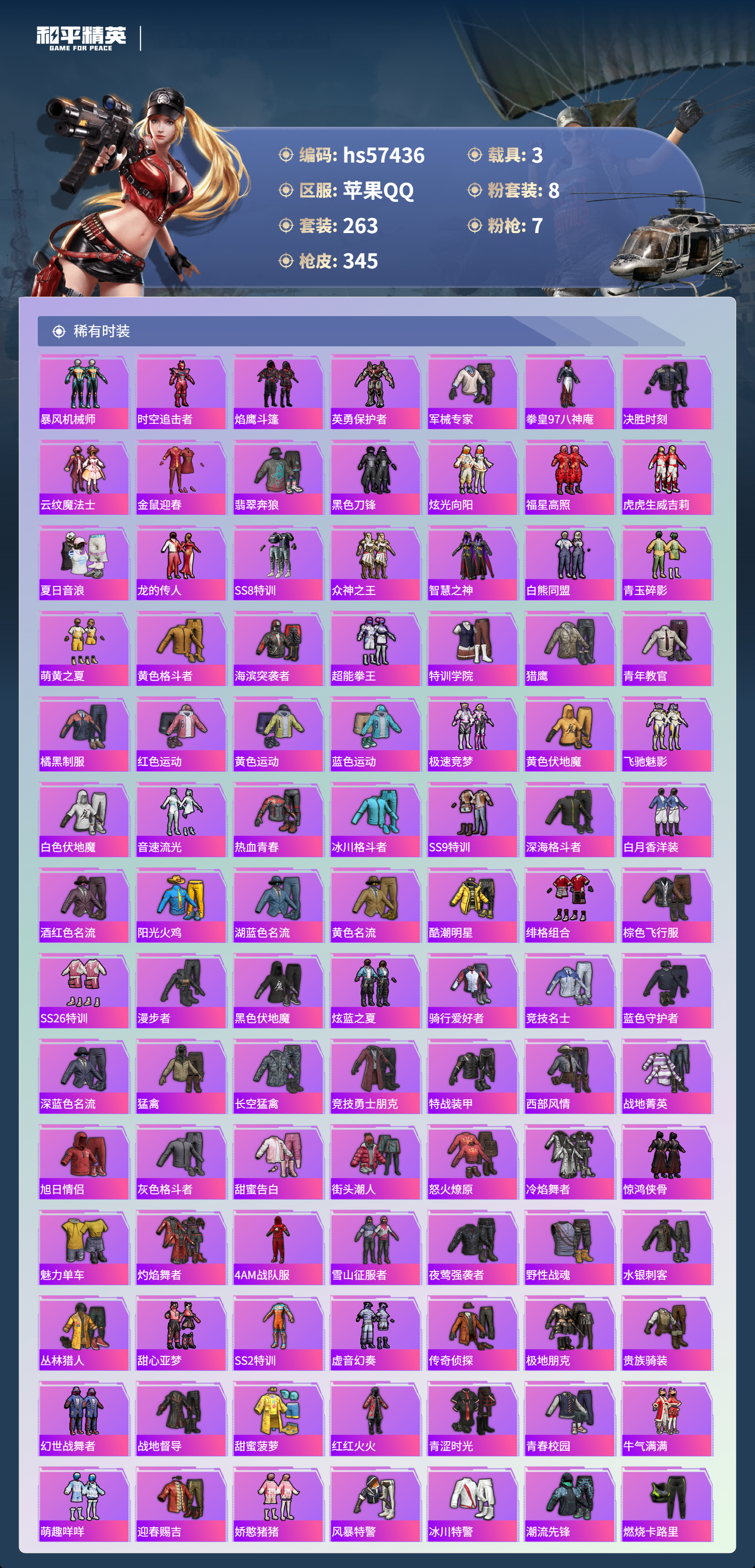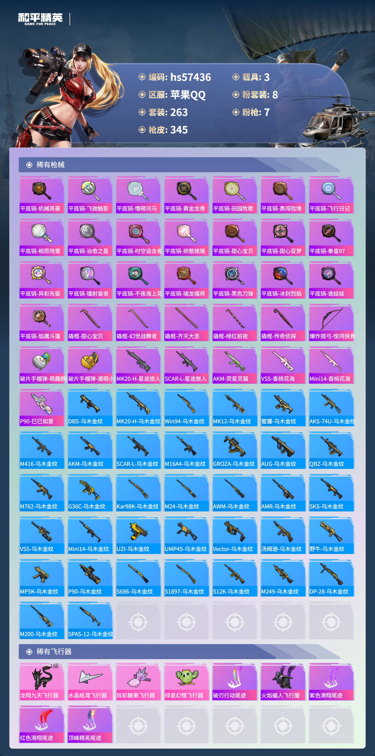 hs57436 苹果手q-15王牌印记-1红装-8粉装-7特效呛-3载具-热力值-263套装-345呛皮-2卓越印记【1红装】墨龙九天-敖渊/2级【8粉装】套装-创世·救赎套装-天使彩虹糖套装-梦幻火箭角色-阿尔茜套装-暗夜玫瑰套装-银刃赛罗套装-宝贝奶油派套装-齐天大圣【7特效呛】m416-墨龙九天/6级m416-心之恋语/5级dp-28-豹影疾电/5级a