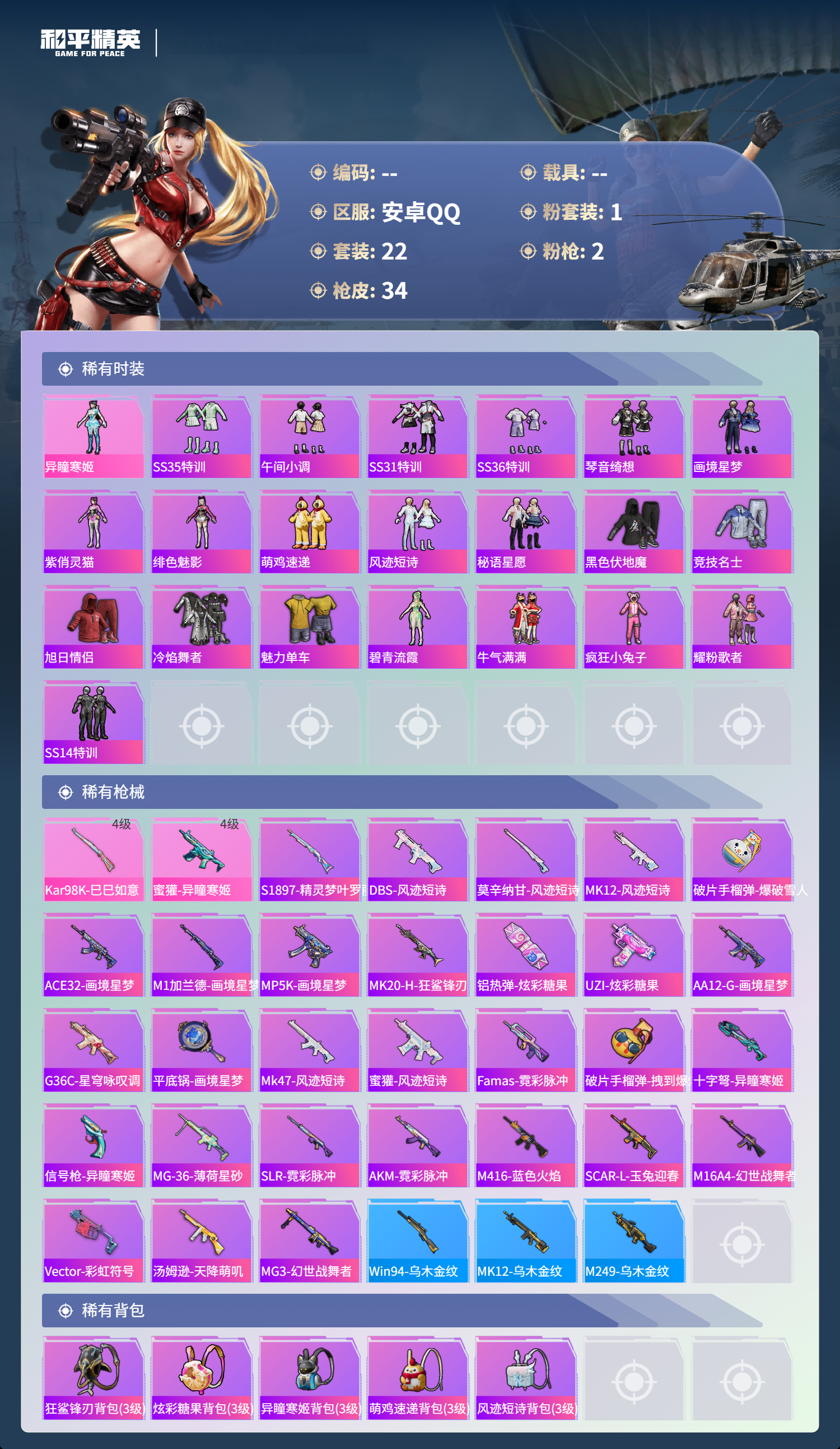 hs57437 安卓手q-0王牌印记-1粉装-2特效呛-9289热力值-22套装-34呛皮【1粉装】角色-异瞳寒姬【2特效呛】蜜獾-异瞳寒姬/4级kar98k-巳巳如意/4级【22稀有时装】异瞳寒姬ss35特训午间小调ss31特训ss36特训琴音绮想画境星梦紫俏灵猫绯色魅影萌鸡速递风迹短诗秘语星愿黑色伏地魔竞技名士旭日情侣冷焰舞者魅力单车碧青流霞牛气满