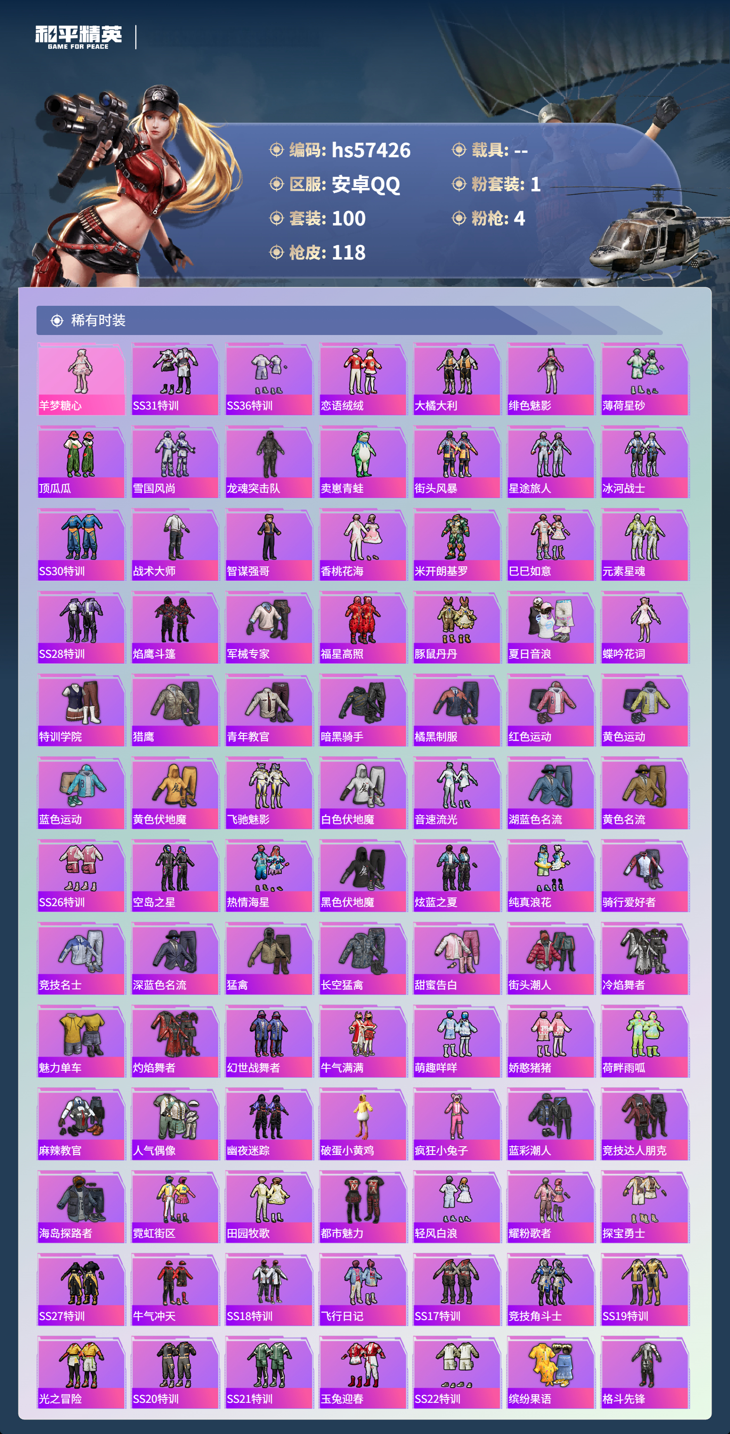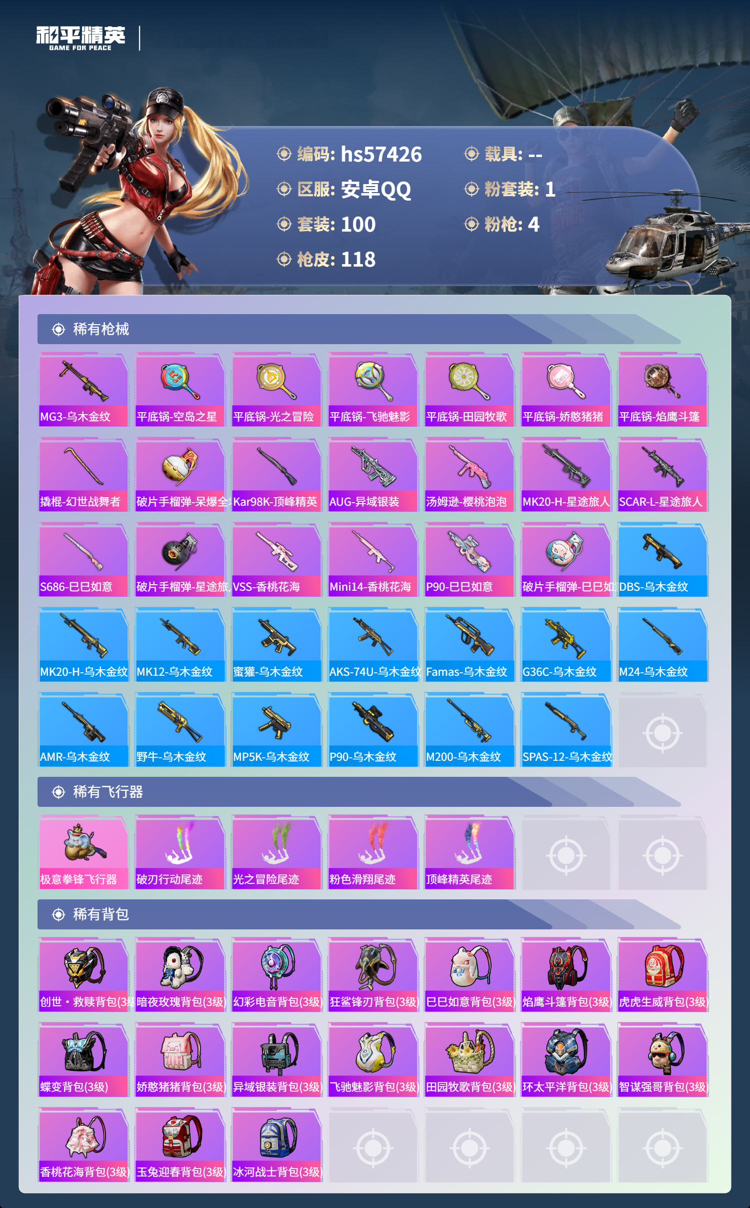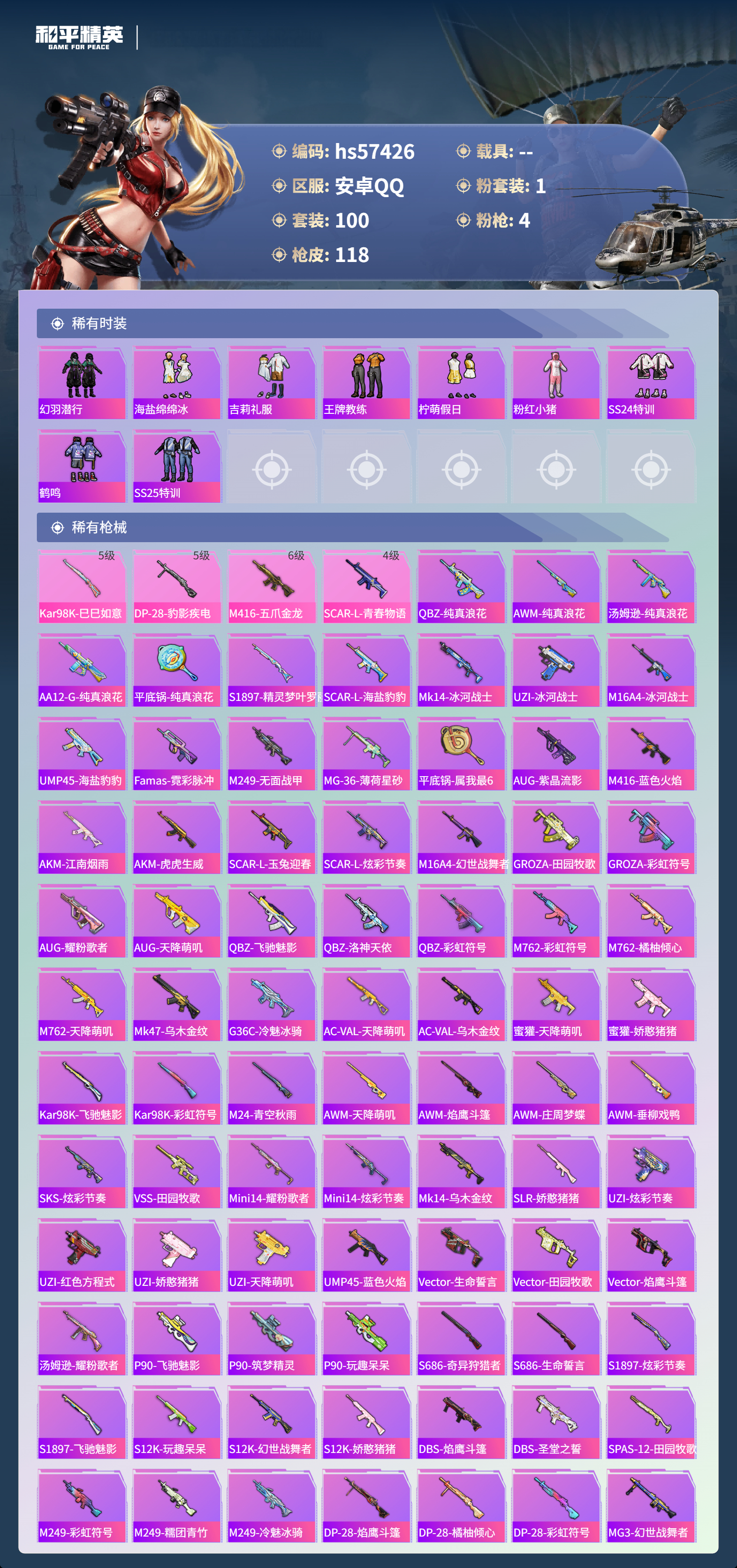 hs57426 安卓手q-4王牌印记-1粉装-4特效呛-35767热力值-100套装-118呛皮【1粉装】角色-羊梦糖心【4特效呛】m416-五爪金龙/6级kar98k-巳巳如意/5级dp-28-豹影疾电/5级scar-l-青春物语/4级【100稀有时装】羊梦糖心ss31特训ss36特训恋语绒绒大橘大利绯色魅影薄荷星砂顶瓜瓜雪国风尚龙魂突击队卖崽青蛙街头风暴星