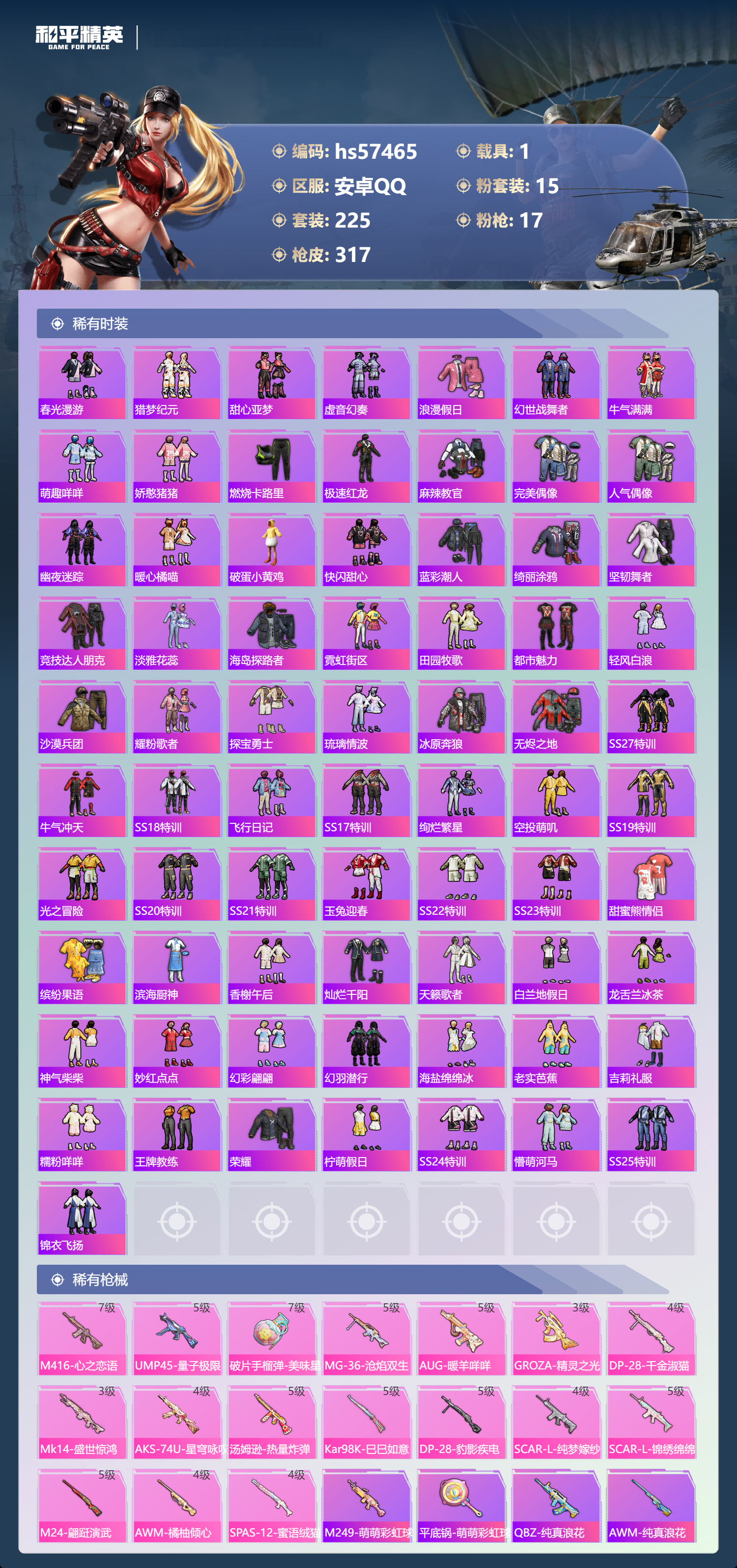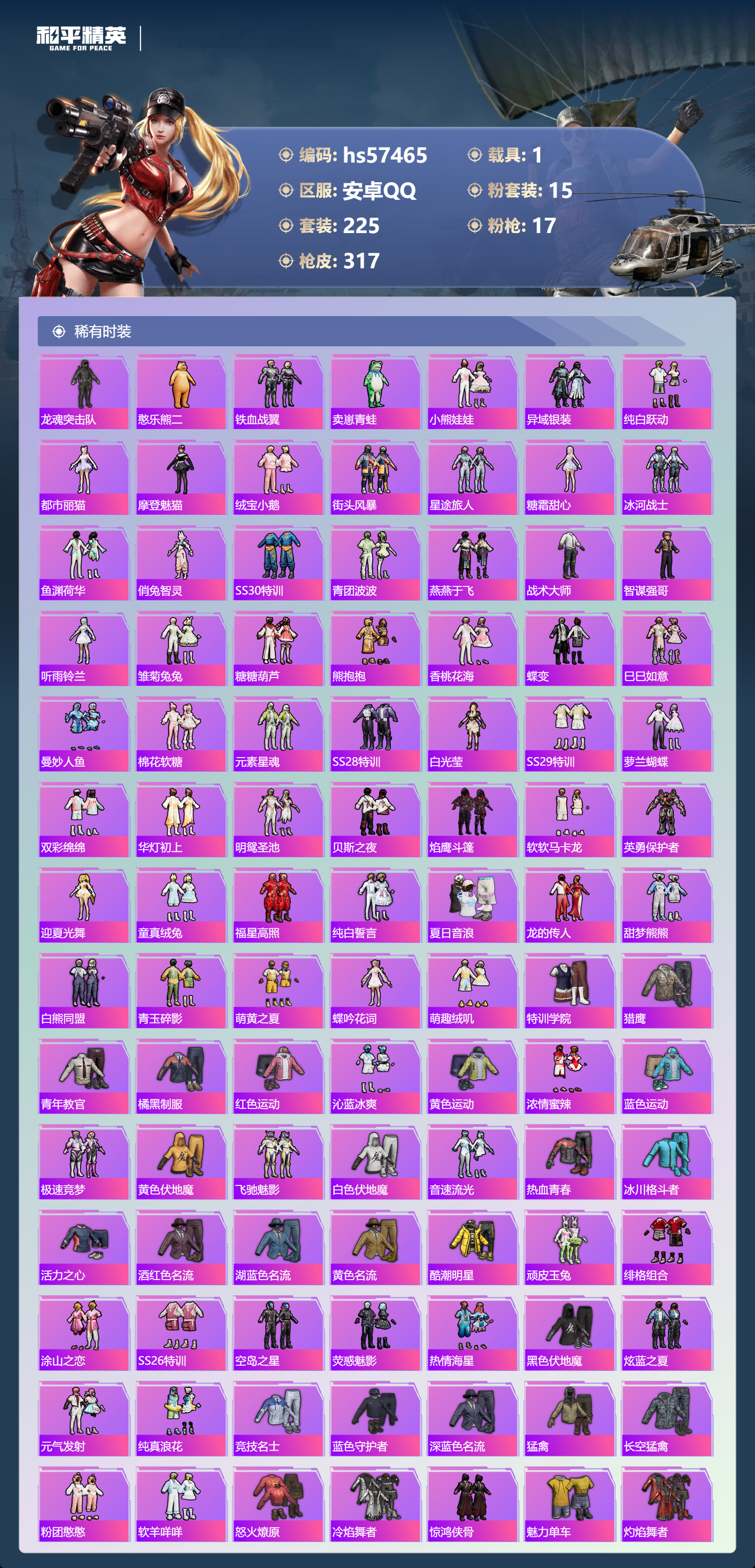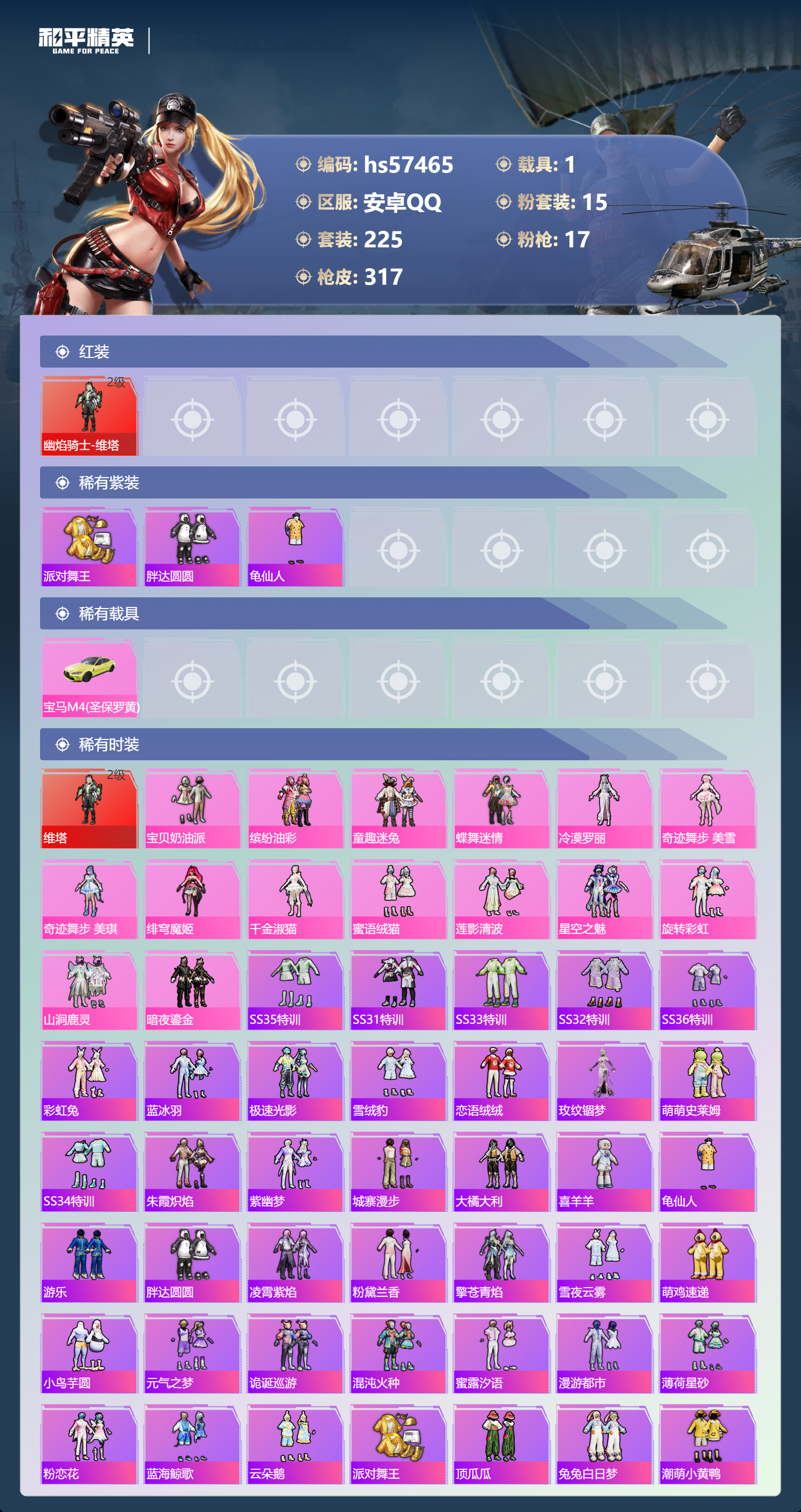 hs57465 安卓手q-17王牌印记-1红装-15粉装-17特效呛-1载具-热力值-225套装-317呛皮-10卓越印记-2传奇印记【1红装】幽焰骑士-维塔/2级【15粉装】套装-缤纷油彩角色-冷漠罗丽套装-童趣迷兔套装-旋转彩虹角色-奇迹舞步 美琪套装-蝶舞迷情套装-暗夜鎏金套装-山涧鹿灵角色-千金淑猫角色-绯穹魔姬套装-宝贝奶油派角色-奇迹舞步 美雪套