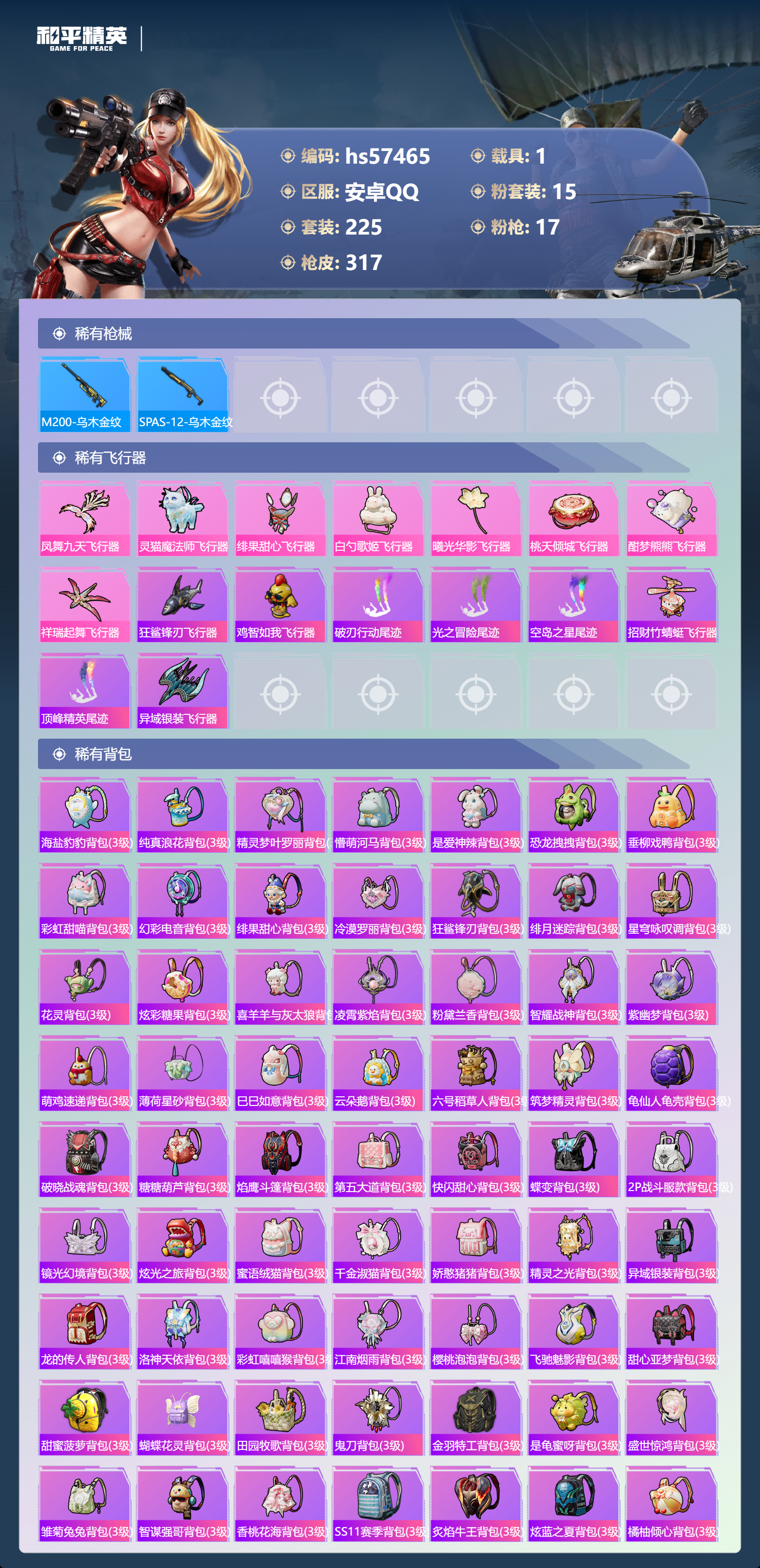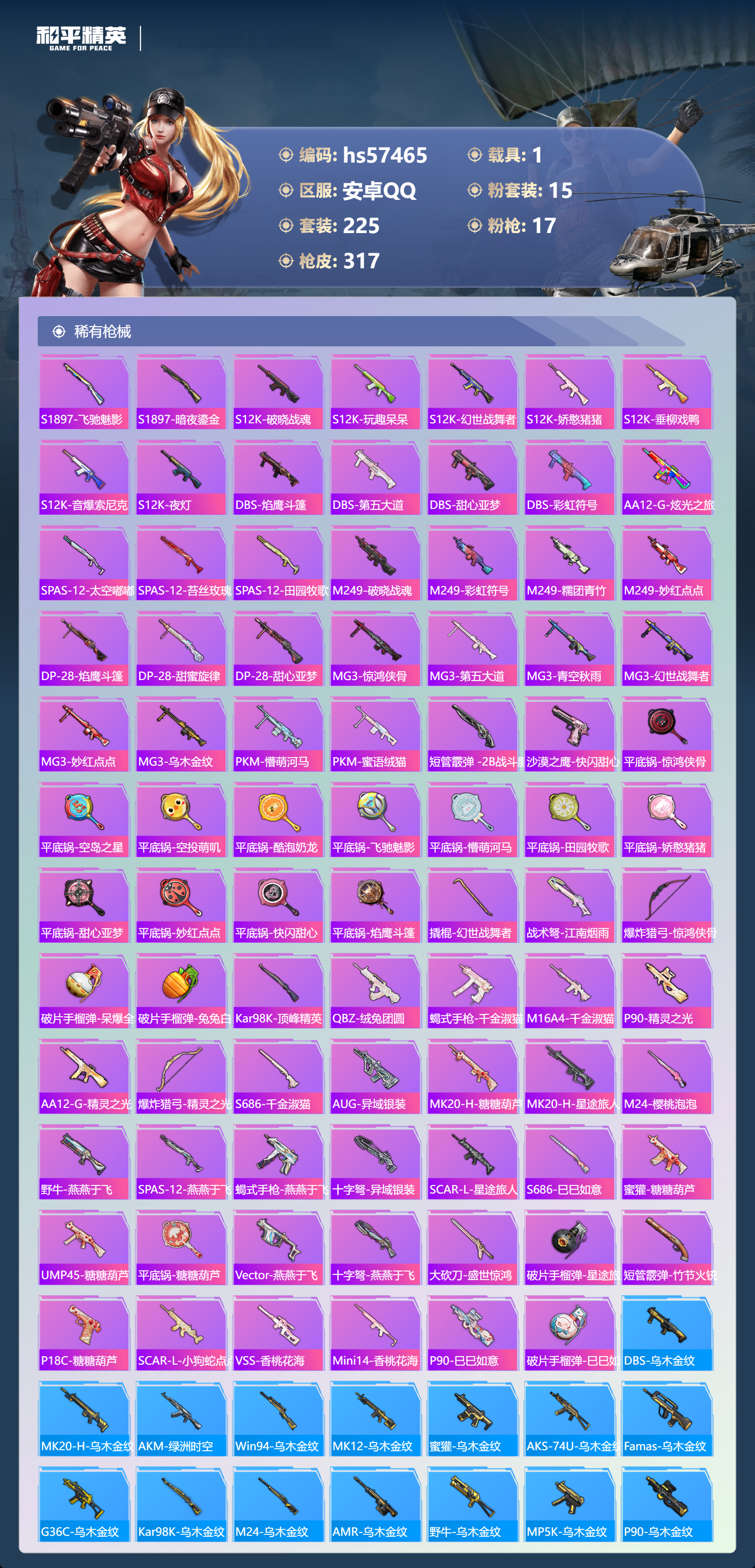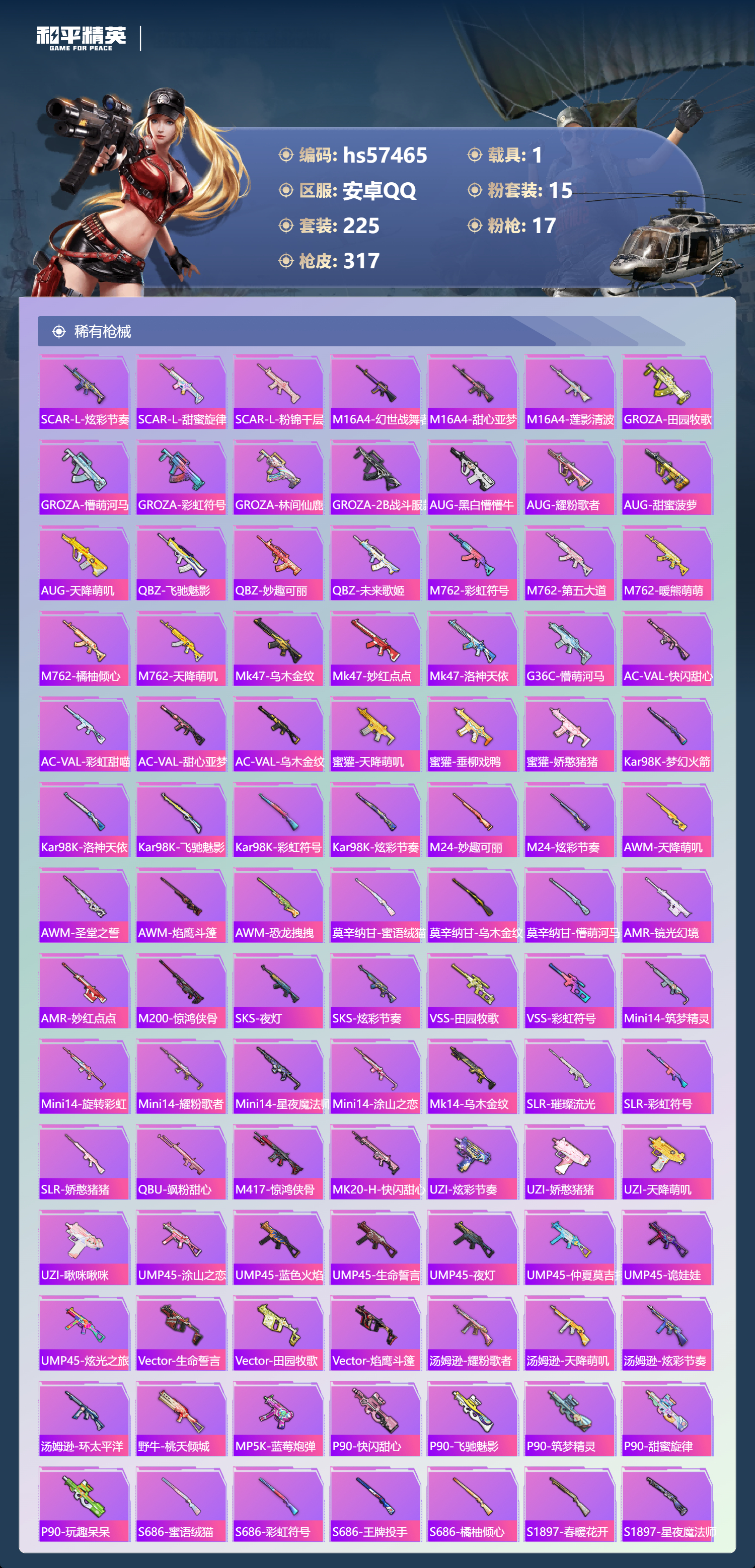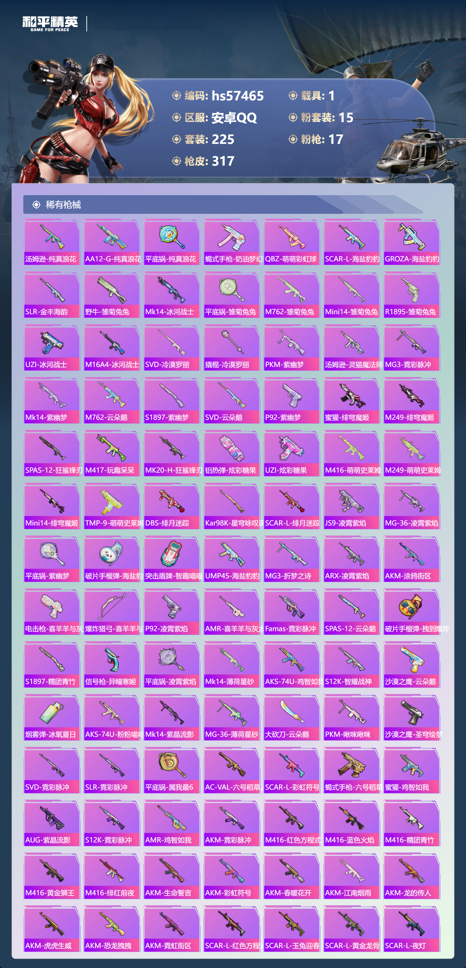 hs57465 安卓手q-17王牌印记-1红装-15粉装-17特效呛-1载具-热力值-225套装-317呛皮-10卓越印记-2传奇印记【1红装】幽焰骑士-维塔/2级【15粉装】套装-缤纷油彩角色-冷漠罗丽套装-童趣迷兔套装-旋转彩虹角色-奇迹舞步 美琪套装-蝶舞迷情套装-暗夜鎏金套装-山涧鹿灵角色-千金淑猫角色-绯穹魔姬套装-宝贝奶油派角色-奇迹舞步 美雪套