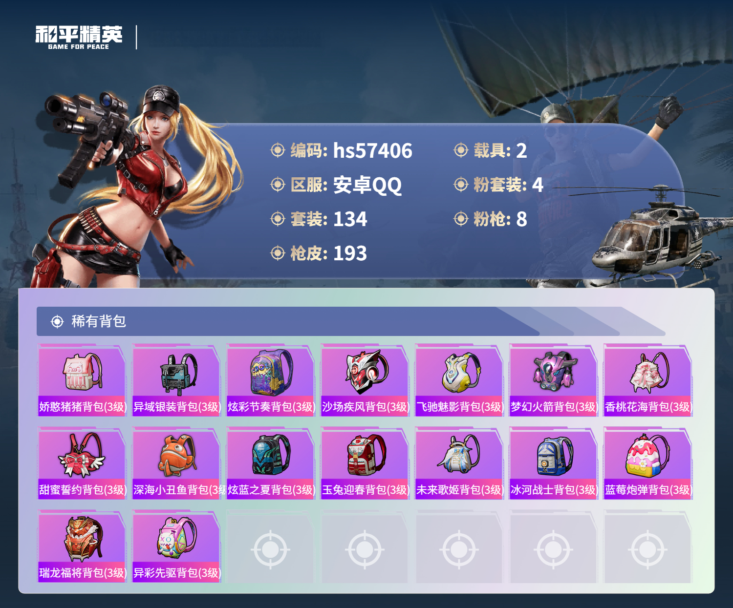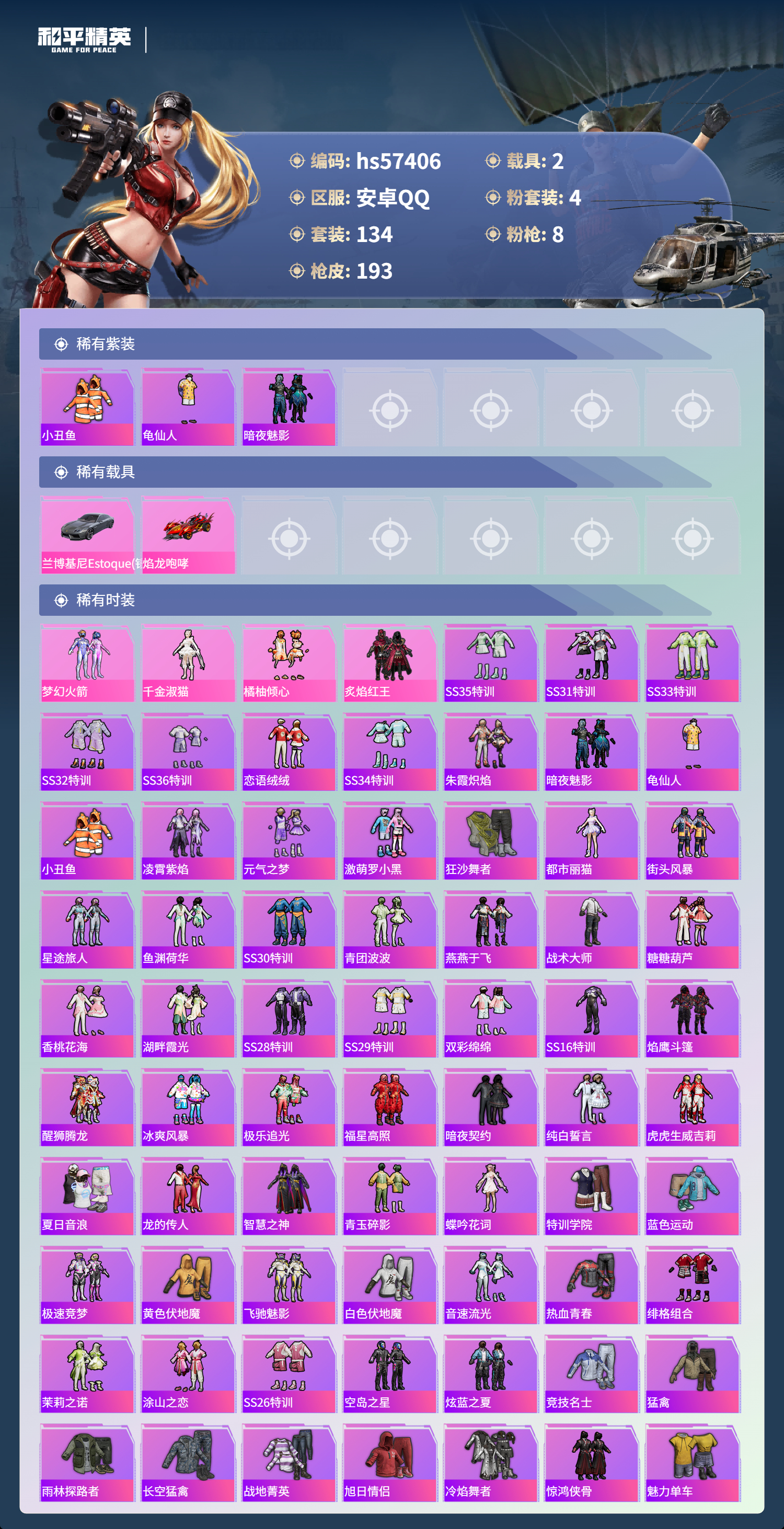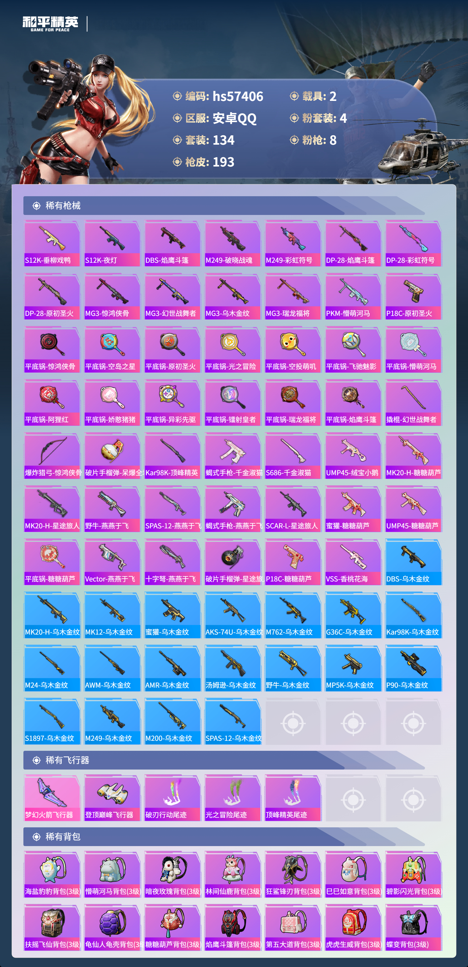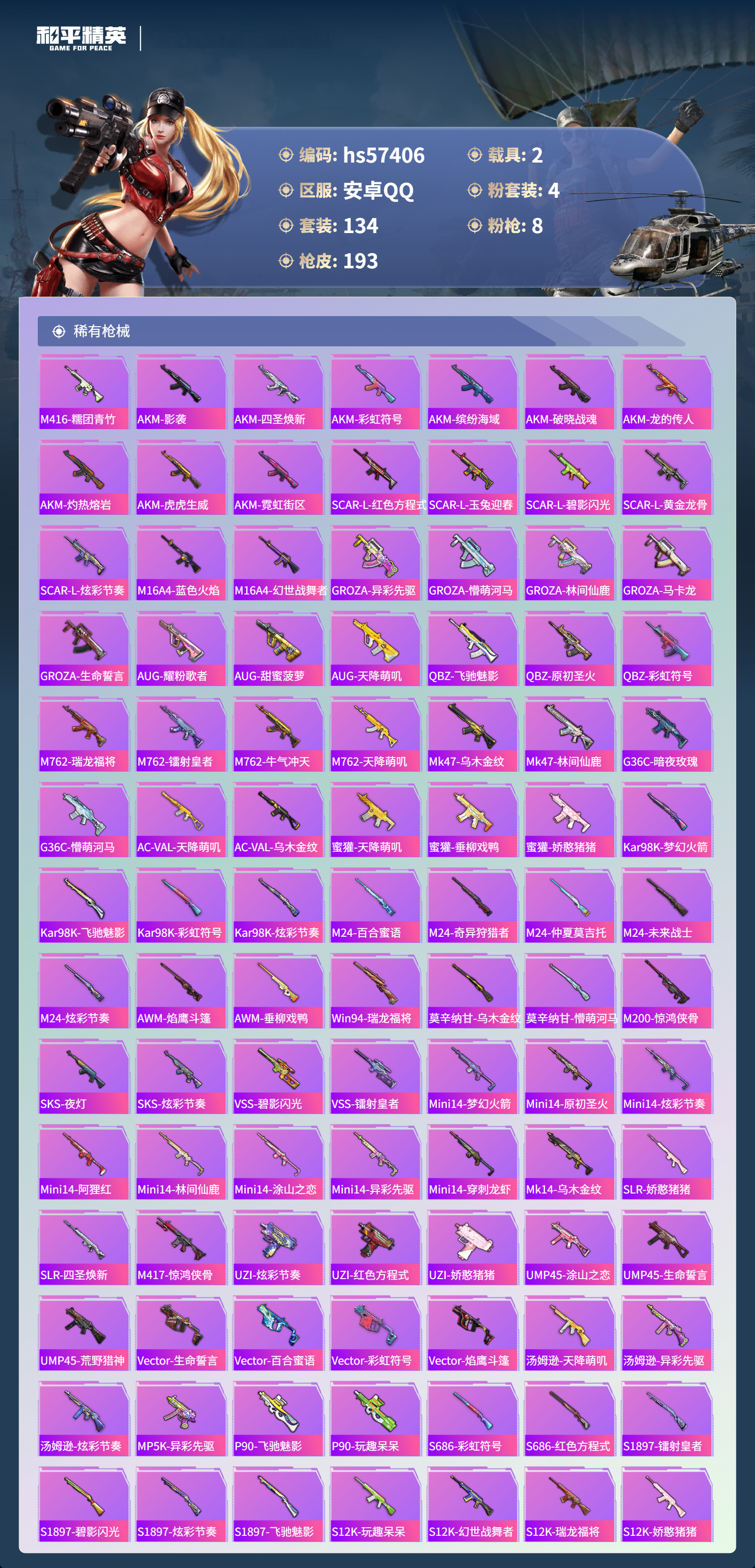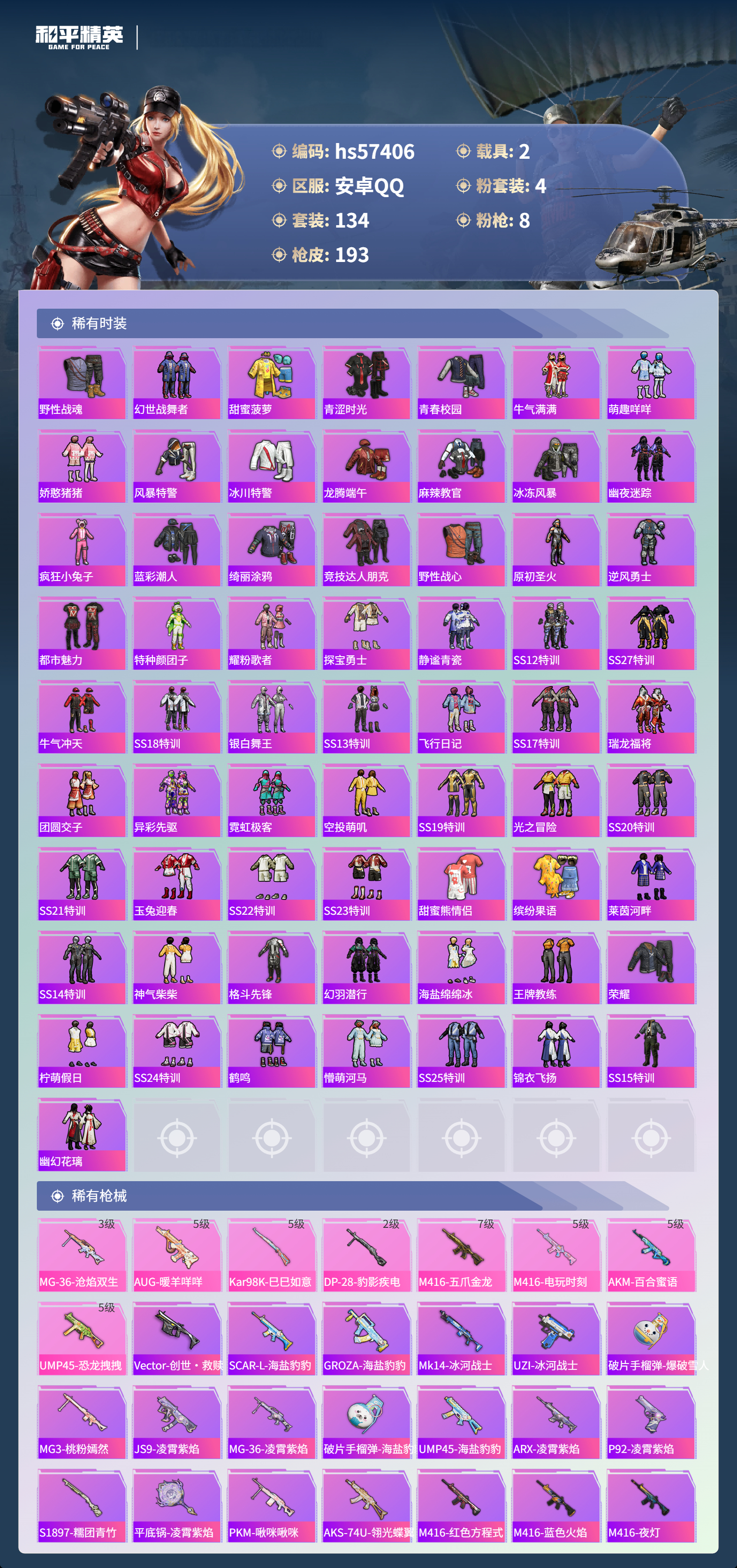 2载具-134套装-193呛皮-hs57406 安卓手q-12王牌印记-4粉装-8特效呛-2载具-62193热力值-134套装-193呛皮-3卓越印记【4粉装】套装-橘柚倾心套装-炙焰红王角色-千金淑猫套装-梦幻火箭【8特效呛】kar98k-巳巳如意/5级mg-36-沧焰双生/3级m416-电玩时刻/5级dp-28-豹影疾电/2级ump45-恐龙拽拽/5级m416-五爪金龙/7级aug-暖羊咩咩/5级a